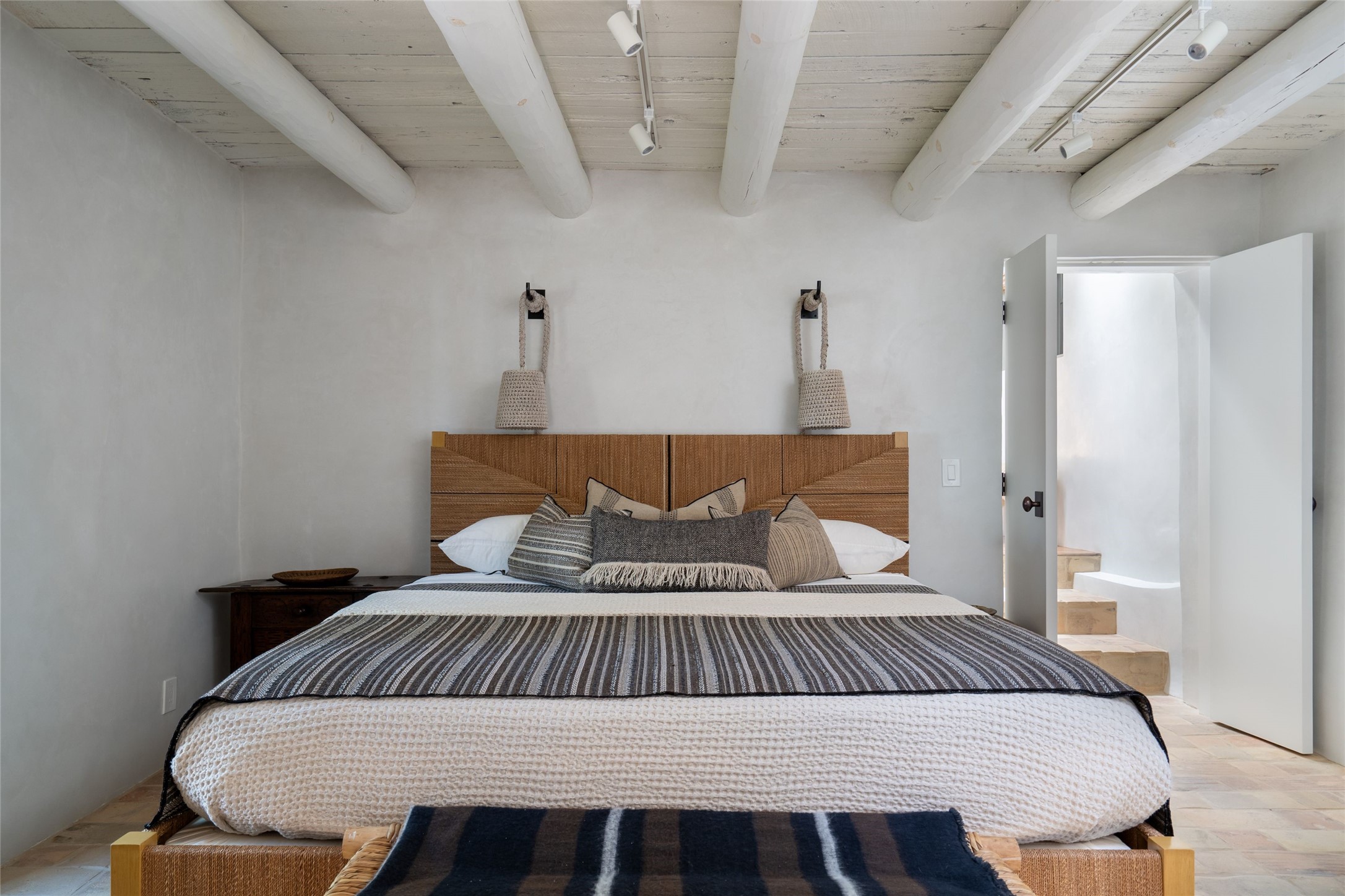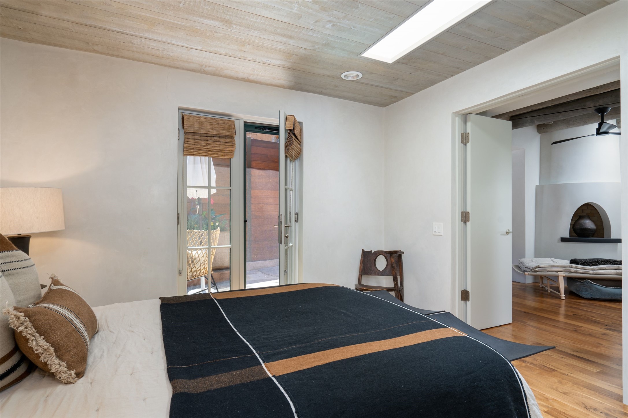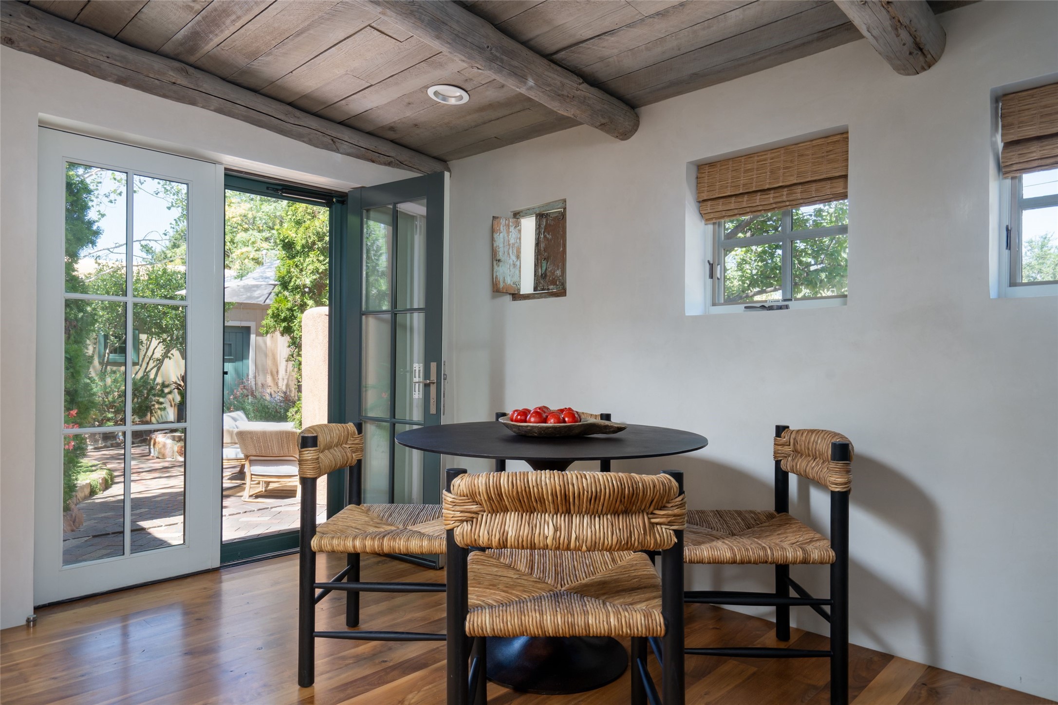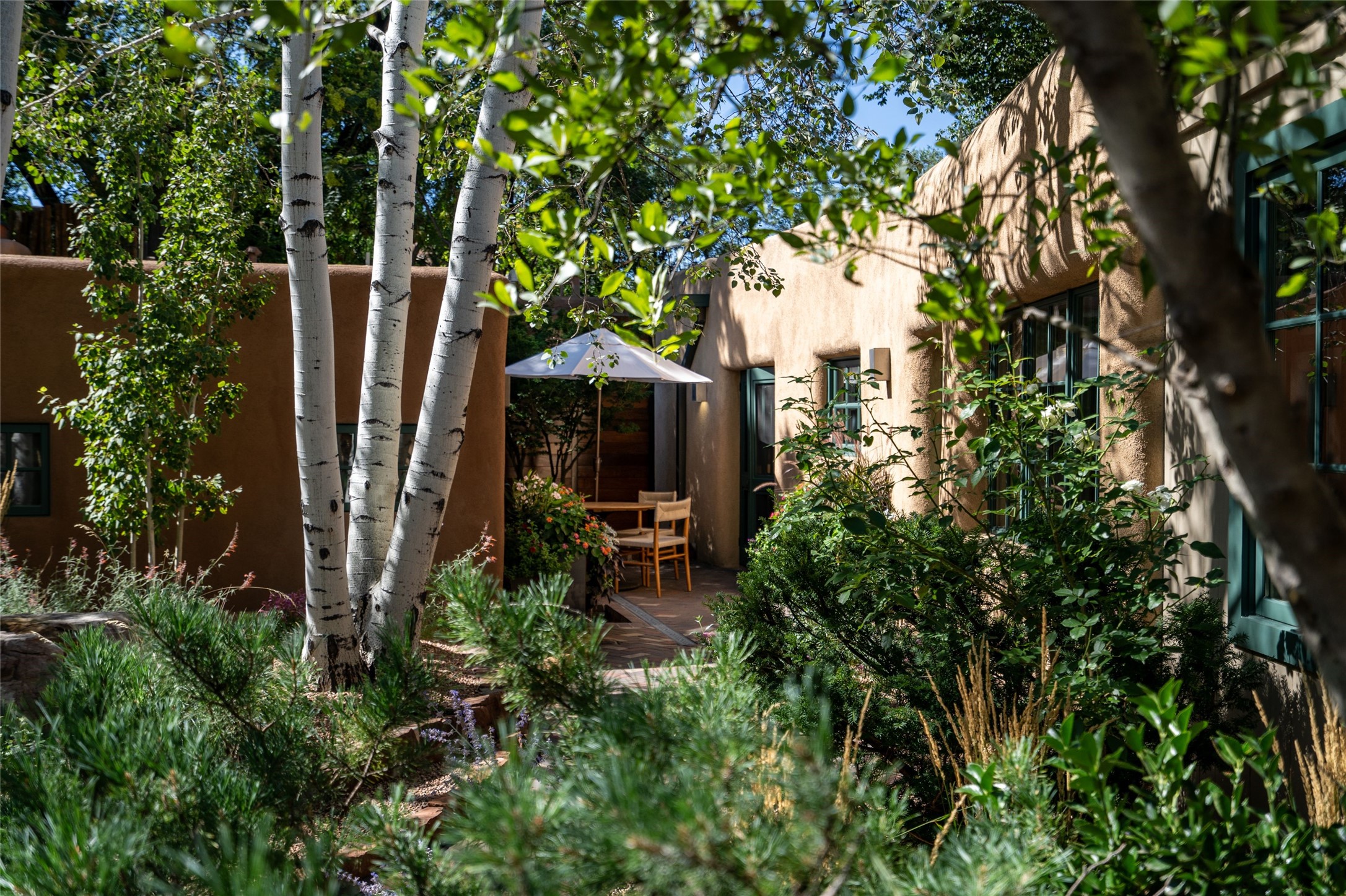 Recently renovated Pueblo-style compound that captures the spirit of Santa Fe in the heart of the coveted Historic Eastside. As you enter this enchanting property, you are greeted by a beautifully landscaped courtyard, a tranquil escape with multiple seating areas, perfect for indulging in quiet moments or lively gatherings. The property exudes old-world charm, featuring five wood-burning fireplaces, traditional vigas and beams, and a delightful mix of brick, tile, and wood floors that create a warm and welcoming atmosphere. The 1,521 sq. ft. main house offers 2 spacious bedrooms and 2.5 elegantly appointed baths. 2 dedicated parking spots lead to a private entrance. The thoughtfully remodeled interior showcases a redesigned kitchen that is both functional and exquisite, featuring custom cabinetry and high-end appliances. New primary suite is adorned with reclaimed terracotta Giallo-style tile, a chic wet bar, and a sophisticated Domingue waterproof plaster bath. Additionally, there is a rare finished 554 sq. ft. basement. Complementing the main residence is a charming 1,216 sq. ft. guesthouse. This newly renovated space features two parking spots and a gated entrance. With its open-concept design and skylights, the guesthouse is bathed in natural light, creating a bright and airy ambiance. Ideally located, just moments away from Downtown Subscription, a local coffee house and gathering spot, as well as Canyon Road, Kakawa Chocolate, and Kaune's Neighborhood Market