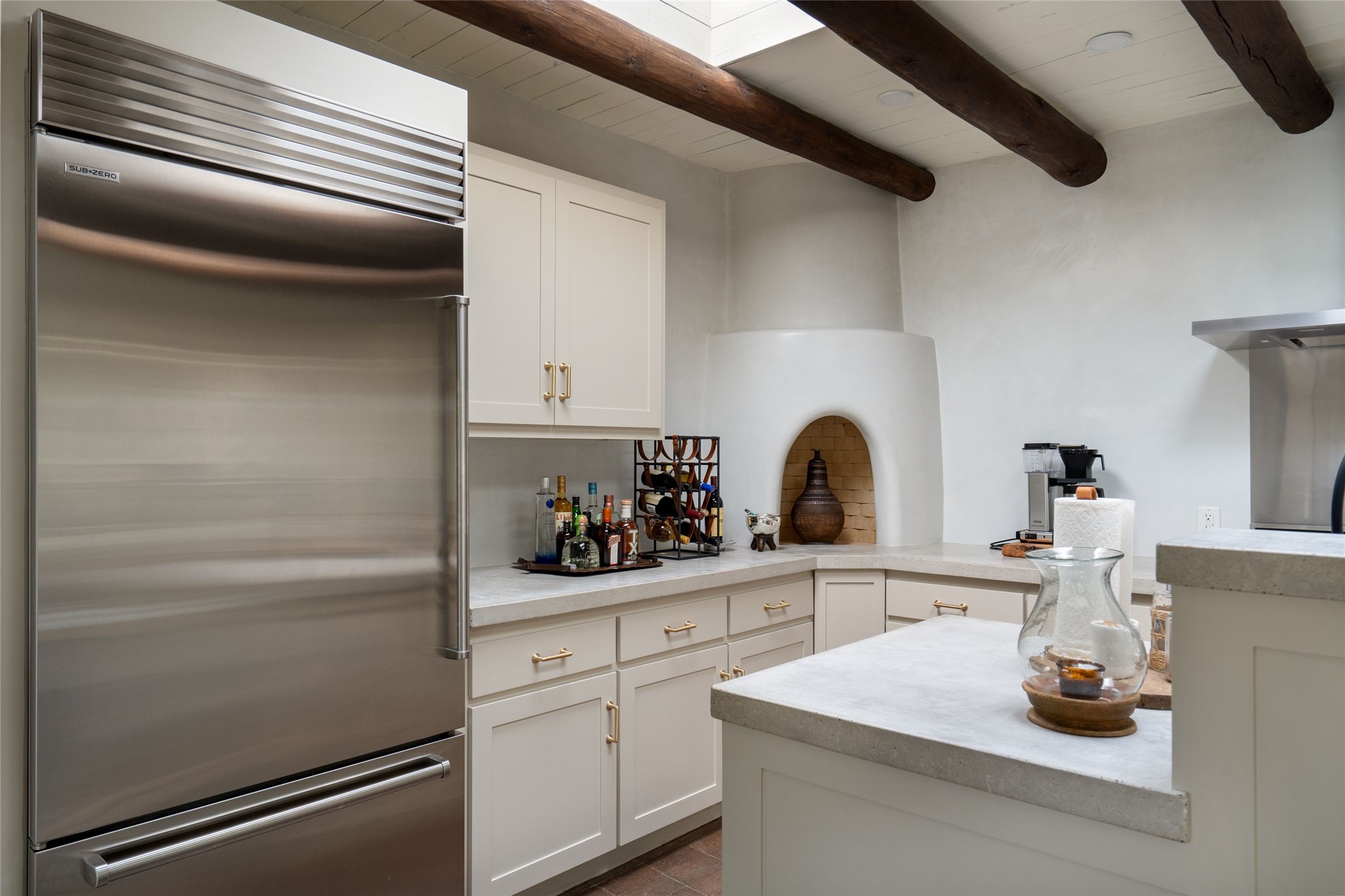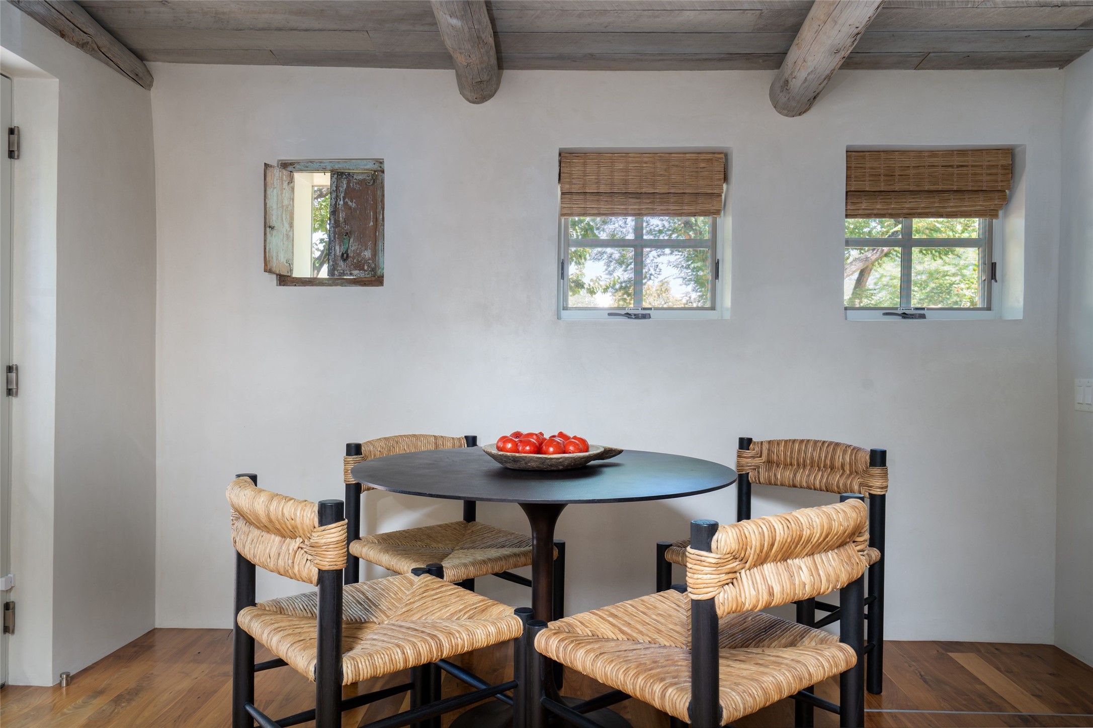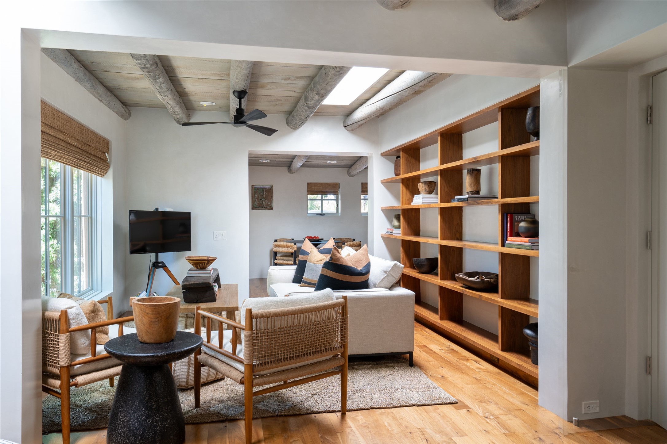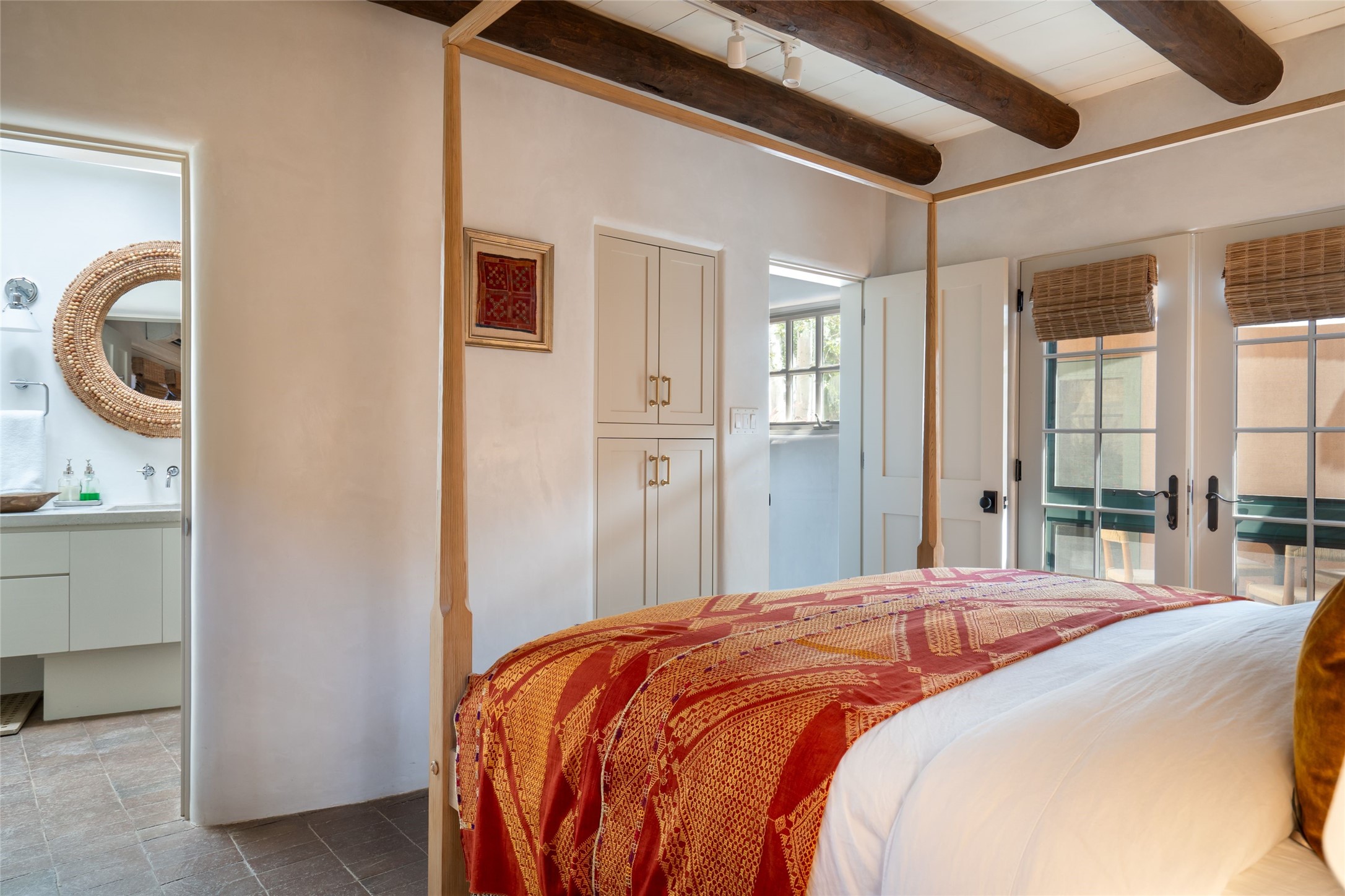 Recently renovated Pueblo-style compound that captures the spirit of Santa Fe in the heart of the coveted Historic Eastside. As you enter this enchanting property, you are greeted by a beautifully landscaped courtyard, a tranquil escape with multiple seating areas, perfect for indulging in quiet moments or lively gatherings. The property exudes old-world charm, featuring five wood-burning fireplaces, traditional vigas and beams, and a delightful mix of brick, tile, and wood floors that create a warm and welcoming atmosphere. The 1,521 sq. ft. main house offers 2 spacious bedrooms and 2.5 elegantly appointed baths. 2 dedicated parking spots lead to a private entrance. The thoughtfully remodeled interior showcases a redesigned kitchen that is both functional and exquisite, featuring custom cabinetry and high-end appliances. New primary suite is adorned with reclaimed terracotta Giallo-style tile, a chic wet bar, and a sophisticated Domingue waterproof plaster bath. Additionally, there is a rare finished 554 sq. ft. basement. Complementing the main residence is a charming 1,216 sq. ft. guesthouse. This newly renovated space features two parking spots and a gated entrance. With its open-concept design and skylights, the guesthouse is bathed in natural light, creating a bright and airy ambiance. Ideally located, just moments away from Downtown Subscription, a local coffee house and gathering spot, as well as Canyon Road, Kakawa Chocolate, and Kaune's Neighborhood Market