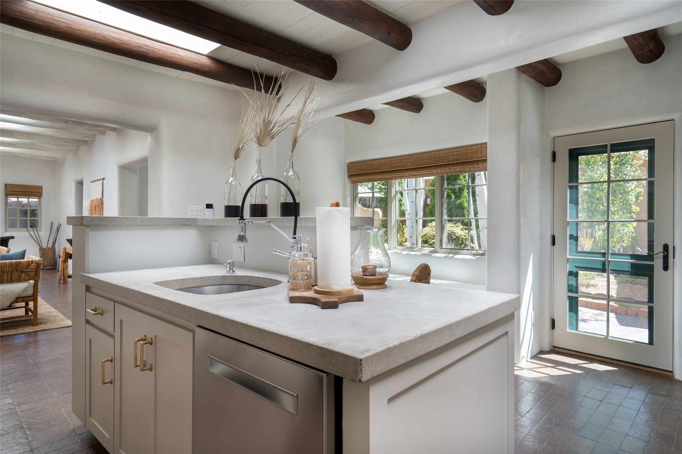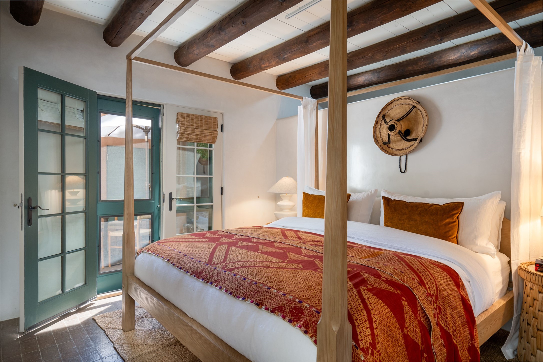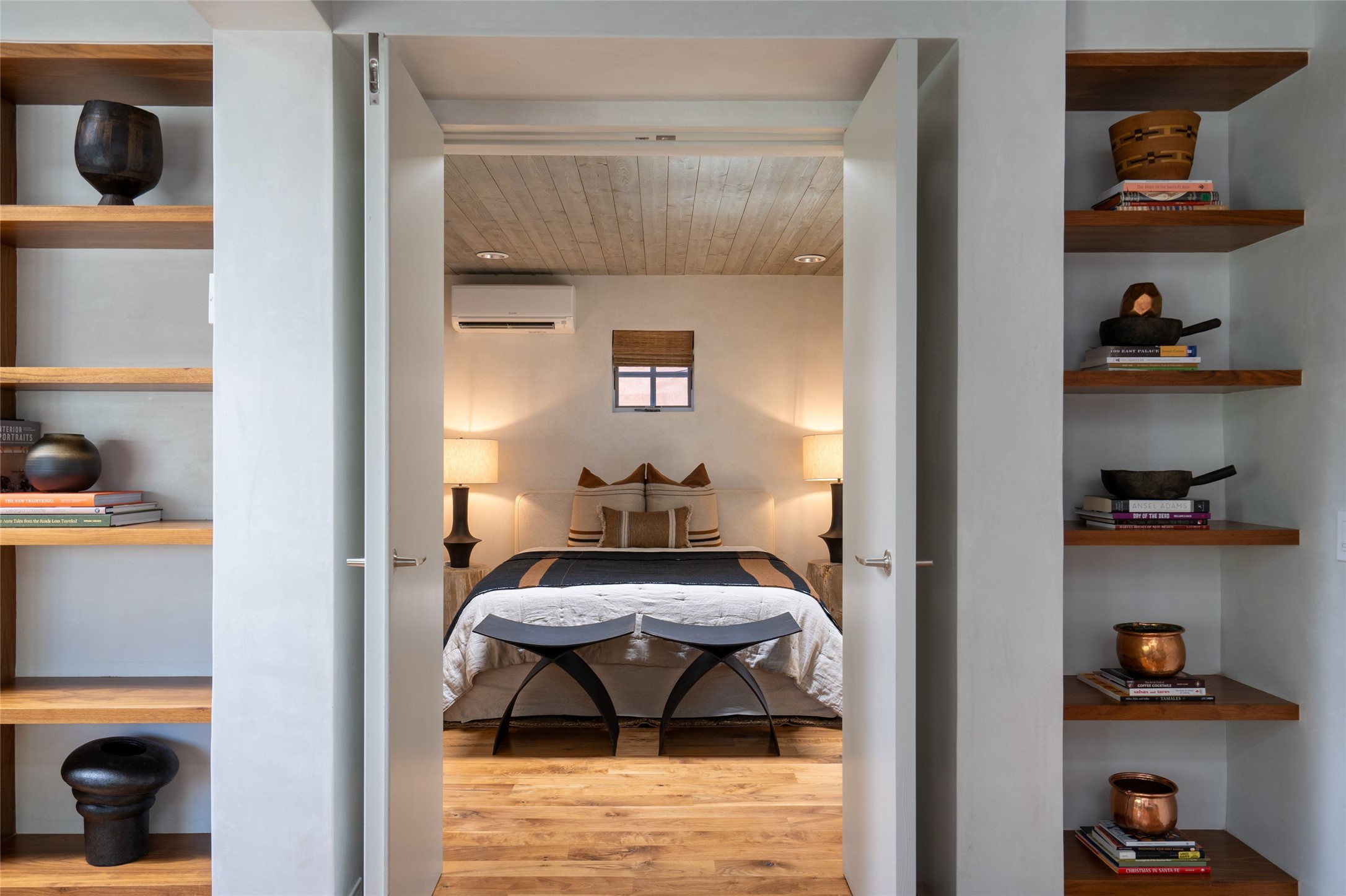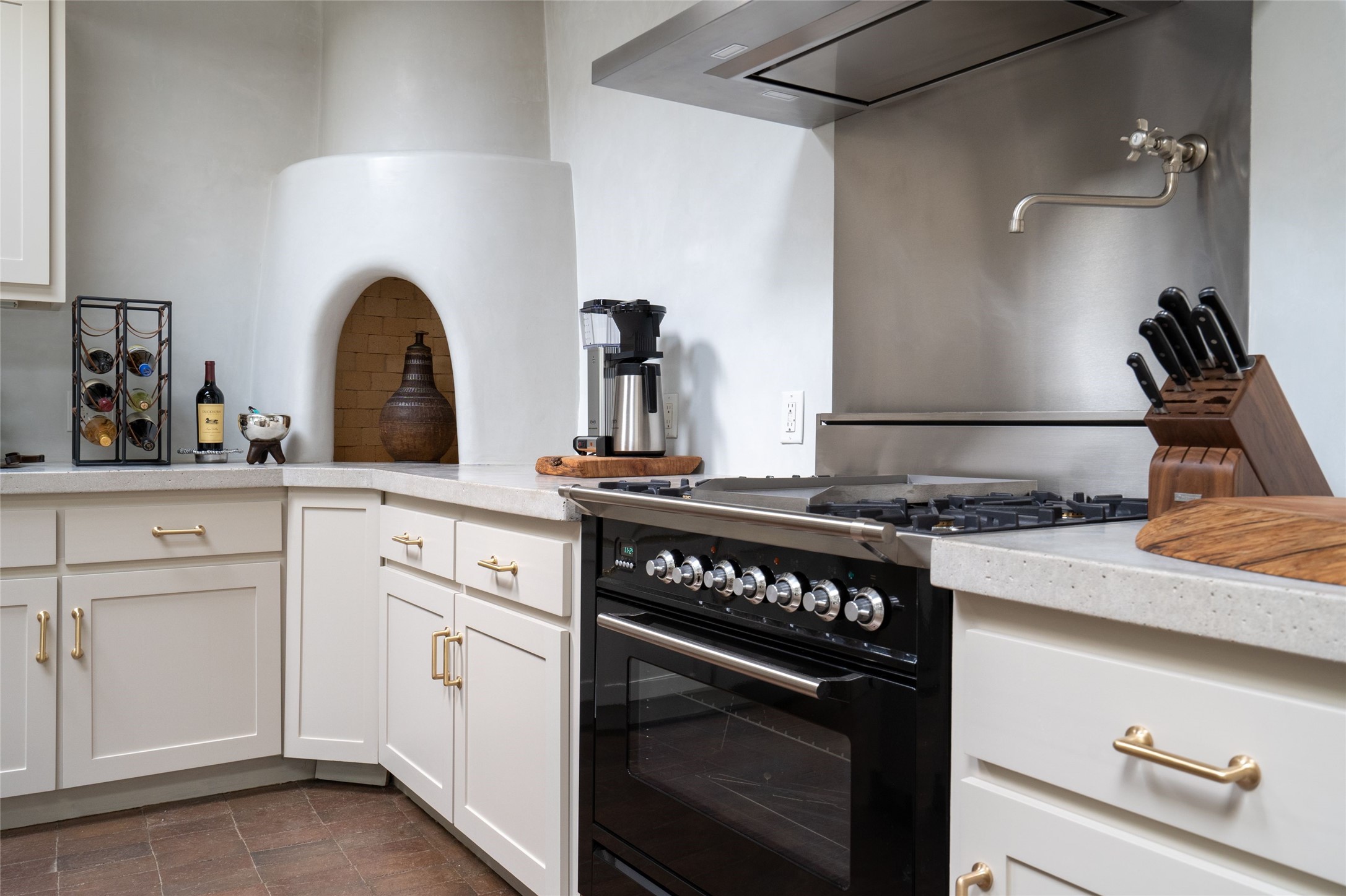 Recently renovated Pueblo-style compound that captures the spirit of Santa Fe in the heart of the coveted Historic Eastside. As you enter this enchanting property, you are greeted by a beautifully landscaped courtyard, a tranquil escape with multiple seating areas, perfect for indulging in quiet moments or lively gatherings. The property exudes old-world charm, featuring five wood-burning fireplaces, traditional vigas and beams, and a delightful mix of brick, tile, and wood floors that create a warm and welcoming atmosphere. The 1,521 sq. ft. main house offers 2 spacious bedrooms and 2.5 elegantly appointed baths. 2 dedicated parking spots lead to a private entrance. The thoughtfully remodeled interior showcases a redesigned kitchen that is both functional and exquisite, featuring custom cabinetry and high-end appliances. New primary suite is adorned with reclaimed terracotta Giallo-style tile, a chic wet bar, and a sophisticated Domingue waterproof plaster bath. Additionally, there is a rare finished 554 sq. ft. basement. Complementing the main residence is a charming 1,216 sq. ft. guesthouse. This newly renovated space features two parking spots and a gated entrance. With its open-concept design and skylights, the guesthouse is bathed in natural light, creating a bright and airy ambiance. Ideally located, just moments away from Downtown Subscription, a local coffee house and gathering spot, as well as Canyon Road, Kakawa Chocolate, and Kaune's Neighborhood Market