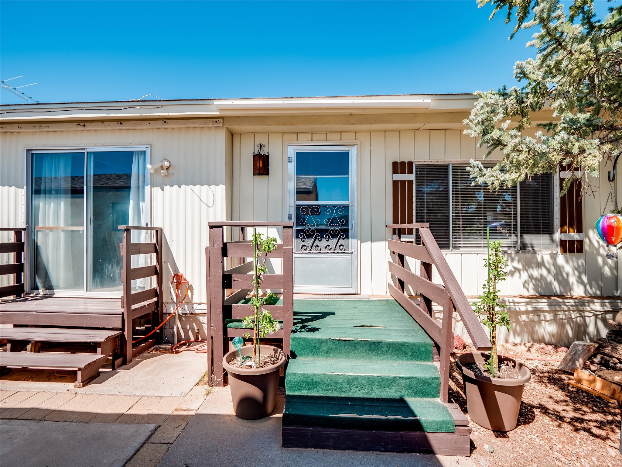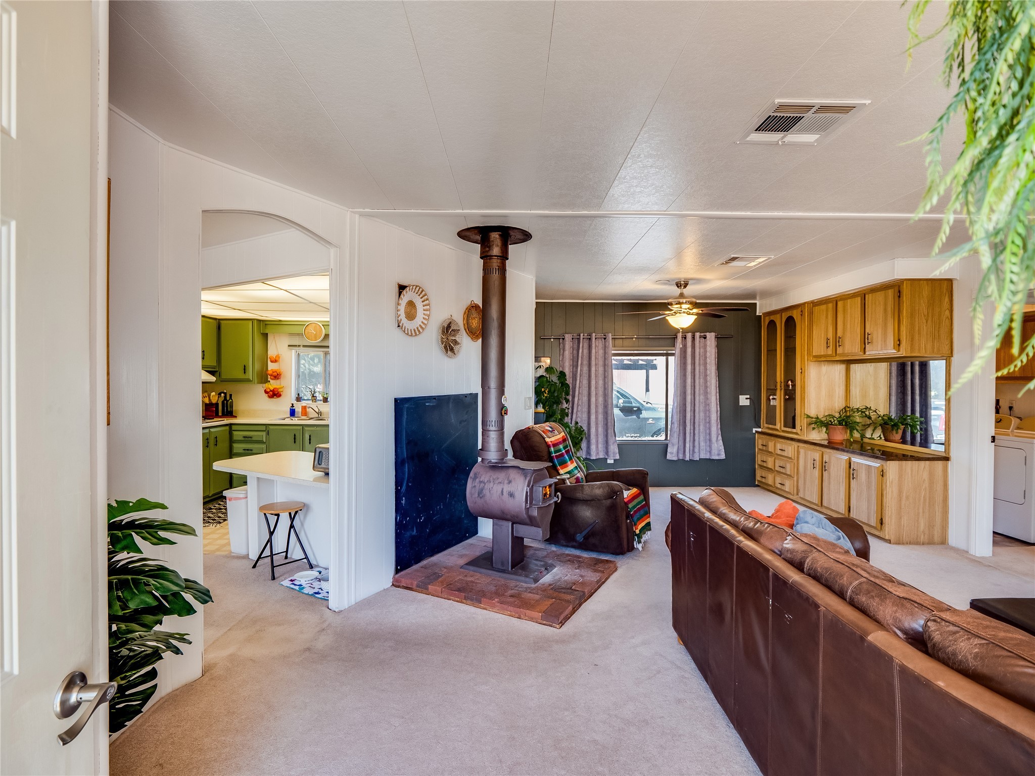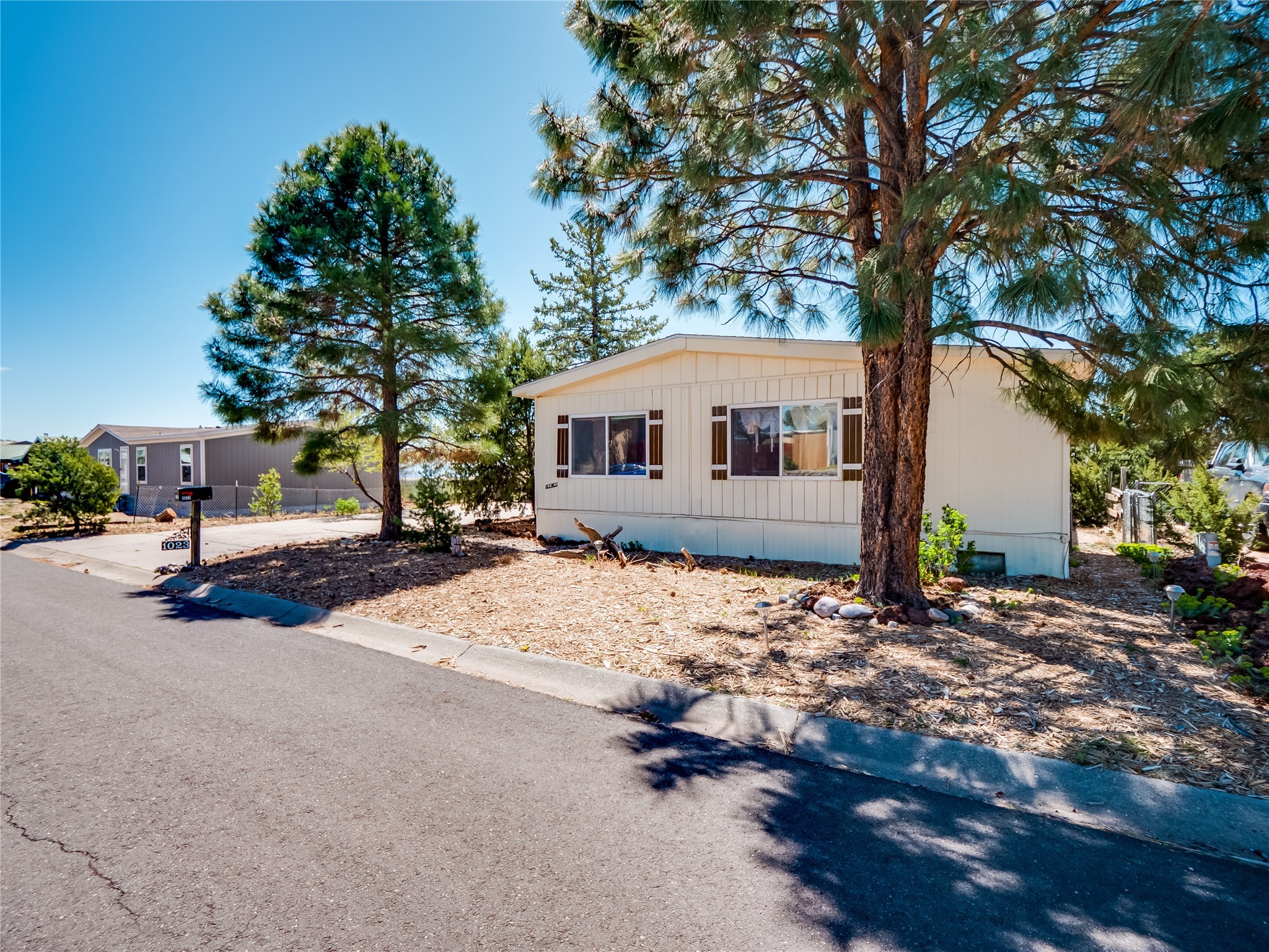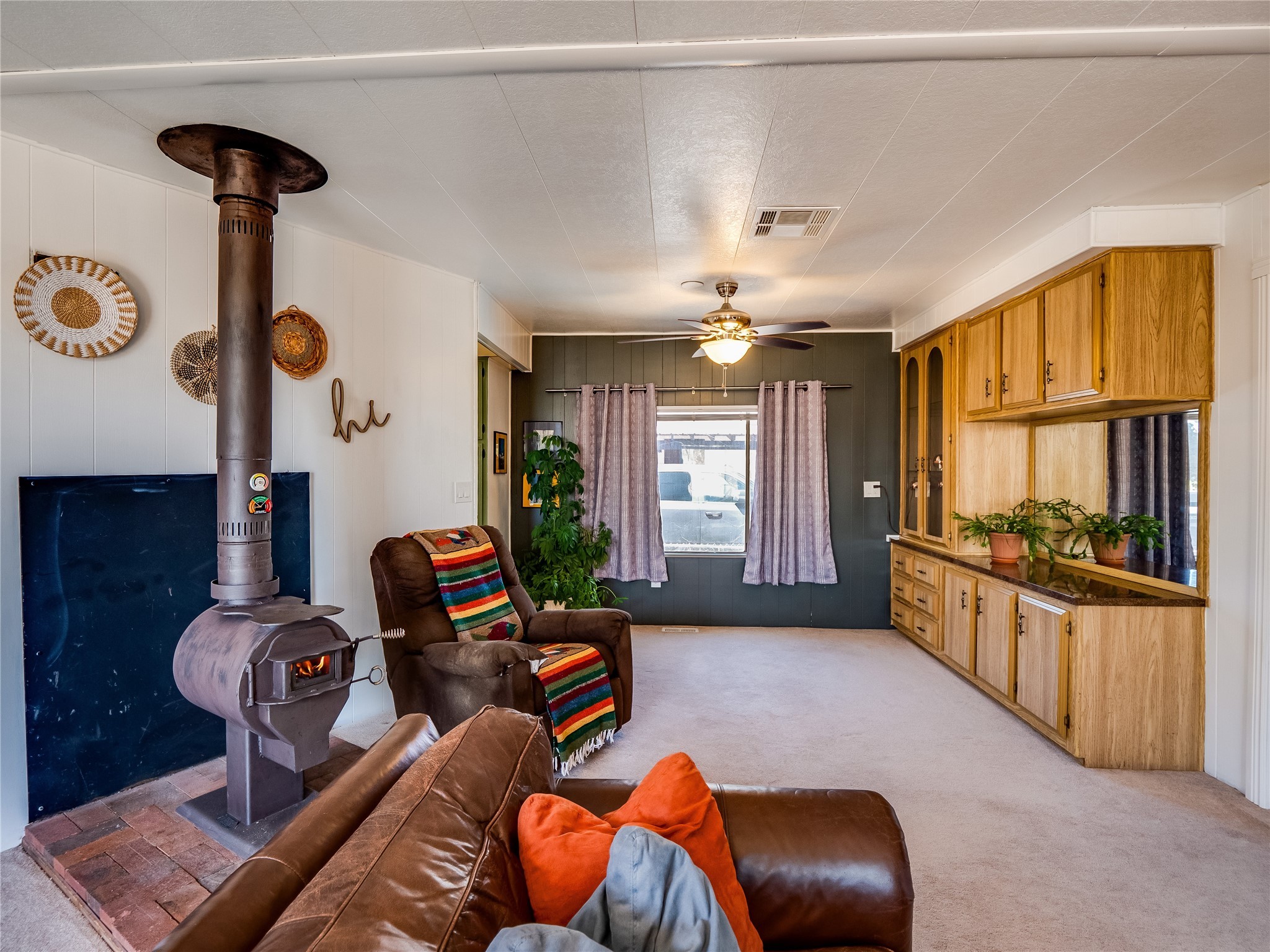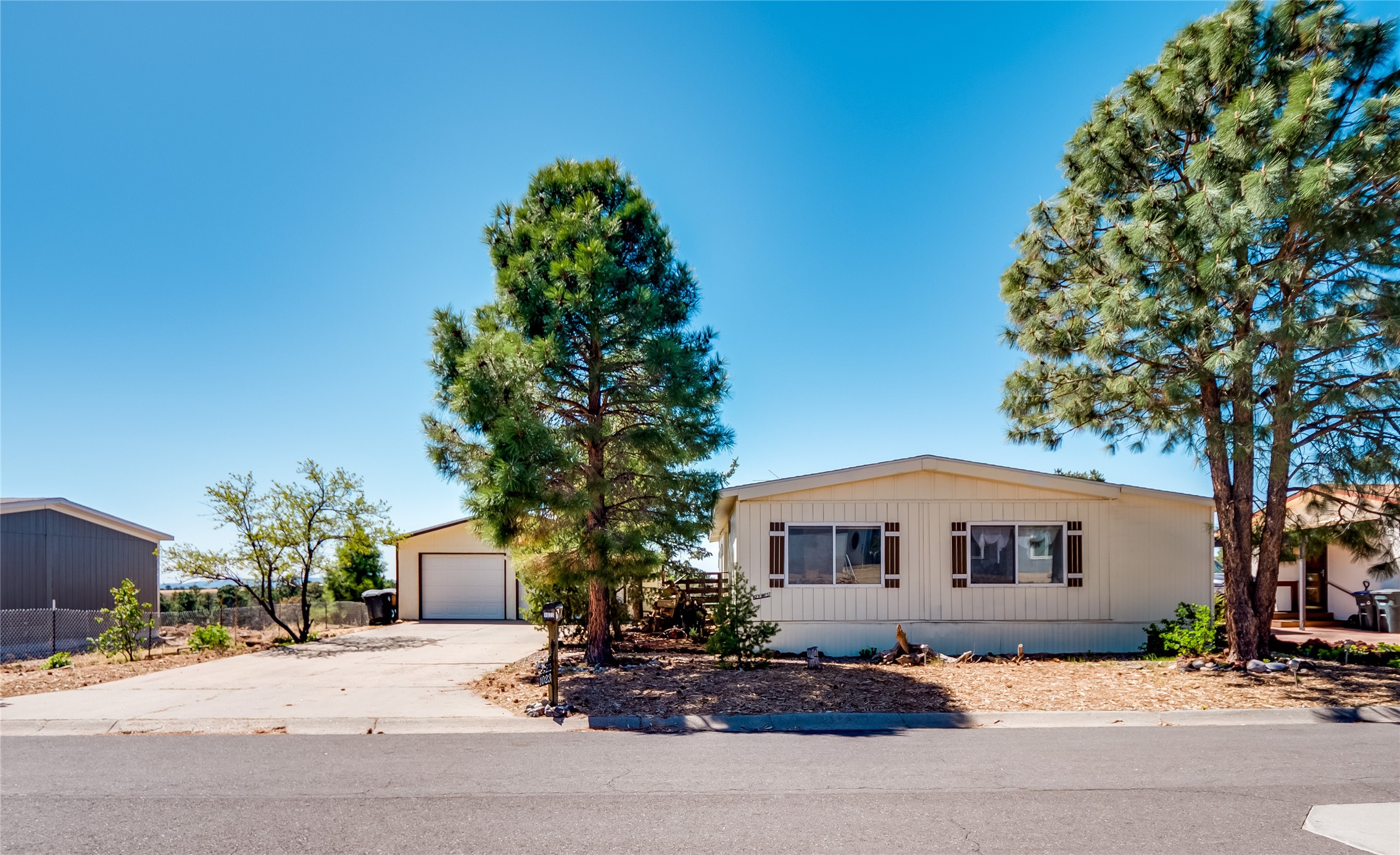 Welcome to this charming manufactured home nestled along the canyon edge in the peaceful Tsikumu Village neighborhood. Surrounded by nature and mature landscaping, the front yard boasts large, towering trees that frame the home and provide shade and privacy as you approach the front porch. Step up into the inviting entryway and immediately feel the warmth of the spacious carpeted living room that extends throughout the home. Cozy up by the wood-burning stove on chilly evenings, and enjoy the built-in cabinetry--perfect for displaying china or creating a convenient bar setup. The kitchen is both stylish and functional, featuring ample cabinet space with green cabinetry, black hardware, light countertops, a double oven, and a gas cooktop. A peninsula with bar seating offers a perfect spot for morning coffee or casual meals. Just off the kitchen is a bright dining area with sliding glass doors that open to the back patio--ideal for outdoor grilling and dining with a view. The generous primary en-suite is a private retreat with a large walk-in closet and an attached bathroom that includes a double sink vanity and a shower/tub combination. Two additional guest bedrooms offer comfortable accommodations, and a full guest bathroom with a single sink vanity serves the home. The laundry room leads to a versatile bonus room with a separate side entrance--great for a home office, studio, or hobby space. Outside, enjoy an open backyard with unobstructed views and stunning sights of the Sangre de Cristo Mountains. A grass lawn, a brick patio for entertaining, and retaining walls ideal for flower or vegetable gardens make this outdoor space versatile in creating your dream space. Located close to parks, scenic trails, and horse stalls, this home offers the perfect blend of comfort, convenience, and natural beauty. Book your tour today!