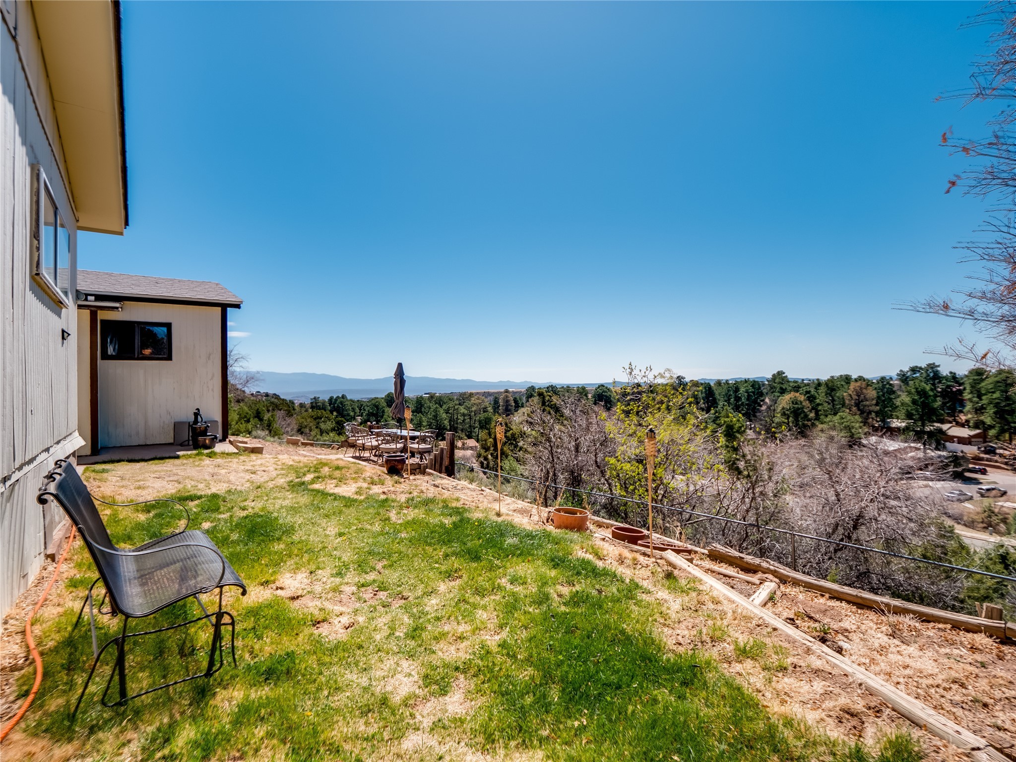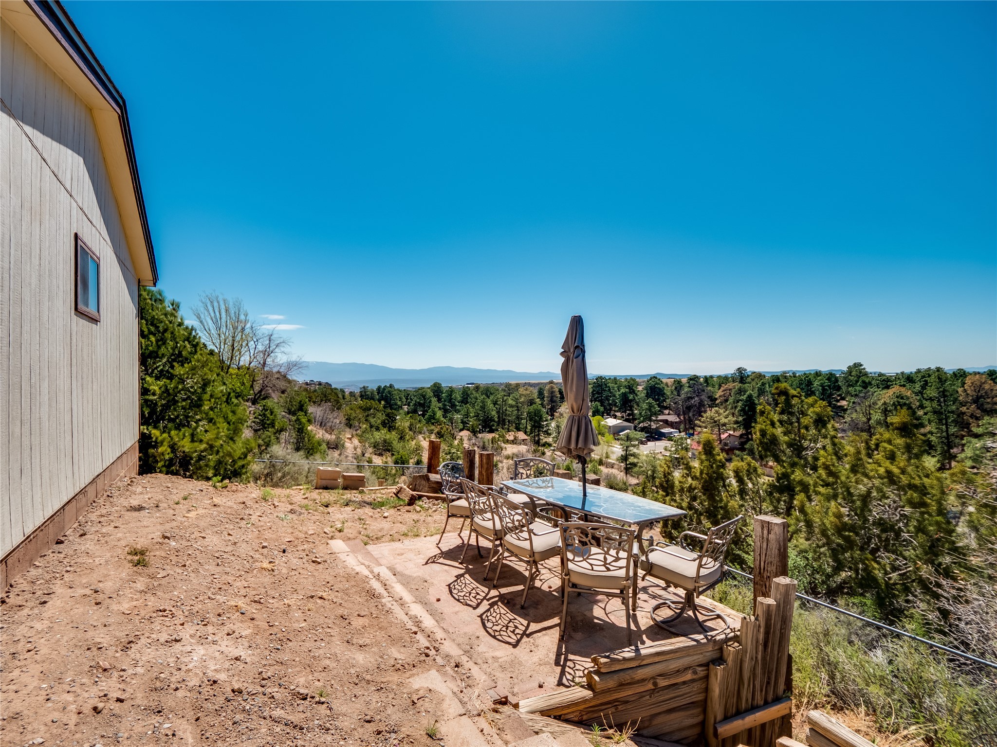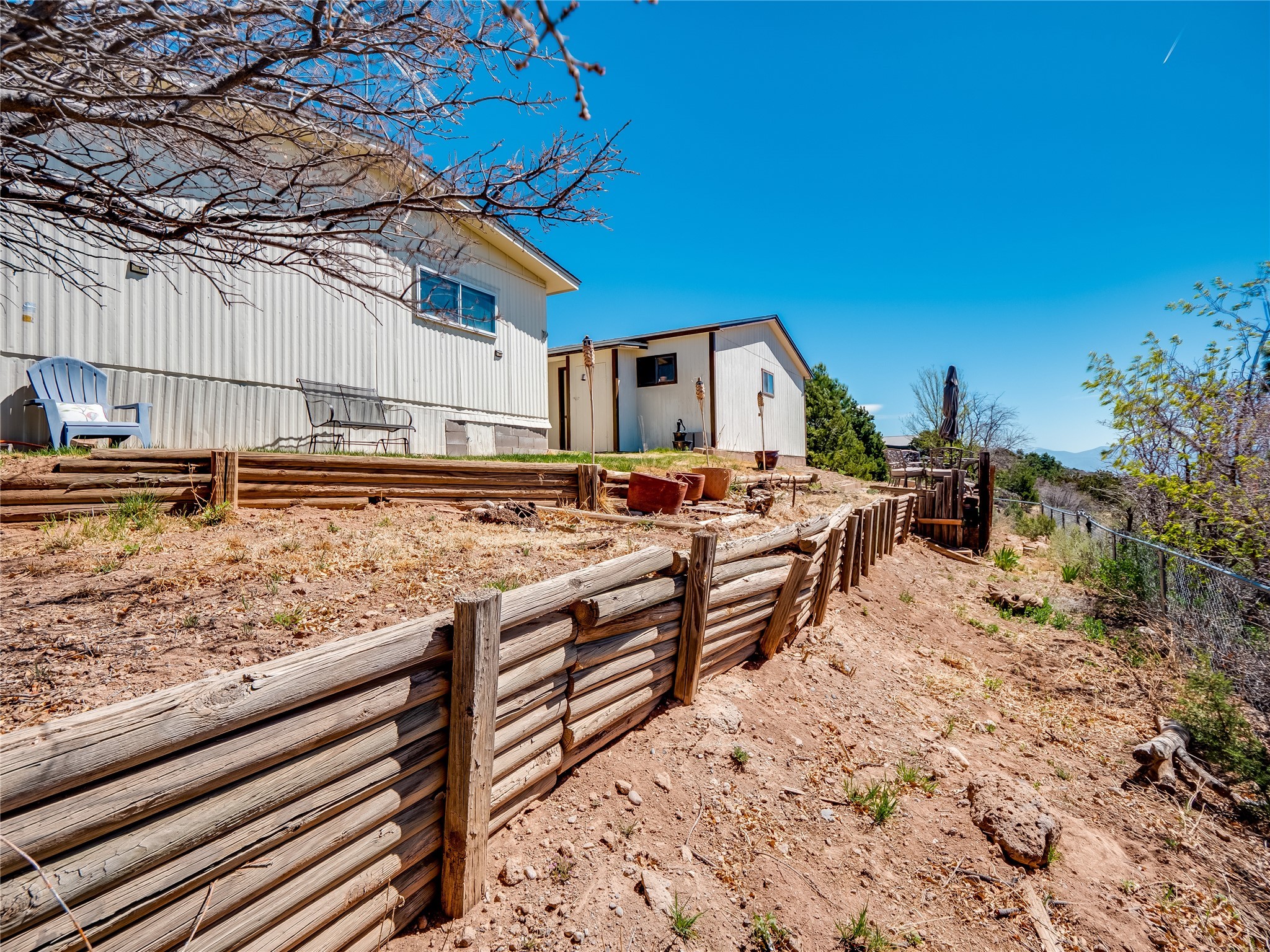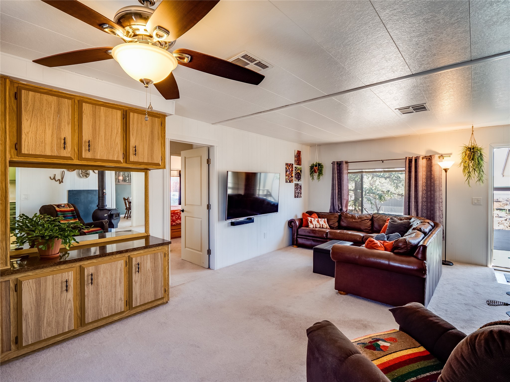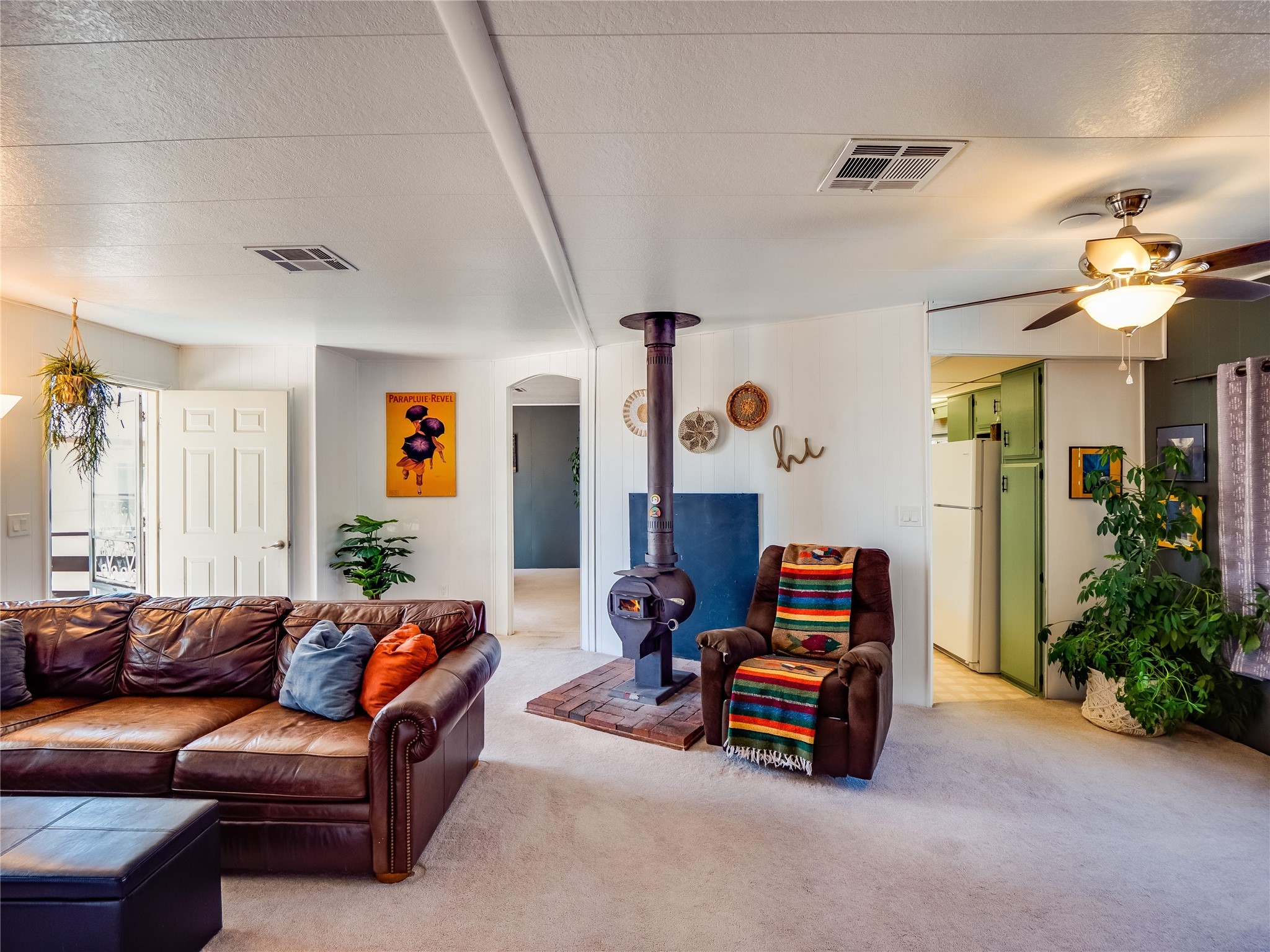 Welcome to this charming manufactured home nestled along the canyon edge in the peaceful Tsikumu Village neighborhood. Surrounded by nature and mature landscaping, the front yard boasts large, towering trees that frame the home and provide shade and privacy as you approach the front porch. Step up into the inviting entryway and immediately feel the warmth of the spacious carpeted living room that extends throughout the home. Cozy up by the wood-burning stove on chilly evenings, and enjoy the built-in cabinetry--perfect for displaying china or creating a convenient bar setup. The kitchen is both stylish and functional, featuring ample cabinet space with green cabinetry, black hardware, light countertops, a double oven, and a gas cooktop. A peninsula with bar seating offers a perfect spot for morning coffee or casual meals. Just off the kitchen is a bright dining area with sliding glass doors that open to the back patio--ideal for outdoor grilling and dining with a view. The generous primary en-suite is a private retreat with a large walk-in closet and an attached bathroom that includes a double sink vanity and a shower/tub combination. Two additional guest bedrooms offer comfortable accommodations, and a full guest bathroom with a single sink vanity serves the home. The laundry room leads to a versatile bonus room with a separate side entrance--great for a home office, studio, or hobby space. Outside, enjoy an open backyard with unobstructed views and stunning sights of the Sangre de Cristo Mountains. A grass lawn, a brick patio for entertaining, and retaining walls ideal for flower or vegetable gardens make this outdoor space versatile in creating your dream space. Located close to parks, scenic trails, and horse stalls, this home offers the perfect blend of comfort, convenience, and natural beauty. Book your tour today!