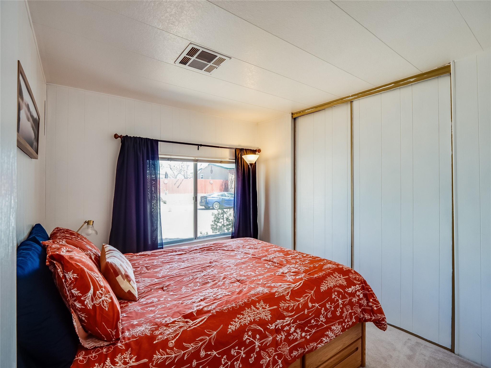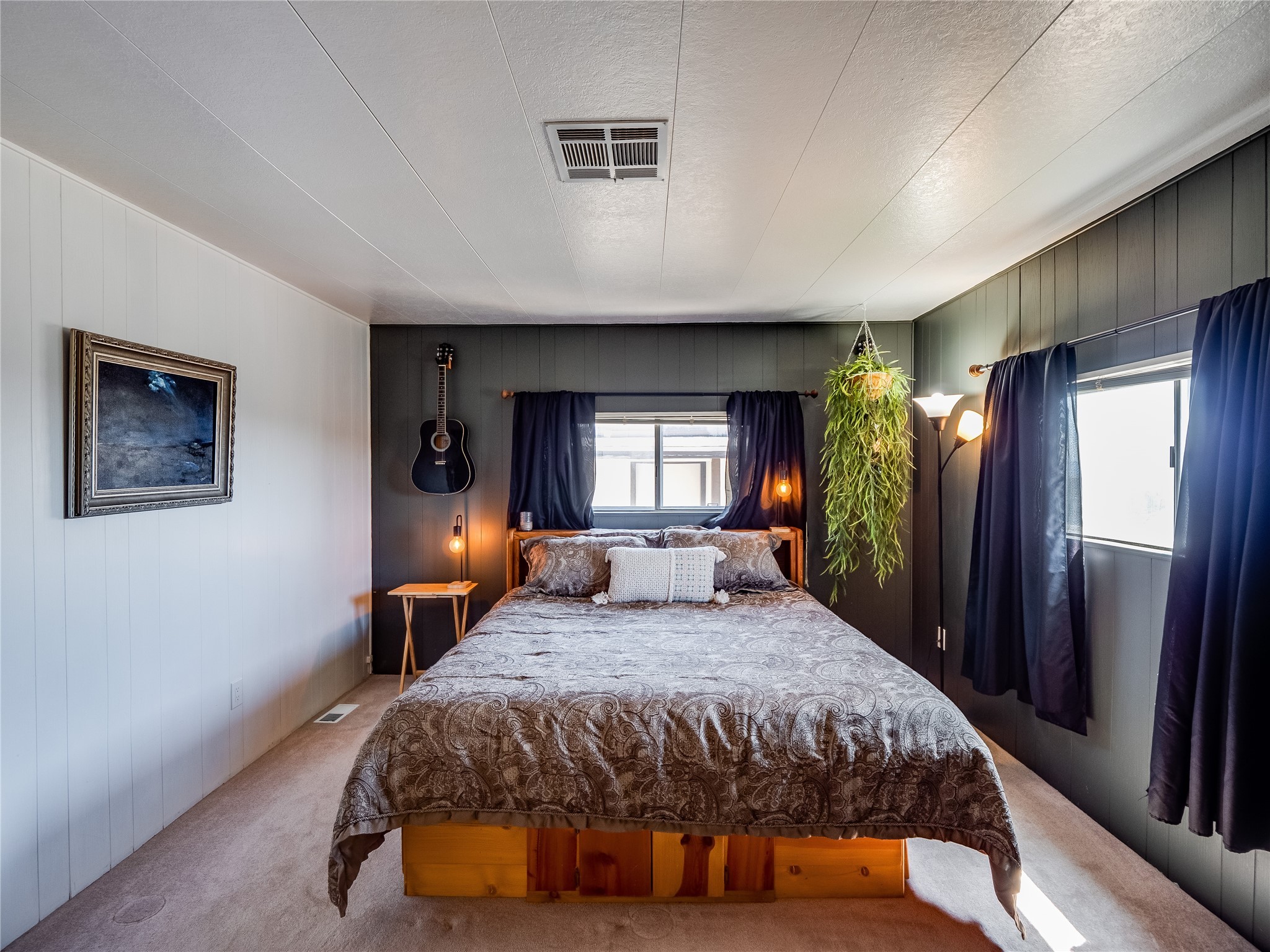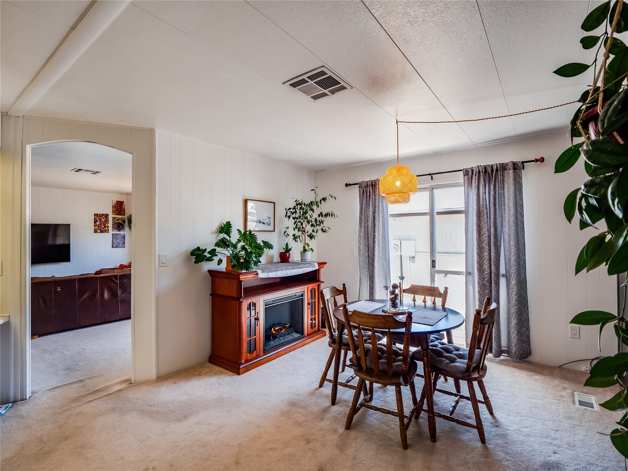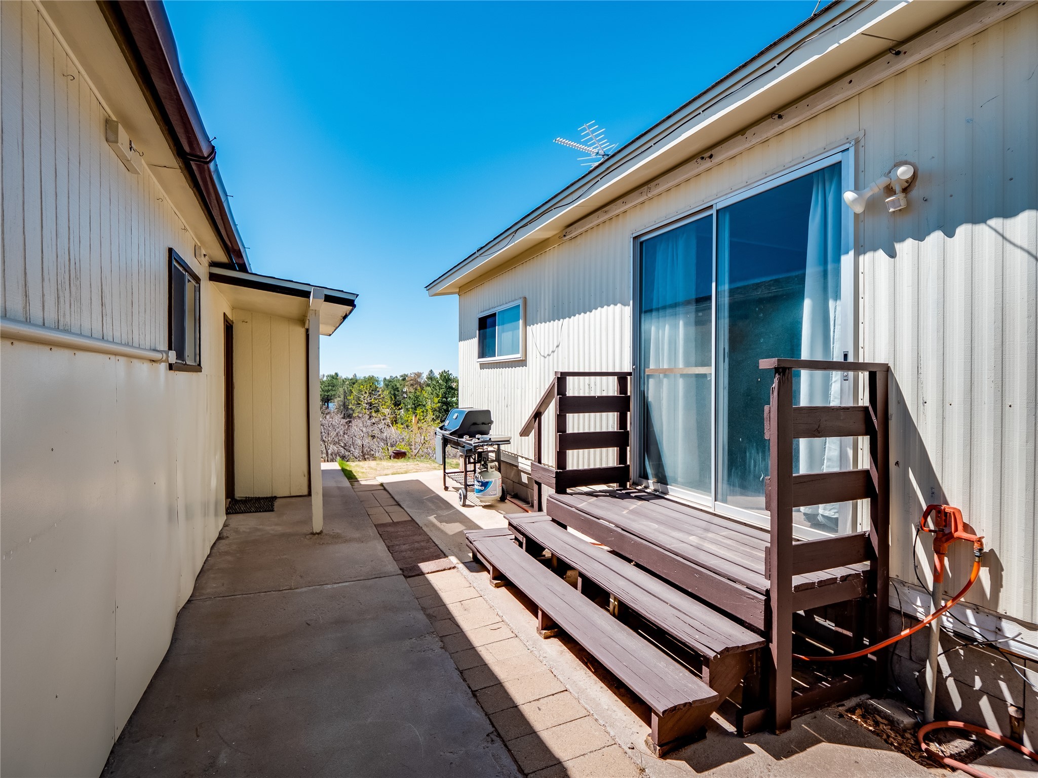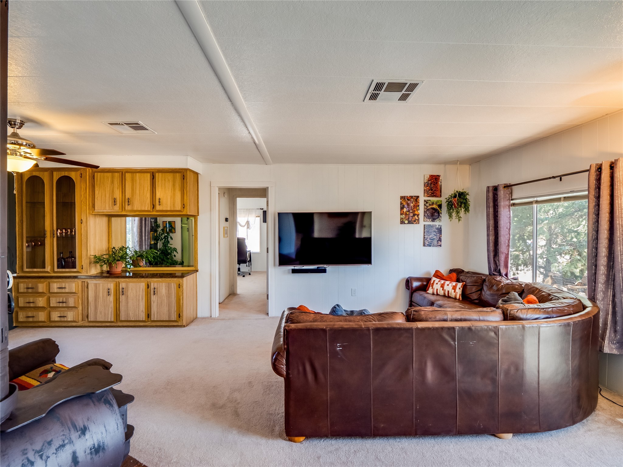 Welcome to this charming manufactured home nestled along the canyon edge in the peaceful Tsikumu Village neighborhood. Surrounded by nature and mature landscaping, the front yard boasts large, towering trees that frame the home and provide shade and privacy as you approach the front porch. Step up into the inviting entryway and immediately feel the warmth of the spacious carpeted living room that extends throughout the home. Cozy up by the wood-burning stove on chilly evenings, and enjoy the built-in cabinetry--perfect for displaying china or creating a convenient bar setup. The kitchen is both stylish and functional, featuring ample cabinet space with green cabinetry, black hardware, light countertops, a double oven, and a gas cooktop. A peninsula with bar seating offers a perfect spot for morning coffee or casual meals. Just off the kitchen is a bright dining area with sliding glass doors that open to the back patio--ideal for outdoor grilling and dining with a view. The generous primary en-suite is a private retreat with a large walk-in closet and an attached bathroom that includes a double sink vanity and a shower/tub combination. Two additional guest bedrooms offer comfortable accommodations, and a full guest bathroom with a single sink vanity serves the home. The laundry room leads to a versatile bonus room with a separate side entrance--great for a home office, studio, or hobby space. Outside, enjoy an open backyard with unobstructed views and stunning sights of the Sangre de Cristo Mountains. A grass lawn, a brick patio for entertaining, and retaining walls ideal for flower or vegetable gardens make this outdoor space versatile in creating your dream space. Located close to parks, scenic trails, and horse stalls, this home offers the perfect blend of comfort, convenience, and natural beauty. Book your tour today!
