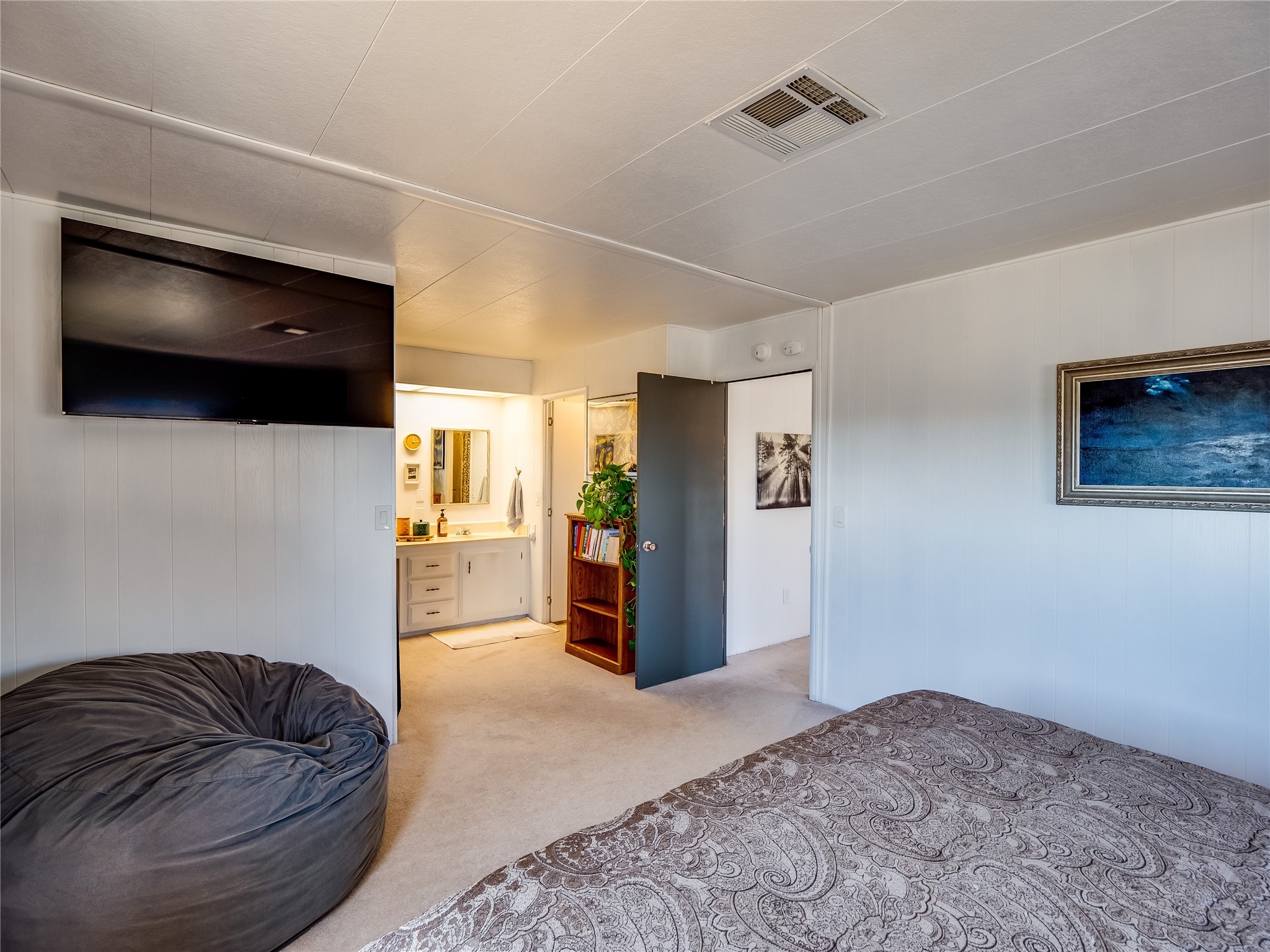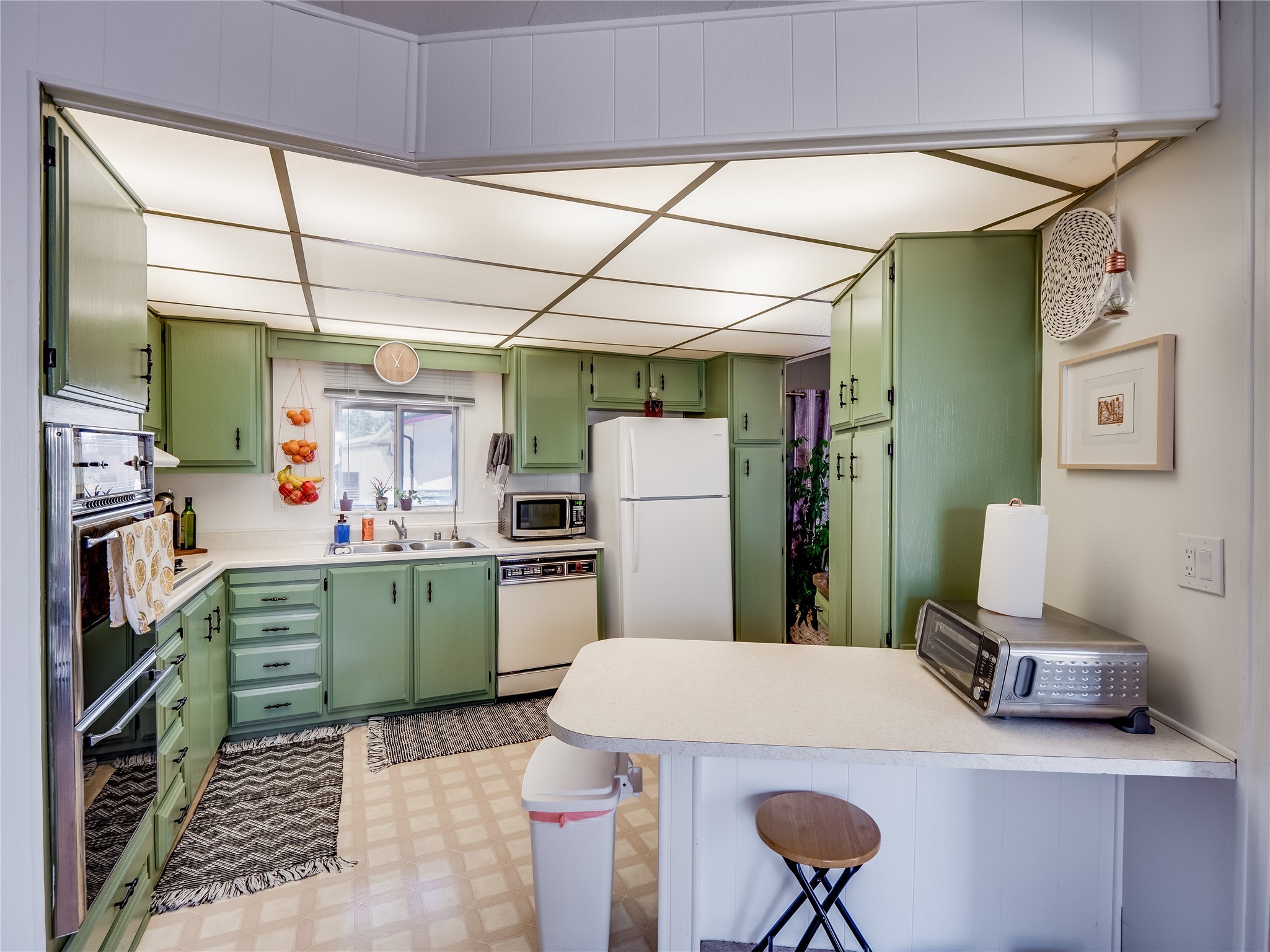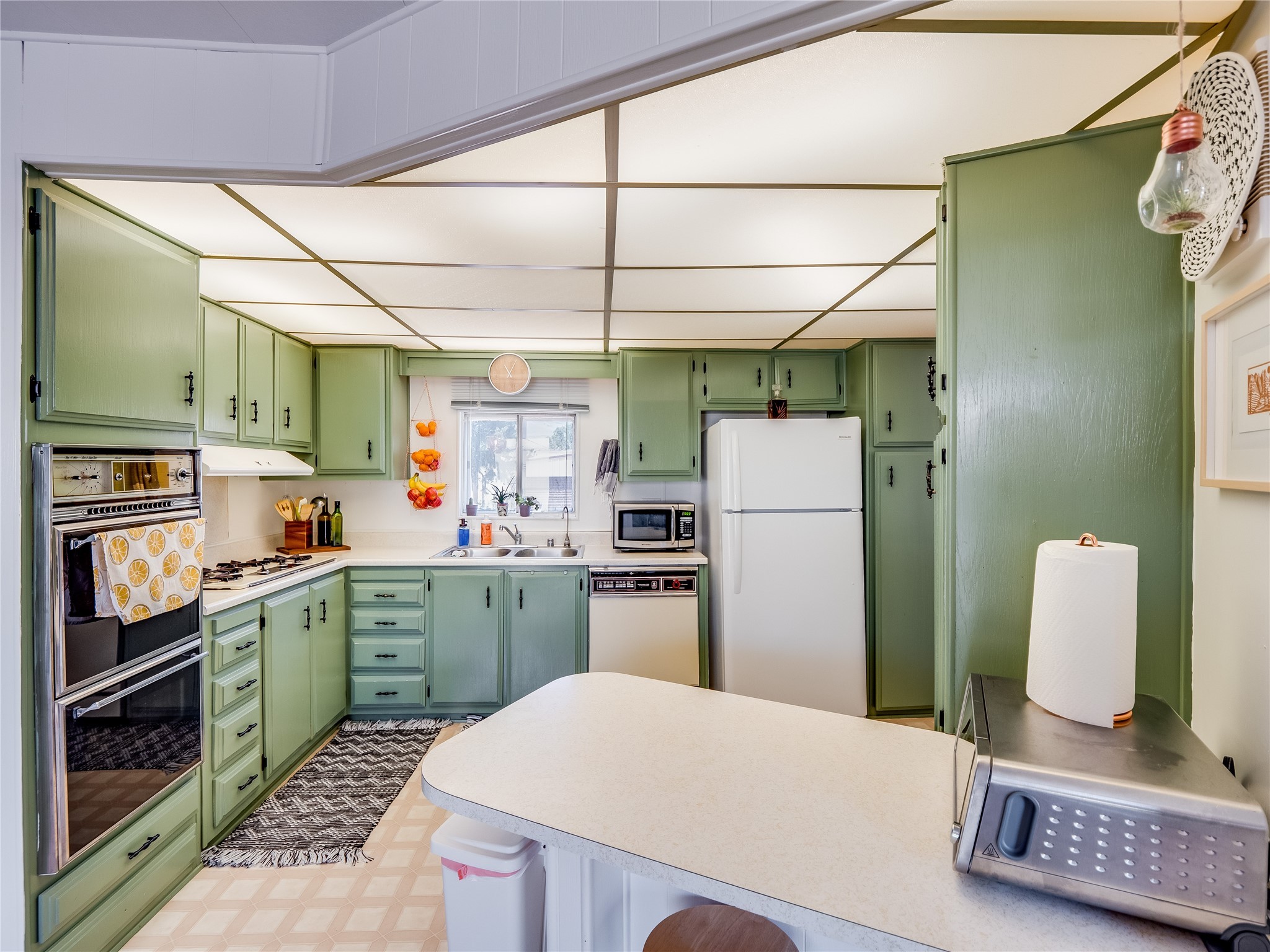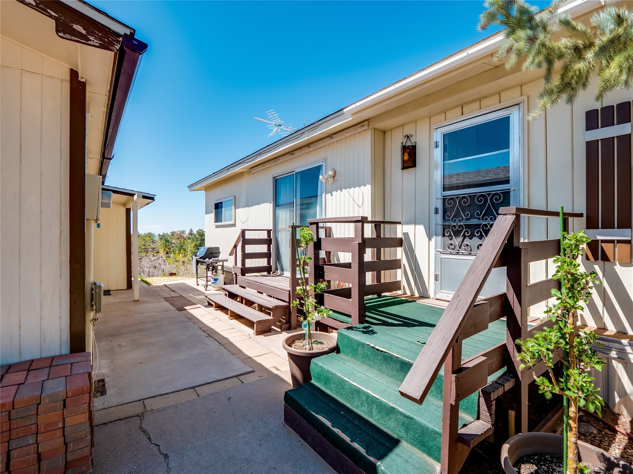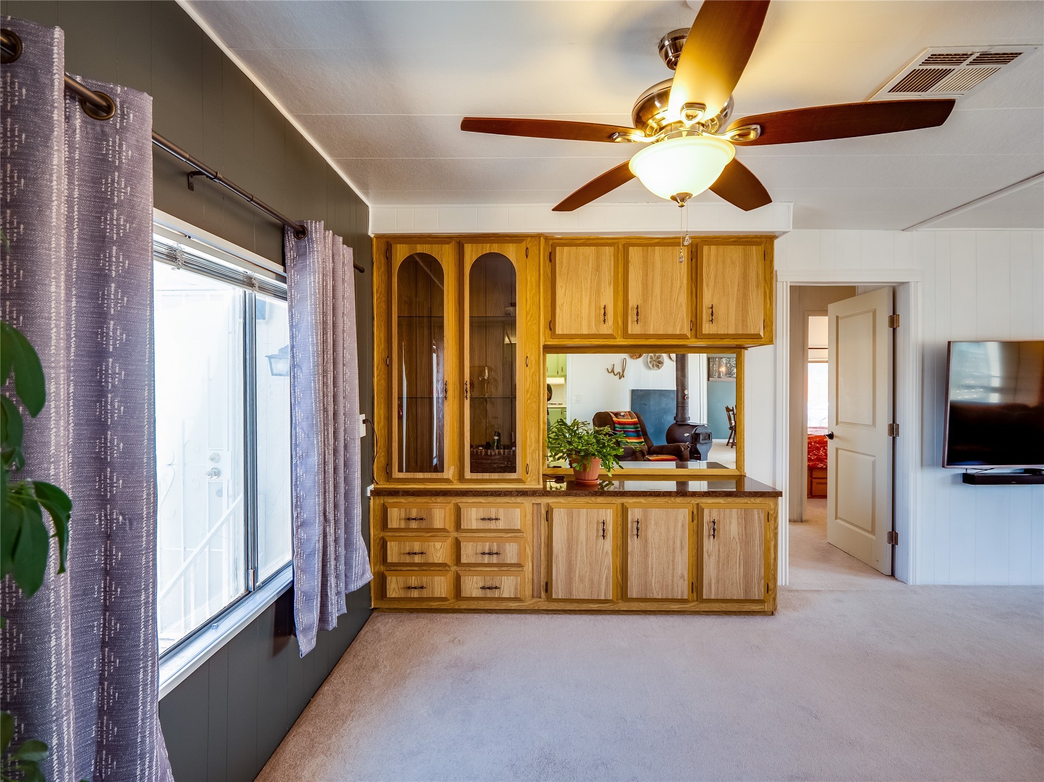 Welcome to this charming manufactured home nestled along the canyon edge in the peaceful Tsikumu Village neighborhood. Surrounded by nature and mature landscaping, the front yard boasts large, towering trees that frame the home and provide shade and privacy as you approach the front porch. Step up into the inviting entryway and immediately feel the warmth of the spacious carpeted living room that extends throughout the home. Cozy up by the wood-burning stove on chilly evenings, and enjoy the built-in cabinetry--perfect for displaying china or creating a convenient bar setup. The kitchen is both stylish and functional, featuring ample cabinet space with green cabinetry, black hardware, light countertops, a double oven, and a gas cooktop. A peninsula with bar seating offers a perfect spot for morning coffee or casual meals. Just off the kitchen is a bright dining area with sliding glass doors that open to the back patio--ideal for outdoor grilling and dining with a view. The generous primary en-suite is a private retreat with a large walk-in closet and an attached bathroom that includes a double sink vanity and a shower/tub combination. Two additional guest bedrooms offer comfortable accommodations, and a full guest bathroom with a single sink vanity serves the home. The laundry room leads to a versatile bonus room with a separate side entrance--great for a home office, studio, or hobby space. Outside, enjoy an open backyard with unobstructed views and stunning sights of the Sangre de Cristo Mountains. A grass lawn, a brick patio for entertaining, and retaining walls ideal for flower or vegetable gardens make this outdoor space versatile in creating your dream space. Located close to parks, scenic trails, and horse stalls, this home offers the perfect blend of comfort, convenience, and natural beauty. Book your tour today!