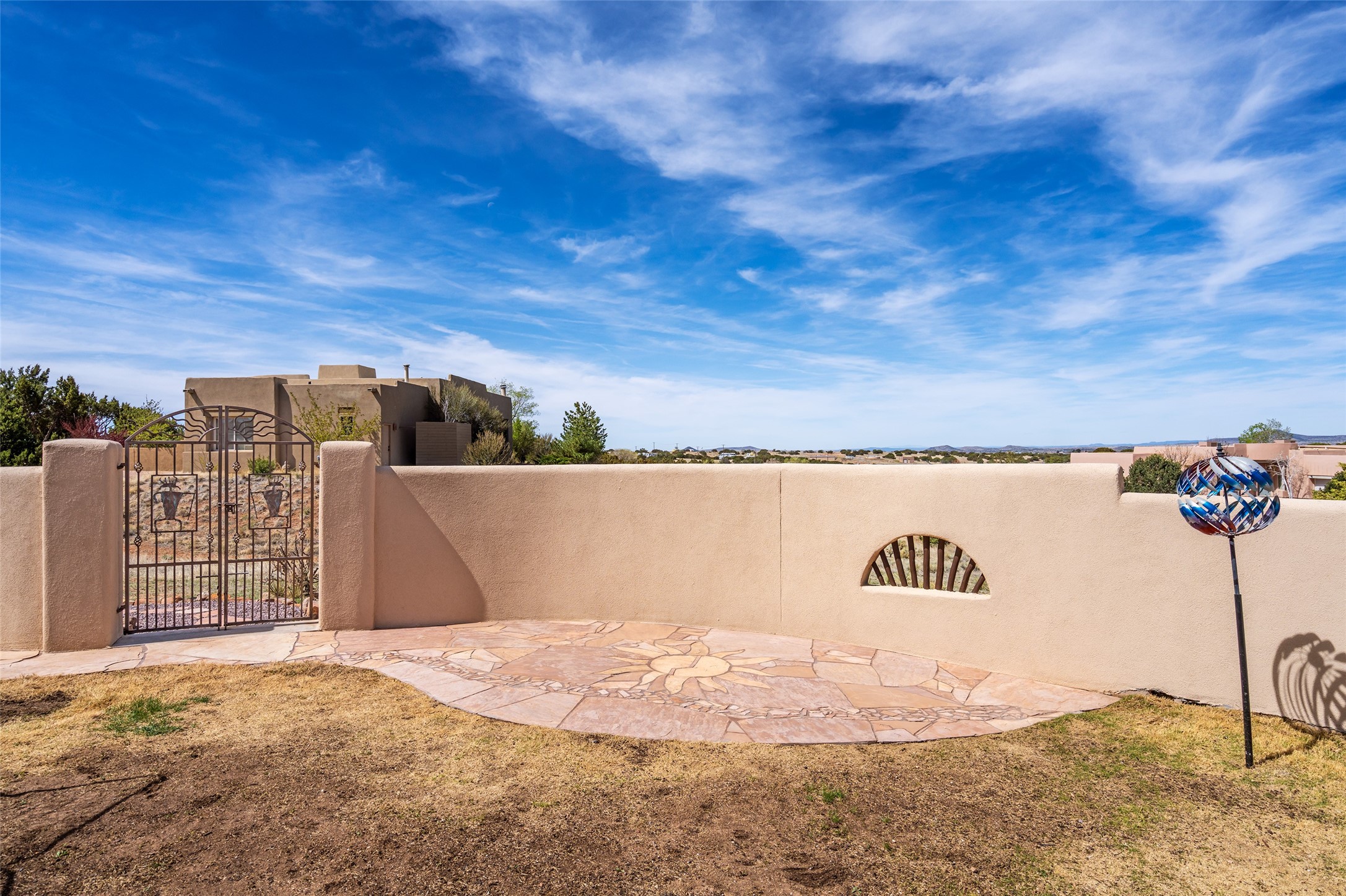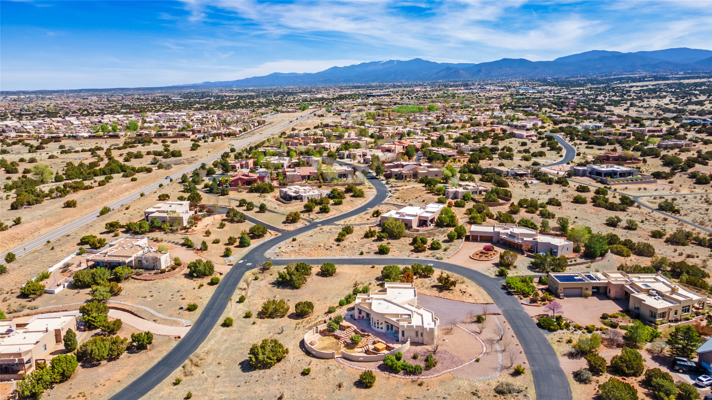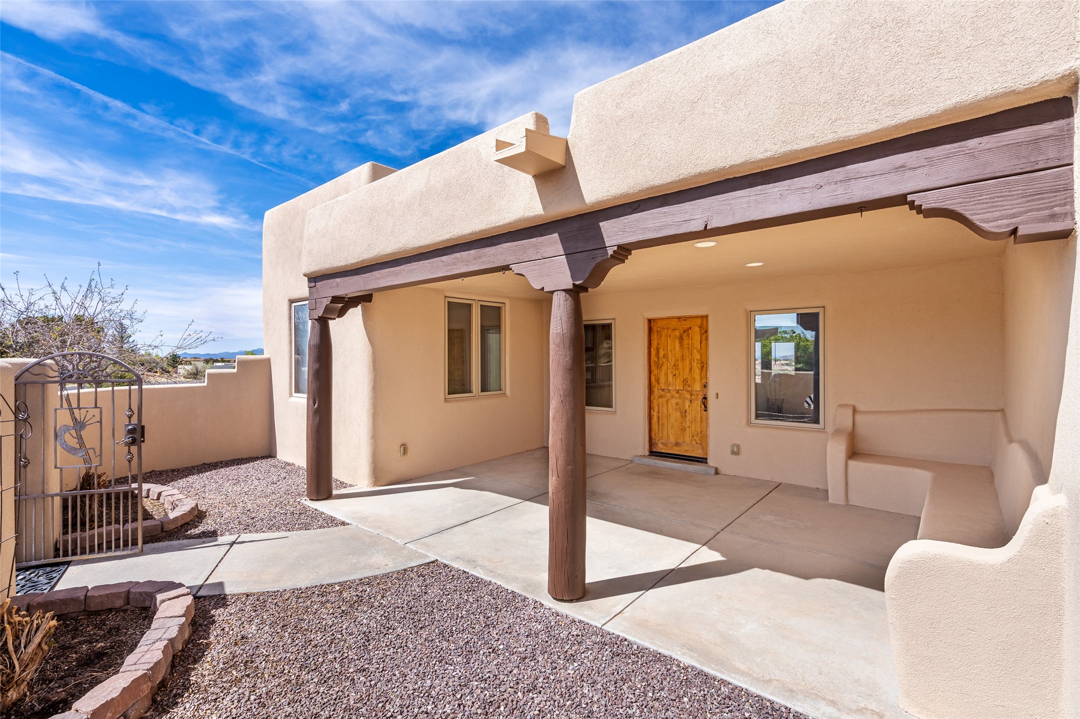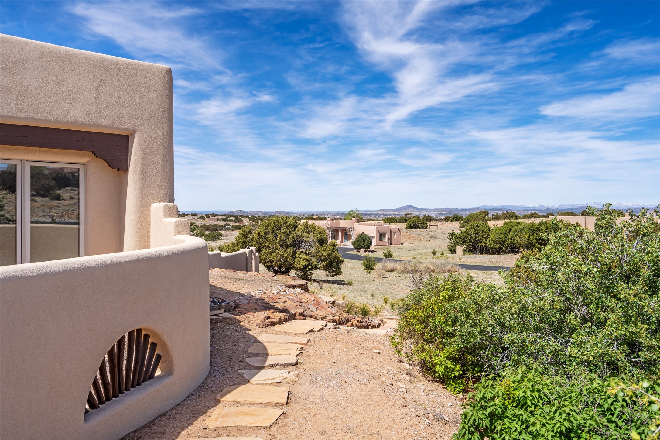 Welcome to this exceptional one-owner custom home, nestled in the coveted Estates section of Rancho Viejo. Set on a generous one-acre view lot, this thoughtfully designed single-level home offers 2,369 square feet of refined Southwest living. From the moment you enter, you'll be captivated by the stunning wood ceilings with vigas, artful nichos, and built-in shelving that blend function with authentic Santa Fe character. A dramatic two-sided gas fireplace anchors the living and dining areas, where a curved wall of windows frames breathtaking Jemez Mountain views. The well-appointed kitchen is a chef's delight, featuring custom wood cabinetry, luxurious granite counters, a stone tile backsplash, and premium appliances including a Dacor cooktop and wall oven, plus a Bosch dishwasher. The home's smart layout offers privacy and comfort, with a dedicated office and a spacious owner's suite in one wing. Enjoy a spa-like bathroom with dual vanities and a large, distinctive walk-in shower plus soaking tub, an oversized walk-in closet with safe cubby, and direct access to the rear portal from the serene primary bedroom. The opposite wing includes three additional bedrooms (one used as a hobby room), a stylish guest bath, a powder room, and a well-equipped laundry area. Outside, the landscaped backyard is a true retreat, complete with artistic custom flagstone patios, a soothing water feature, dramatic natural boulders, and a hot tub--perfect for relaxing under the stars. The oversized three-car garage includes space for a workshop or extra storage. Lovingly maintained and rich in Southwest charm, this home offers privacy, views, and elegant livability in one of Santa Fe's most desirable neighborhoods.