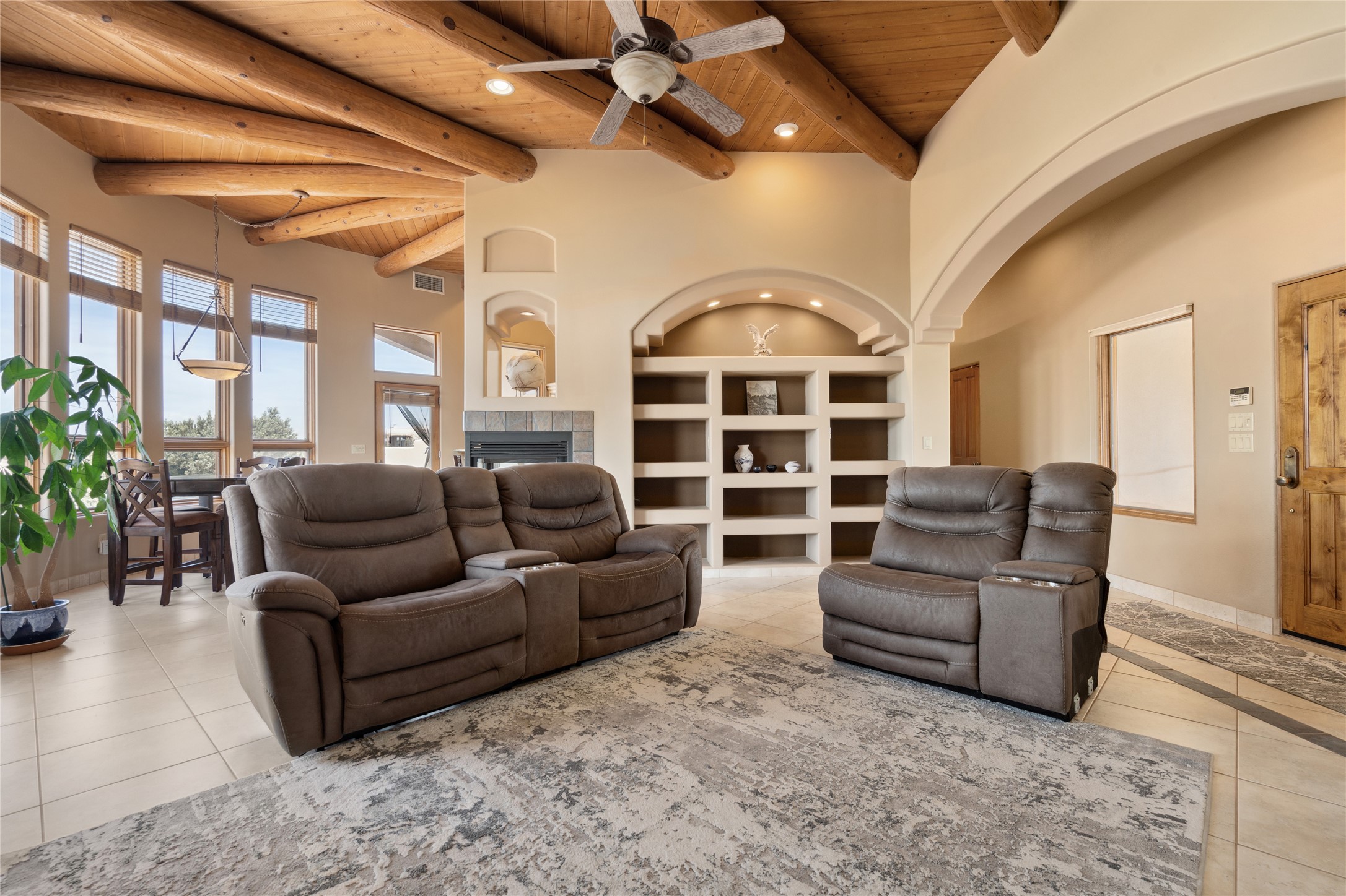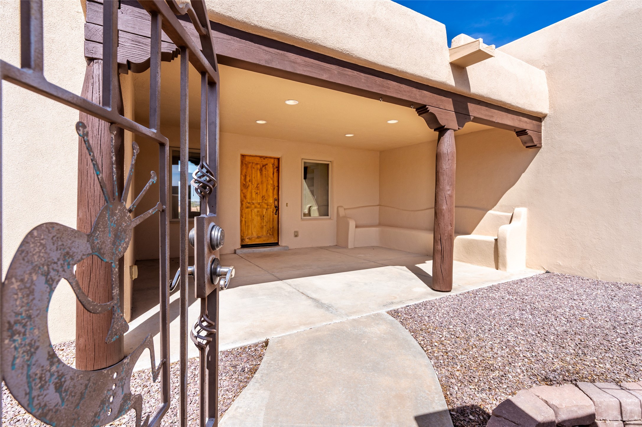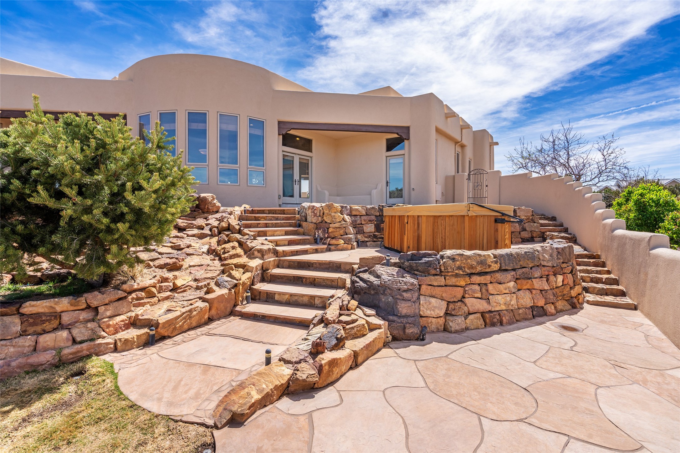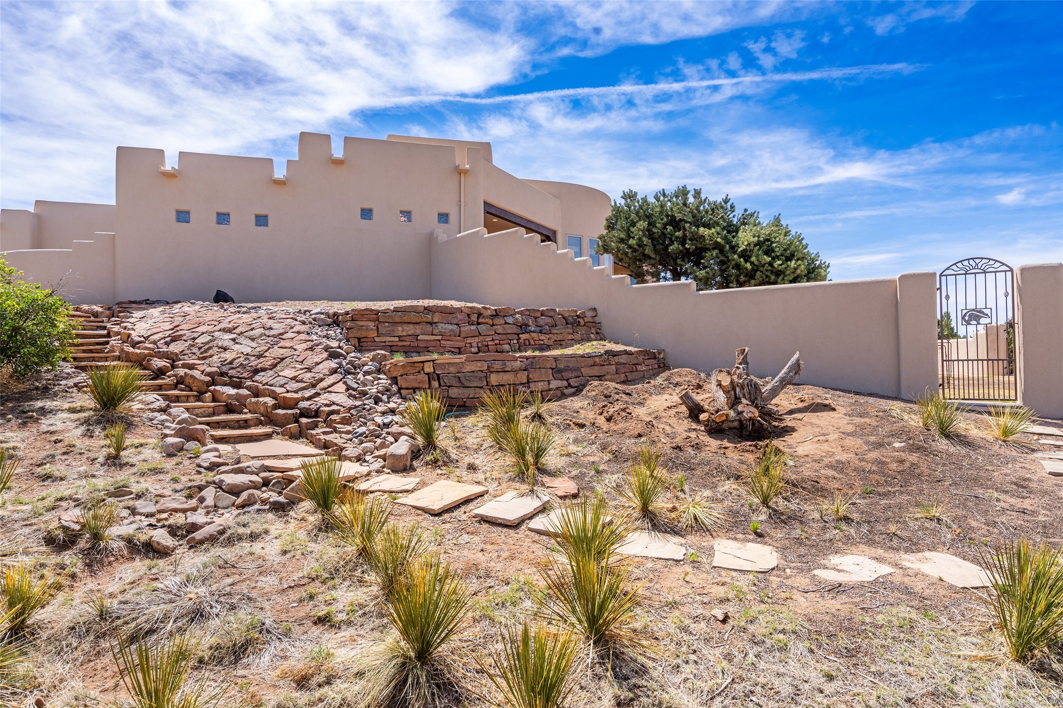 Welcome to this exceptional one-owner custom home, nestled in the coveted Estates section of Rancho Viejo. Set on a generous one-acre view lot, this thoughtfully designed single-level home offers 2,369 square feet of refined Southwest living. From the moment you enter, you'll be captivated by the stunning wood ceilings with vigas, artful nichos, and built-in shelving that blend function with authentic Santa Fe character. A dramatic two-sided gas fireplace anchors the living and dining areas, where a curved wall of windows frames breathtaking Jemez Mountain views. The well-appointed kitchen is a chef's delight, featuring custom wood cabinetry, luxurious granite counters, a stone tile backsplash, and premium appliances including a Dacor cooktop and wall oven, plus a Bosch dishwasher. The home's smart layout offers privacy and comfort, with a dedicated office and a spacious owner's suite in one wing. Enjoy a spa-like bathroom with dual vanities and a large, distinctive walk-in shower plus soaking tub, an oversized walk-in closet with safe cubby, and direct access to the rear portal from the serene primary bedroom. The opposite wing includes three additional bedrooms (one used as a hobby room), a stylish guest bath, a powder room, and a well-equipped laundry area. Outside, the landscaped backyard is a true retreat, complete with artistic custom flagstone patios, a soothing water feature, dramatic natural boulders, and a hot tub--perfect for relaxing under the stars. The oversized three-car garage includes space for a workshop or extra storage. Lovingly maintained and rich in Southwest charm, this home offers privacy, views, and elegant livability in one of Santa Fe's most desirable neighborhoods.