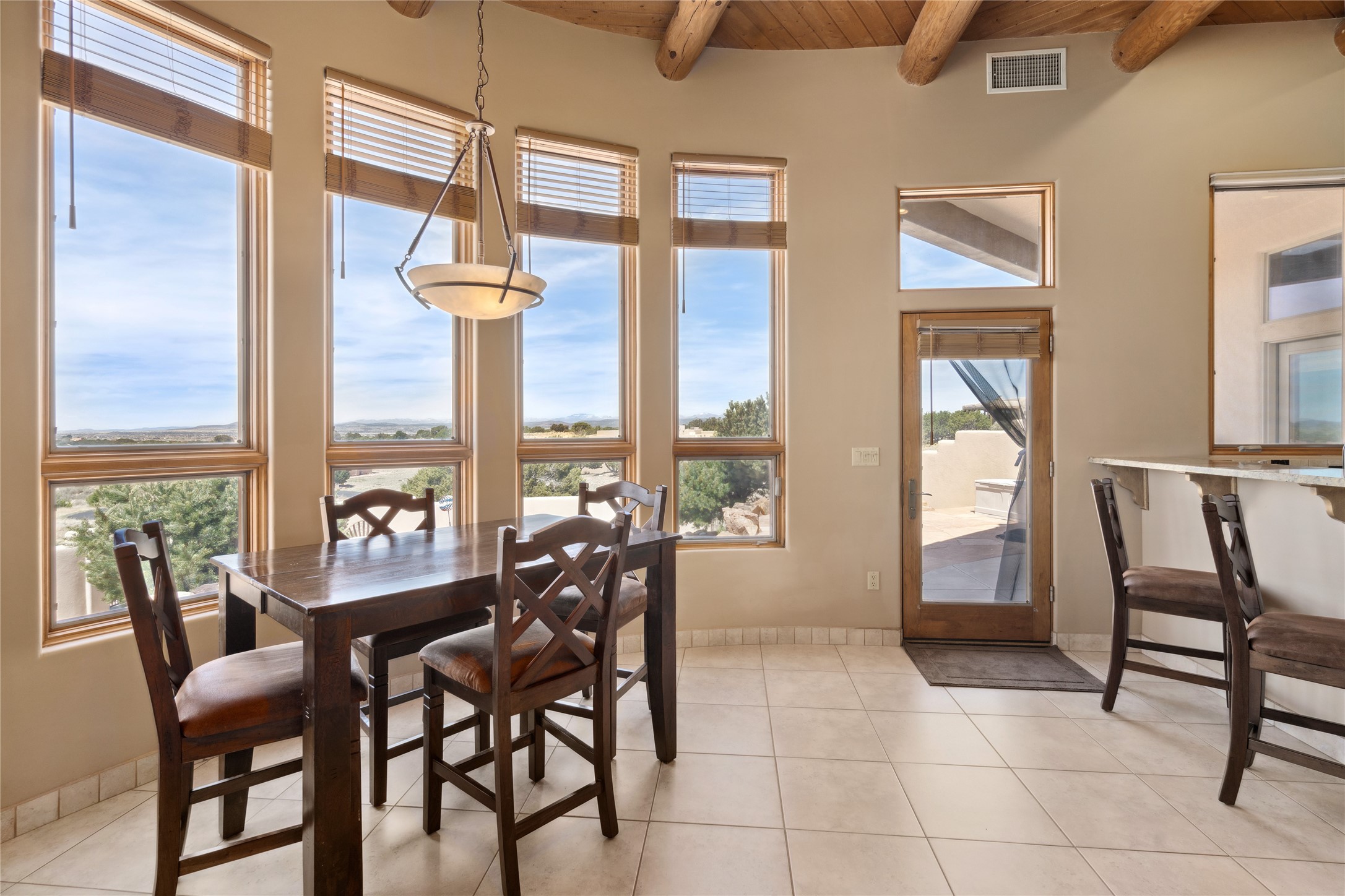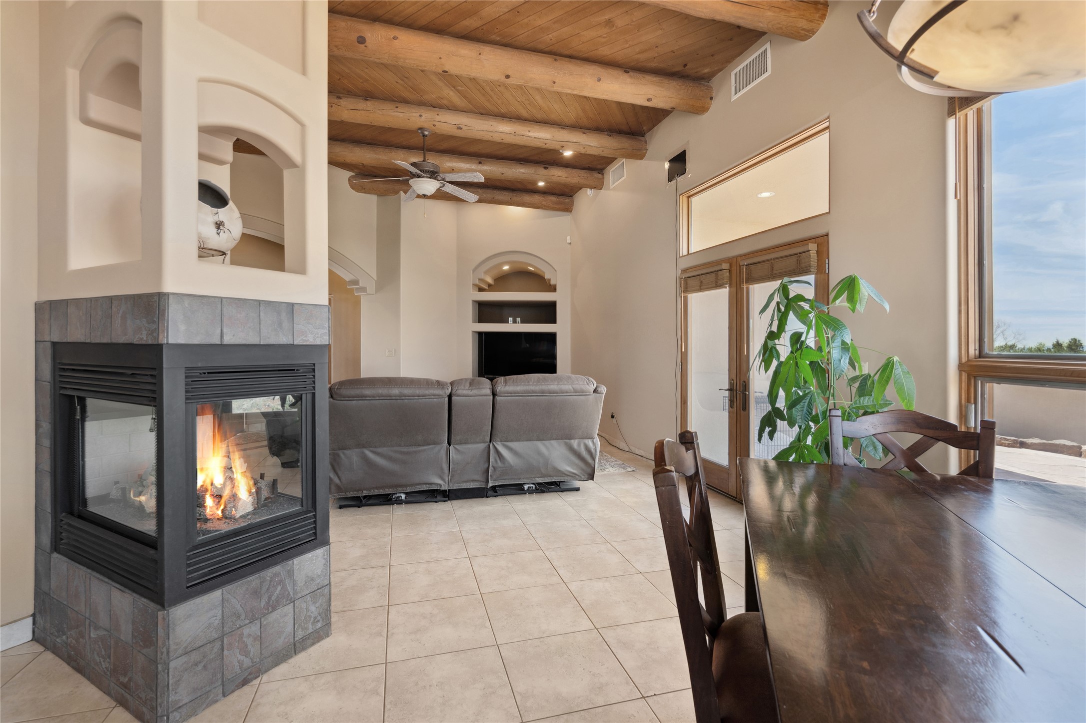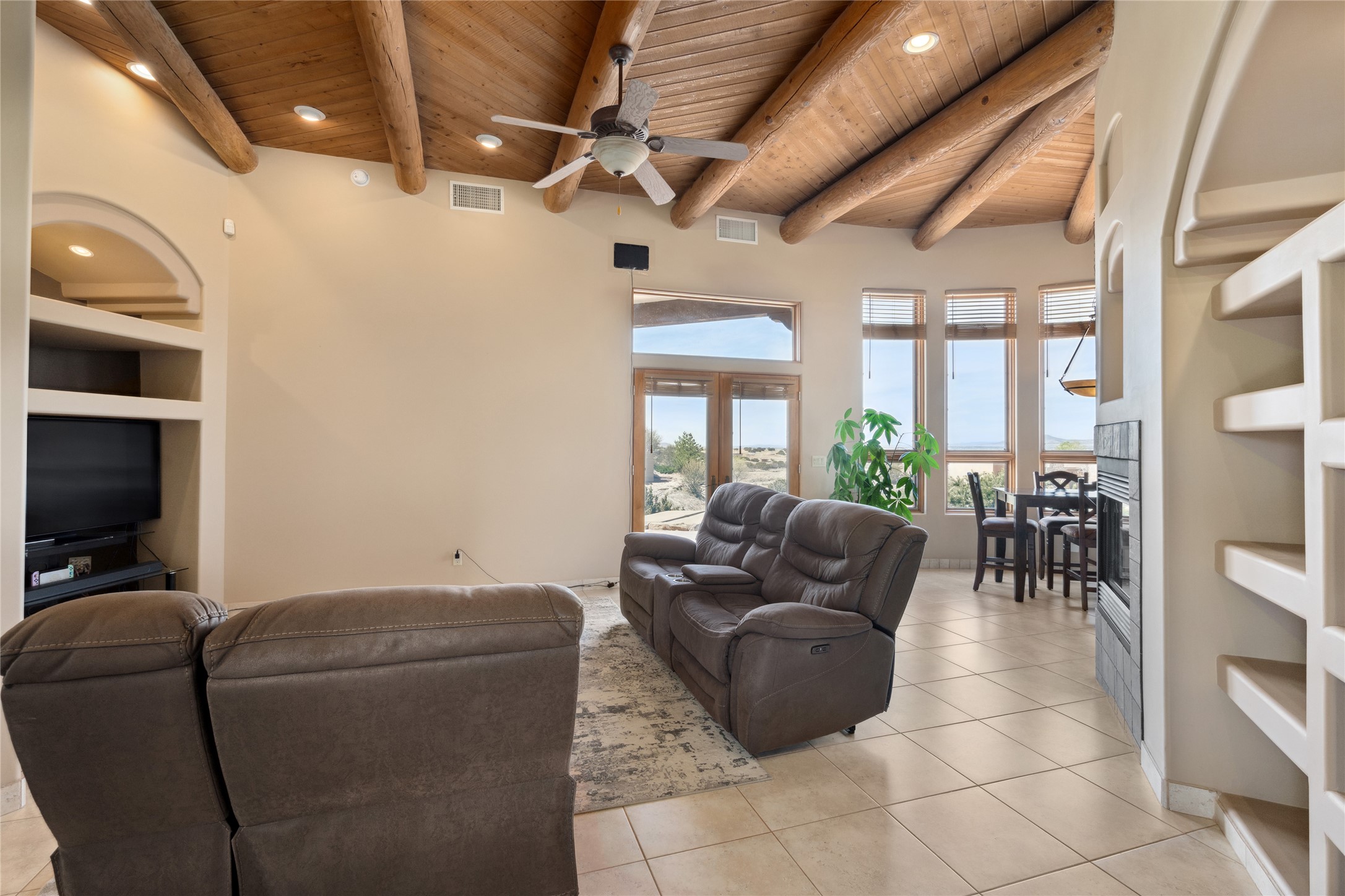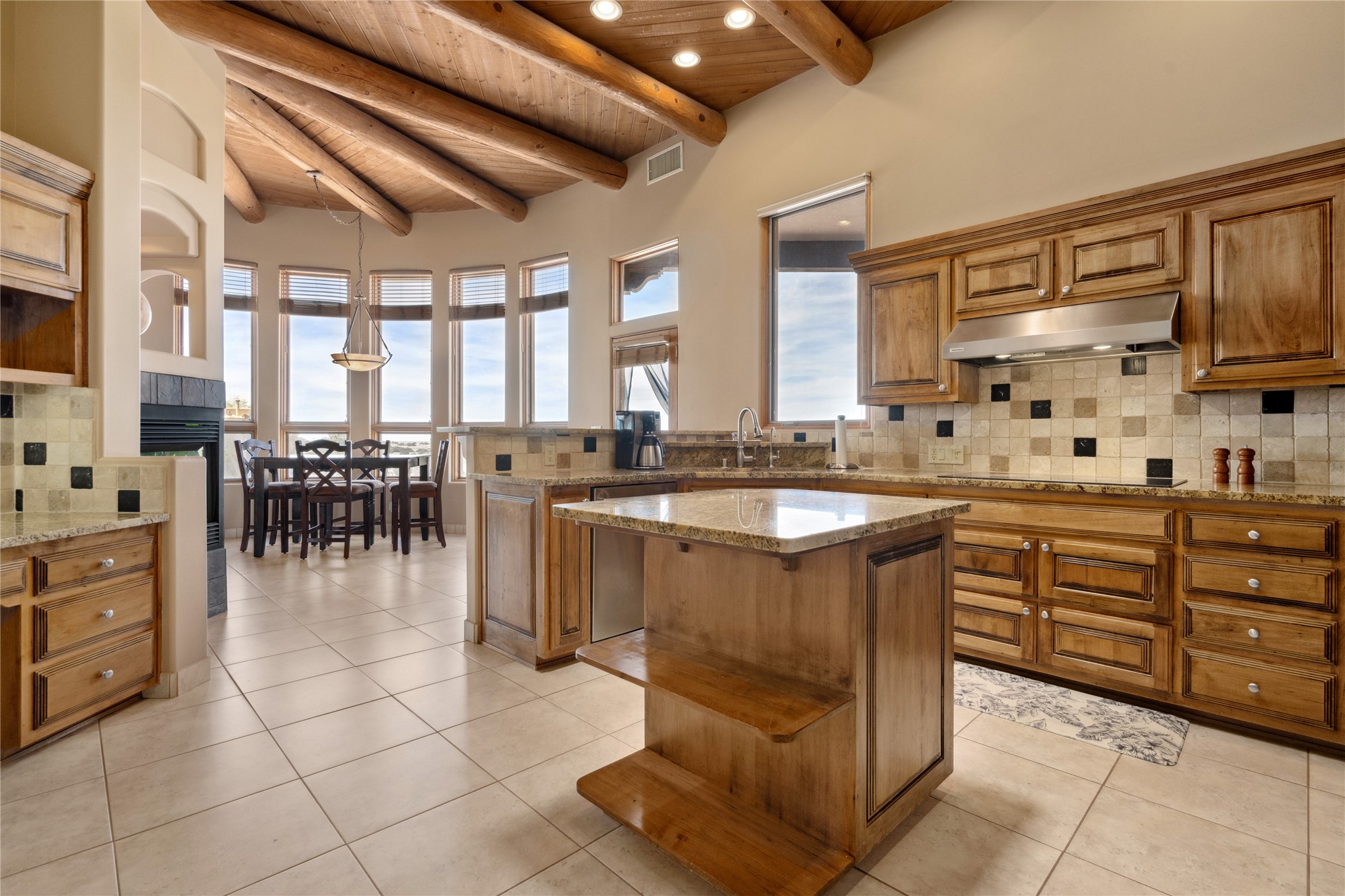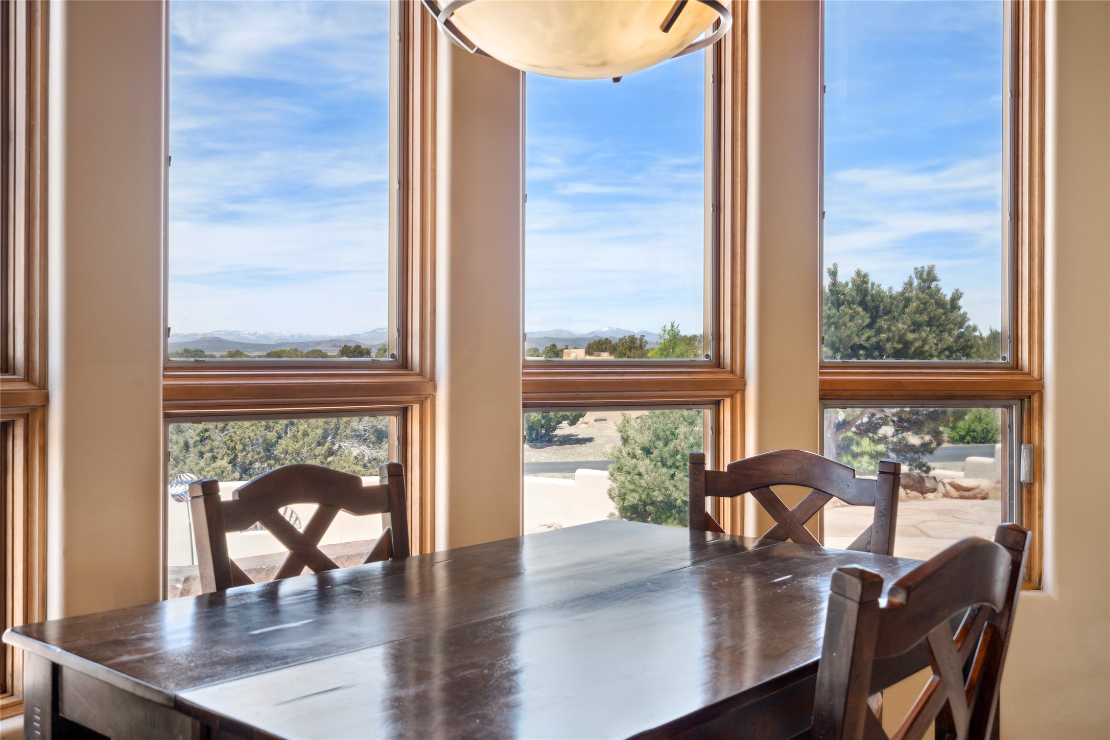 Welcome to this exceptional one-owner custom home, nestled in the coveted Estates section of Rancho Viejo. Set on a generous one-acre view lot, this thoughtfully designed single-level home offers 2,369 square feet of refined Southwest living. From the moment you enter, you'll be captivated by the stunning wood ceilings with vigas, artful nichos, and built-in shelving that blend function with authentic Santa Fe character. A dramatic two-sided gas fireplace anchors the living and dining areas, where a curved wall of windows frames breathtaking Jemez Mountain views. The well-appointed kitchen is a chef's delight, featuring custom wood cabinetry, luxurious granite counters, a stone tile backsplash, and premium appliances including a Dacor cooktop and wall oven, plus a Bosch dishwasher. The home's smart layout offers privacy and comfort, with a dedicated office and a spacious owner's suite in one wing. Enjoy a spa-like bathroom with dual vanities and a large, distinctive walk-in shower plus soaking tub, an oversized walk-in closet with safe cubby, and direct access to the rear portal from the serene primary bedroom. The opposite wing includes three additional bedrooms (one used as a hobby room), a stylish guest bath, a powder room, and a well-equipped laundry area. Outside, the landscaped backyard is a true retreat, complete with artistic custom flagstone patios, a soothing water feature, dramatic natural boulders, and a hot tub--perfect for relaxing under the stars. The oversized three-car garage includes space for a workshop or extra storage. Lovingly maintained and rich in Southwest charm, this home offers privacy, views, and elegant livability in one of Santa Fe's most desirable neighborhoods.