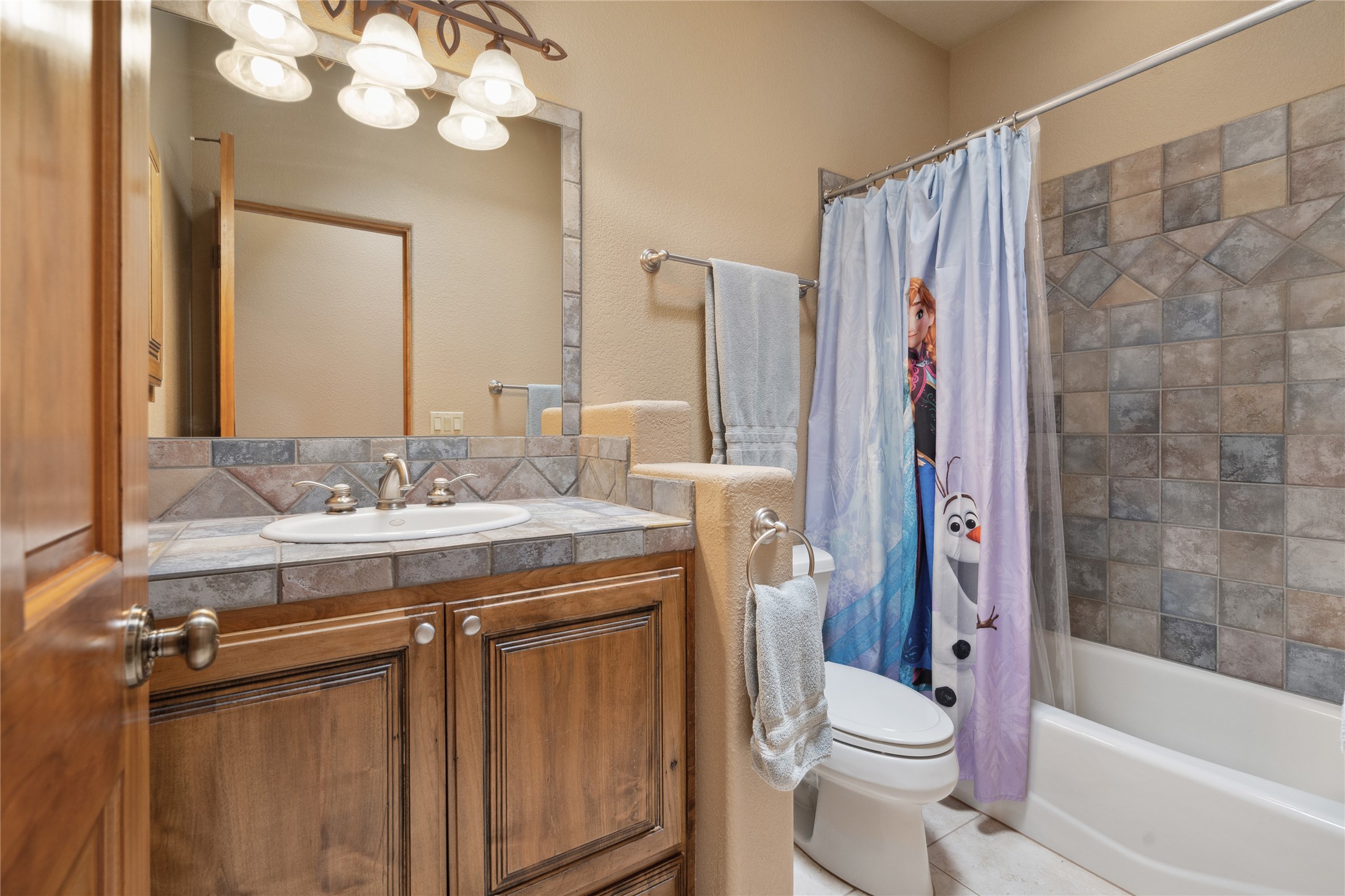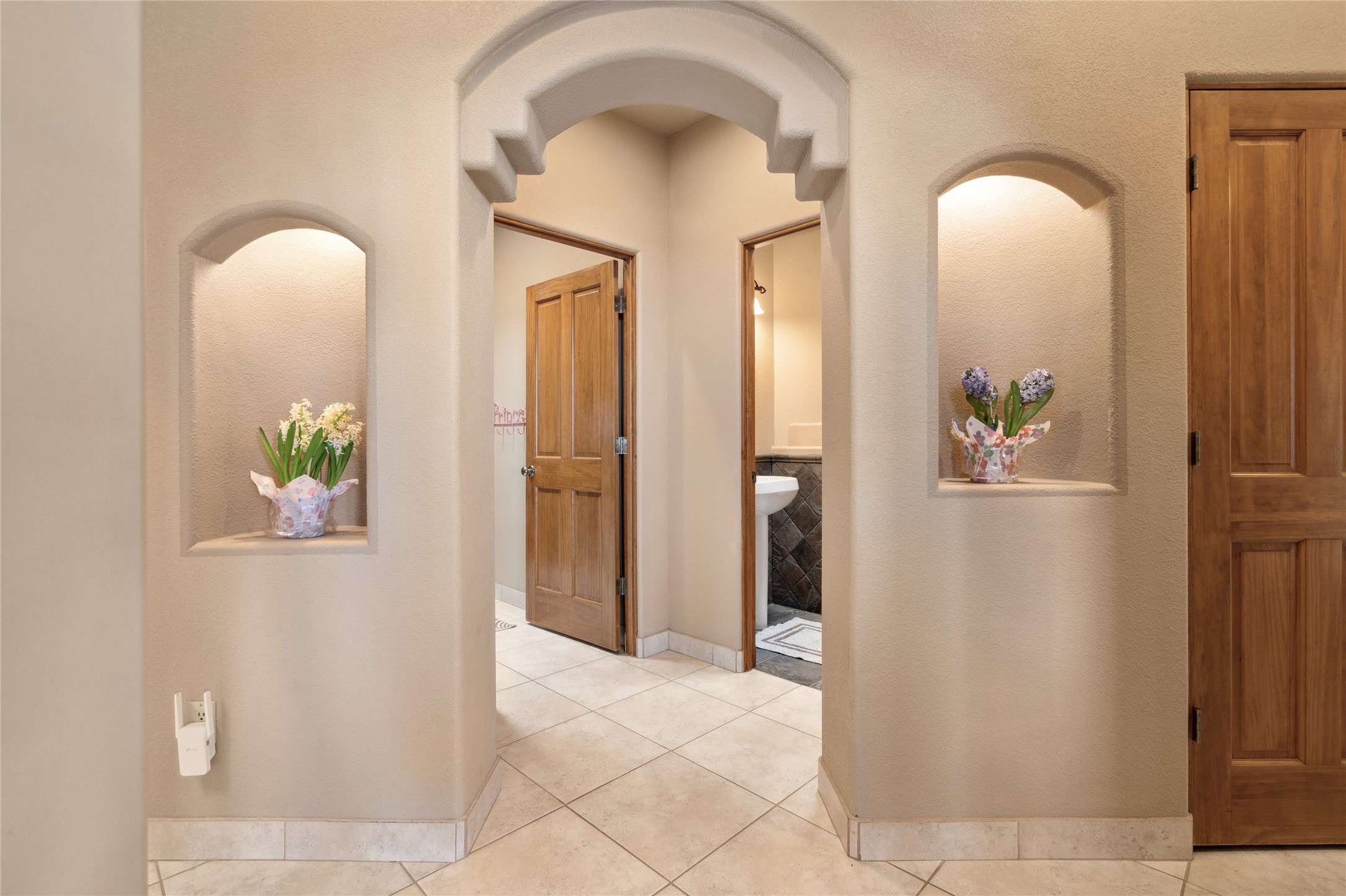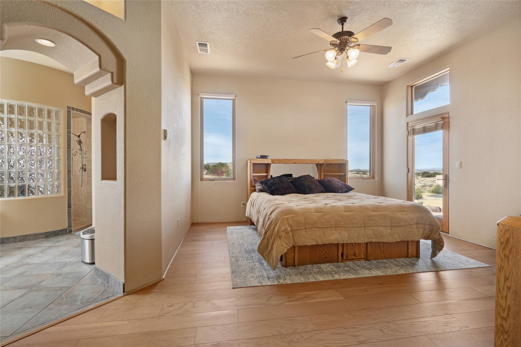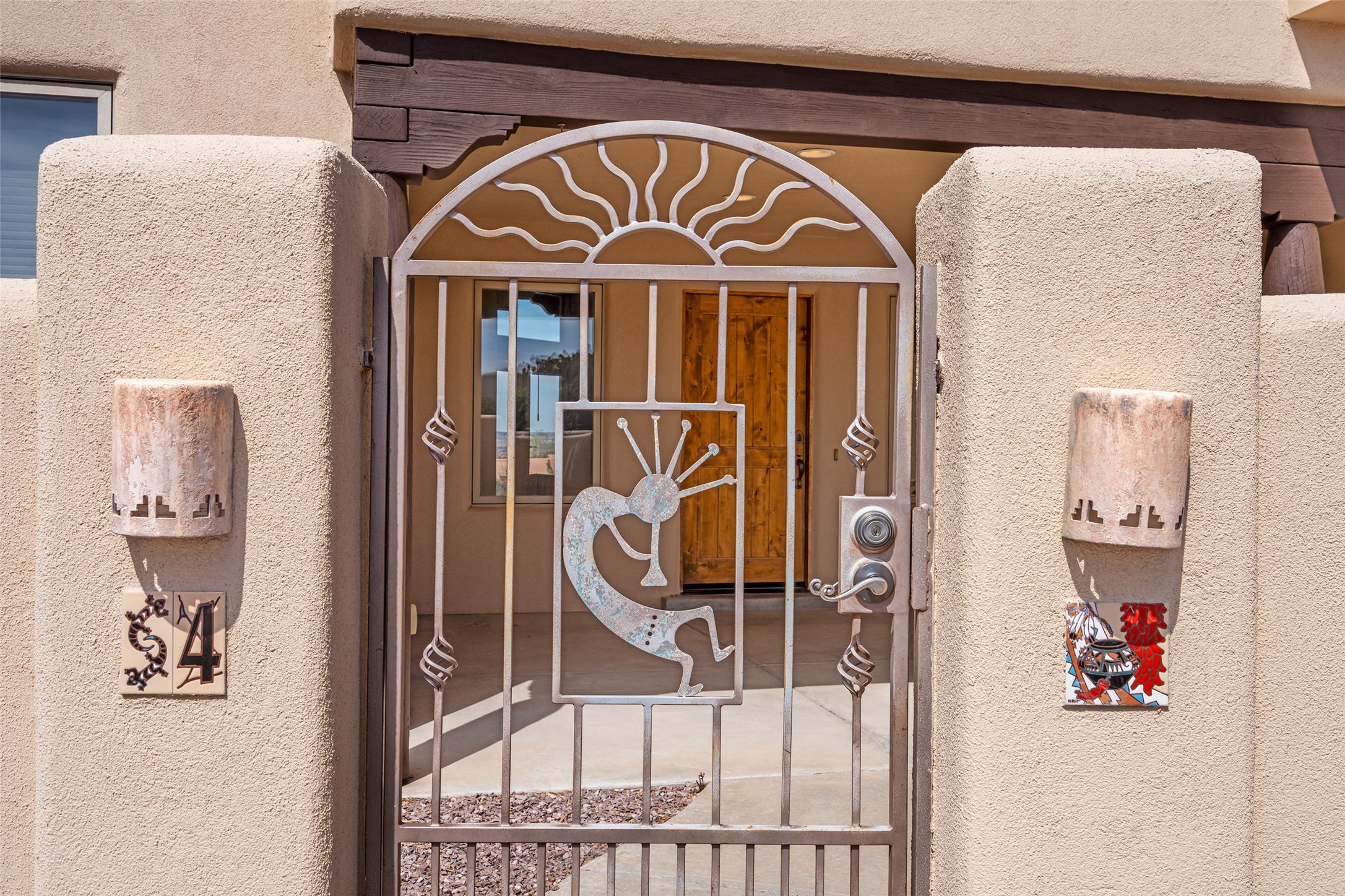 Welcome to this exceptional one-owner custom home, nestled in the coveted Estates section of Rancho Viejo. Set on a generous one-acre view lot, this thoughtfully designed single-level home offers 2,369 square feet of refined Southwest living. From the moment you enter, you'll be captivated by the stunning wood ceilings with vigas, artful nichos, and built-in shelving that blend function with authentic Santa Fe character. A dramatic two-sided gas fireplace anchors the living and dining areas, where a curved wall of windows frames breathtaking Jemez Mountain views. The well-appointed kitchen is a chef's delight, featuring custom wood cabinetry, luxurious granite counters, a stone tile backsplash, and premium appliances including a Dacor cooktop and wall oven, plus a Bosch dishwasher. The home's smart layout offers privacy and comfort, with a dedicated office and a spacious owner's suite in one wing. Enjoy a spa-like bathroom with dual vanities and a large, distinctive walk-in shower plus soaking tub, an oversized walk-in closet with safe cubby, and direct access to the rear portal from the serene primary bedroom. The opposite wing includes three additional bedrooms (one used as a hobby room), a stylish guest bath, a powder room, and a well-equipped laundry area. Outside, the landscaped backyard is a true retreat, complete with artistic custom flagstone patios, a soothing water feature, dramatic natural boulders, and a hot tub--perfect for relaxing under the stars. The oversized three-car garage includes space for a workshop or extra storage. Lovingly maintained and rich in Southwest charm, this home offers privacy, views, and elegant livability in one of Santa Fe's most desirable neighborhoods.
