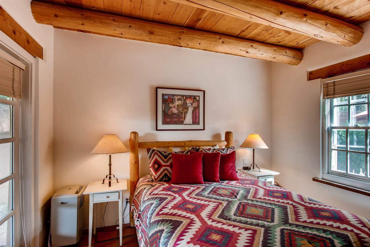 Imagine owning a quarter share in a beautifully managed, fully furnished downtown vacation condo! Picture this: a spacious two-story open ceiling in the living room, bathed in light and perfect for entertaining. The social kitchen, dining, and living areas flow seamlessly together. Plus, there's a Weber gas grill just waiting for you right out the back door, and a lovely, walled yard with an outdoor dining area. And get this--a deck with stunning views from the second-floor landing! The bedrooms are well-separated for privacy, and each one boasts a cozy kiva-style fireplace. The main floor features smooth plaster walls, vigas, and Satillo floors, while the second floor has pine wood floors. And don't forget the charming Talavera tile in the bathrooms and kitchen (complete with butcher-block countertops)!