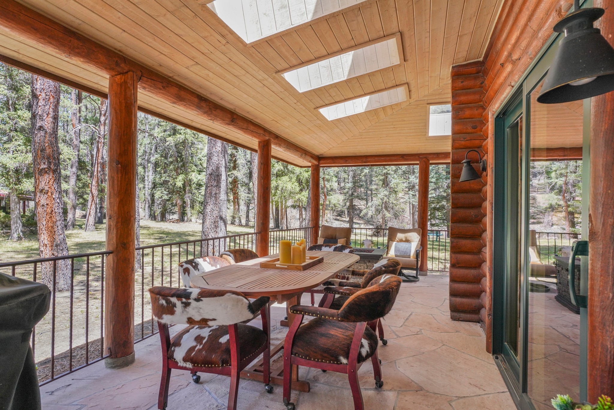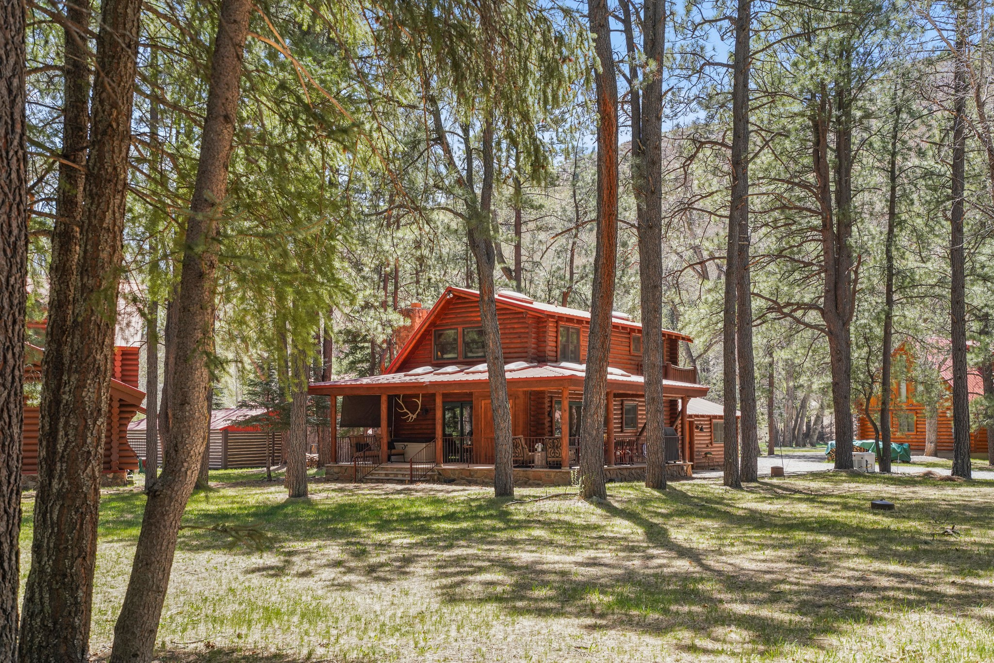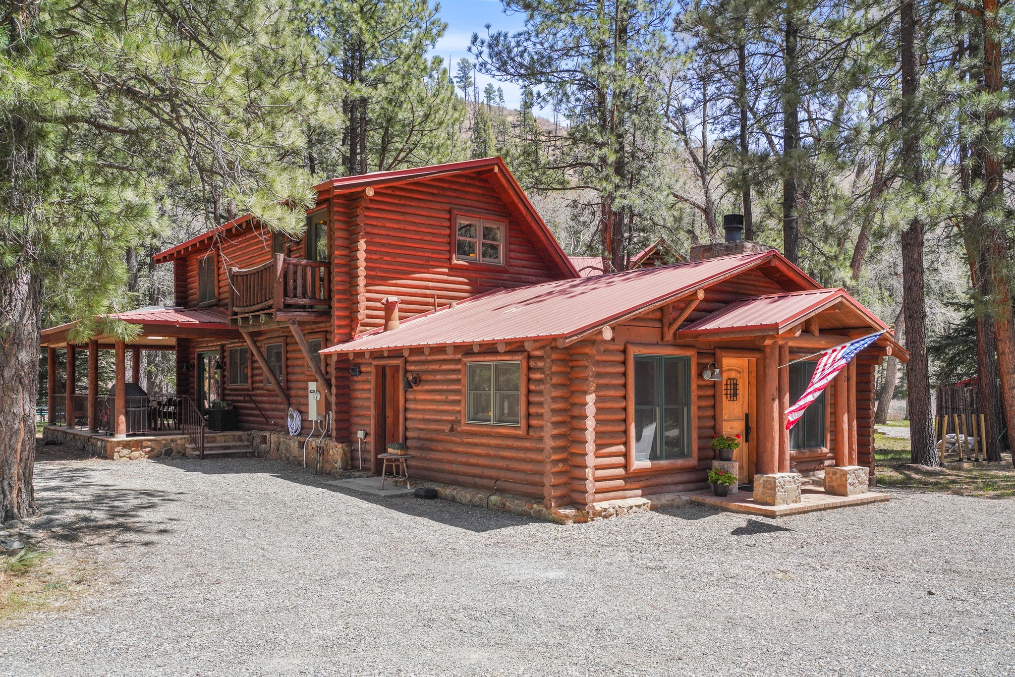 This exceptional log cabin offers rare riverfront living in a gated log home community, less than an hour from Santa Fe. With 1,700 feet of shared river frontage, three serene ponds, and an on-site caretaker, the property blends natural beauty with privacy, security, and ease of ownership.Crafted with authenticity and warmth, the 3-bedroom, 2-bath cabin features two inviting living areas, each with its own stone fireplace. The spacious main living room boasts high beamed ceilings and a charming office nook, while a cozy den off the eat-in kitchen showcases traditional vigas that echo the spirit of the Southwest.The main floor includes a comfortable bedroom and bath, while upstairs, two generous bedrooms and an additional full bath offer treetop views and peaceful retreats. Just off the kitchen and den, a wrap-around covered deck with skylights and flagstone floors creates a seamless indoor-outdoor living space--ideal for entertaining or simply enjoying the sights and sounds of the river. The property is being offered furnished as shown.A rare opportunity to own a legacy mountain retreat that combines natural splendor, thoughtful design, and convenient access to Santa Fe.