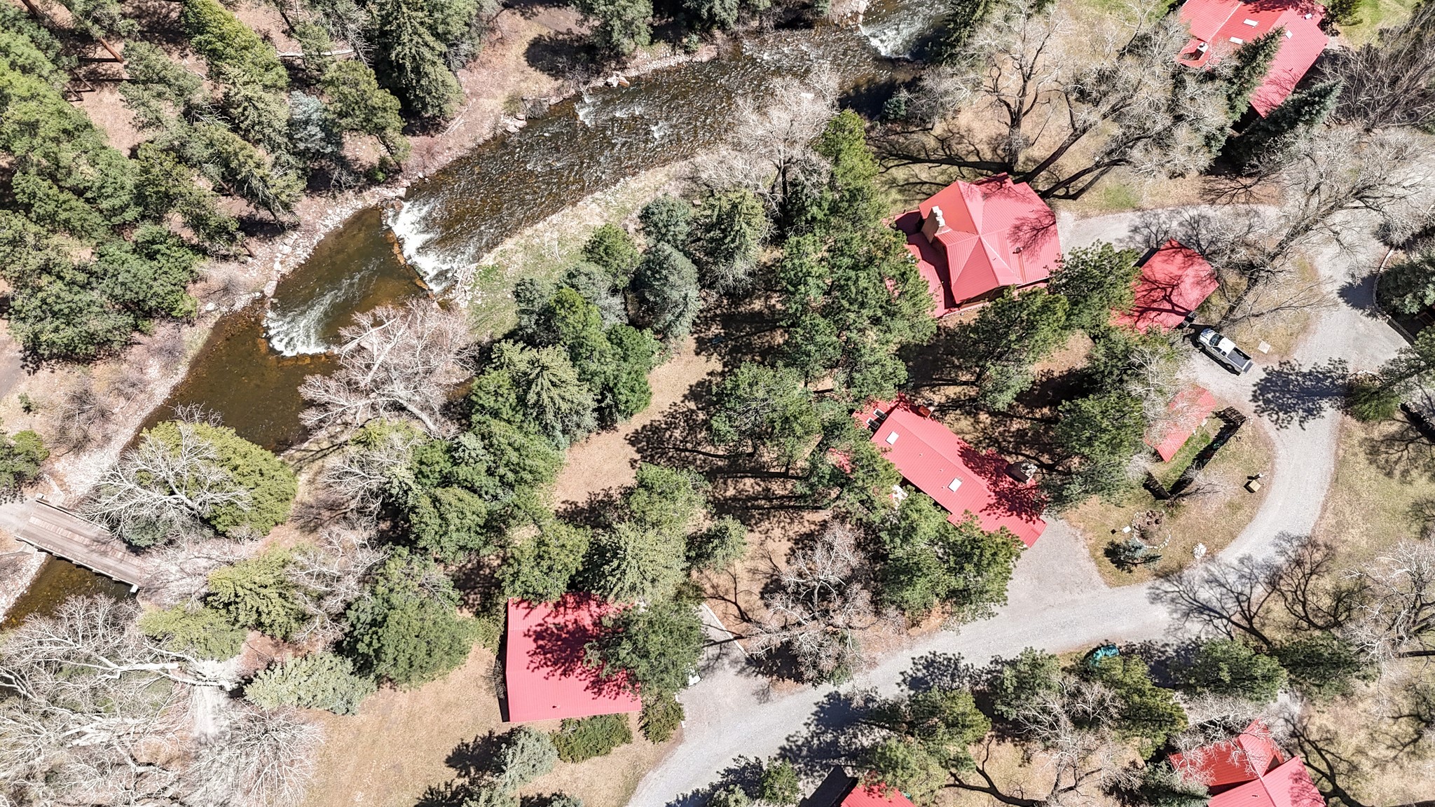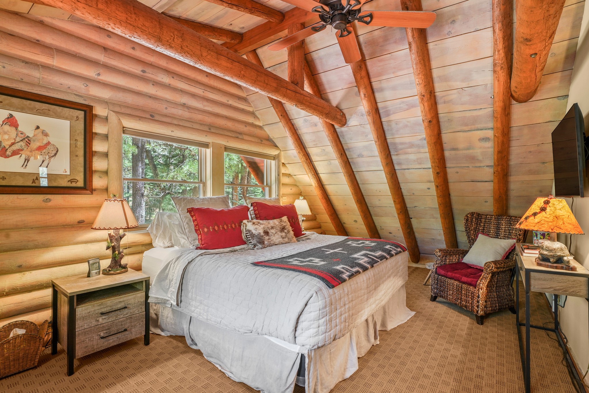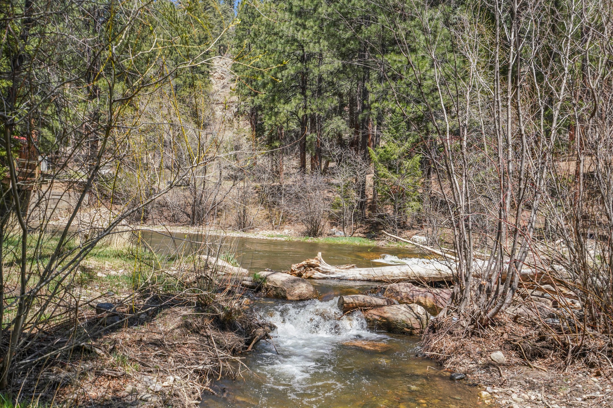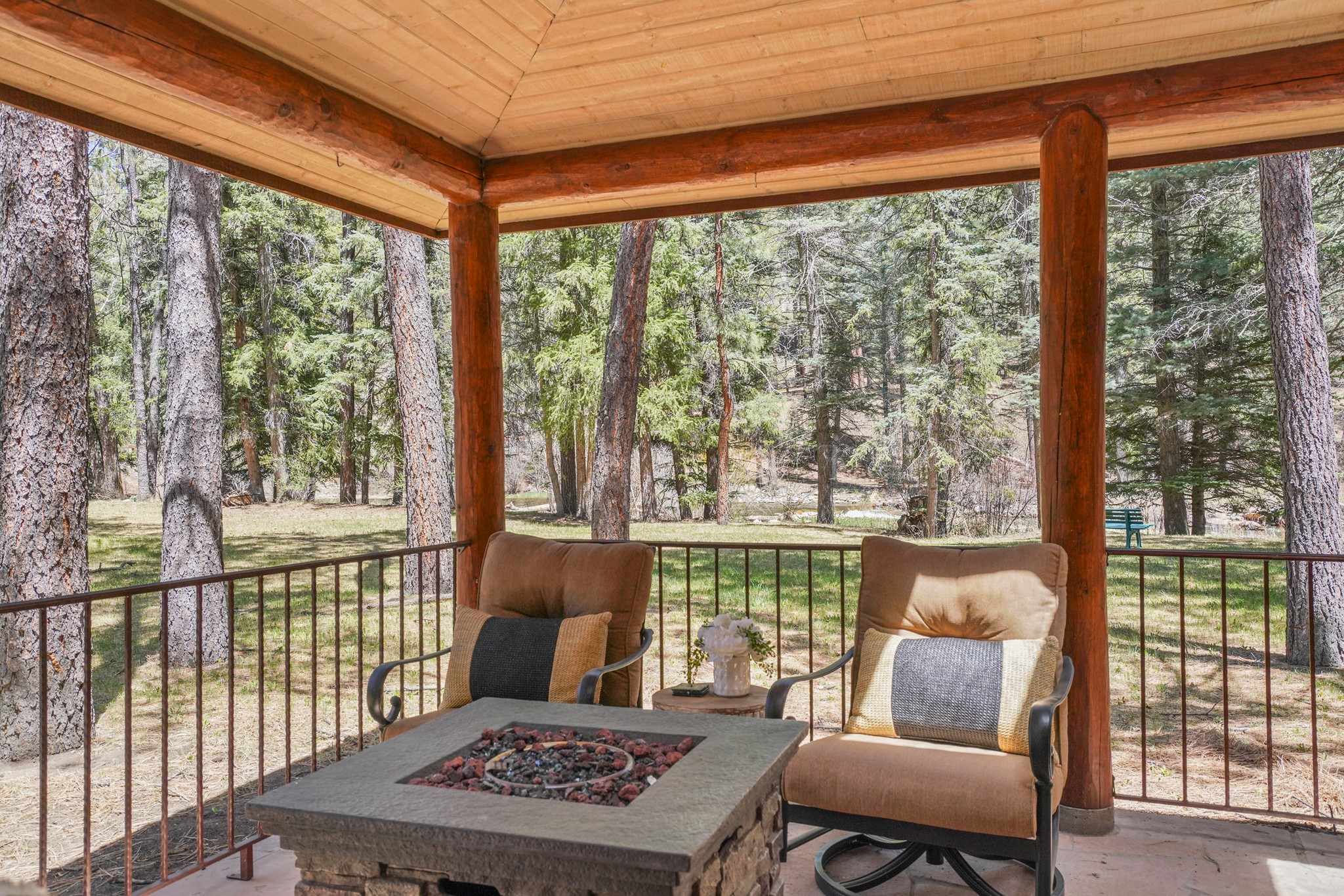 This exceptional log cabin offers rare riverfront living in a gated log home community, less than an hour from Santa Fe. With 1,700 feet of shared river frontage, three serene ponds, and an on-site caretaker, the property blends natural beauty with privacy, security, and ease of ownership.Crafted with authenticity and warmth, the 3-bedroom, 2-bath cabin features two inviting living areas, each with its own stone fireplace. The spacious main living room boasts high beamed ceilings and a charming office nook, while a cozy den off the eat-in kitchen showcases traditional vigas that echo the spirit of the Southwest.The main floor includes a comfortable bedroom and bath, while upstairs, two generous bedrooms and an additional full bath offer treetop views and peaceful retreats. Just off the kitchen and den, a wrap-around covered deck with skylights and flagstone floors creates a seamless indoor-outdoor living space--ideal for entertaining or simply enjoying the sights and sounds of the river. The property is being offered furnished as shown.A rare opportunity to own a legacy mountain retreat that combines natural splendor, thoughtful design, and convenient access to Santa Fe.
