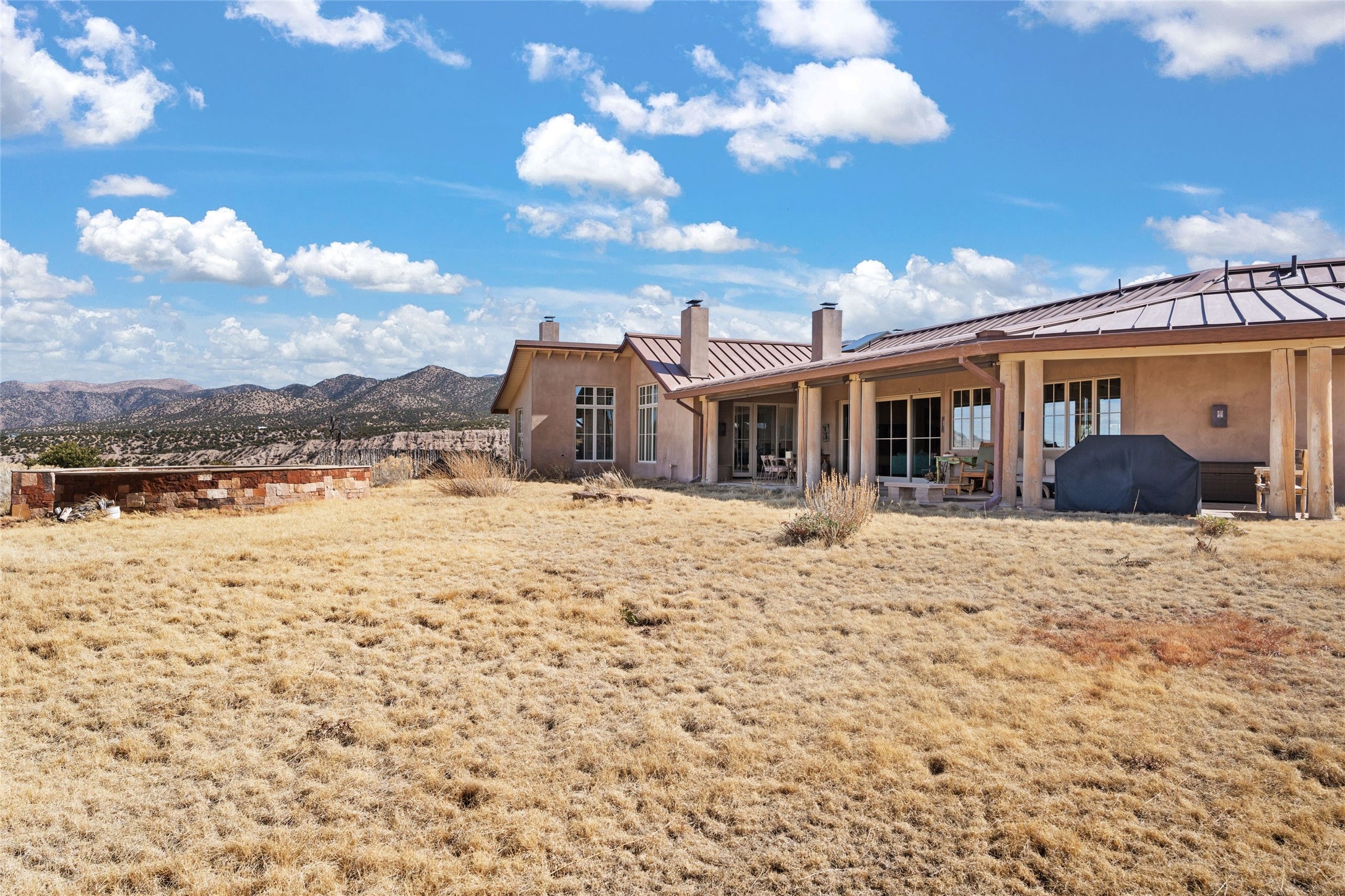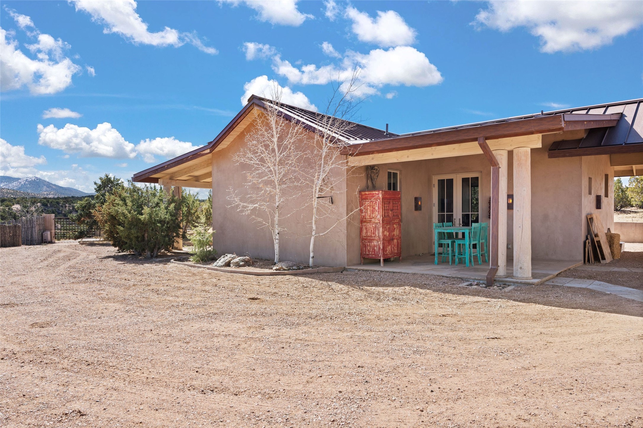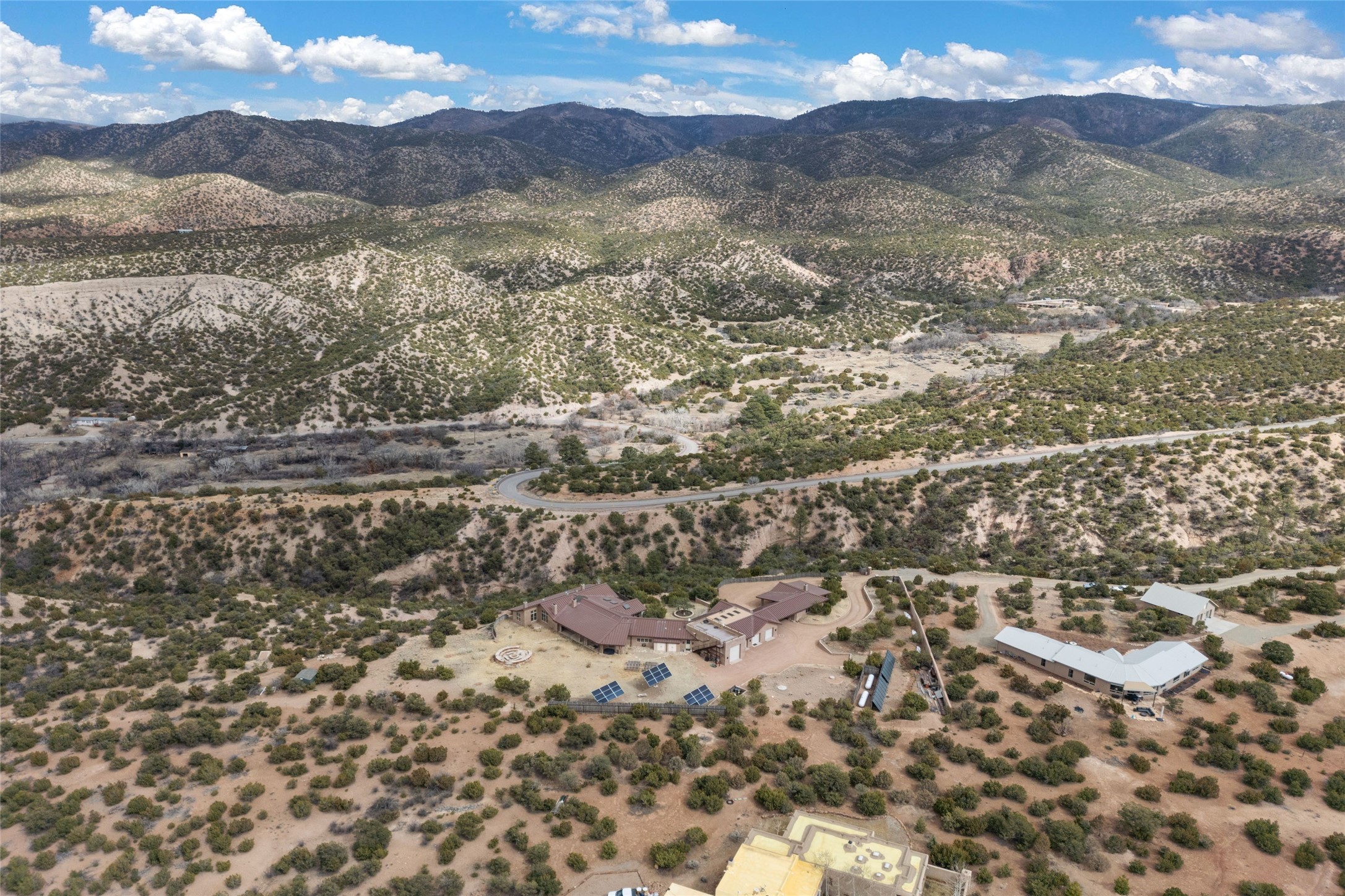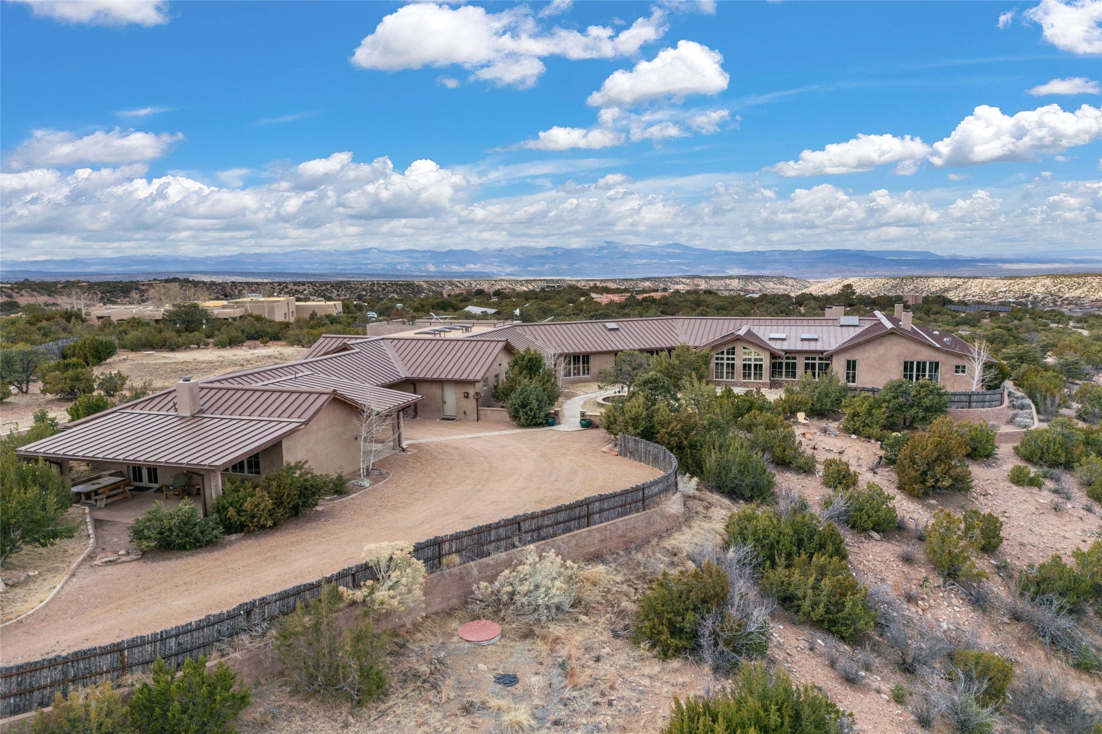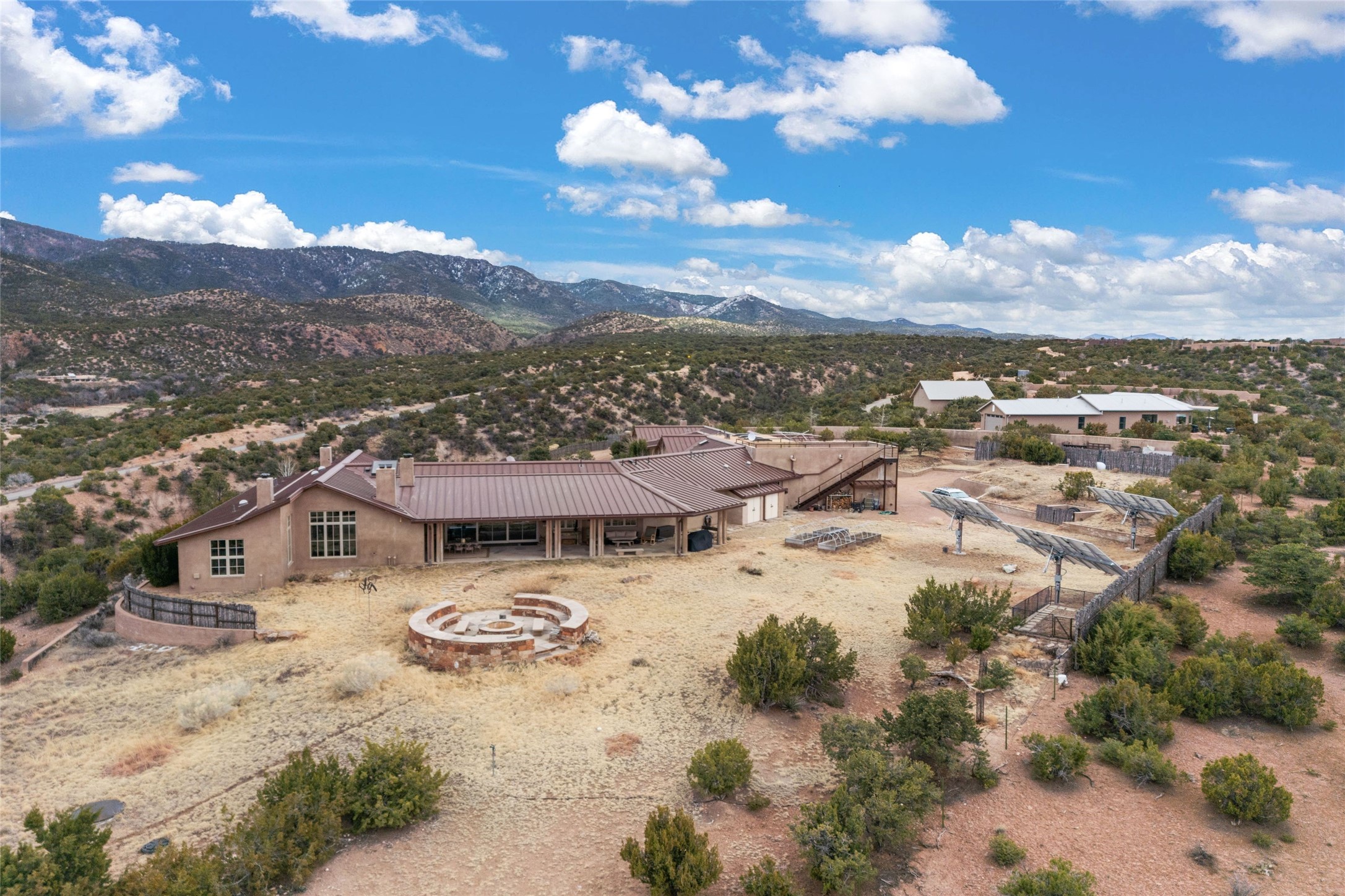 An extraordinary opportunity to embrace a luxurious, self-sustaining lifestyle in this Northern New Mexico farmhouse within the gated community of Tesuque Villas. This single-level home with guesthouse is designed for off-grid potential including: a solar photovoltaic electric system, and backup generator, rainwater harvesting, private well, 10,000-gallon underground water storage tank, and 3,000-gal propane storage. Designed as a healthy home with consulting architect Paula Baker-Laporte. Inside the main home, the kitchen is equipped with a built-in Subzero refrigerator and freezer, Wolf six-burner gas stove, and Bosch dishwasher. The attached butler's pantry provides Wolf appliances including double ovens, steam oven, Miele coffee cappuccino maker, second Bosch dishwasher, and a storage room. Black walnut and locally sourced flagstone floors throughout the home with radiant in-floor heat. The great room presents a central kitchen island with solid amazonite countertop. Adjacent office space provides a convenient area for work/study. The primary suite features an infrared sauna, steam shower, heated towel rack, expansive closet, laundry, and library. With inviting outdoor kiva-style fire pit and roof deck with 360-long-range views this home exemplifies the perfect blend of modern luxury and natural beauty. Sited within the Sangre de Cristo mountains with a spectacular view of the Jemez Mountain range, this private location is just a short drive from downtown Santa Fe and minutes from the Four Seasons Rancho Encantado Resort and Tesuque Village Market.
