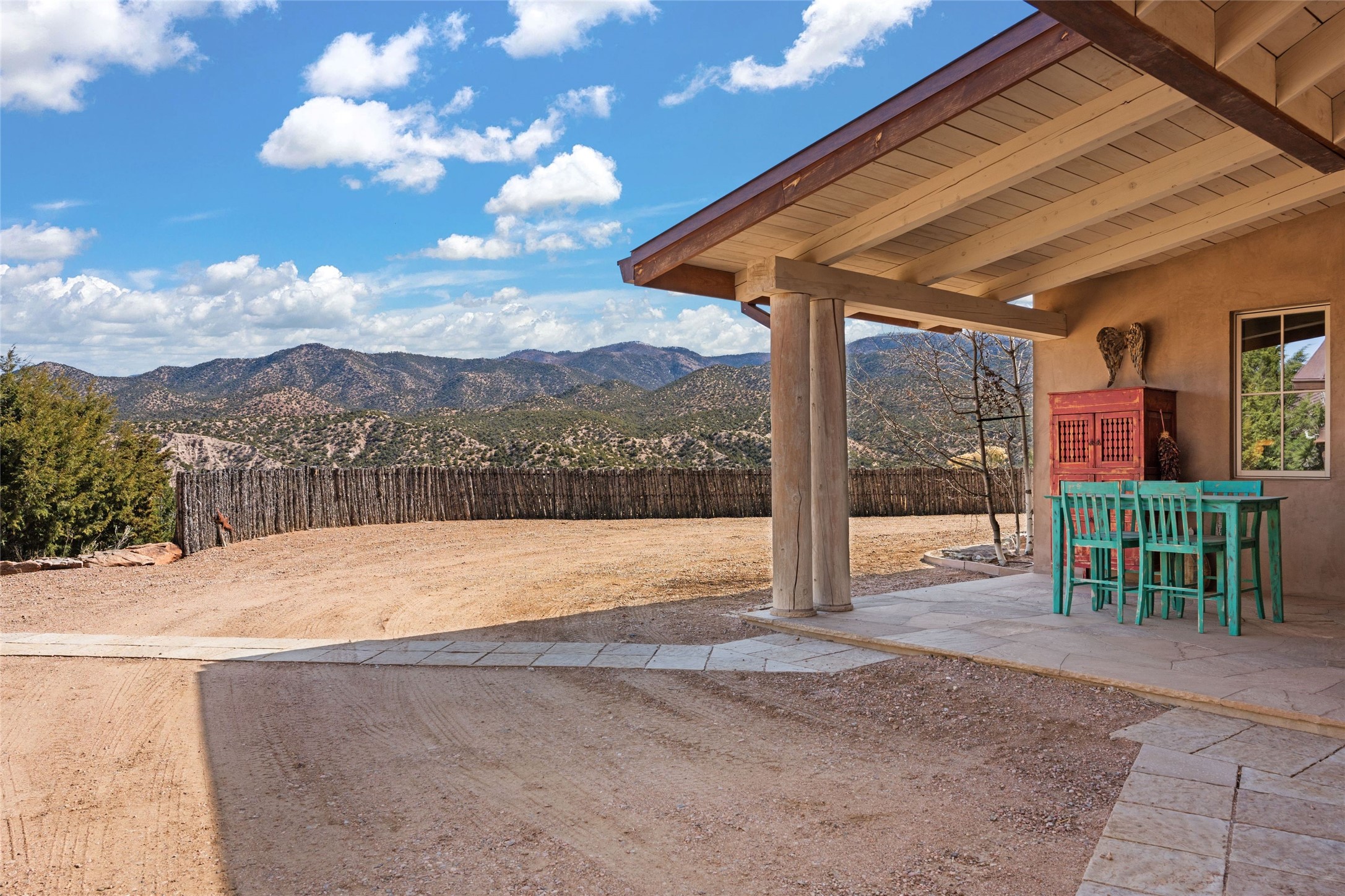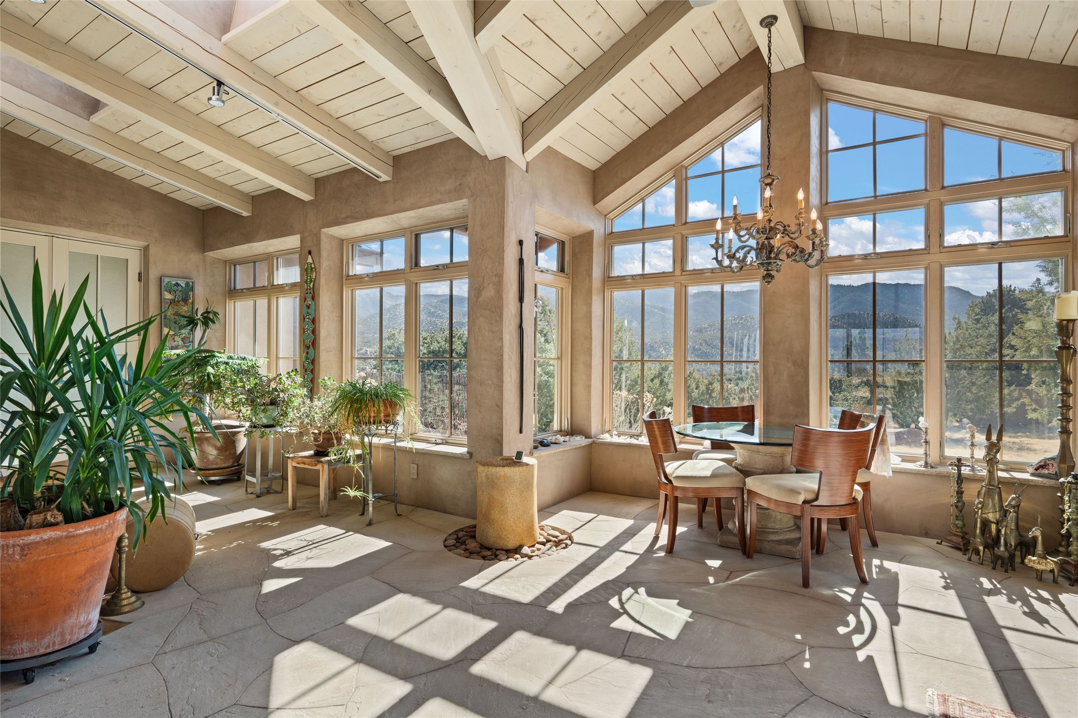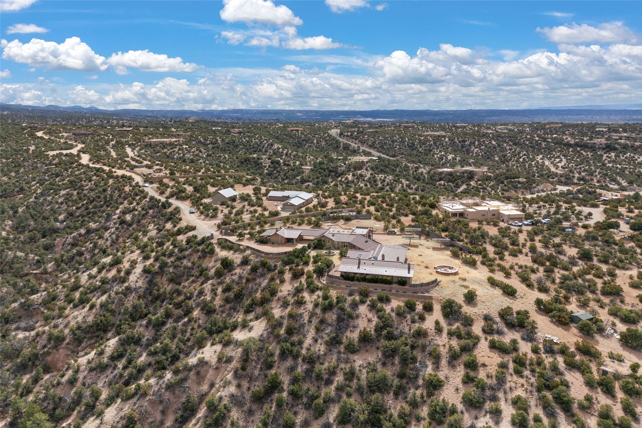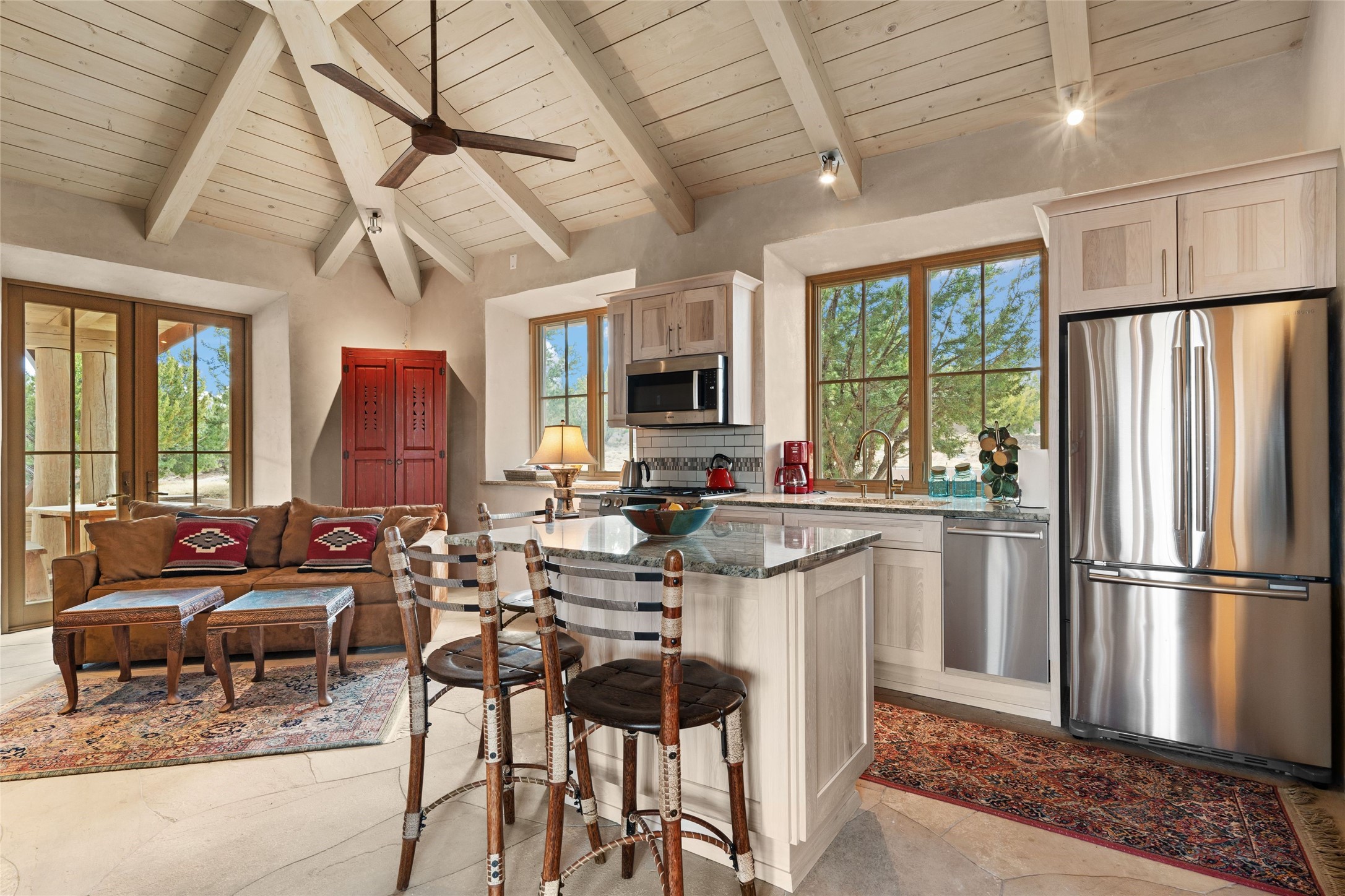 An extraordinary opportunity to embrace a luxurious, self-sustaining lifestyle in this Northern New Mexico farmhouse within the gated community of Tesuque Villas. This single-level home with guesthouse is designed for off-grid potential including: a solar photovoltaic electric system, and backup generator, rainwater harvesting, private well, 10,000-gallon underground water storage tank, and 3,000-gal propane storage. Designed as a healthy home with consulting architect Paula Baker-Laporte. Inside the main home, the kitchen is equipped with a built-in Subzero refrigerator and freezer, Wolf six-burner gas stove, and Bosch dishwasher. The attached butler's pantry provides Wolf appliances including double ovens, steam oven, Miele coffee cappuccino maker, second Bosch dishwasher, and a storage room. Black walnut and locally sourced flagstone floors throughout the home with radiant in-floor heat. The great room presents a central kitchen island with solid amazonite countertop. Adjacent office space provides a convenient area for work/study. The primary suite features an infrared sauna, steam shower, heated towel rack, expansive closet, laundry, and library. With inviting outdoor kiva-style fire pit and roof deck with 360-long-range views this home exemplifies the perfect blend of modern luxury and natural beauty. Sited within the Sangre de Cristo mountains with a spectacular view of the Jemez Mountain range, this private location is just a short drive from downtown Santa Fe and minutes from the Four Seasons Rancho Encantado Resort and Tesuque Village Market.
