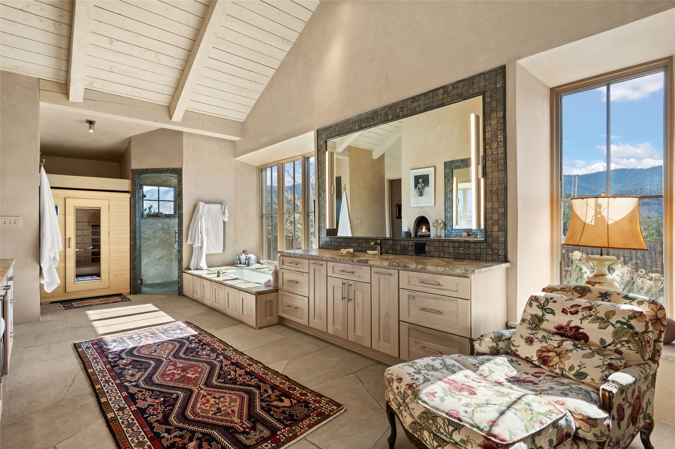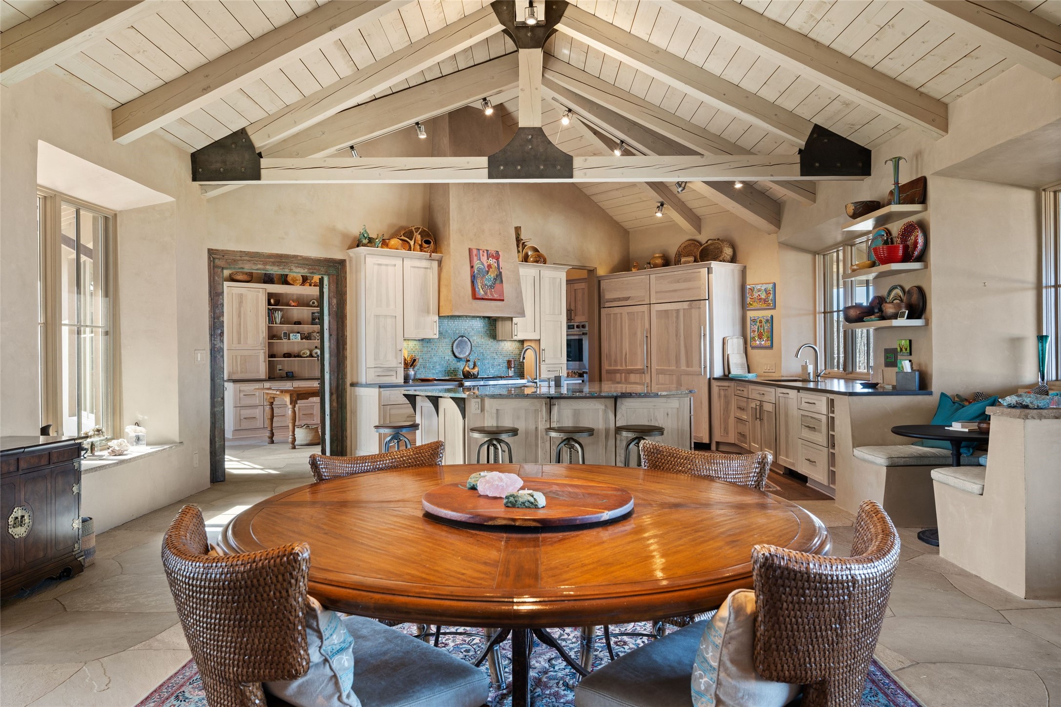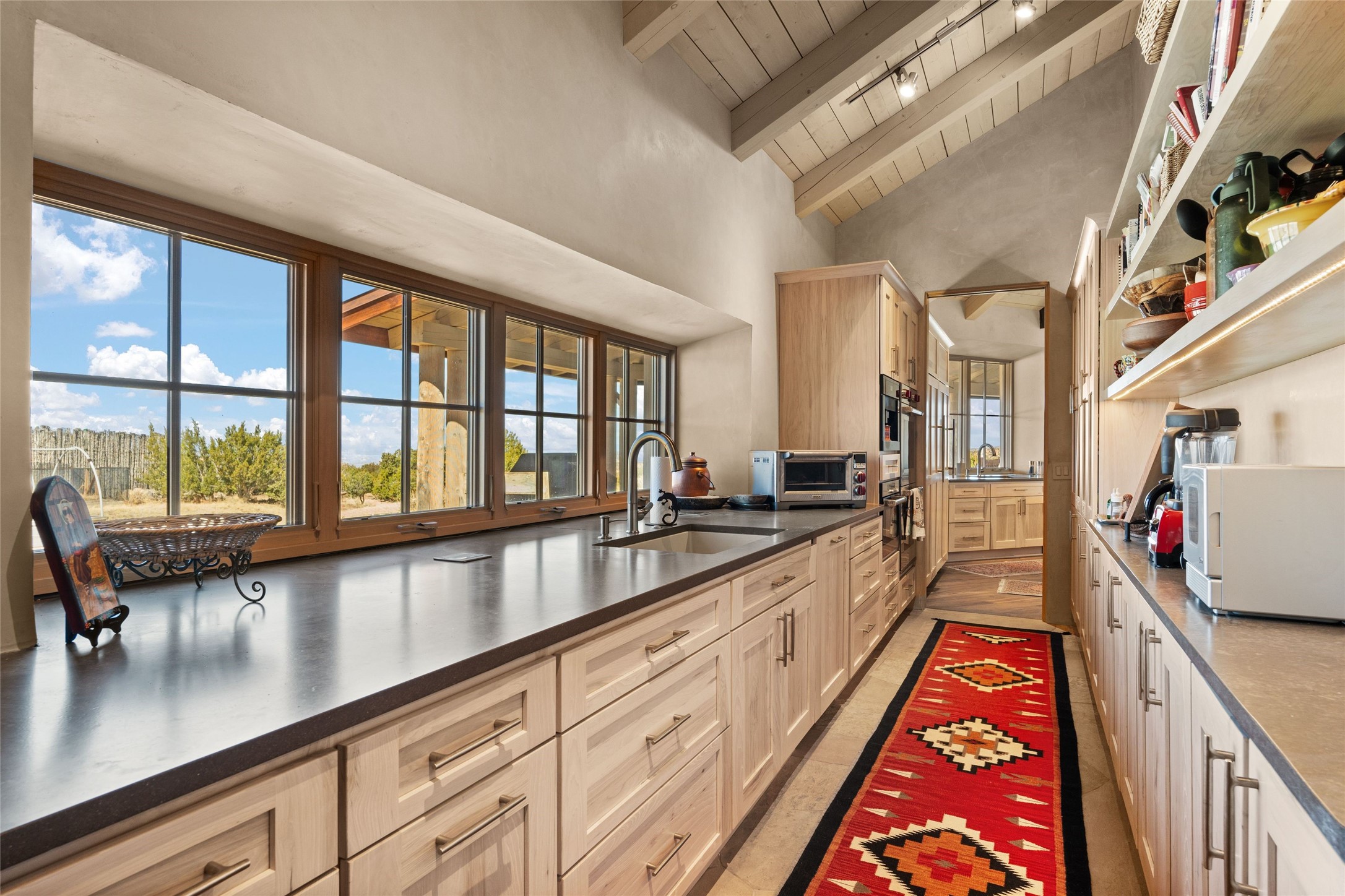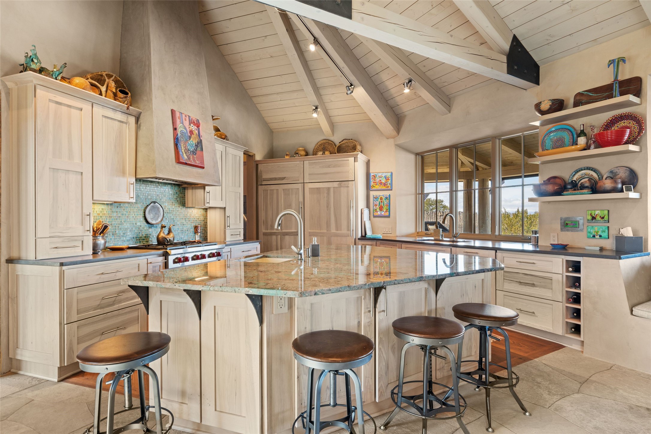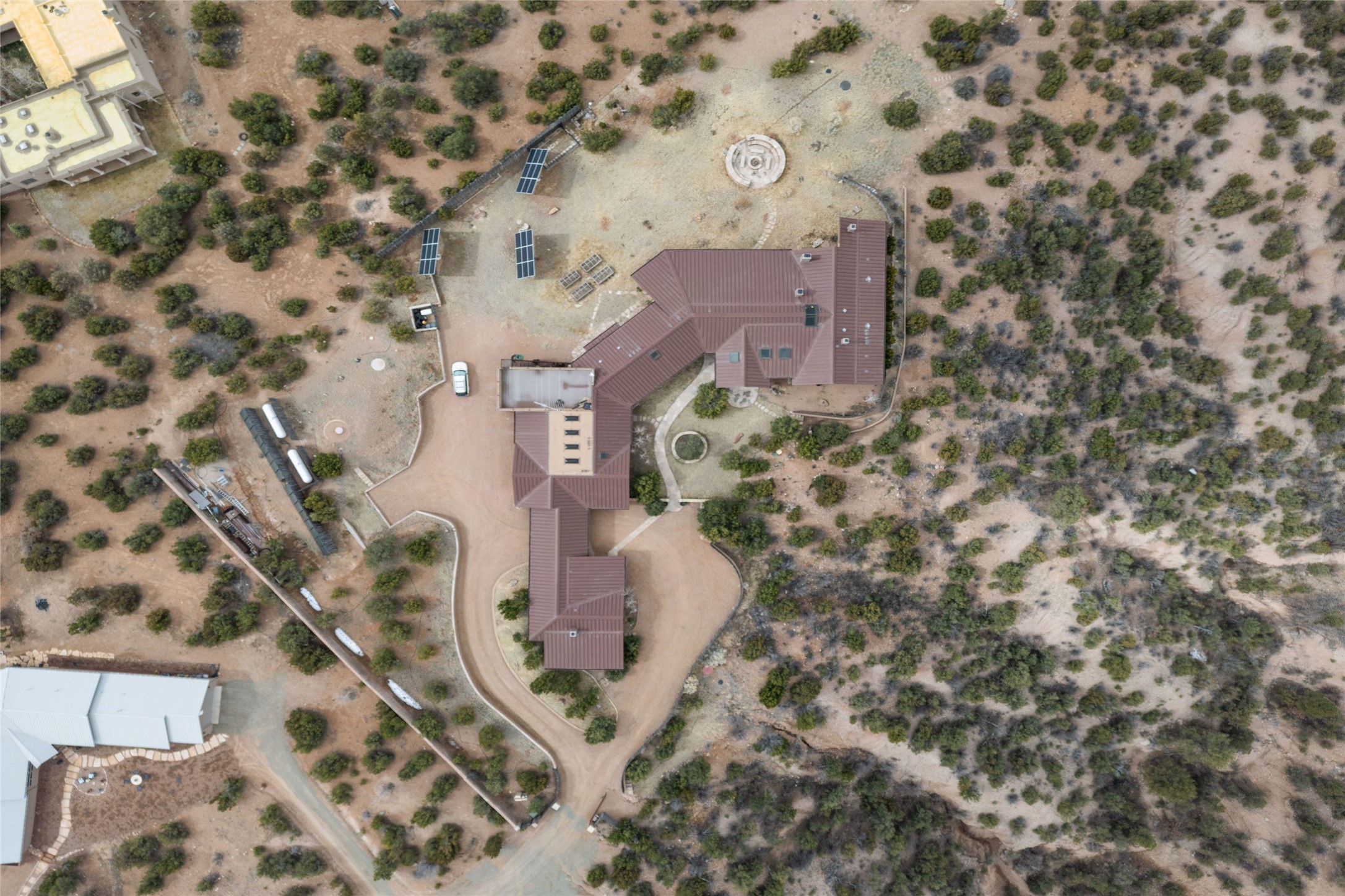 An extraordinary opportunity to embrace a luxurious, self-sustaining lifestyle in this Northern New Mexico farmhouse within the gated community of Tesuque Villas. This single-level home with guesthouse is designed for off-grid potential including: a solar photovoltaic electric system, and backup generator, rainwater harvesting, private well, 10,000-gallon underground water storage tank, and 3,000-gal propane storage. Designed as a healthy home with consulting architect Paula Baker-Laporte. Inside the main home, the kitchen is equipped with a built-in Subzero refrigerator and freezer, Wolf six-burner gas stove, and Bosch dishwasher. The attached butler's pantry provides Wolf appliances including double ovens, steam oven, Miele coffee cappuccino maker, second Bosch dishwasher, and a storage room. Black walnut and locally sourced flagstone floors throughout the home with radiant in-floor heat. The great room presents a central kitchen island with solid amazonite countertop. Adjacent office space provides a convenient area for work/study. The primary suite features an infrared sauna, steam shower, heated towel rack, expansive closet, laundry, and library. With inviting outdoor kiva-style fire pit and roof deck with 360-long-range views this home exemplifies the perfect blend of modern luxury and natural beauty. Sited within the Sangre de Cristo mountains with a spectacular view of the Jemez Mountain range, this private location is just a short drive from downtown Santa Fe and minutes from the Four Seasons Rancho Encantado Resort and Tesuque Village Market.