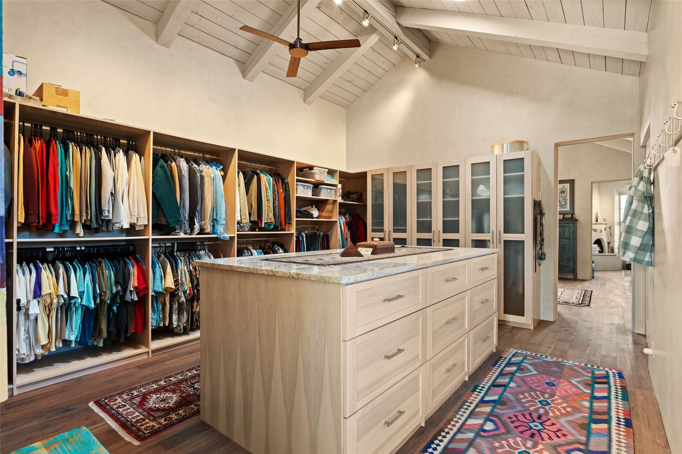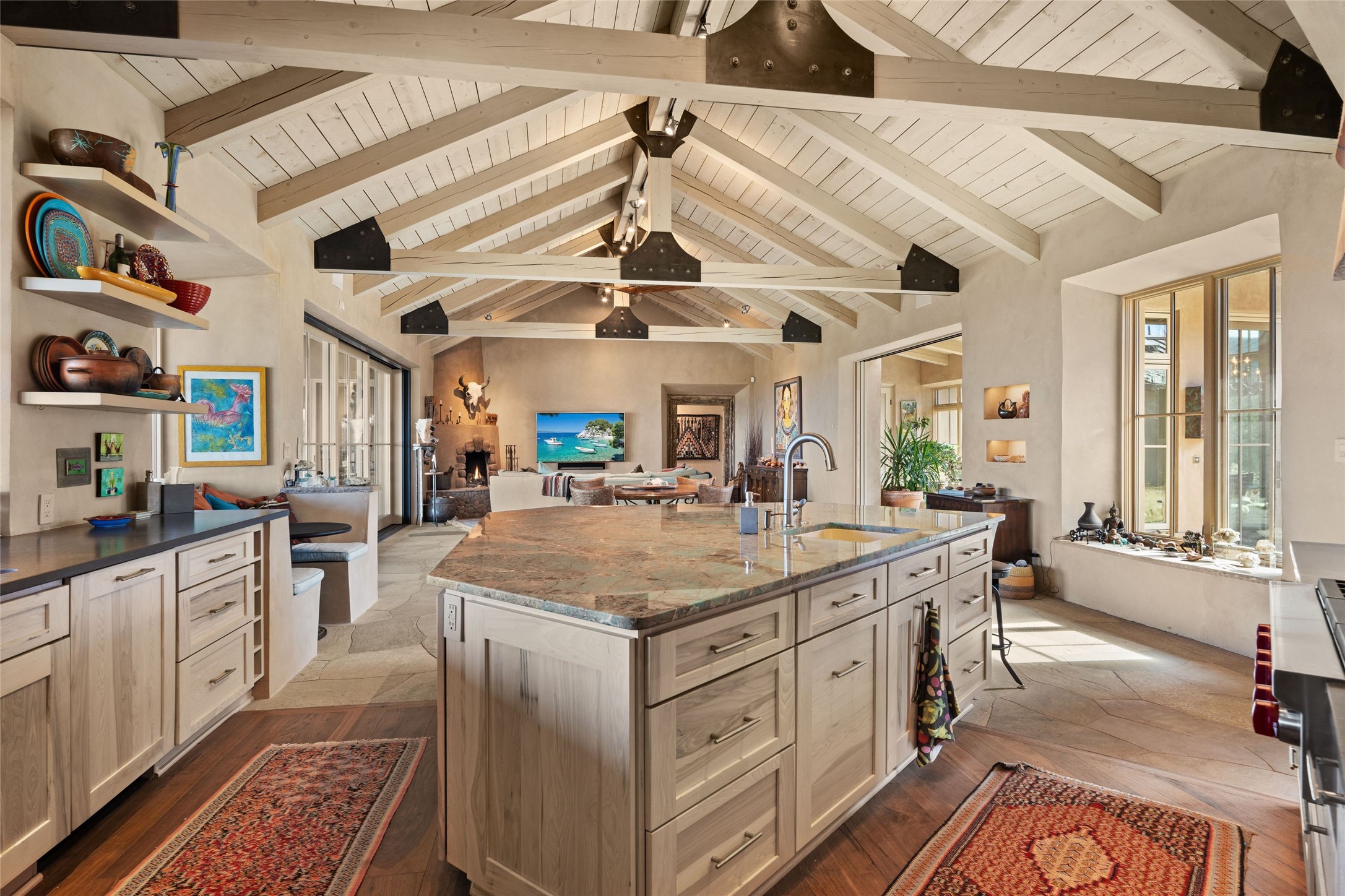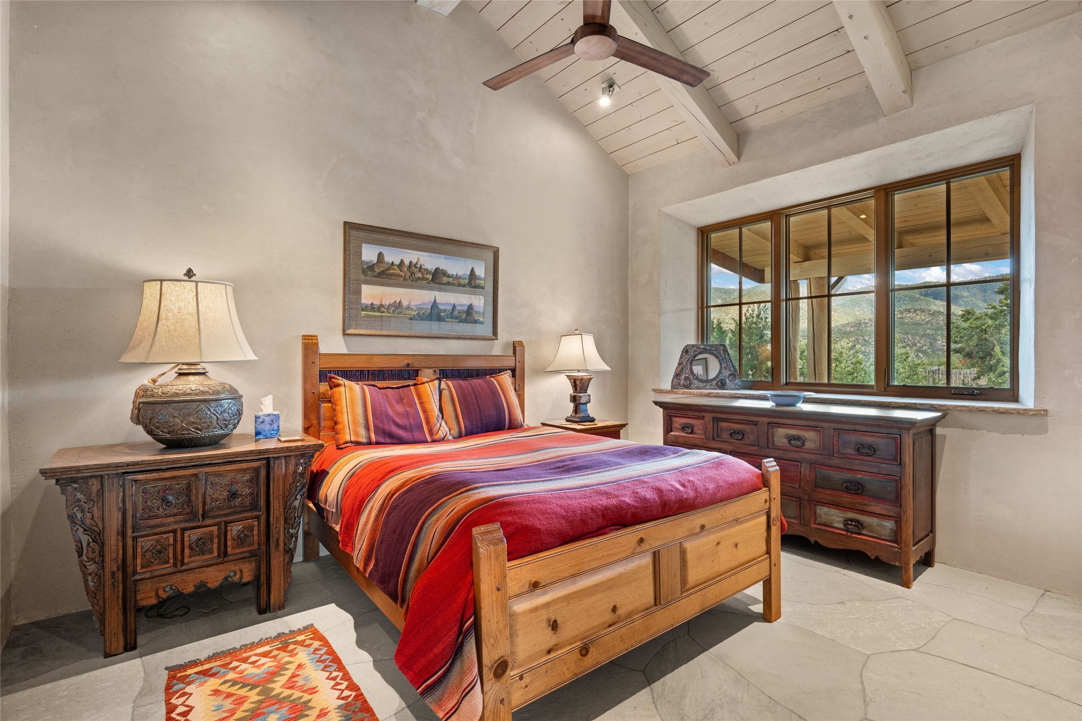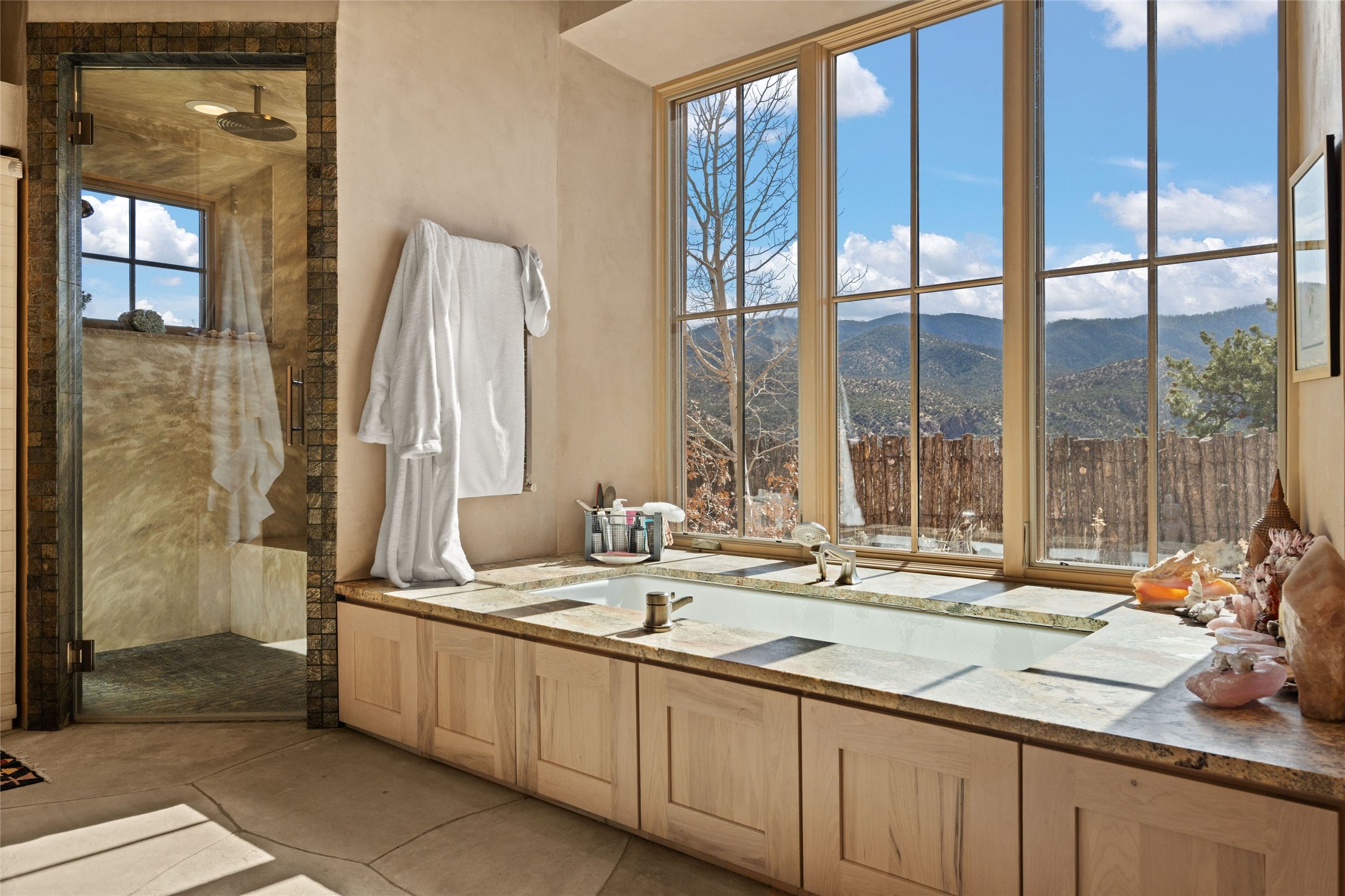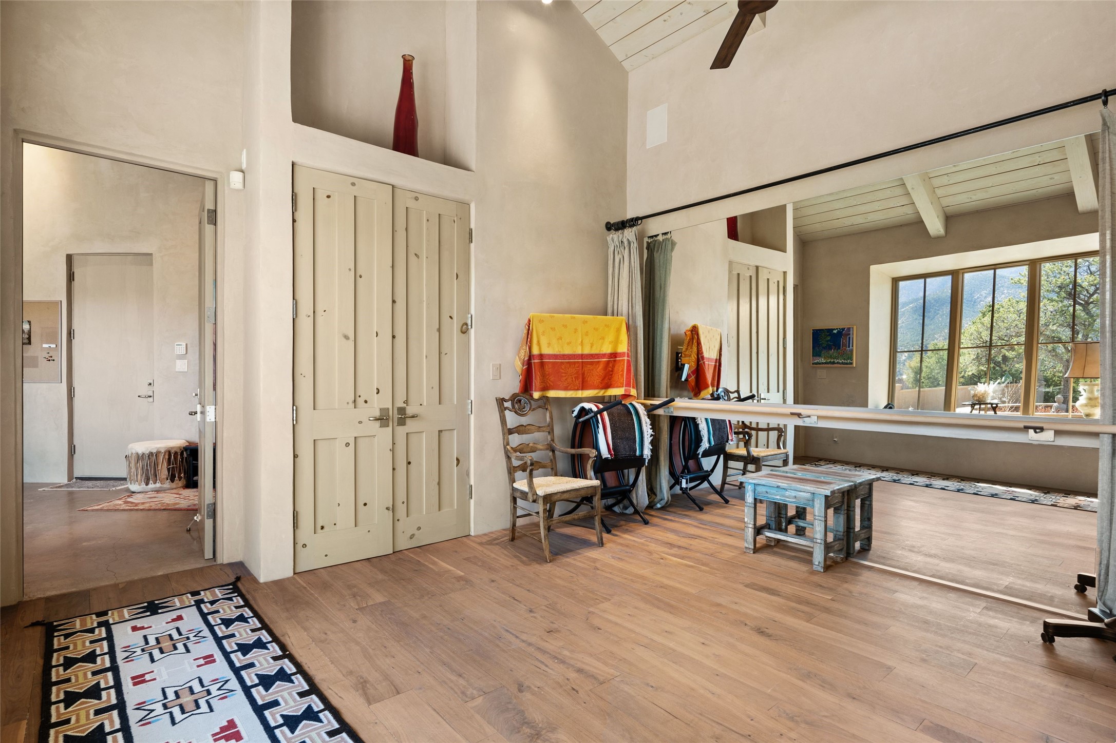 An extraordinary opportunity to embrace a luxurious, self-sustaining lifestyle in this Northern New Mexico farmhouse within the gated community of Tesuque Villas. This single-level home with guesthouse is designed for off-grid potential including: a solar photovoltaic electric system, and backup generator, rainwater harvesting, private well, 10,000-gallon underground water storage tank, and 3,000-gal propane storage. Designed as a healthy home with consulting architect Paula Baker-Laporte. Inside the main home, the kitchen is equipped with a built-in Subzero refrigerator and freezer, Wolf six-burner gas stove, and Bosch dishwasher. The attached butler's pantry provides Wolf appliances including double ovens, steam oven, Miele coffee cappuccino maker, second Bosch dishwasher, and a storage room. Black walnut and locally sourced flagstone floors throughout the home with radiant in-floor heat. The great room presents a central kitchen island with solid amazonite countertop. Adjacent office space provides a convenient area for work/study. The primary suite features an infrared sauna, steam shower, heated towel rack, expansive closet, laundry, and library. With inviting outdoor kiva-style fire pit and roof deck with 360-long-range views this home exemplifies the perfect blend of modern luxury and natural beauty. Sited within the Sangre de Cristo mountains with a spectacular view of the Jemez Mountain range, this private location is just a short drive from downtown Santa Fe and minutes from the Four Seasons Rancho Encantado Resort and Tesuque Village Market.