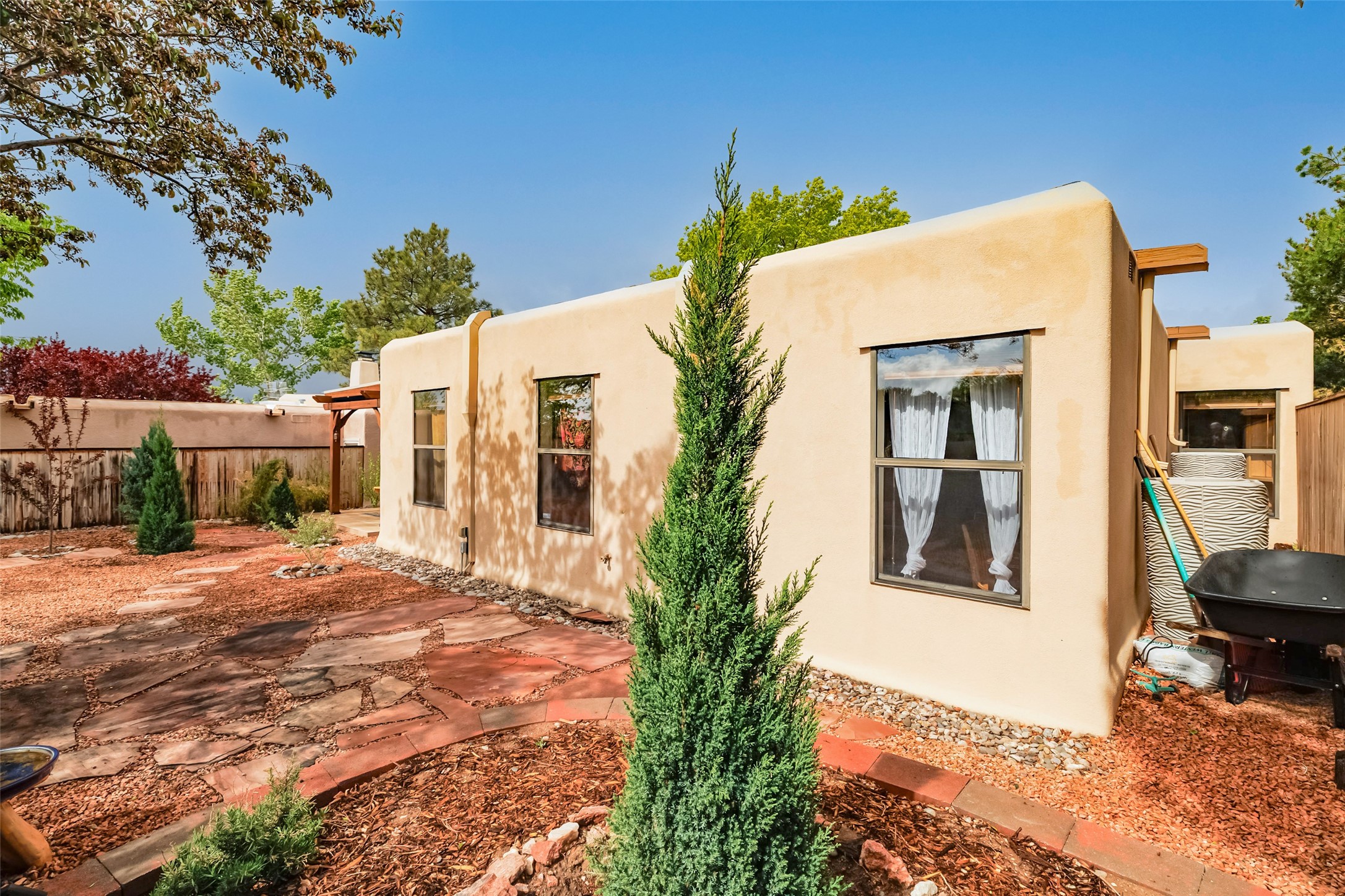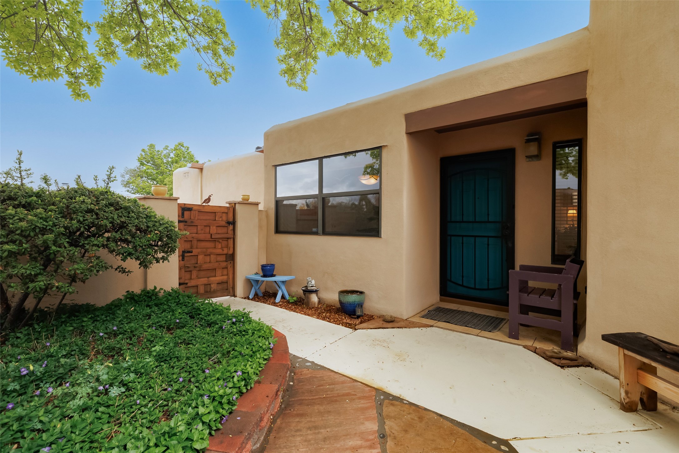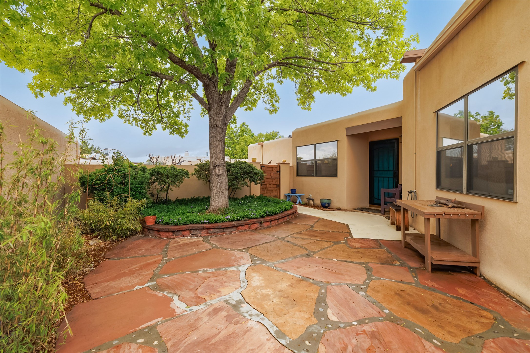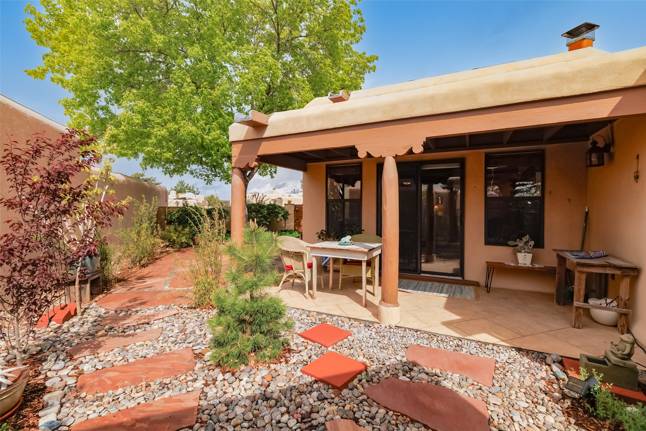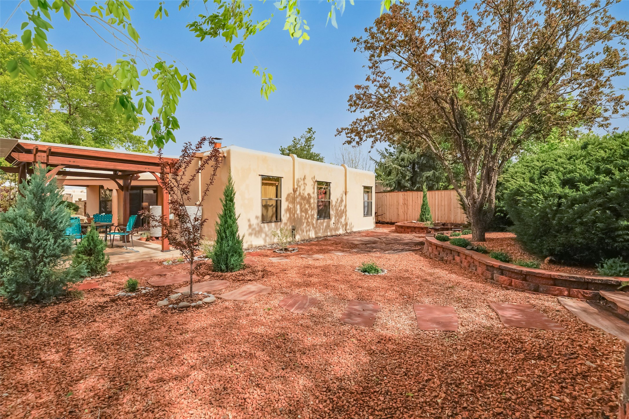 Welcome to this beautifully updated and meticulously maintained Park Plazas home, offering flexible living with 3 bedrooms or 2 bedrooms plus a dedicated office. The main living areas feature elegant tile flooring, while the bedrooms are graced with luxurious wood-look vinyl for a warm, inviting feel.Step into the spacious living room where high, beamed ceilings and a dramatic Kiva fireplace create a striking focal point. Sliding doors lead you to a generous covered portal and a flagstone patio--perfect for year-round indoor-outdoor living.The fully landscaped yard is a true oasis, showcasing an ornamental plum tree, vibrant Rose of Sharon, stately Blue Point Juniper, and a variety of flowering and evergreen plants. Multiple sitting areas and a charming pergola provide ideal spaces for entertaining or relaxing al fresco.Inside, the remodeled kitchen features newer cabinetry, sleek appliances, and stylish countertops, seamlessly combining functionality with modern aesthetics. Enjoy comfort throughout the seasons with efficient hot water baseboard heating and four mini-split units for zoned cooling.A two-car garage with direct access into the kitchen adds everyday convenience to this already stellar home.Don't miss your chance to own this standout Park Plazas property that blends classic Santa Fe style with thoughtful upgrades and lush outdoor living.
