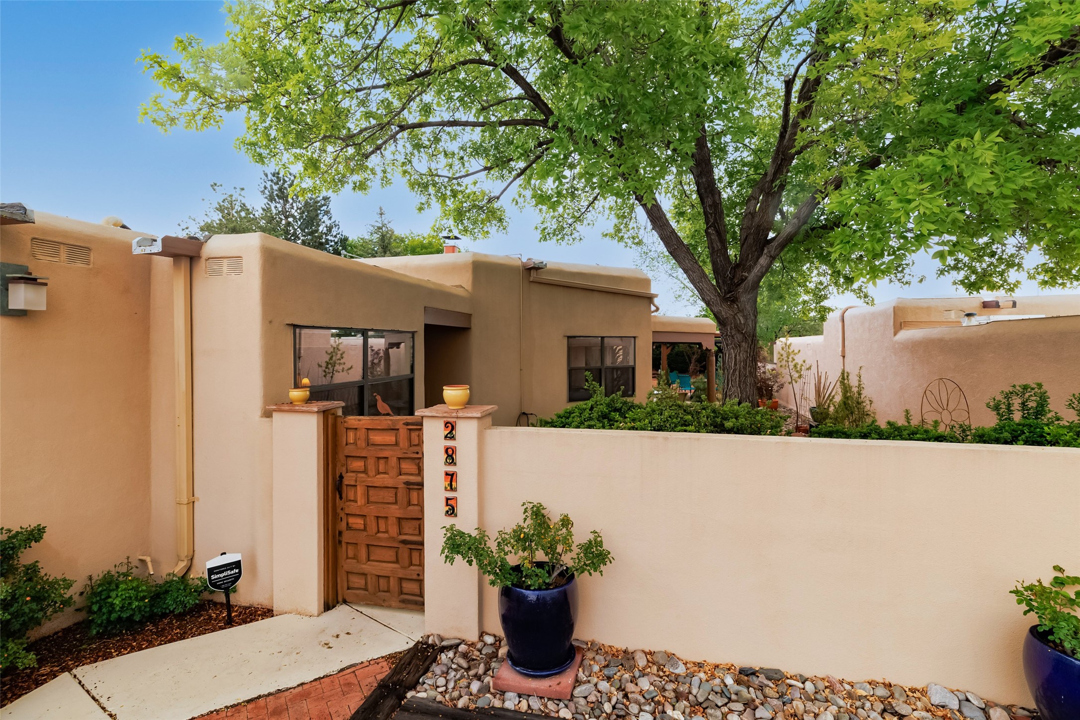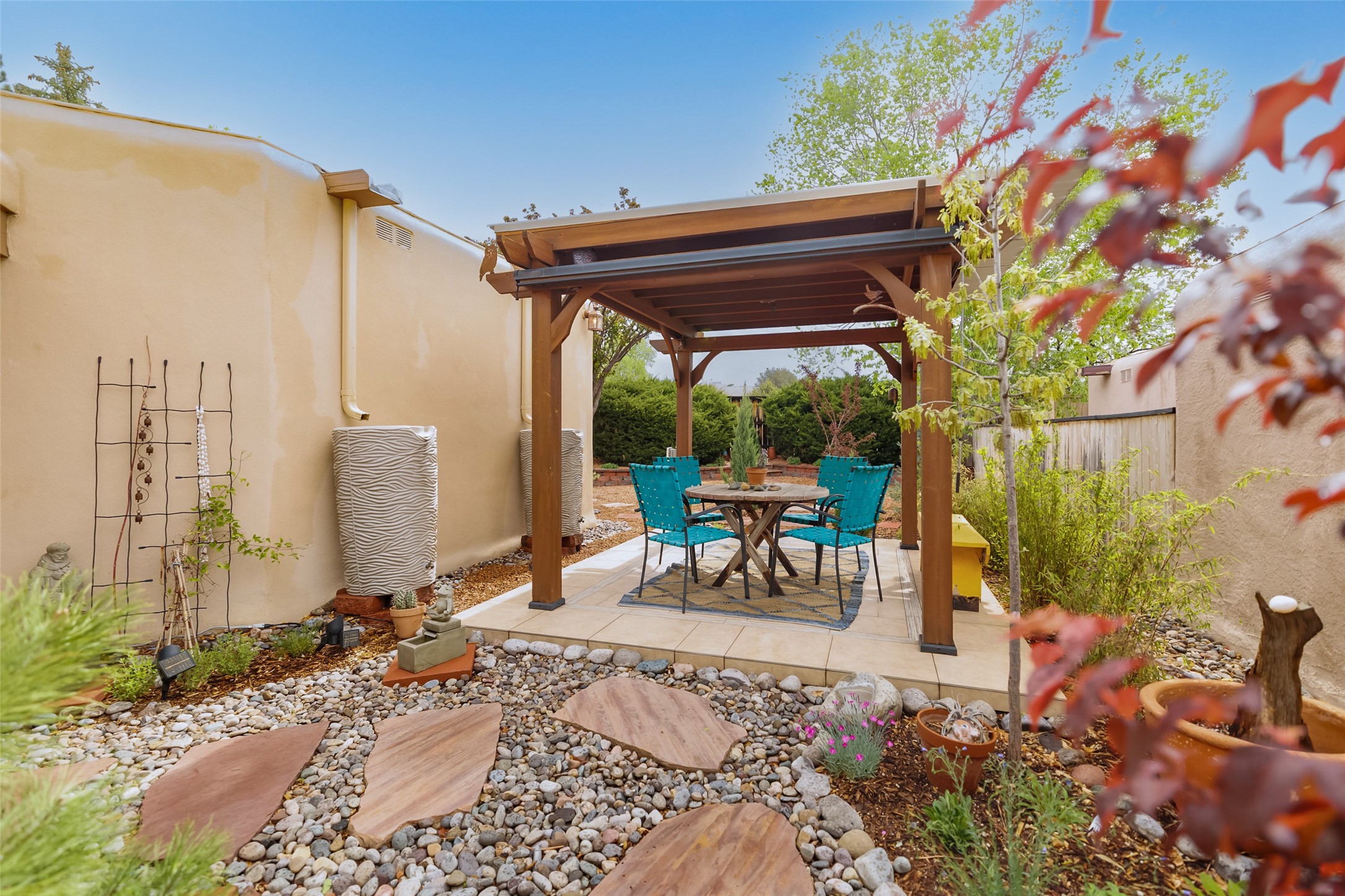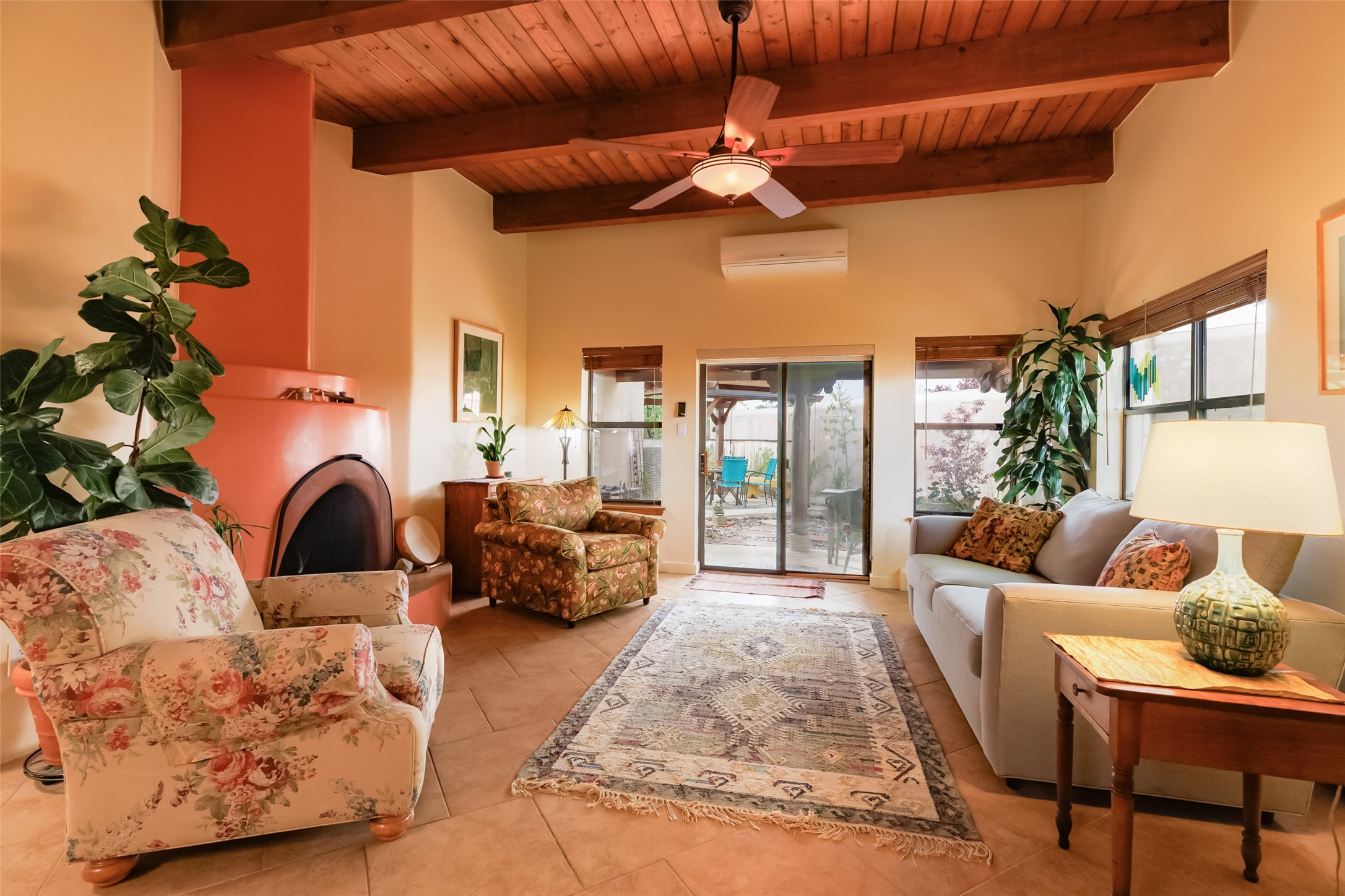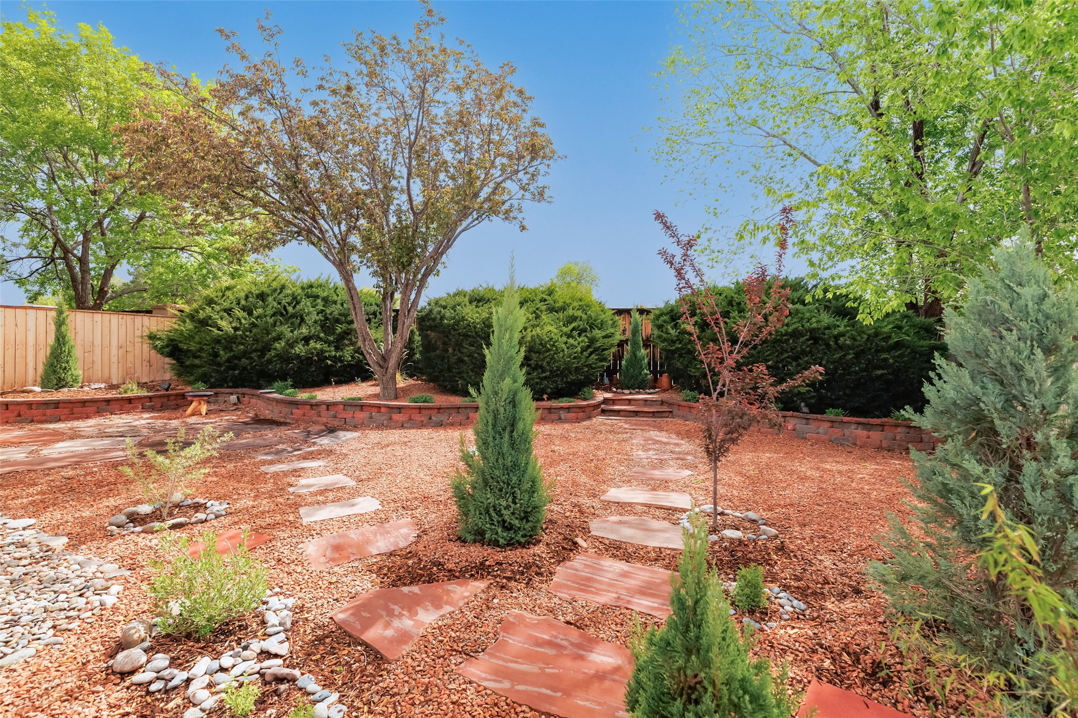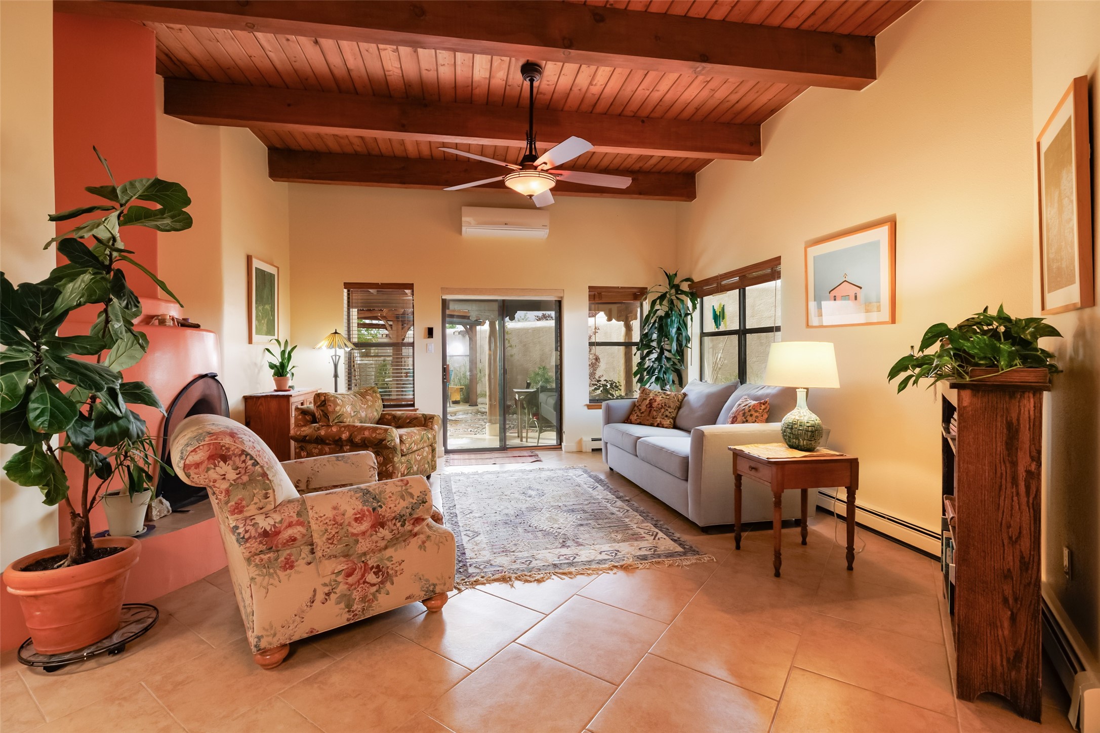 Welcome to this beautifully updated and meticulously maintained Park Plazas home, offering flexible living with 3 bedrooms or 2 bedrooms plus a dedicated office. The main living areas feature elegant tile flooring, while the bedrooms are graced with luxurious wood-look vinyl for a warm, inviting feel.Step into the spacious living room where high, beamed ceilings and a dramatic Kiva fireplace create a striking focal point. Sliding doors lead you to a generous covered portal and a flagstone patio--perfect for year-round indoor-outdoor living.The fully landscaped yard is a true oasis, showcasing an ornamental plum tree, vibrant Rose of Sharon, stately Blue Point Juniper, and a variety of flowering and evergreen plants. Multiple sitting areas and a charming pergola provide ideal spaces for entertaining or relaxing al fresco.Inside, the remodeled kitchen features newer cabinetry, sleek appliances, and stylish countertops, seamlessly combining functionality with modern aesthetics. Enjoy comfort throughout the seasons with efficient hot water baseboard heating and four mini-split units for zoned cooling.A two-car garage with direct access into the kitchen adds everyday convenience to this already stellar home.Don't miss your chance to own this standout Park Plazas property that blends classic Santa Fe style with thoughtful upgrades and lush outdoor living.