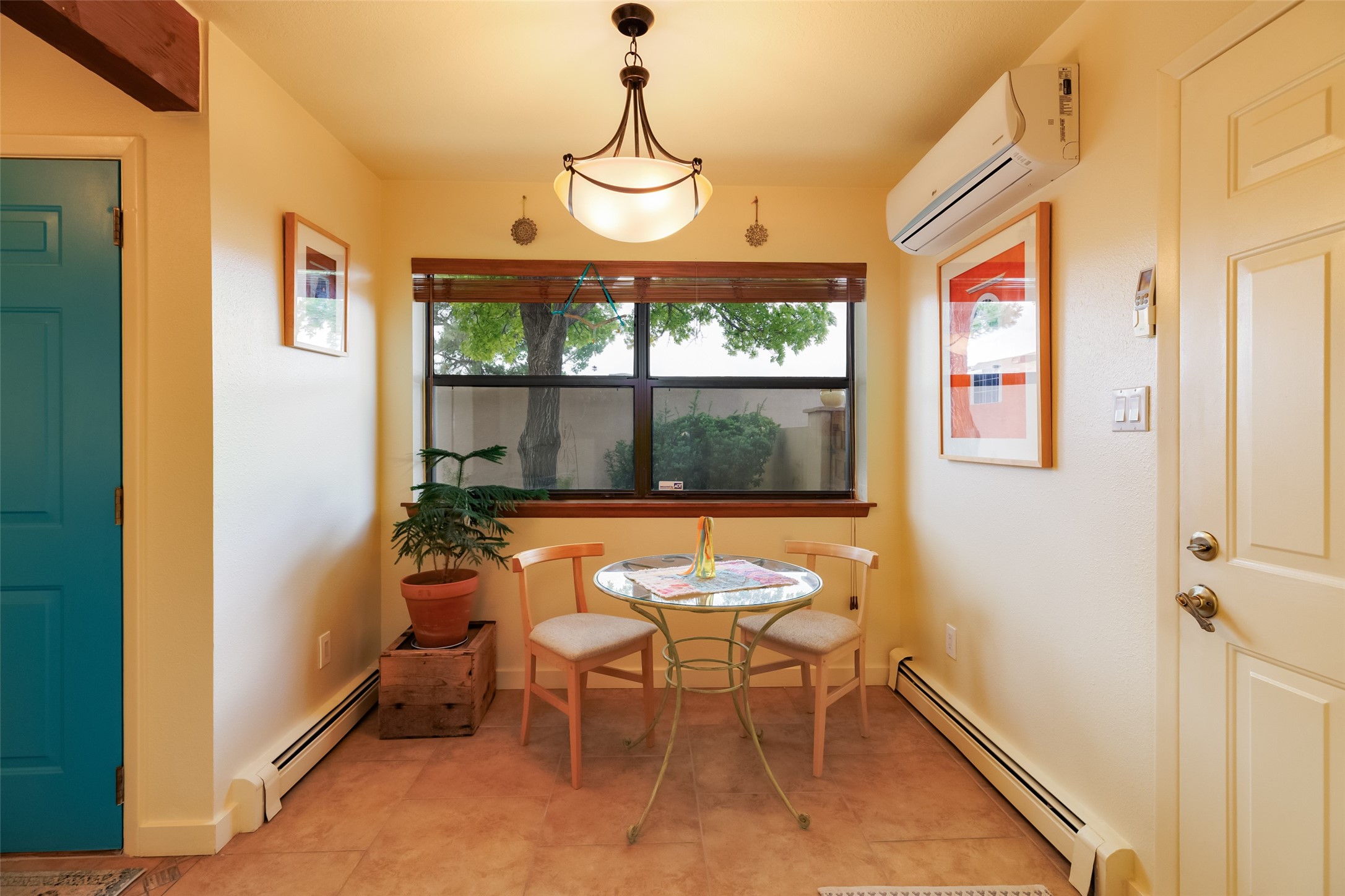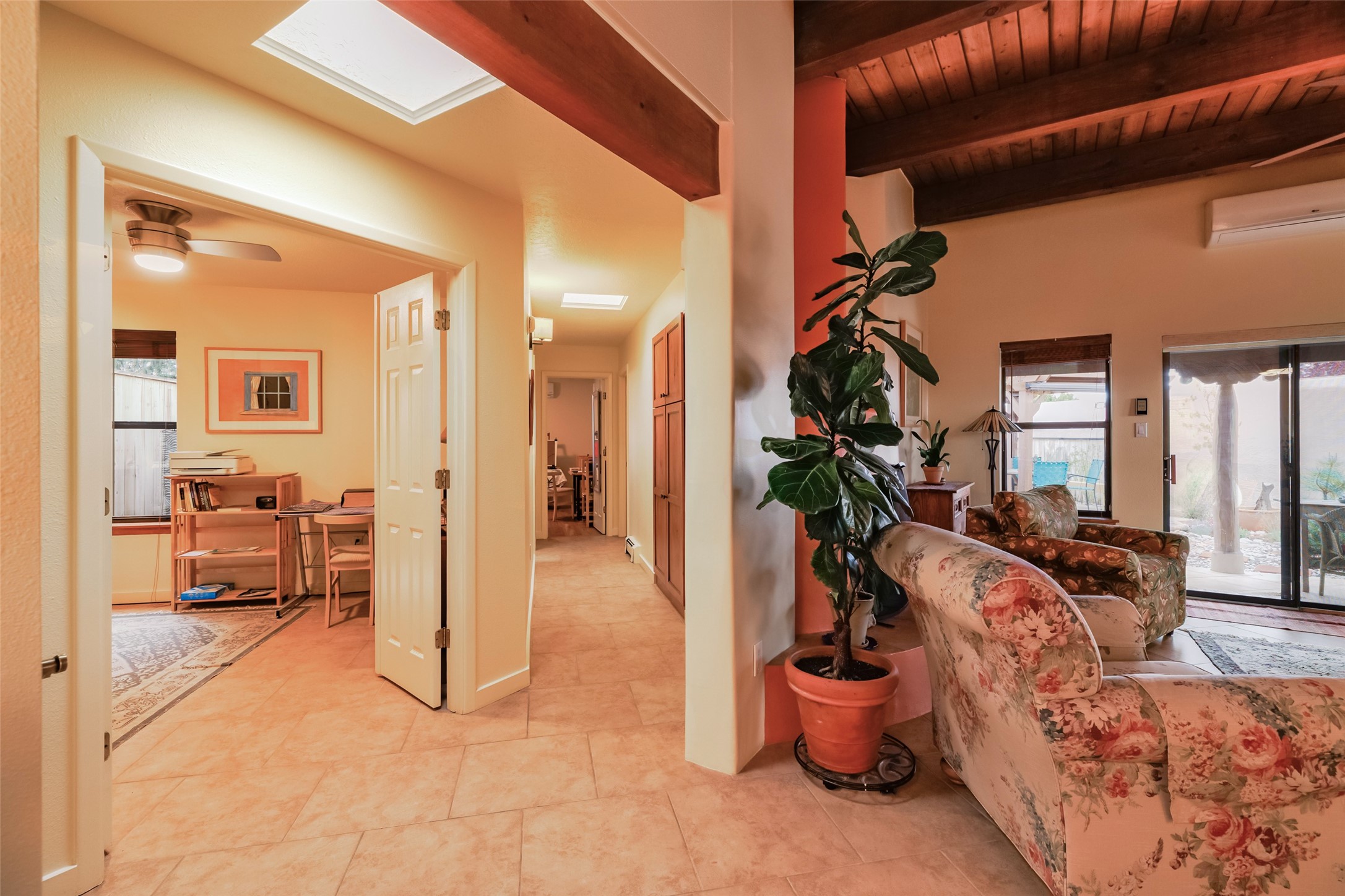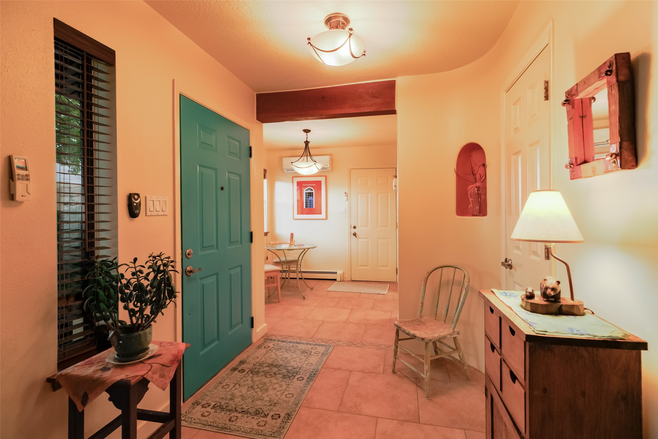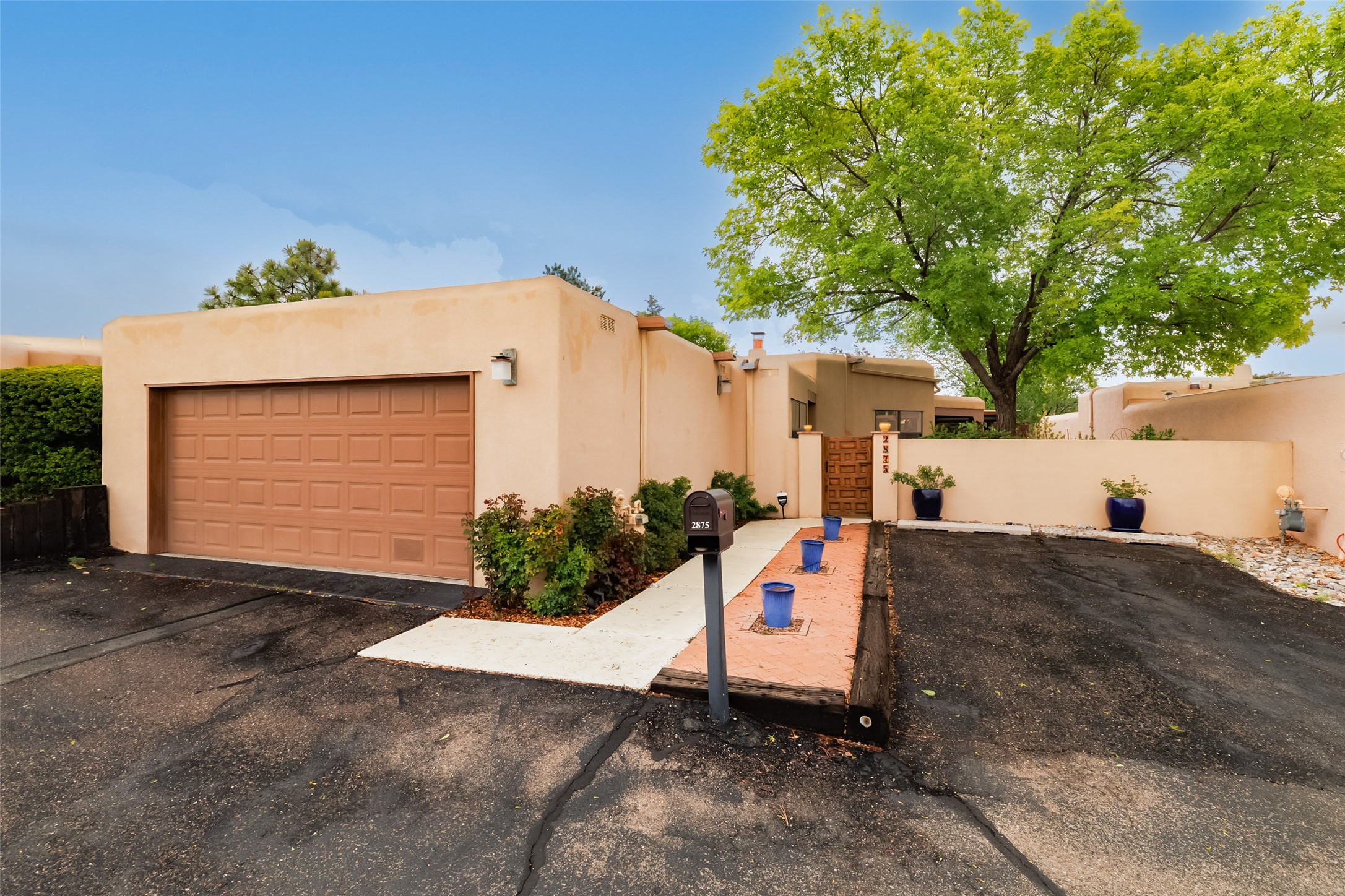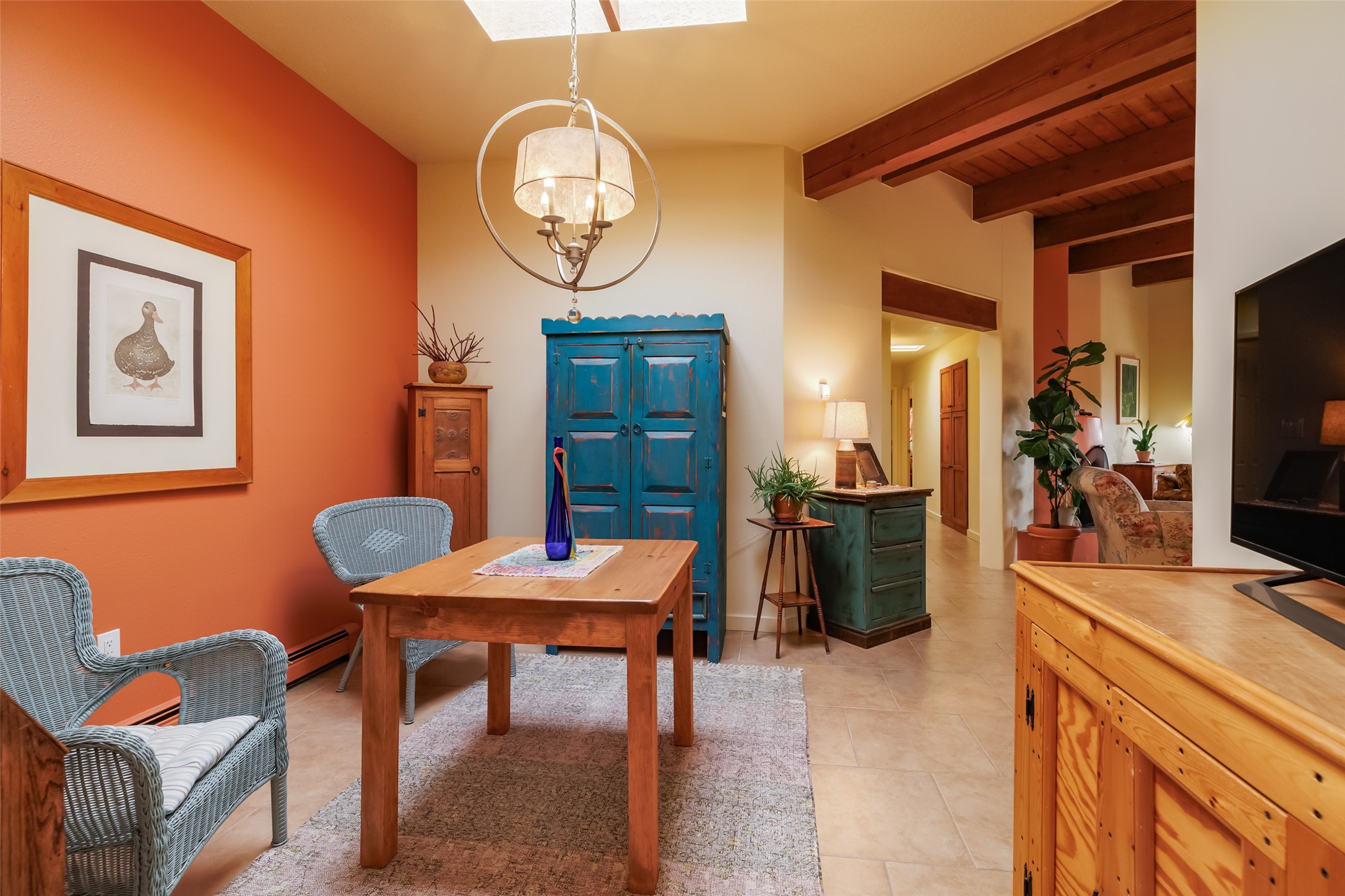 Welcome to this beautifully updated and meticulously maintained Park Plazas home, offering flexible living with 3 bedrooms or 2 bedrooms plus a dedicated office. The main living areas feature elegant tile flooring, while the bedrooms are graced with luxurious wood-look vinyl for a warm, inviting feel.Step into the spacious living room where high, beamed ceilings and a dramatic Kiva fireplace create a striking focal point. Sliding doors lead you to a generous covered portal and a flagstone patio--perfect for year-round indoor-outdoor living.The fully landscaped yard is a true oasis, showcasing an ornamental plum tree, vibrant Rose of Sharon, stately Blue Point Juniper, and a variety of flowering and evergreen plants. Multiple sitting areas and a charming pergola provide ideal spaces for entertaining or relaxing al fresco.Inside, the remodeled kitchen features newer cabinetry, sleek appliances, and stylish countertops, seamlessly combining functionality with modern aesthetics. Enjoy comfort throughout the seasons with efficient hot water baseboard heating and four mini-split units for zoned cooling.A two-car garage with direct access into the kitchen adds everyday convenience to this already stellar home.Don't miss your chance to own this standout Park Plazas property that blends classic Santa Fe style with thoughtful upgrades and lush outdoor living.