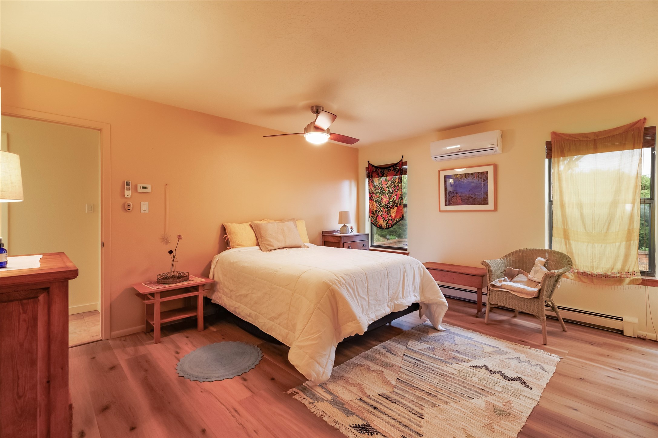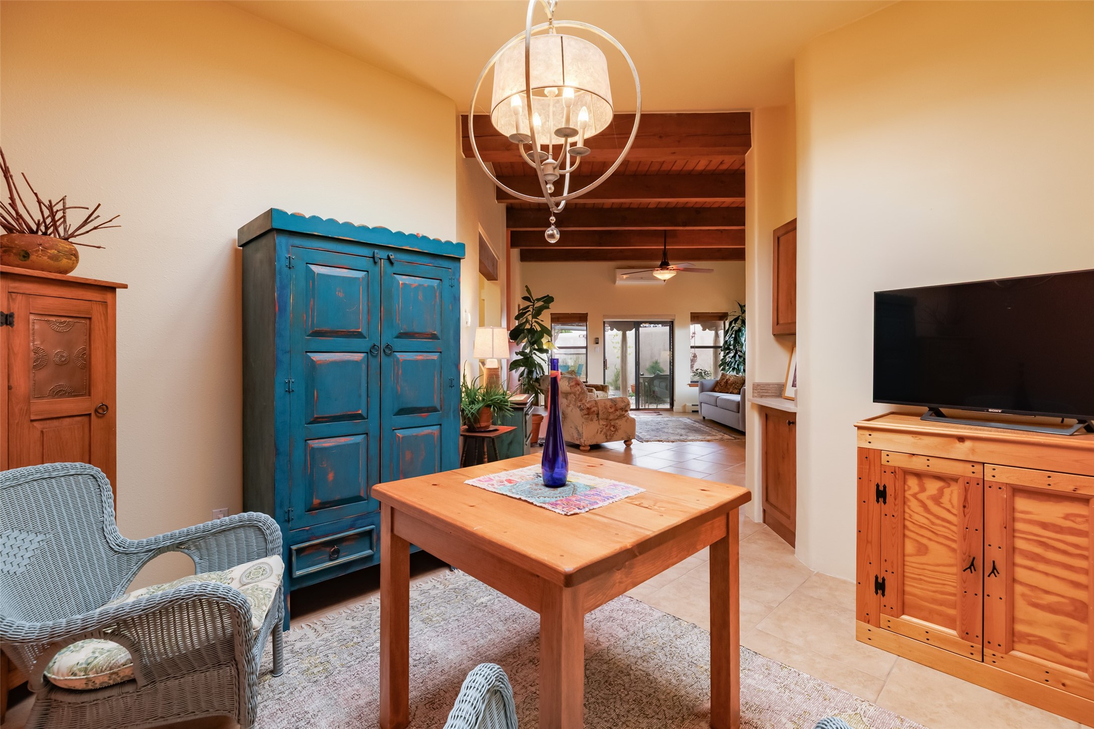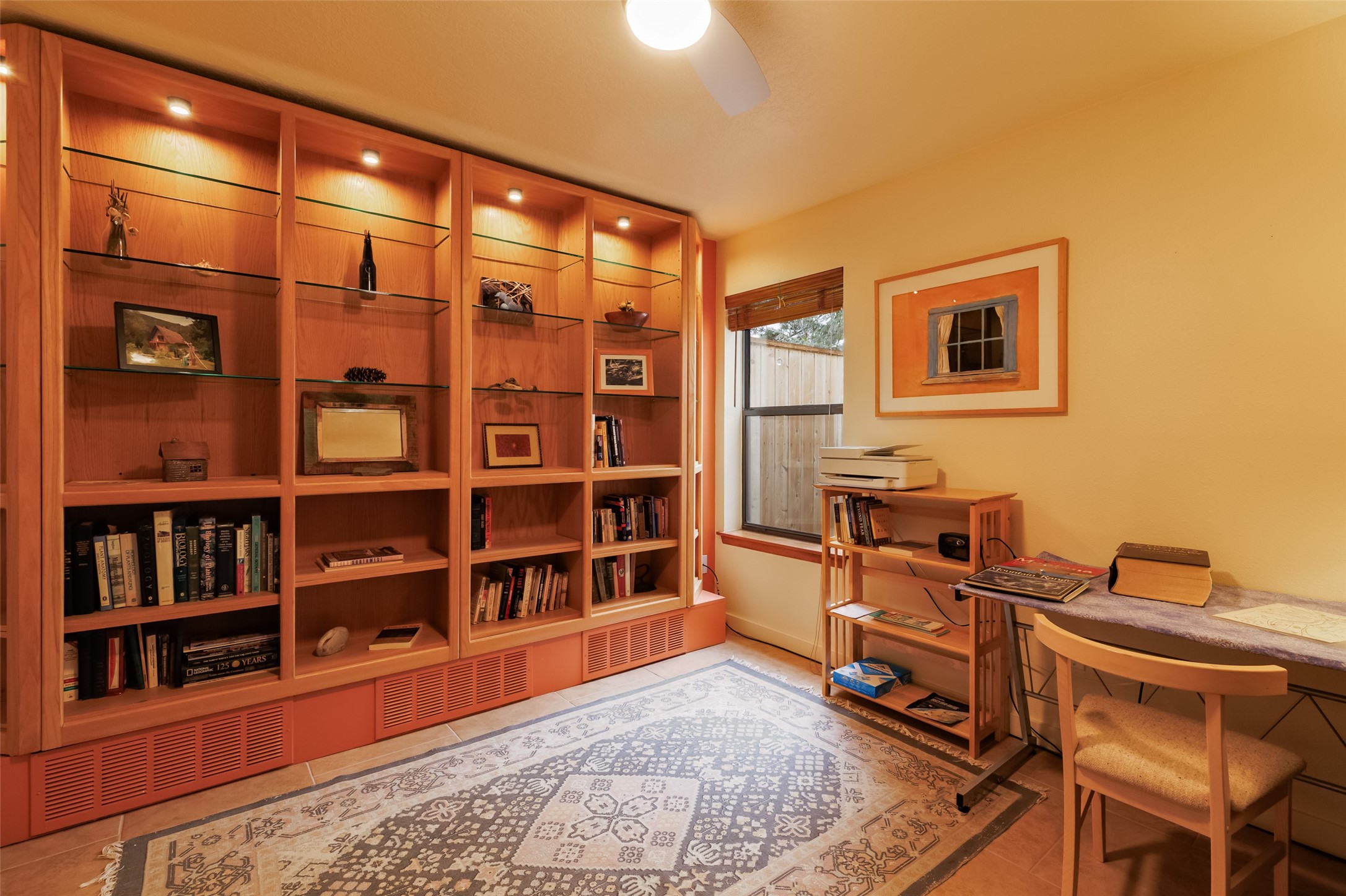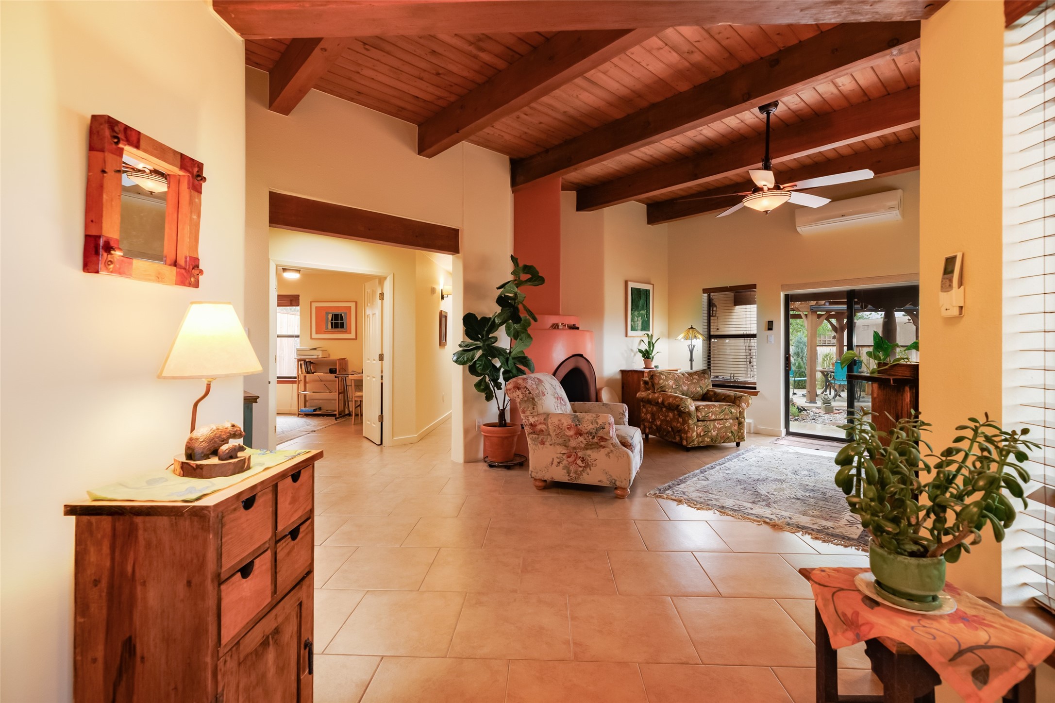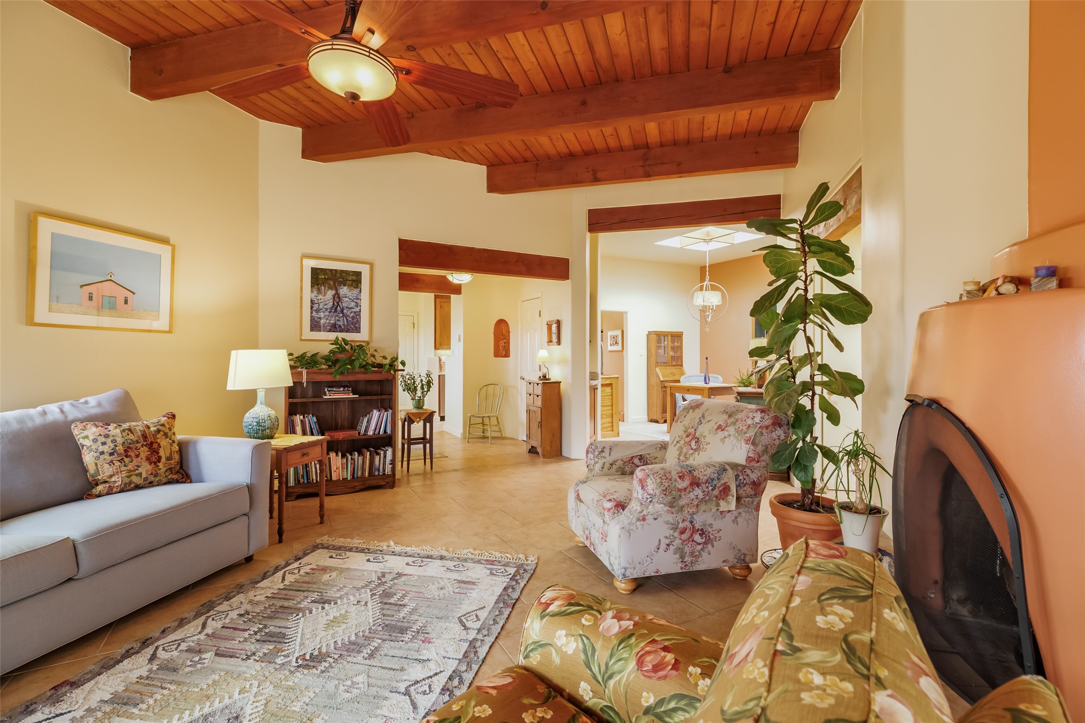 Welcome to this beautifully updated and meticulously maintained Park Plazas home, offering flexible living with 3 bedrooms or 2 bedrooms plus a dedicated office. The main living areas feature elegant tile flooring, while the bedrooms are graced with luxurious wood-look vinyl for a warm, inviting feel.Step into the spacious living room where high, beamed ceilings and a dramatic Kiva fireplace create a striking focal point. Sliding doors lead you to a generous covered portal and a flagstone patio--perfect for year-round indoor-outdoor living.The fully landscaped yard is a true oasis, showcasing an ornamental plum tree, vibrant Rose of Sharon, stately Blue Point Juniper, and a variety of flowering and evergreen plants. Multiple sitting areas and a charming pergola provide ideal spaces for entertaining or relaxing al fresco.Inside, the remodeled kitchen features newer cabinetry, sleek appliances, and stylish countertops, seamlessly combining functionality with modern aesthetics. Enjoy comfort throughout the seasons with efficient hot water baseboard heating and four mini-split units for zoned cooling.A two-car garage with direct access into the kitchen adds everyday convenience to this already stellar home.Don't miss your chance to own this standout Park Plazas property that blends classic Santa Fe style with thoughtful upgrades and lush outdoor living.