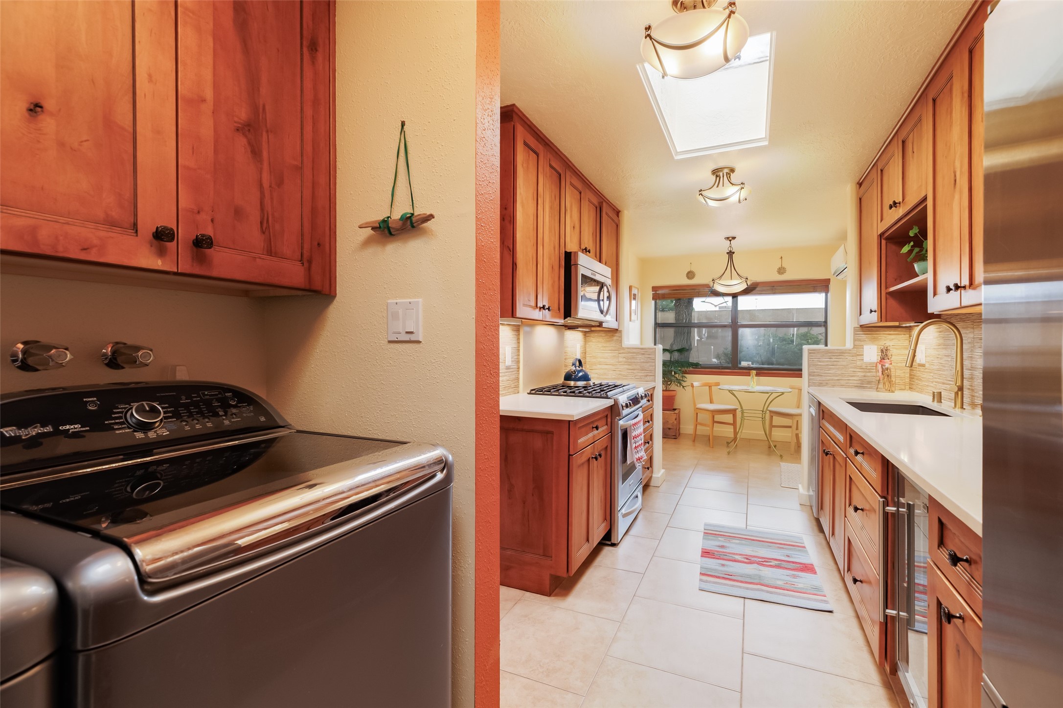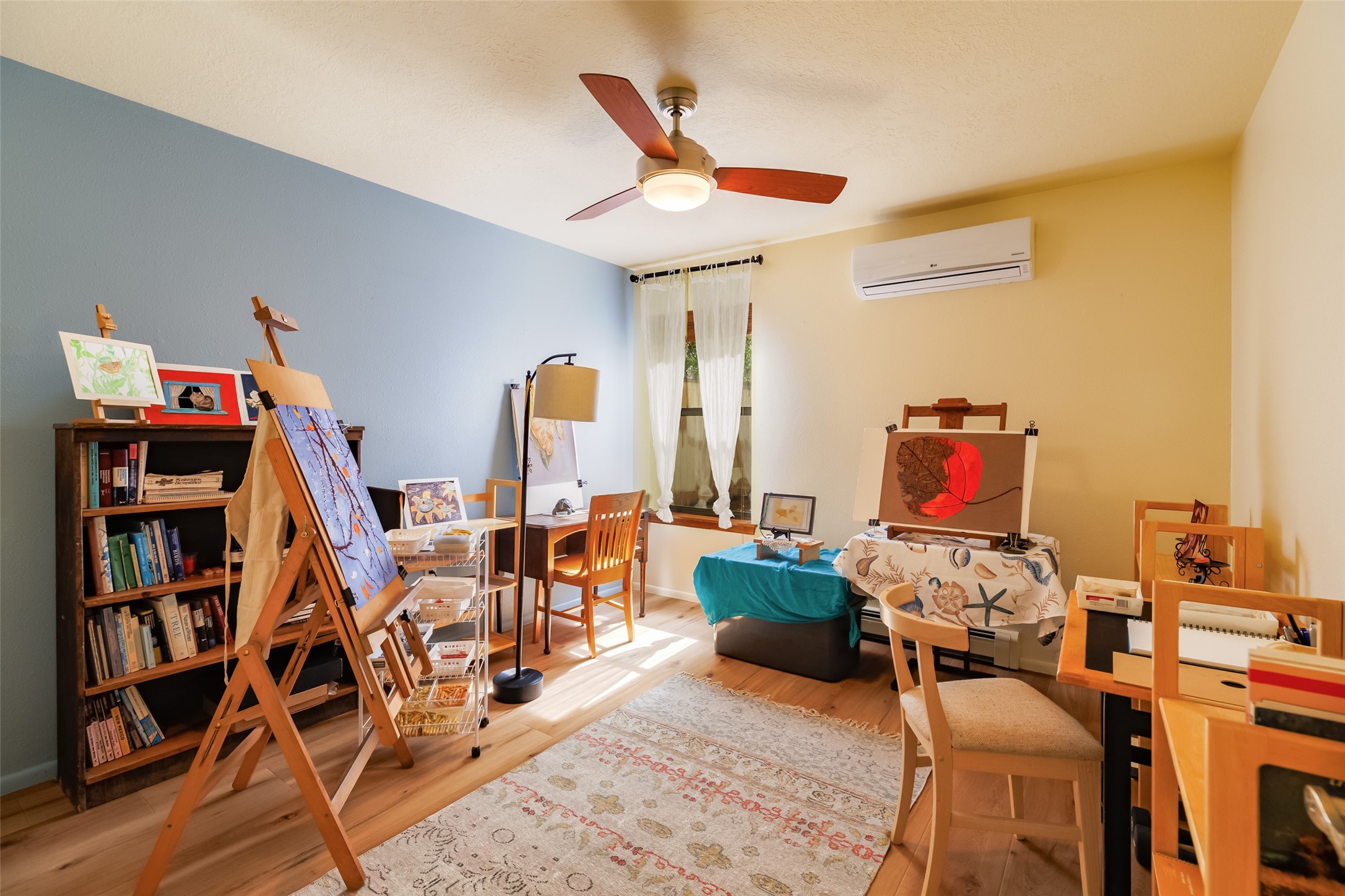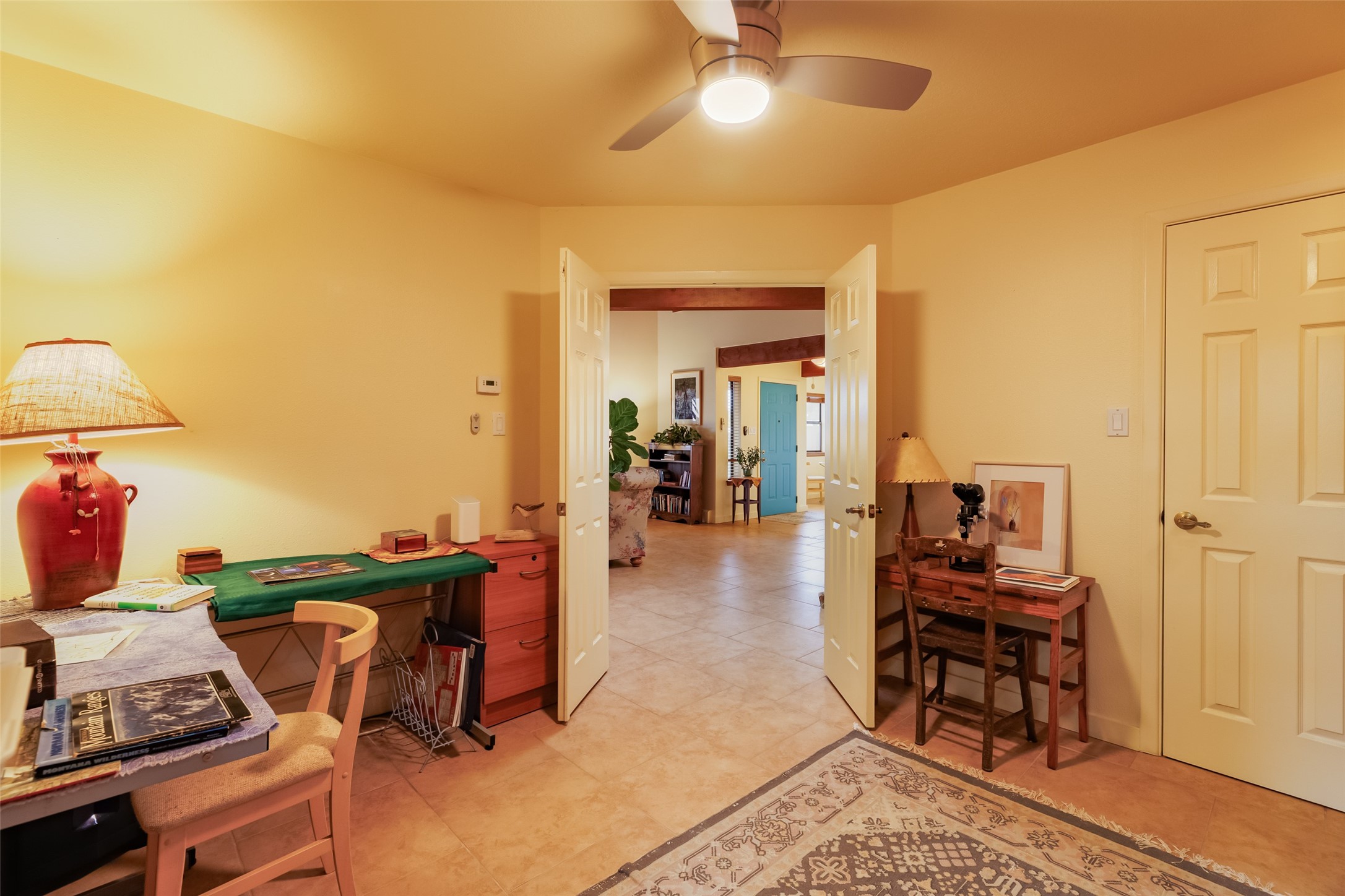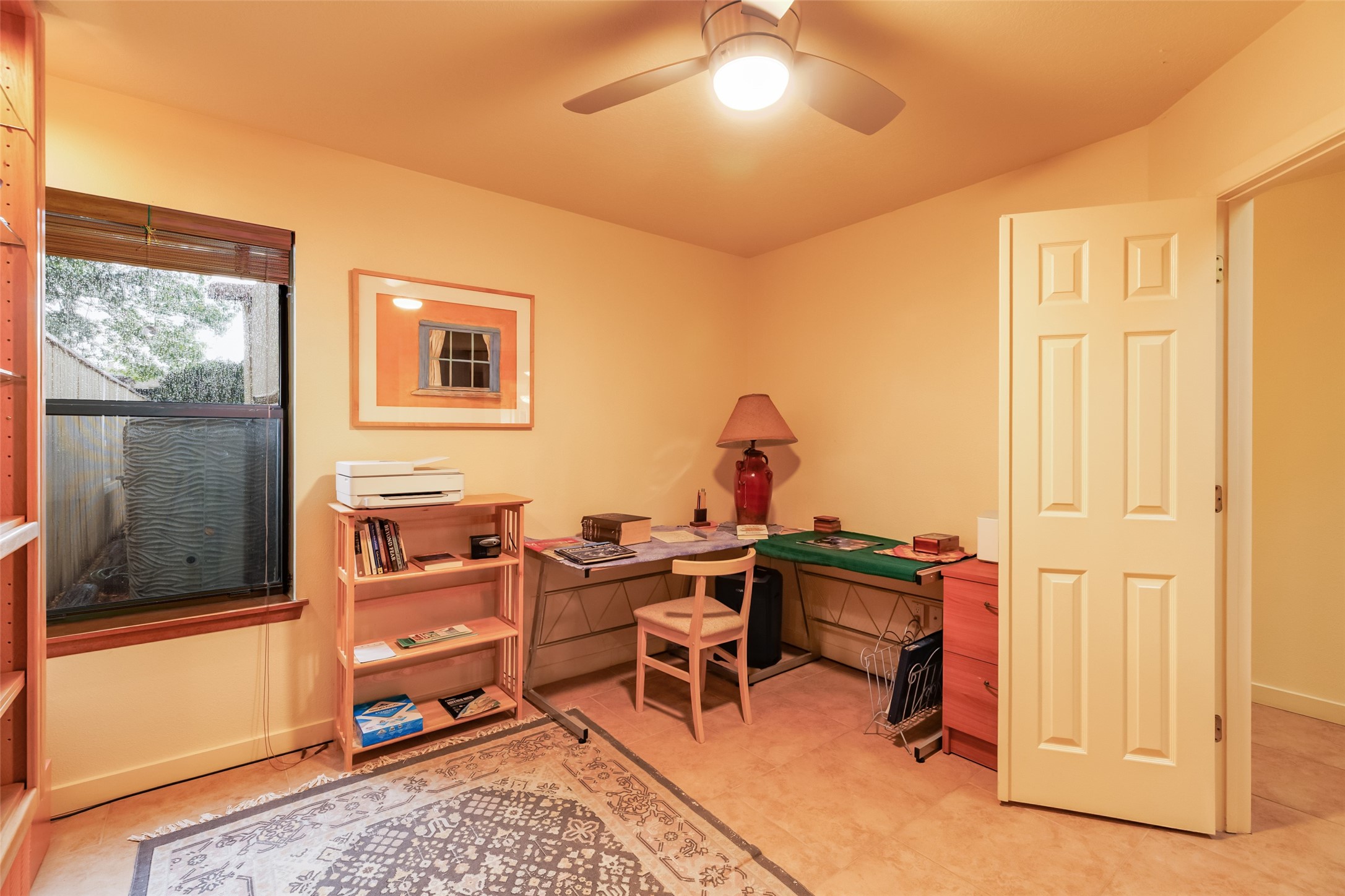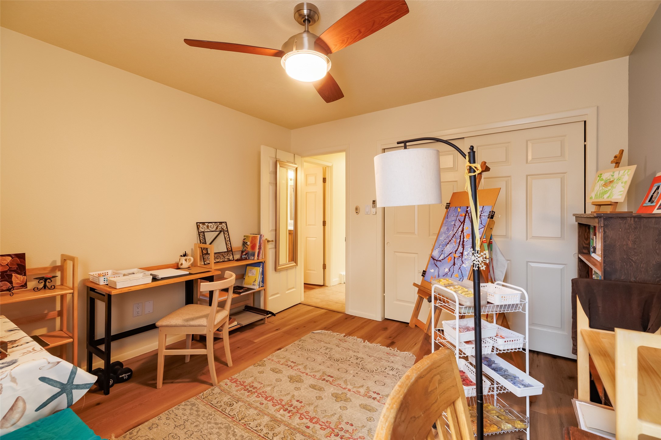 Welcome to this beautifully updated and meticulously maintained Park Plazas home, offering flexible living with 3 bedrooms or 2 bedrooms plus a dedicated office. The main living areas feature elegant tile flooring, while the bedrooms are graced with luxurious wood-look vinyl for a warm, inviting feel.Step into the spacious living room where high, beamed ceilings and a dramatic Kiva fireplace create a striking focal point. Sliding doors lead you to a generous covered portal and a flagstone patio--perfect for year-round indoor-outdoor living.The fully landscaped yard is a true oasis, showcasing an ornamental plum tree, vibrant Rose of Sharon, stately Blue Point Juniper, and a variety of flowering and evergreen plants. Multiple sitting areas and a charming pergola provide ideal spaces for entertaining or relaxing al fresco.Inside, the remodeled kitchen features newer cabinetry, sleek appliances, and stylish countertops, seamlessly combining functionality with modern aesthetics. Enjoy comfort throughout the seasons with efficient hot water baseboard heating and four mini-split units for zoned cooling.A two-car garage with direct access into the kitchen adds everyday convenience to this already stellar home.Don't miss your chance to own this standout Park Plazas property that blends classic Santa Fe style with thoughtful upgrades and lush outdoor living.