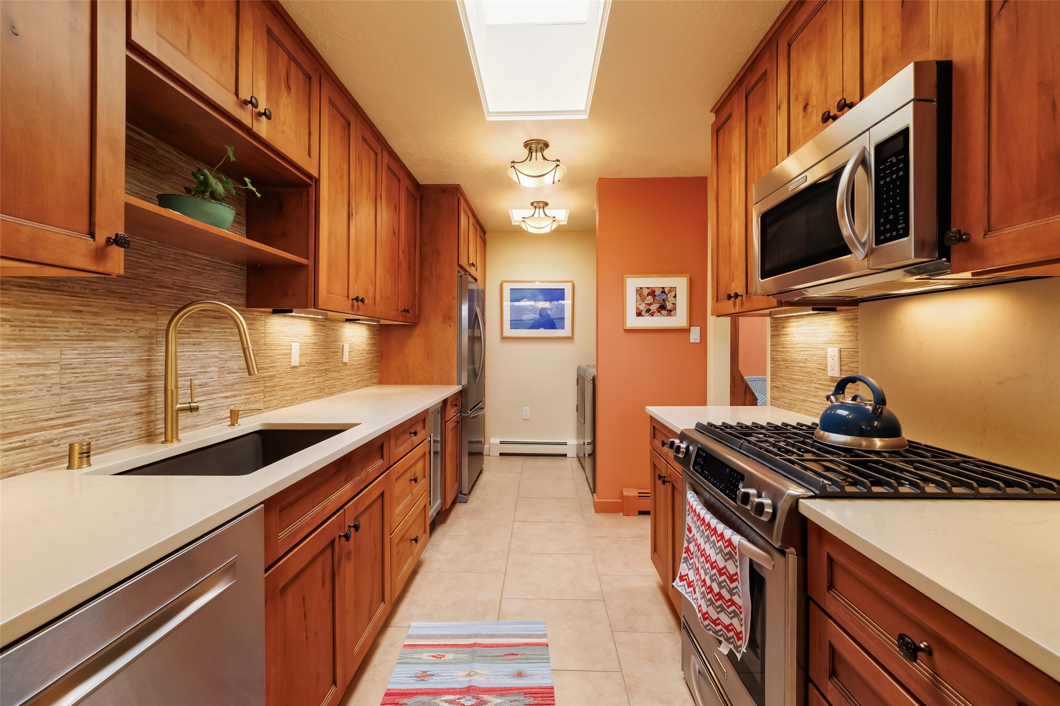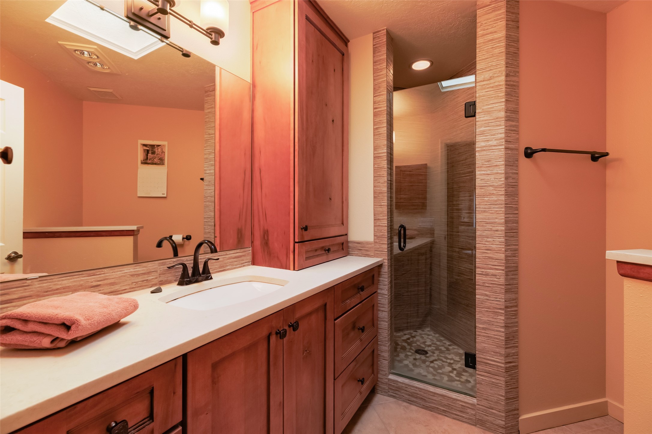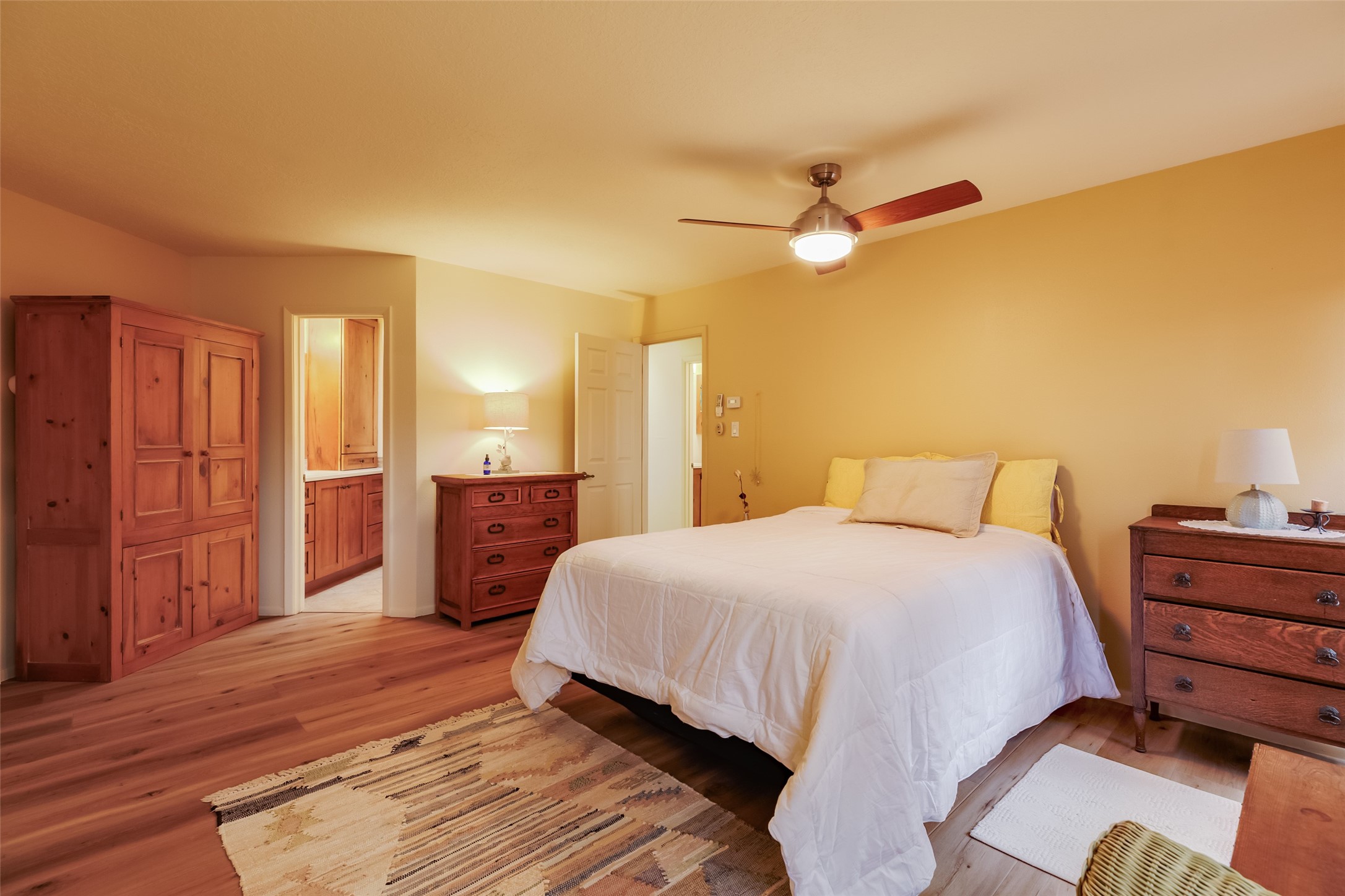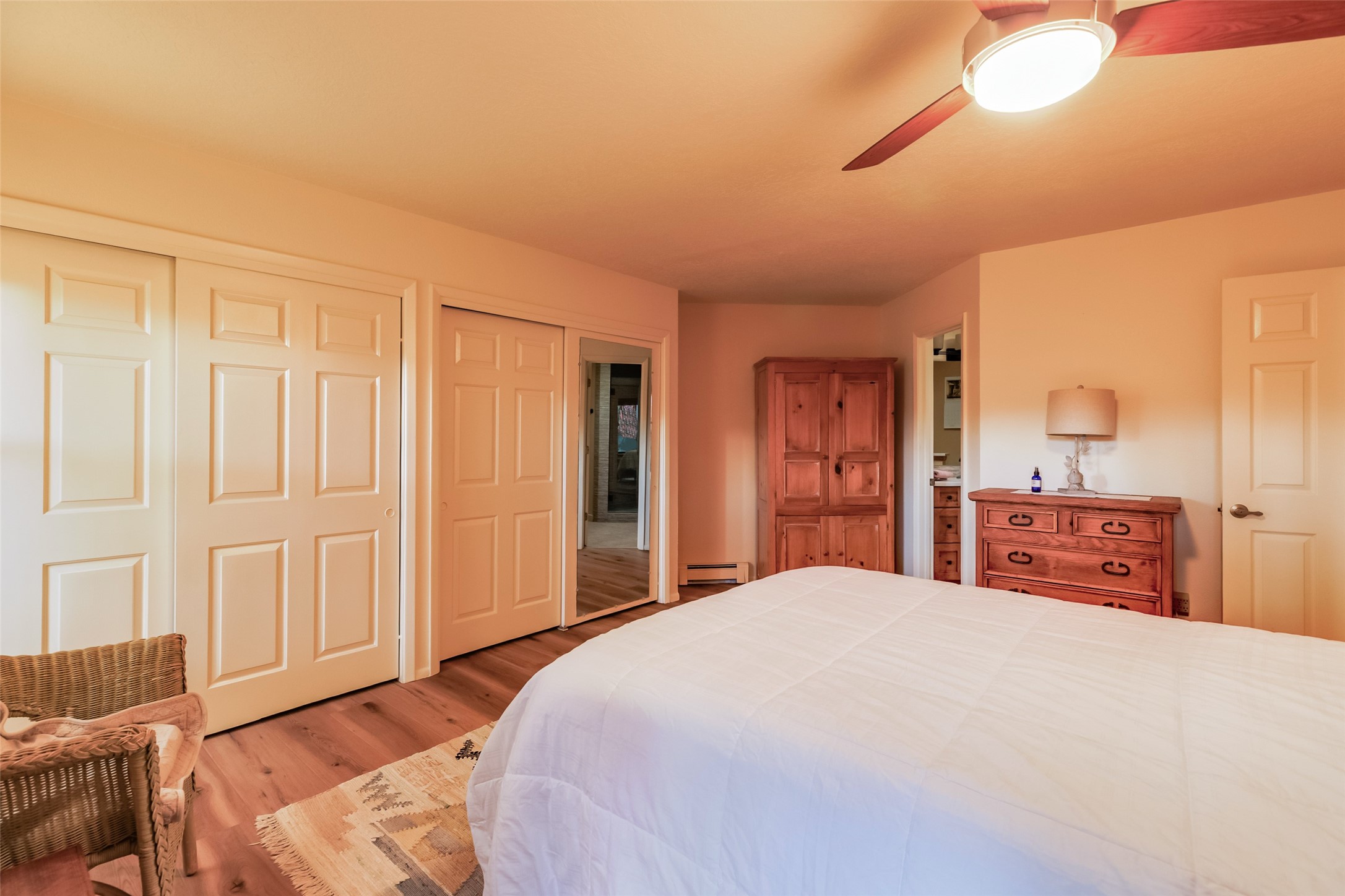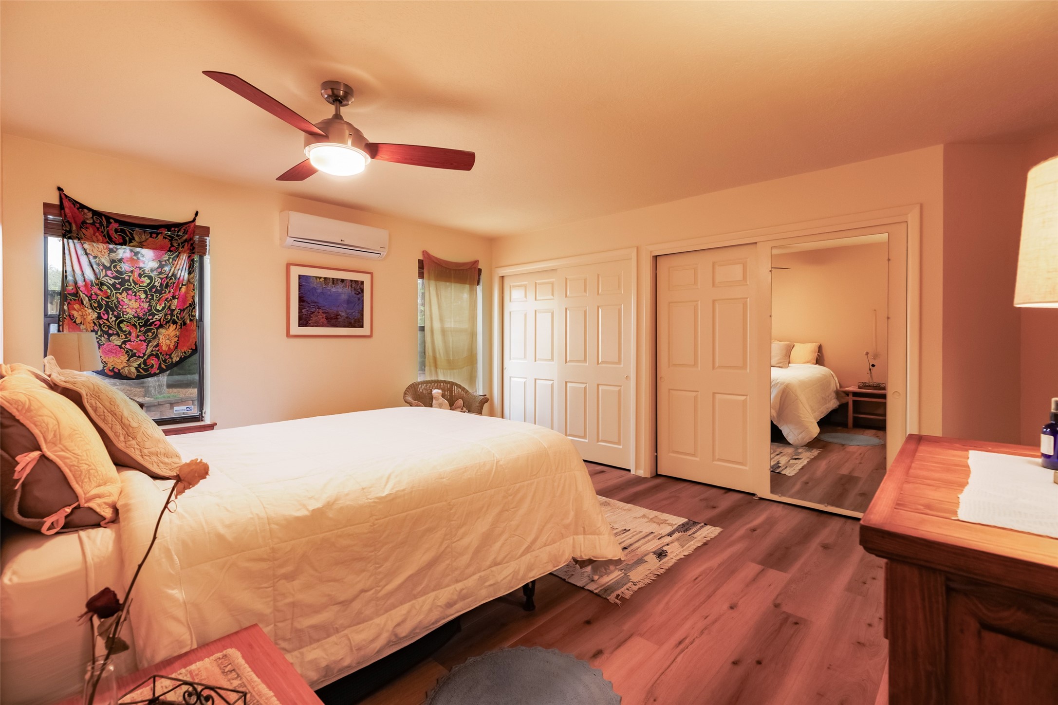 Welcome to this beautifully updated and meticulously maintained Park Plazas home, offering flexible living with 3 bedrooms or 2 bedrooms plus a dedicated office. The main living areas feature elegant tile flooring, while the bedrooms are graced with luxurious wood-look vinyl for a warm, inviting feel.Step into the spacious living room where high, beamed ceilings and a dramatic Kiva fireplace create a striking focal point. Sliding doors lead you to a generous covered portal and a flagstone patio--perfect for year-round indoor-outdoor living.The fully landscaped yard is a true oasis, showcasing an ornamental plum tree, vibrant Rose of Sharon, stately Blue Point Juniper, and a variety of flowering and evergreen plants. Multiple sitting areas and a charming pergola provide ideal spaces for entertaining or relaxing al fresco.Inside, the remodeled kitchen features newer cabinetry, sleek appliances, and stylish countertops, seamlessly combining functionality with modern aesthetics. Enjoy comfort throughout the seasons with efficient hot water baseboard heating and four mini-split units for zoned cooling.A two-car garage with direct access into the kitchen adds everyday convenience to this already stellar home.Don't miss your chance to own this standout Park Plazas property that blends classic Santa Fe style with thoughtful upgrades and lush outdoor living.