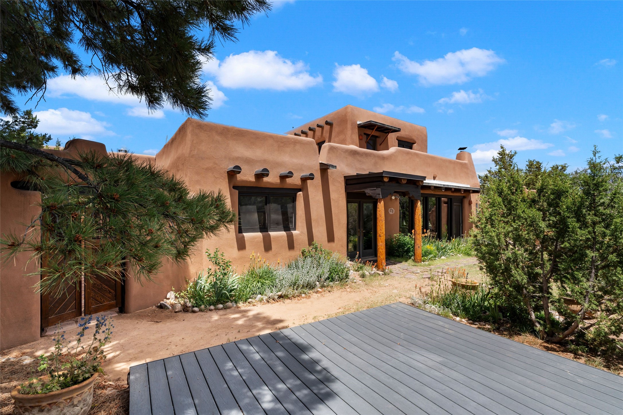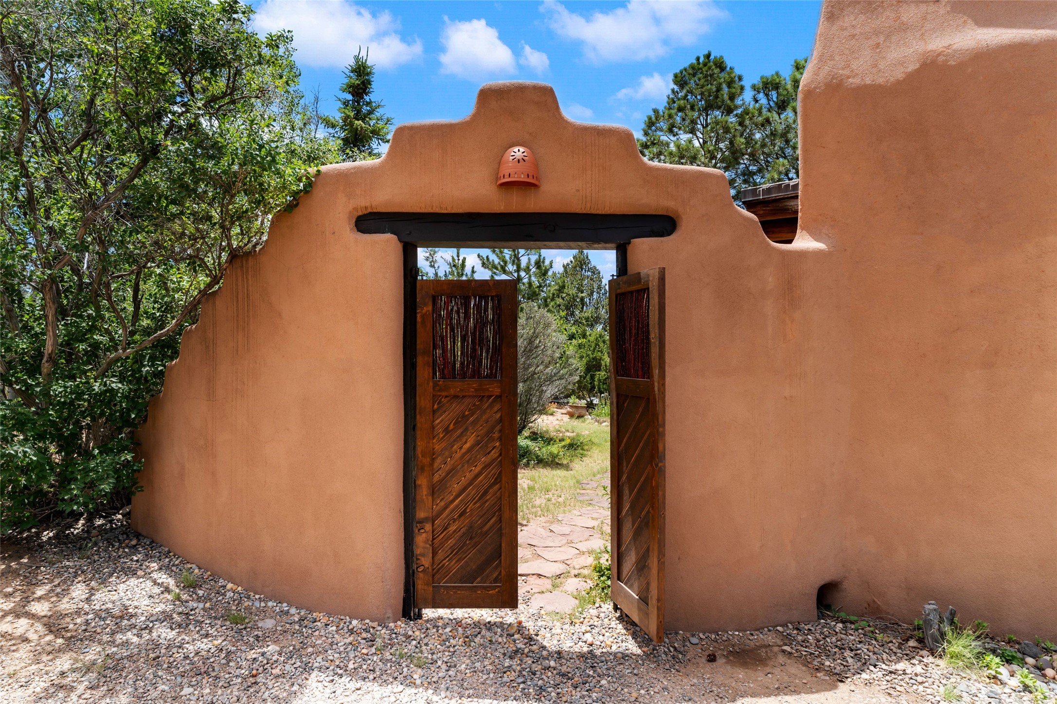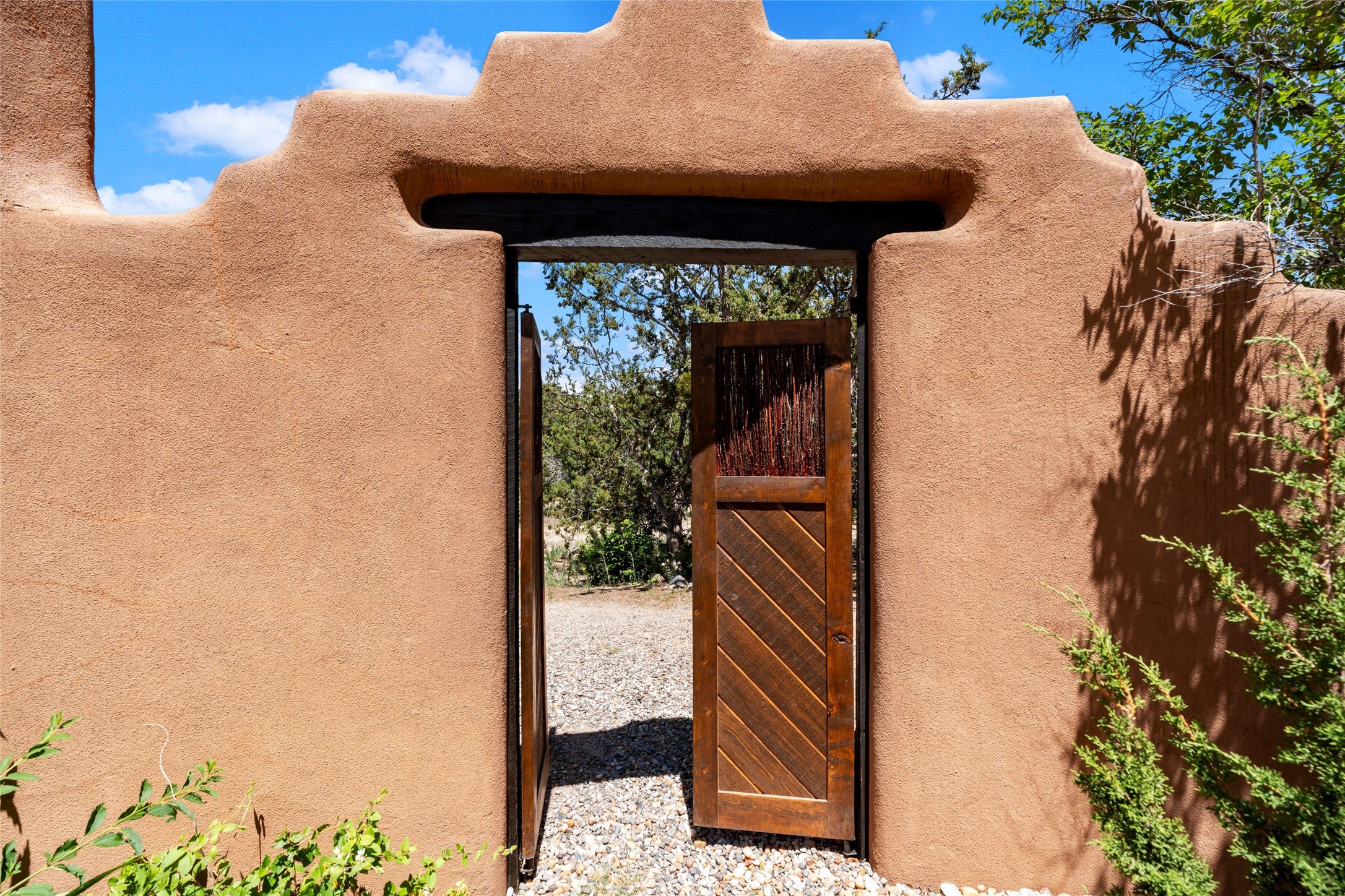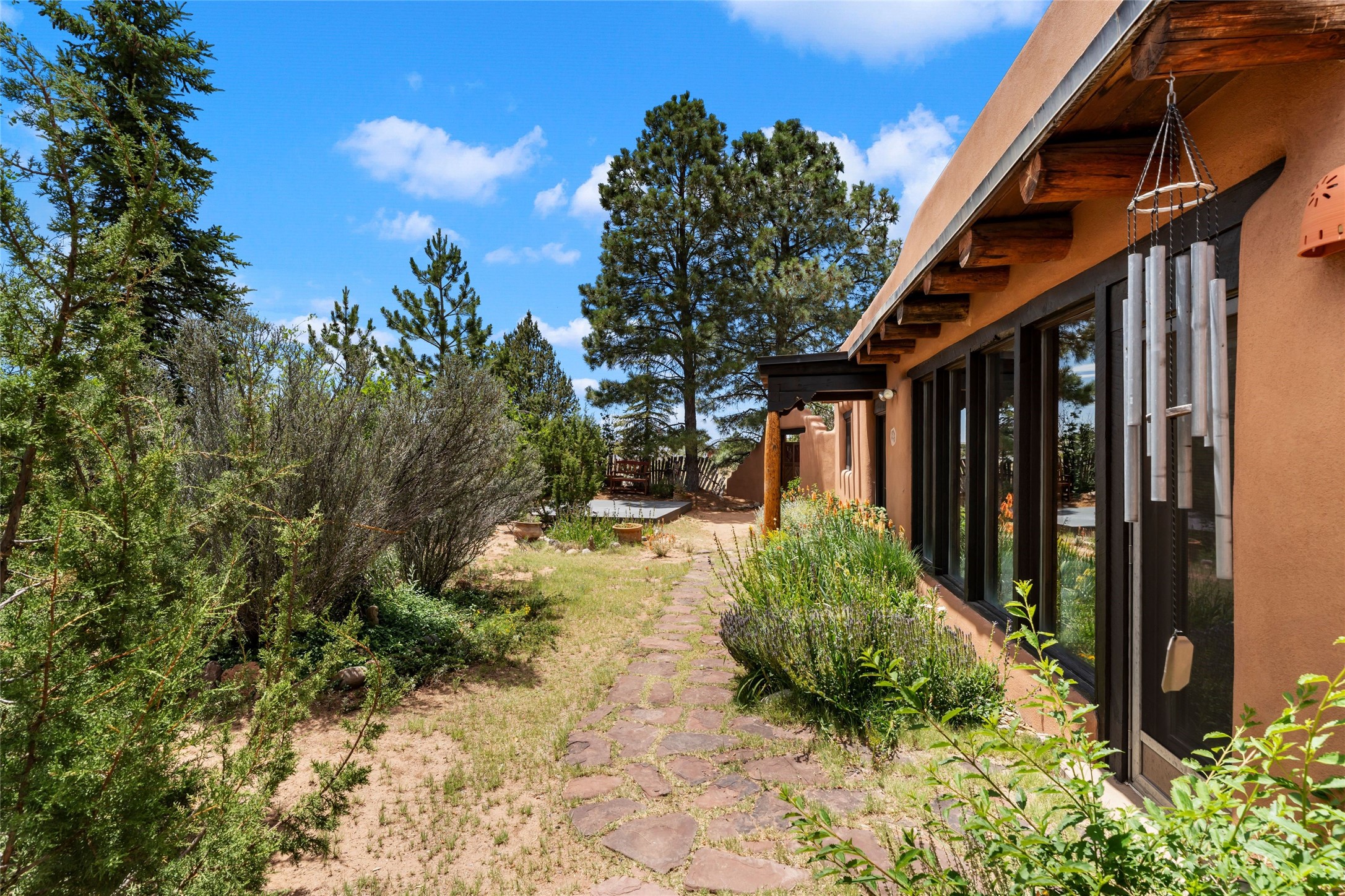 Sited on two and a half acres in a pastoral setting with pretty Sangre de Cristo mountain views, this charming Pueblo style adobe home offers traditional architectural details such as beautiful wood ceilings of vigas and latillas, also coved ceilings with vigas, plaster walls, solid wood doors, wooden lintels, brick and Saltillo tile floors, Talavera tile, and a kiva fireplace. The property features beautiful large pine trees, an enclosed yard with pretty plantings and lovely flower gardens, and a synthetic wood deck. The owner has added an art studio, which has blackout window coverings, so it can be used as a dark room as well. The original infrastructure was upgraded, the electrical system, new mechanical room added with hot water tank and boiler, roof and stucco, and the well was recently maintained with new pressure tanks installed. There's also a small horse barn on the lot.