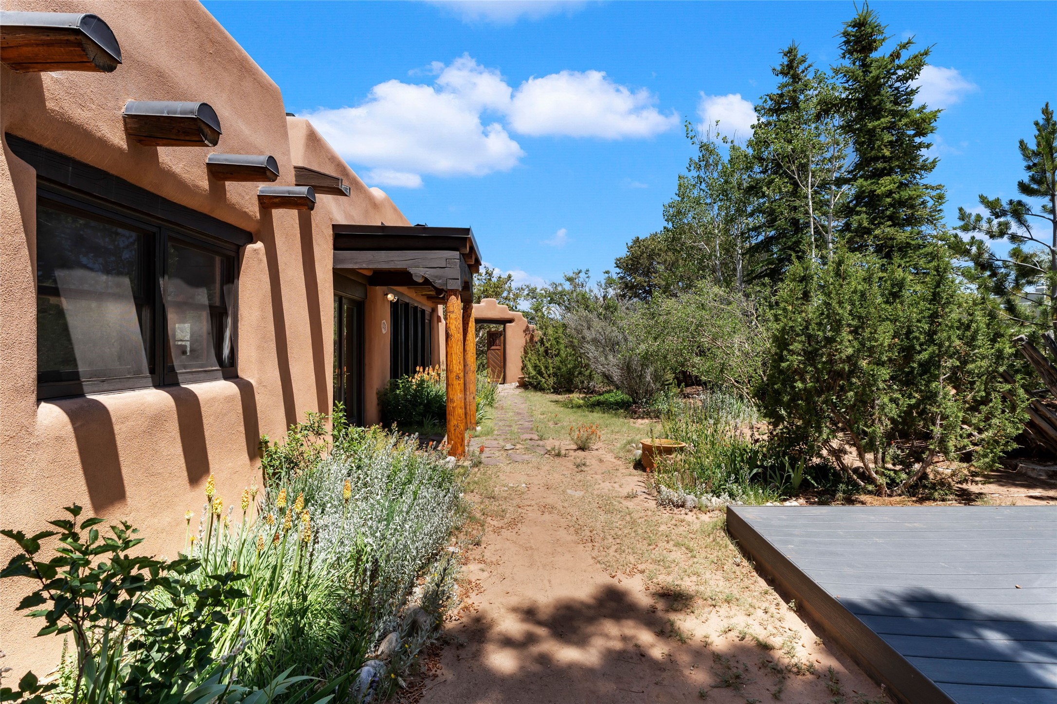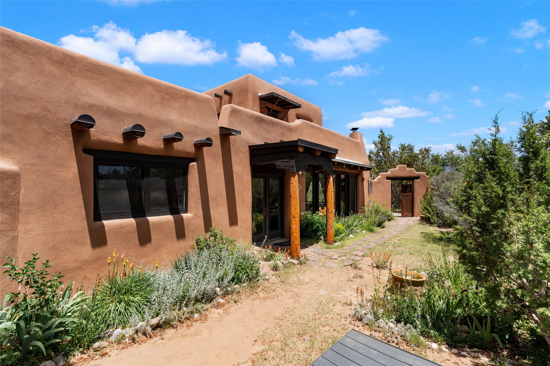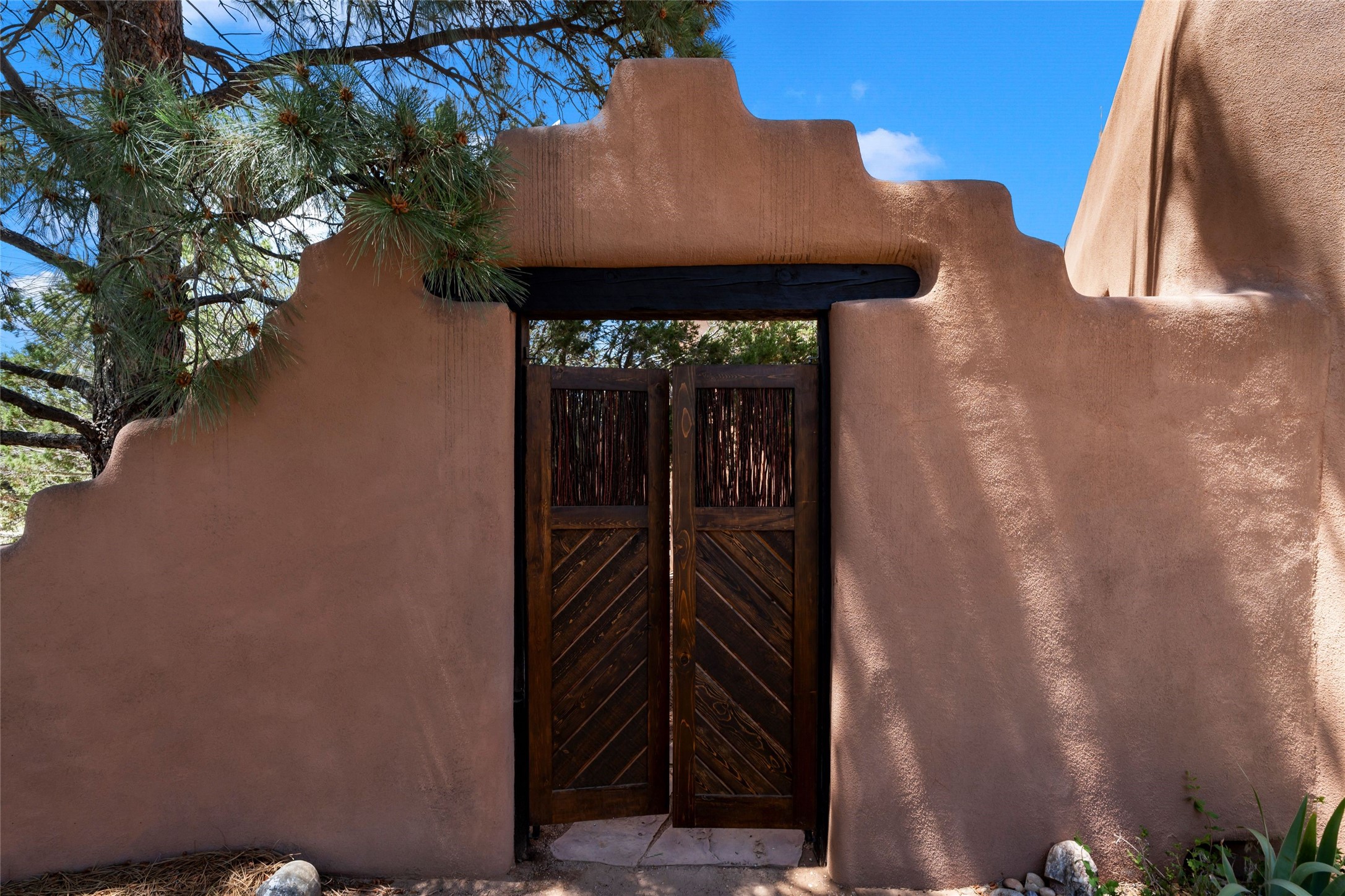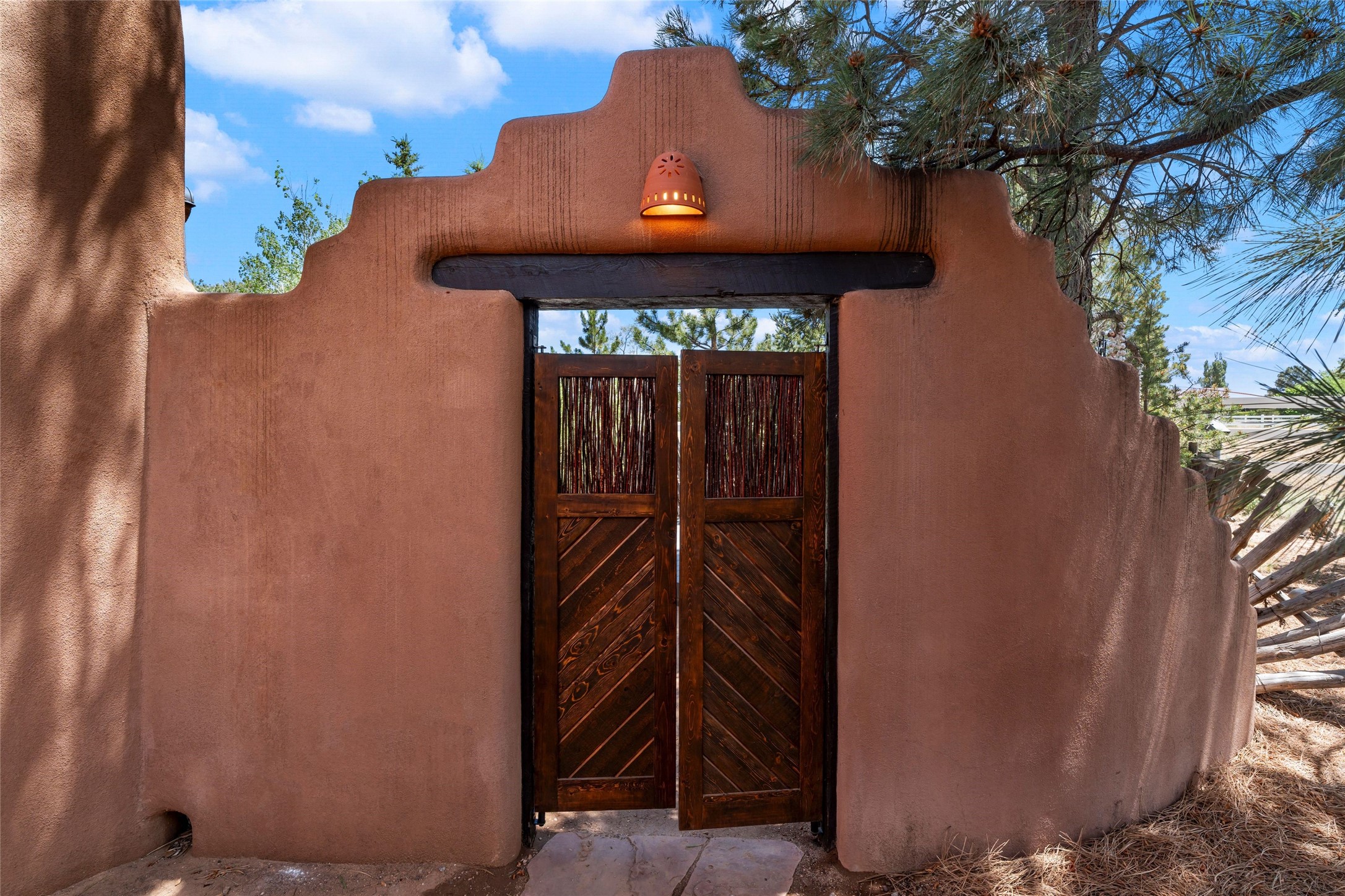 Sited on two and a half acres in a pastoral setting with pretty Sangre de Cristo mountain views, this charming Pueblo style adobe home offers traditional architectural details such as beautiful wood ceilings of vigas and latillas, also coved ceilings with vigas, plaster walls, solid wood doors, wooden lintels, brick and Saltillo tile floors, Talavera tile, and a kiva fireplace. The property features beautiful large pine trees, an enclosed yard with pretty plantings and lovely flower gardens, and a synthetic wood deck. The owner has added an art studio, which has blackout window coverings, so it can be used as a dark room as well. The original infrastructure was upgraded, the electrical system, new mechanical room added with hot water tank and boiler, roof and stucco, and the well was recently maintained with new pressure tanks installed. There's also a small horse barn on the lot.