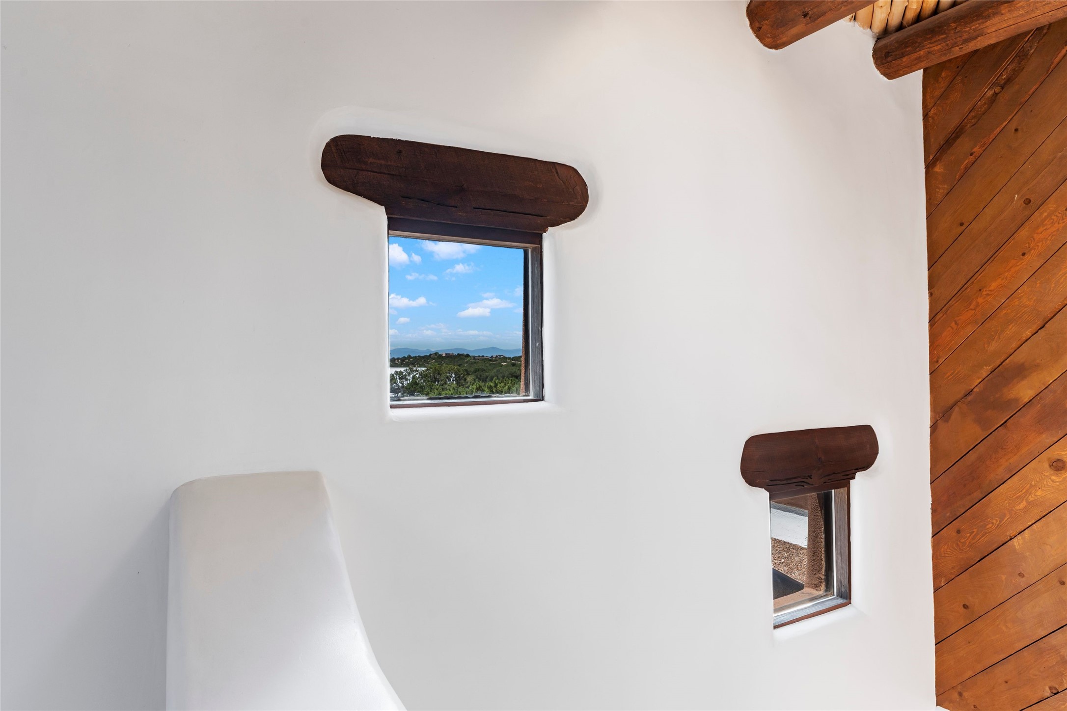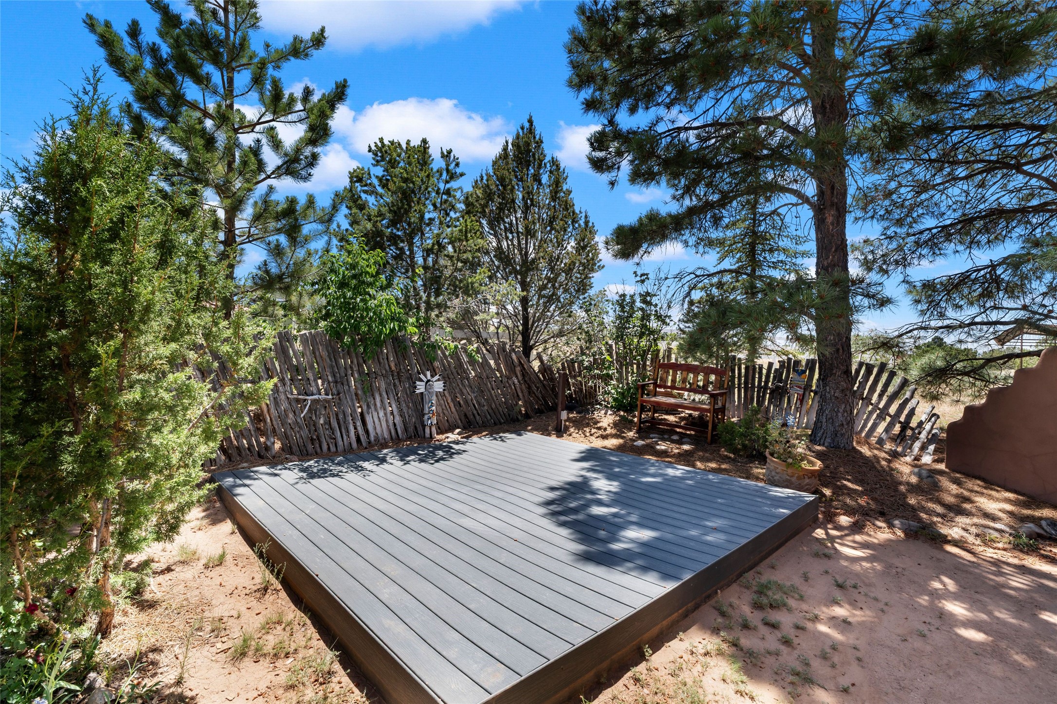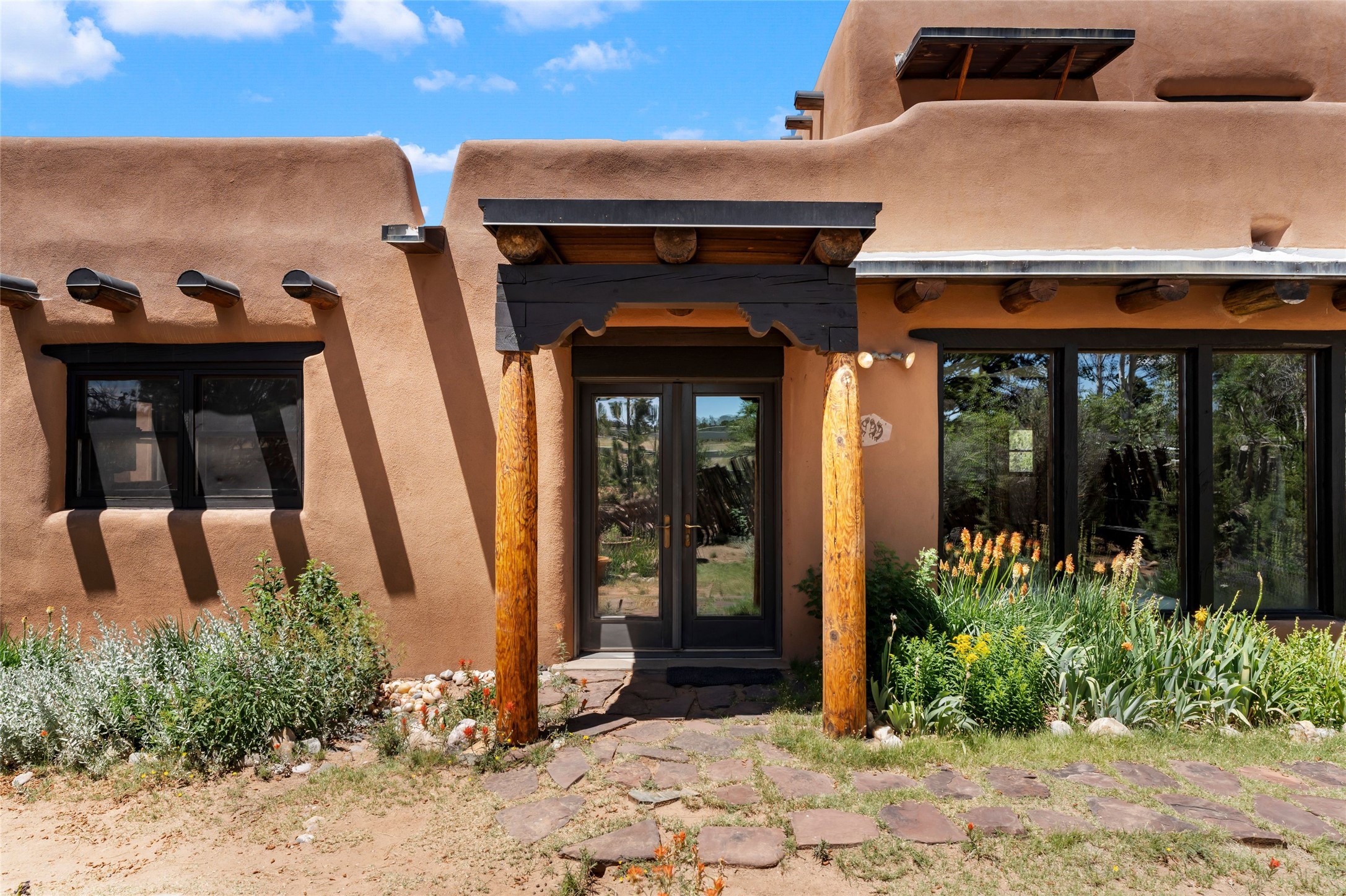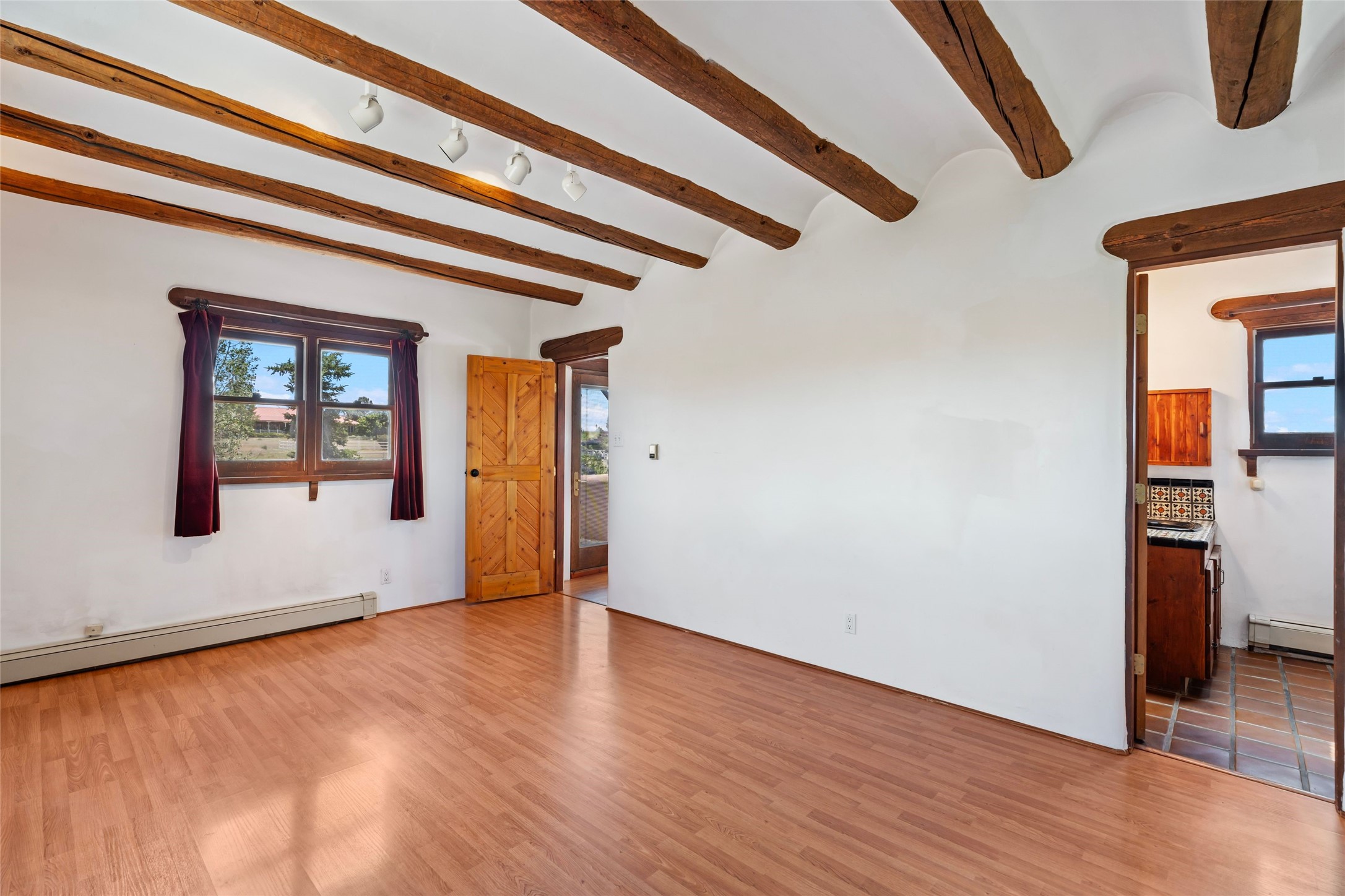 Sited on two and a half acres in a pastoral setting with pretty Sangre de Cristo mountain views, this charming Pueblo style adobe home offers traditional architectural details such as beautiful wood ceilings of vigas and latillas, also coved ceilings with vigas, plaster walls, solid wood doors, wooden lintels, brick and Saltillo tile floors, Talavera tile, and a kiva fireplace. The property features beautiful large pine trees, an enclosed yard with pretty plantings and lovely flower gardens, and a synthetic wood deck. The owner has added an art studio, which has blackout window coverings, so it can be used as a dark room as well. The original infrastructure was upgraded, the electrical system, new mechanical room added with hot water tank and boiler, roof and stucco, and the well was recently maintained with new pressure tanks installed. There's also a small horse barn on the lot.