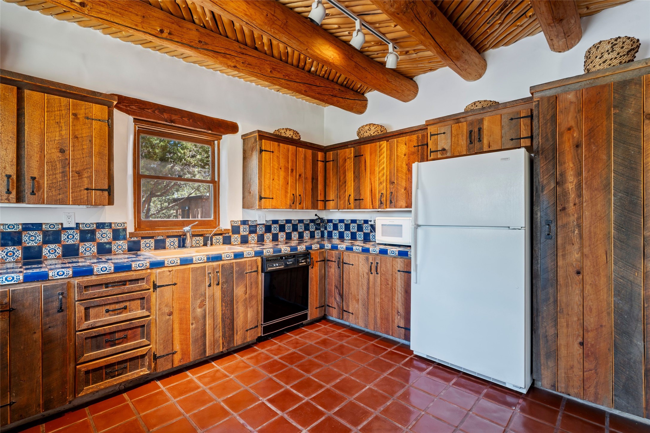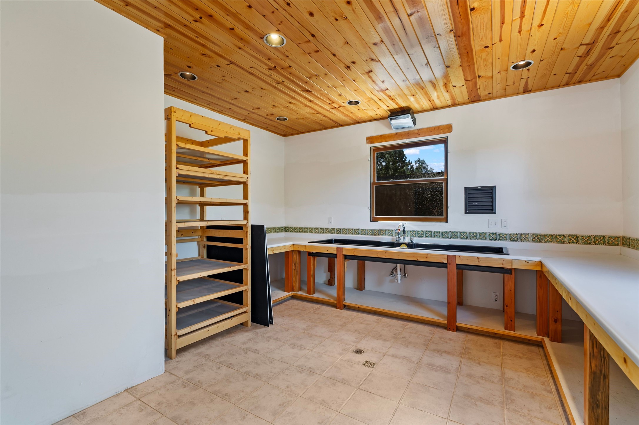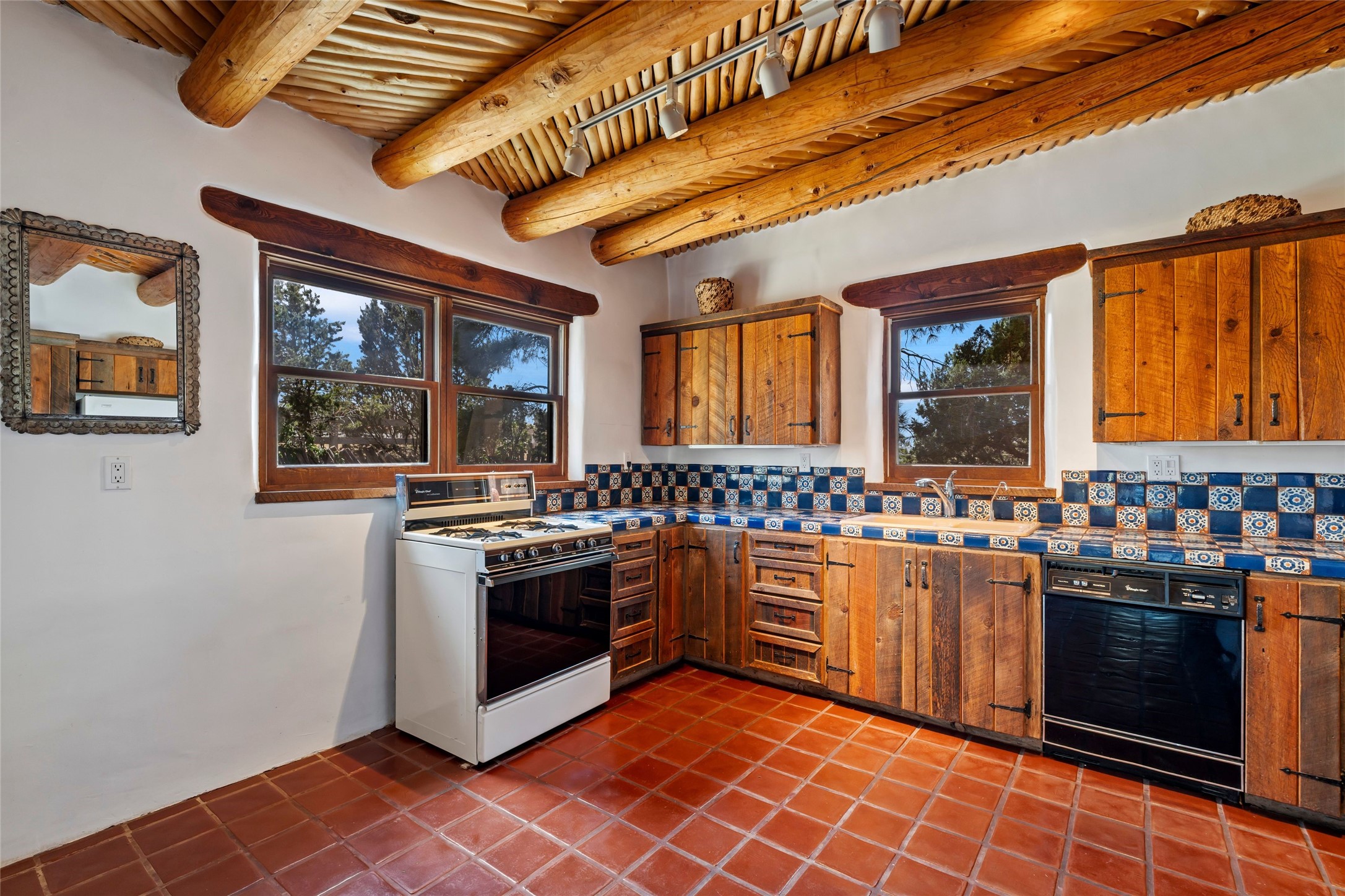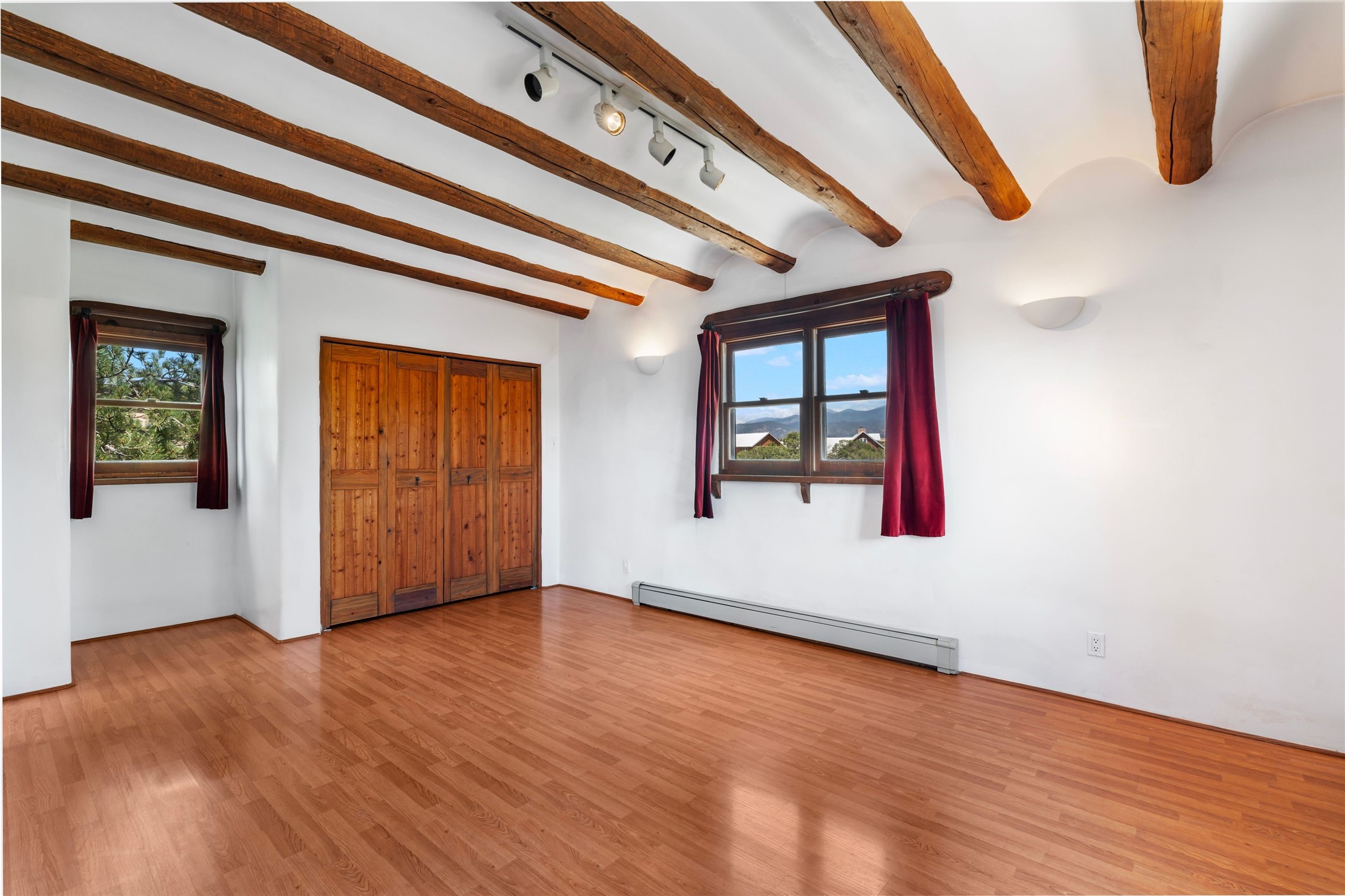 Sited on two and a half acres in a pastoral setting with pretty Sangre de Cristo mountain views, this charming Pueblo style adobe home offers traditional architectural details such as beautiful wood ceilings of vigas and latillas, also coved ceilings with vigas, plaster walls, solid wood doors, wooden lintels, brick and Saltillo tile floors, Talavera tile, and a kiva fireplace. The property features beautiful large pine trees, an enclosed yard with pretty plantings and lovely flower gardens, and a synthetic wood deck. The owner has added an art studio, which has blackout window coverings, so it can be used as a dark room as well. The original infrastructure was upgraded, the electrical system, new mechanical room added with hot water tank and boiler, roof and stucco, and the well was recently maintained with new pressure tanks installed. There's also a small horse barn on the lot.