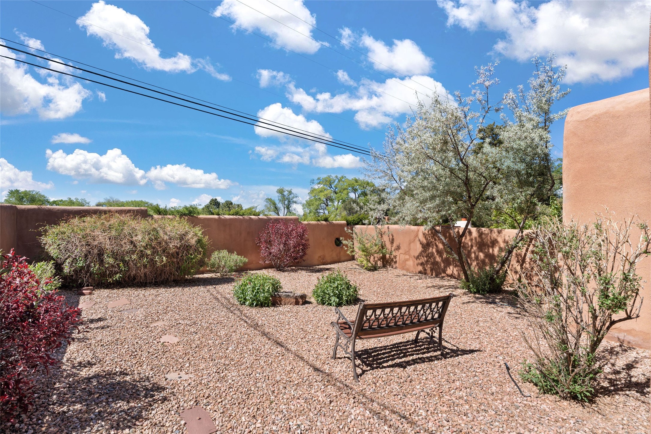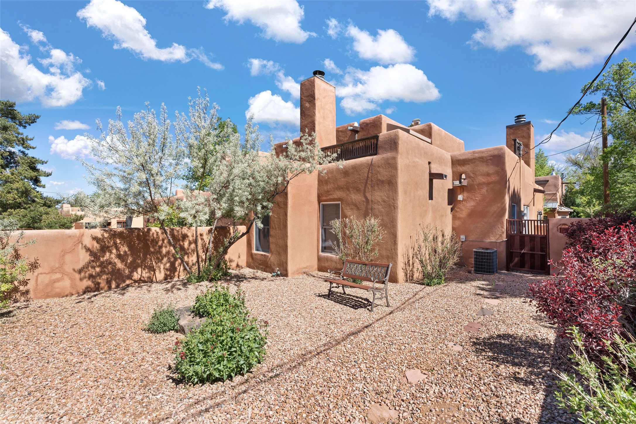 Charming Pueblo-Style Home in prime Santa Fe location, just minutes from downtown Santa Fe and the famed Canyon Road. This 2,102 sq ft Pueblo-style home blends timeless Southwestern character with modern comforts. Featuring 3 bedrooms and 2.5 bathrooms, this residence offers classic Santa Fe architecture with brick floors, exposed wood vigas, and two fireplaces. The kitchen boasts custom cabinetry, new dishwasher, and thoughtful craftsmanship throughout. Two generously sized bedrooms are located on the main level, while the upstairs hosts a large, private bedroom retreat with access to the rooftop--perfect for enjoying panoramic views of the Sangre de Cristo mountains and Santa Fe sunsets. Outdoors, professionally landscaped gardens are supported by a drip irrigation system. Additional features include a two-car garage and ample private outdoor spaces. This is a rare opportunity to own a beautifully appointed home in one of Santa Fe's most coveted locations. Furnishings available for purchase.