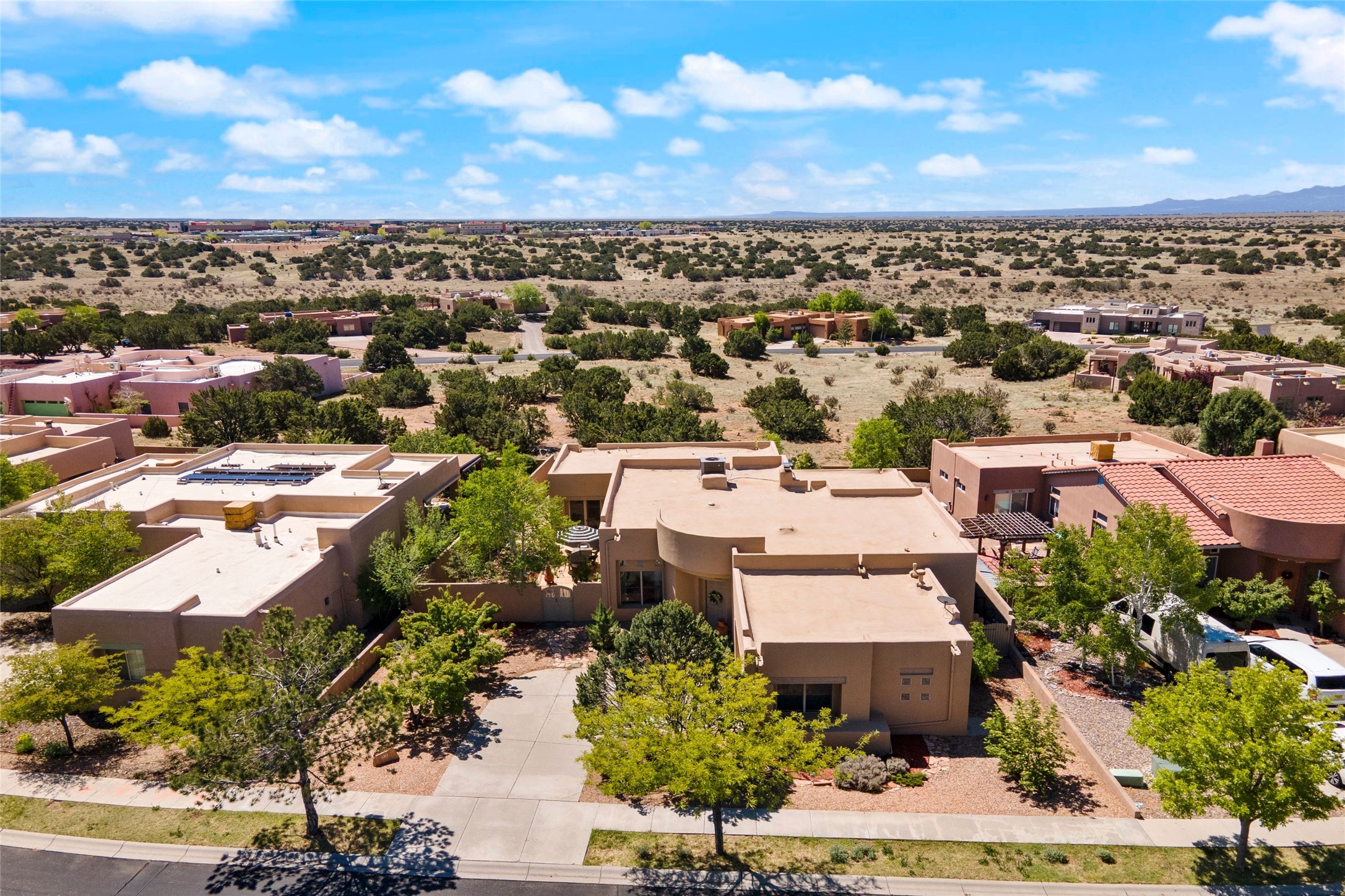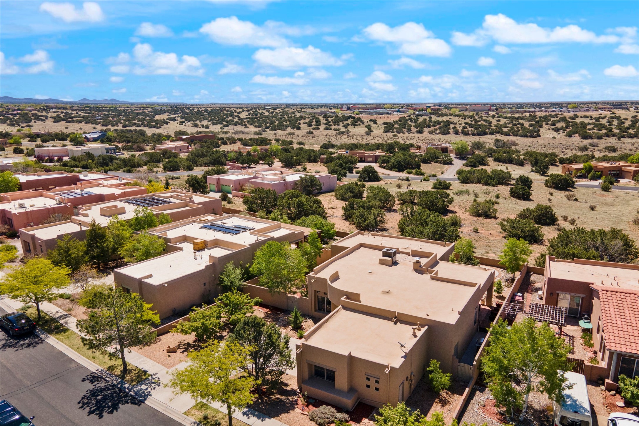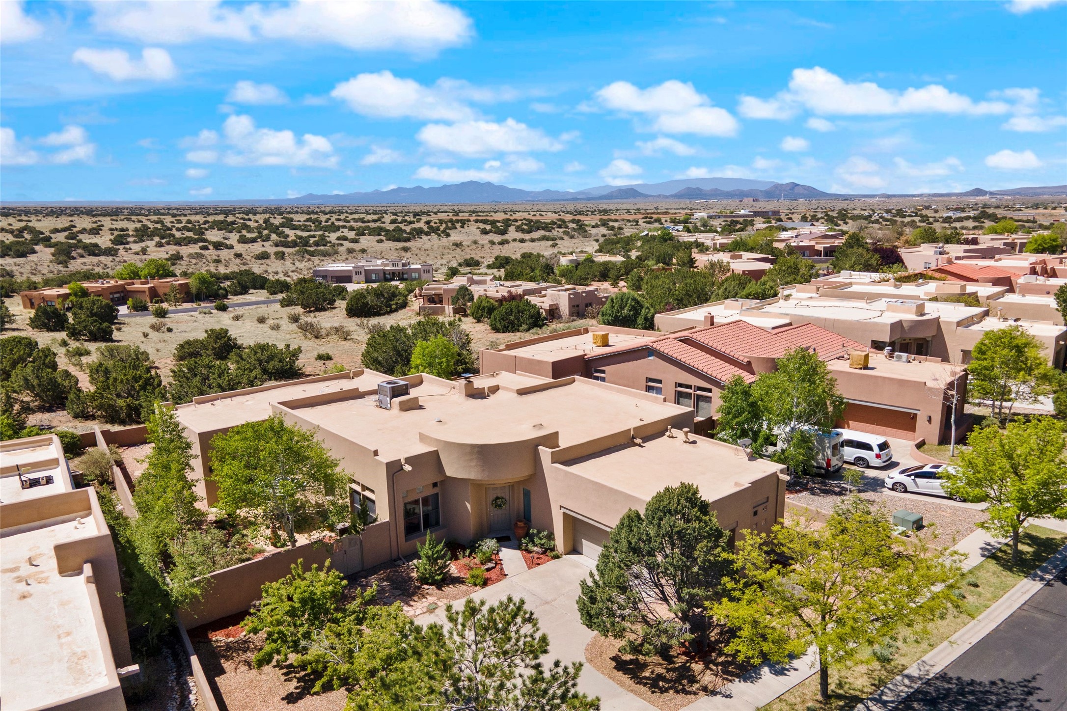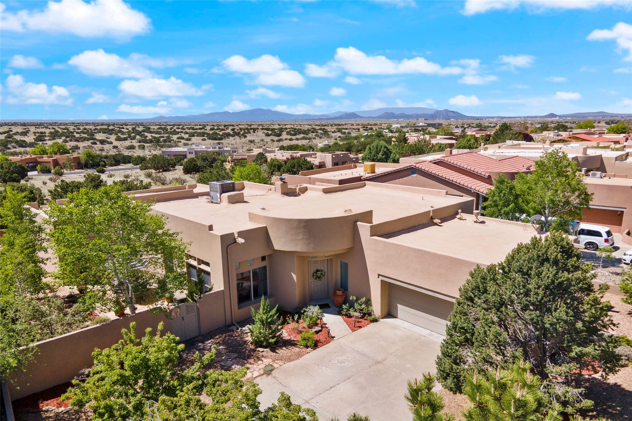 Rarely available 5 bedroom, 3 bathroom home in Rancho Viejo with multiple gathering spaces inside and out is calling you home! This was the model home and you will know why when you step through the front door. Elegance, warmth, and charm abound in this single level (no steps!) abode with high ceilings with vigas, gorgeous flagstone flooring, kiva woodburning fireplace, two living areas, and two dining areas. The grand entry foyer welcomes you into this beautiful and well-maintained home with great separation between the gracious primary bedroom suite and the four guest bedrooms. One of the guest bedrooms is its own suite with patio and separate entrance, perfect for guests wanting to come and go as they please. The additional guest bedrooms provide space for offices, exercise rooms, or whatever best suits your lifestyle. Unleash your inner chef in the stunning and functional kitchen that includes an island with bar seating, upgraded cabinets, and granite countertops. The grand rear portal is a sanctuary for outdoor living and entertaining, with Saltillo tile flooring and views to the lovely rear yard with firepit, which is fully enclosed and offers wonderful southern views of the Ortiz Mountains and the Galisteo Wave. Bask in the quiet privacy of your outdoor retreat, perfect for bird and butterfly watching and taking in Santa Fe's incredible sunrises and sunsets. In-floor radiant heat and central air conditioning will keep you comfortable year-round. Additional features include wonderful natural light via clerestory windows and sun tunnels, attached 2 car garage with direct entry, separate laundry room, and close access to the Rancho Viejo trail system. $53K in seller upgrades include a new roof silicone coating in May 2025 with a 25-year transferable warranty. Don't miss this stunning and inviting home in a coveted location!