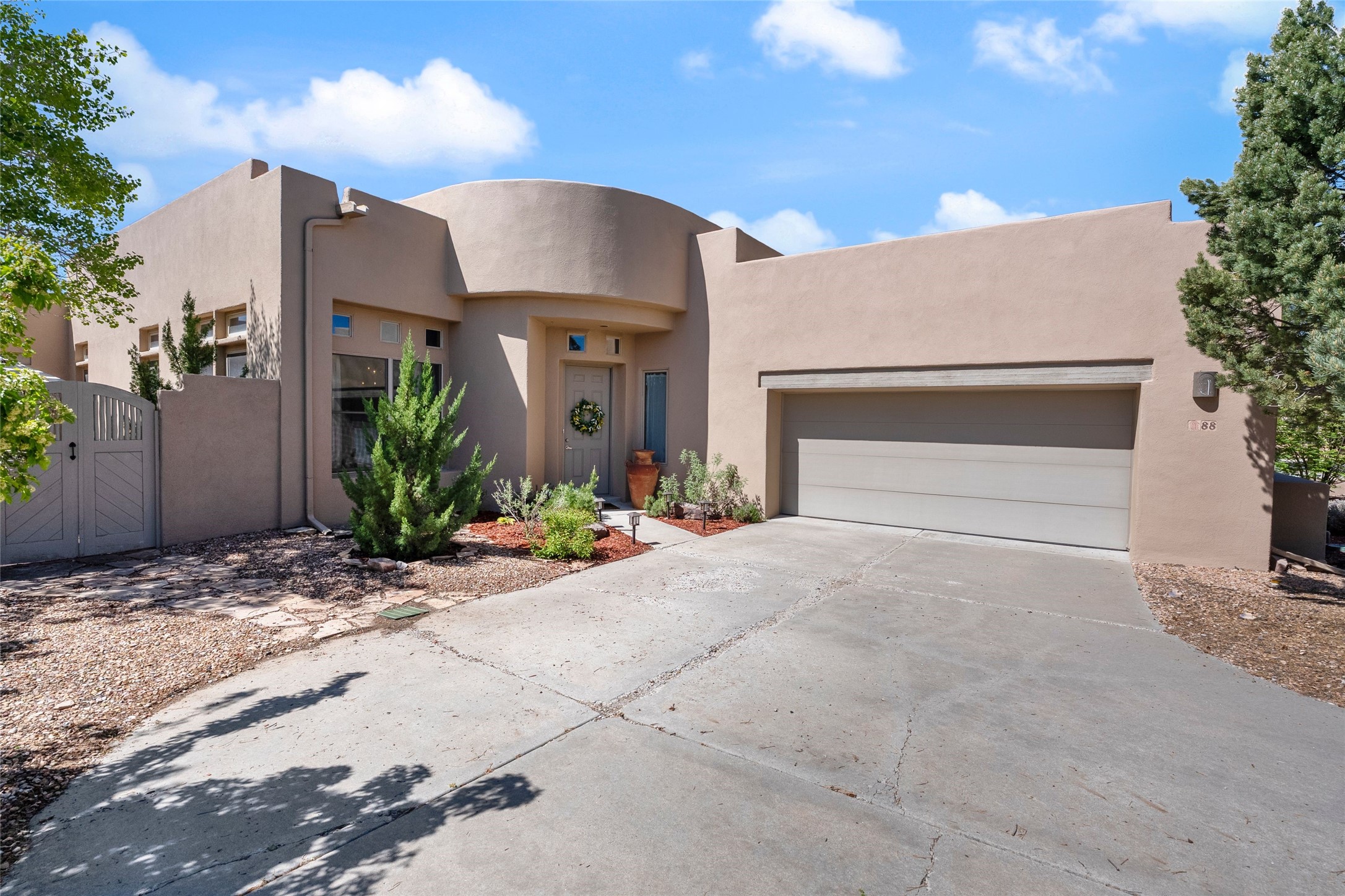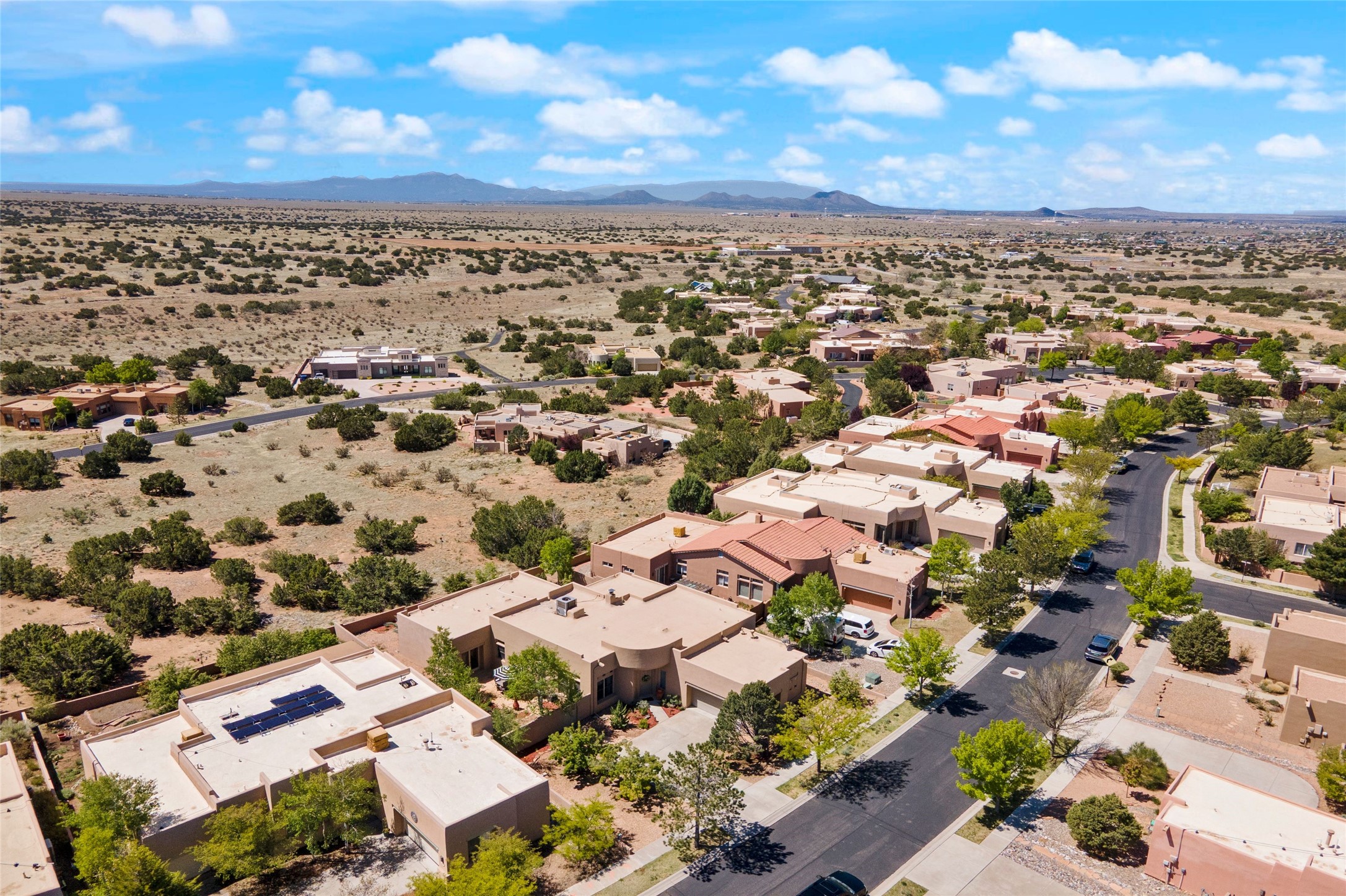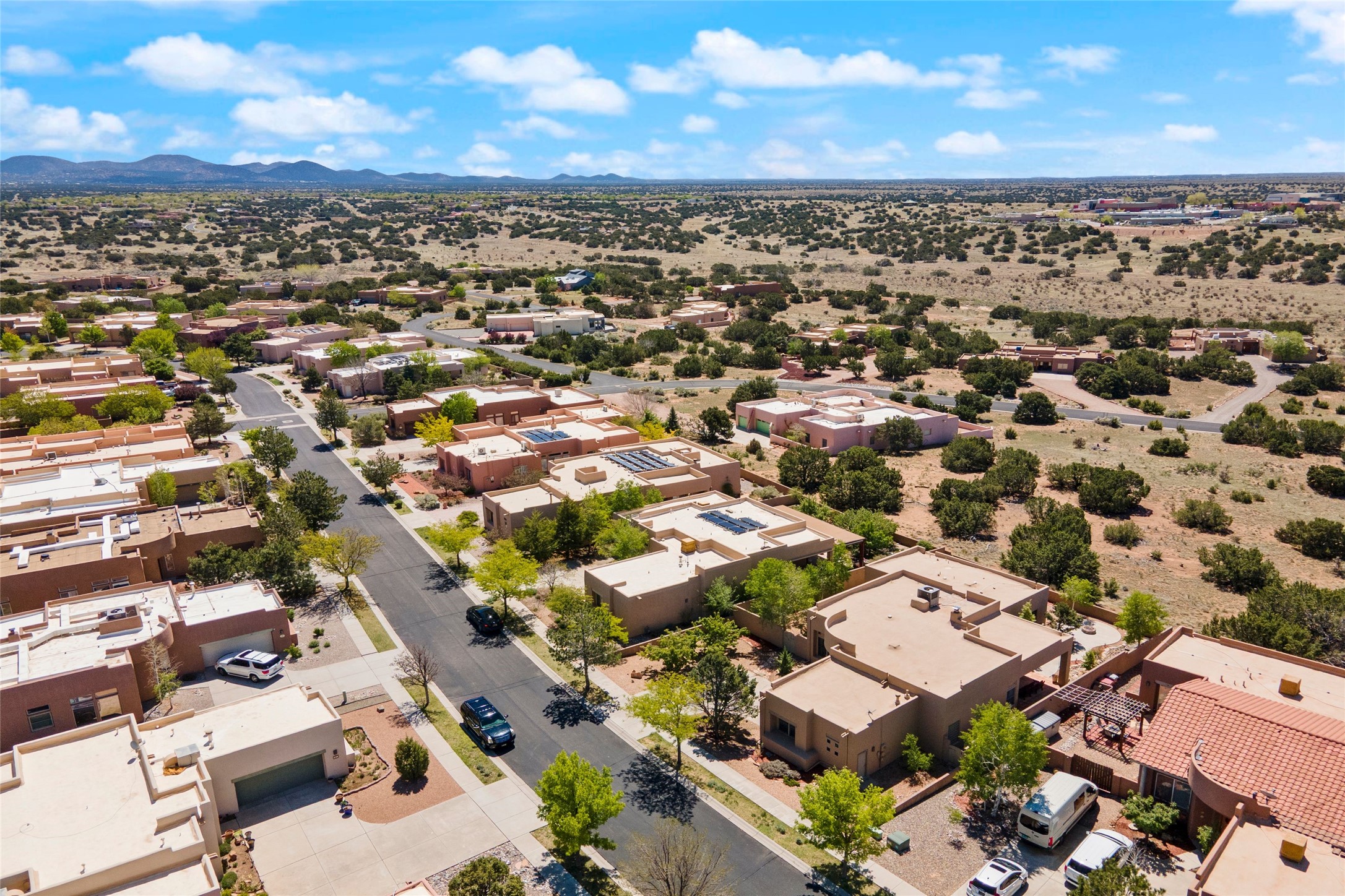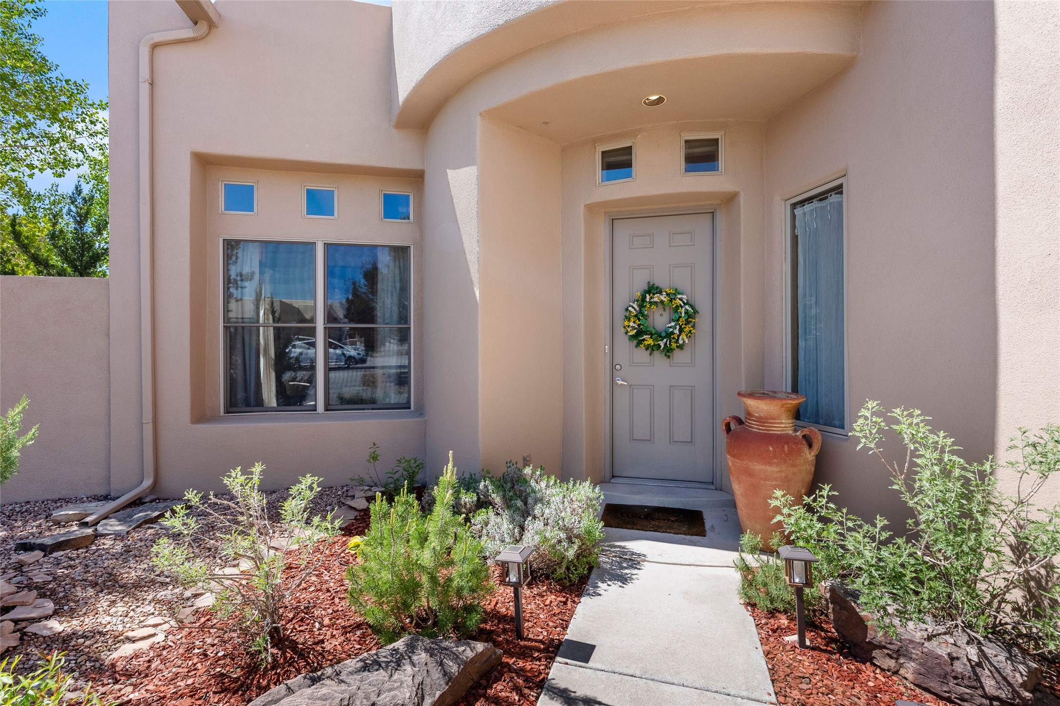 Rarely available 5 bedroom, 3 bathroom home in Rancho Viejo with multiple gathering spaces inside and out is calling you home! This was the model home and you will know why when you step through the front door. Elegance, warmth, and charm abound in this single level (no steps!) abode with high ceilings with vigas, gorgeous flagstone flooring, kiva woodburning fireplace, two living areas, and two dining areas. The grand entry foyer welcomes you into this beautiful and well-maintained home with great separation between the gracious primary bedroom suite and the four guest bedrooms. One of the guest bedrooms is its own suite with patio and separate entrance, perfect for guests wanting to come and go as they please. The additional guest bedrooms provide space for offices, exercise rooms, or whatever best suits your lifestyle. Unleash your inner chef in the stunning and functional kitchen that includes an island with bar seating, upgraded cabinets, and granite countertops. The grand rear portal is a sanctuary for outdoor living and entertaining, with Saltillo tile flooring and views to the lovely rear yard with firepit, which is fully enclosed and offers wonderful southern views of the Ortiz Mountains and the Galisteo Wave. Bask in the quiet privacy of your outdoor retreat, perfect for bird and butterfly watching and taking in Santa Fe's incredible sunrises and sunsets. In-floor radiant heat and central air conditioning will keep you comfortable year-round. Additional features include wonderful natural light via clerestory windows and sun tunnels, attached 2 car garage with direct entry, separate laundry room, and close access to the Rancho Viejo trail system. $53K in seller upgrades include a new roof silicone coating in May 2025 with a 25-year transferable warranty. Don't miss this stunning and inviting home in a coveted location!