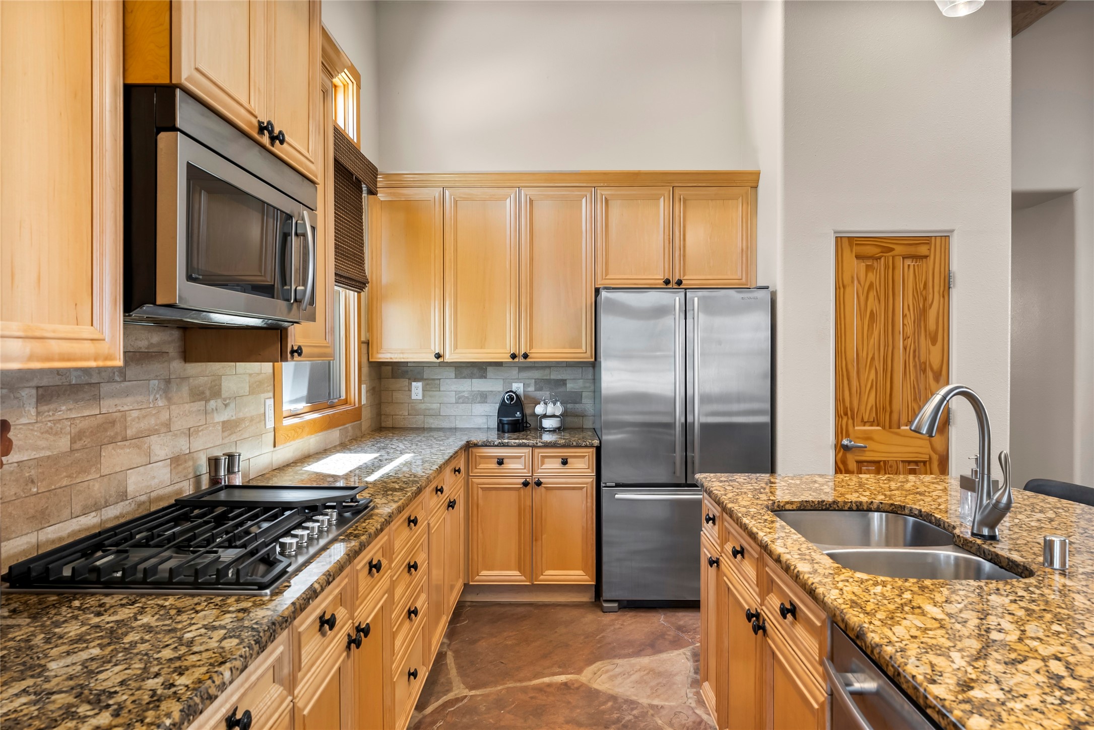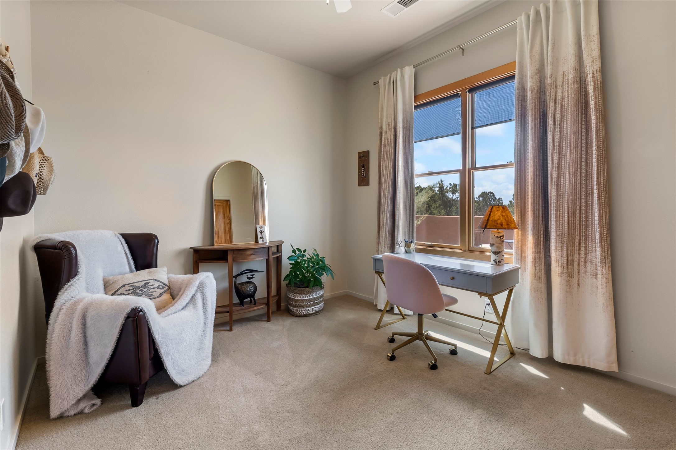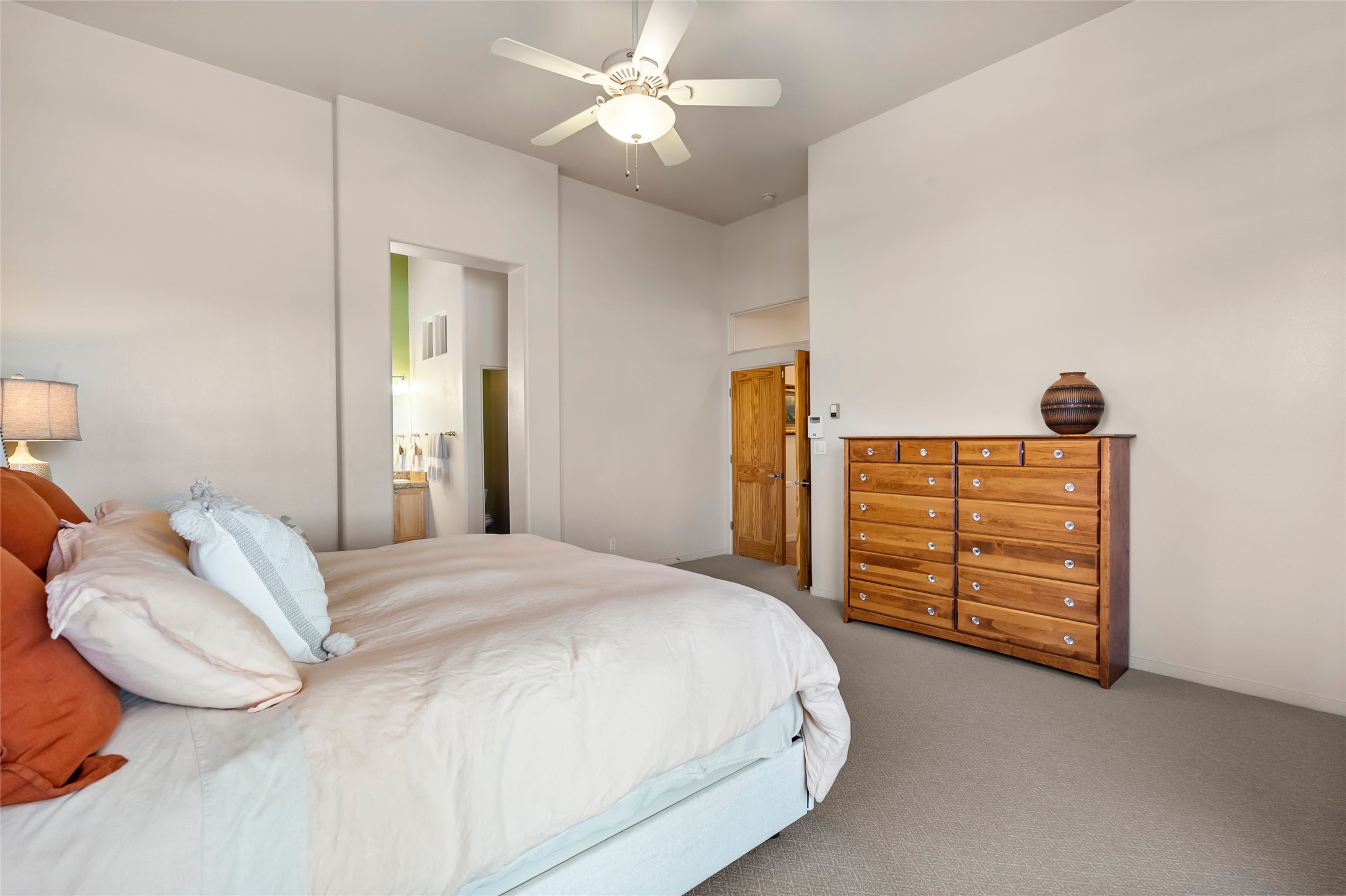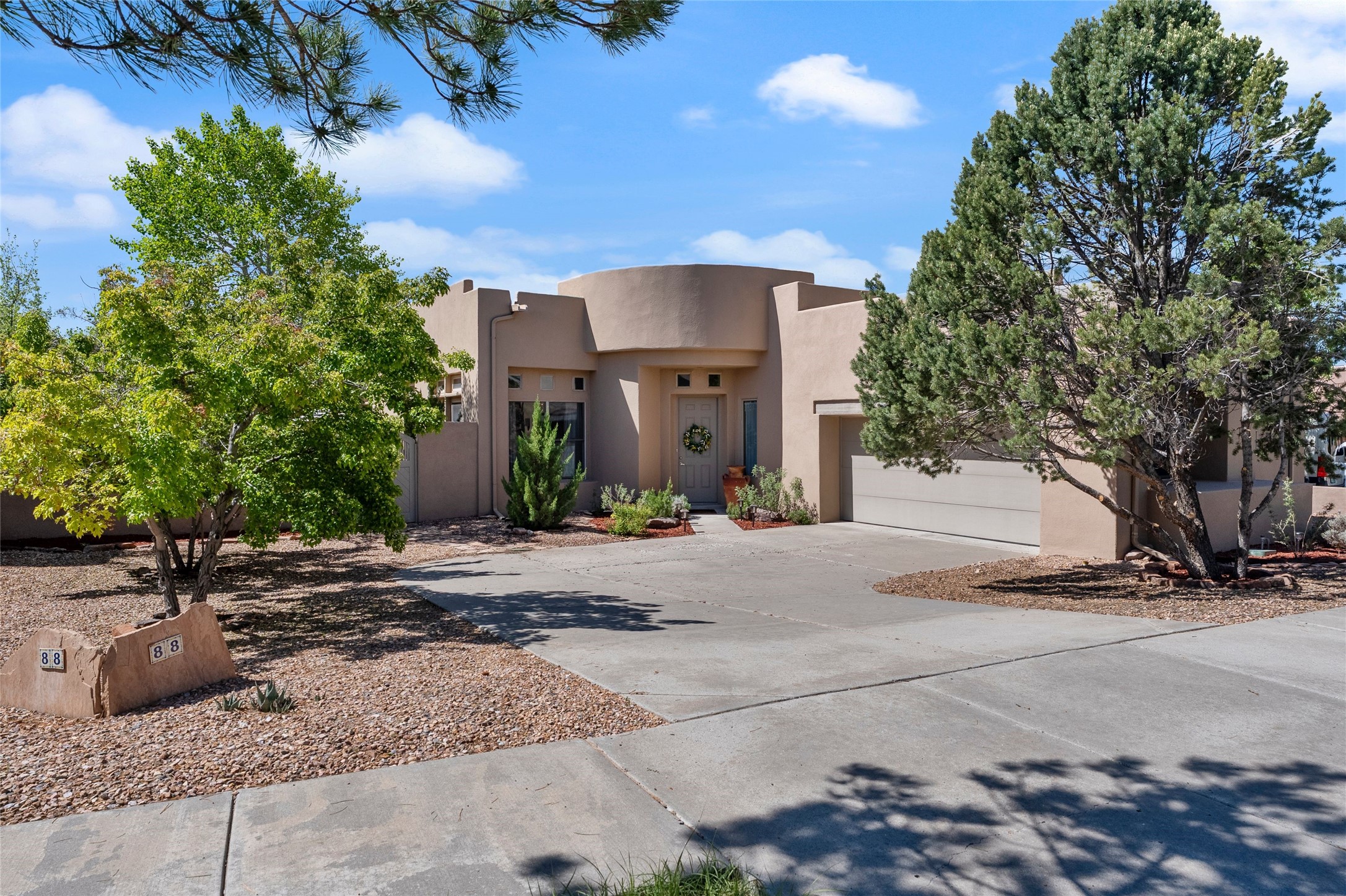 Rarely available 5 bedroom, 3 bathroom home in Rancho Viejo with multiple gathering spaces inside and out is calling you home! This was the model home and you will know why when you step through the front door. Elegance, warmth, and charm abound in this single level (no steps!) abode with high ceilings with vigas, gorgeous flagstone flooring, kiva woodburning fireplace, two living areas, and two dining areas. The grand entry foyer welcomes you into this beautiful and well-maintained home with great separation between the gracious primary bedroom suite and the four guest bedrooms. One of the guest bedrooms is its own suite with patio and separate entrance, perfect for guests wanting to come and go as they please. The additional guest bedrooms provide space for offices, exercise rooms, or whatever best suits your lifestyle. Unleash your inner chef in the stunning and functional kitchen that includes an island with bar seating, upgraded cabinets, and granite countertops. The grand rear portal is a sanctuary for outdoor living and entertaining, with Saltillo tile flooring and views to the lovely rear yard with firepit, which is fully enclosed and offers wonderful southern views of the Ortiz Mountains and the Galisteo Wave. Bask in the quiet privacy of your outdoor retreat, perfect for bird and butterfly watching and taking in Santa Fe's incredible sunrises and sunsets. In-floor radiant heat and central air conditioning will keep you comfortable year-round. Additional features include wonderful natural light via clerestory windows and sun tunnels, attached 2 car garage with direct entry, separate laundry room, and close access to the Rancho Viejo trail system. $53K in seller upgrades include a new roof silicone coating in May 2025 with a 25-year transferable warranty. Don't miss this stunning and inviting home in a coveted location!