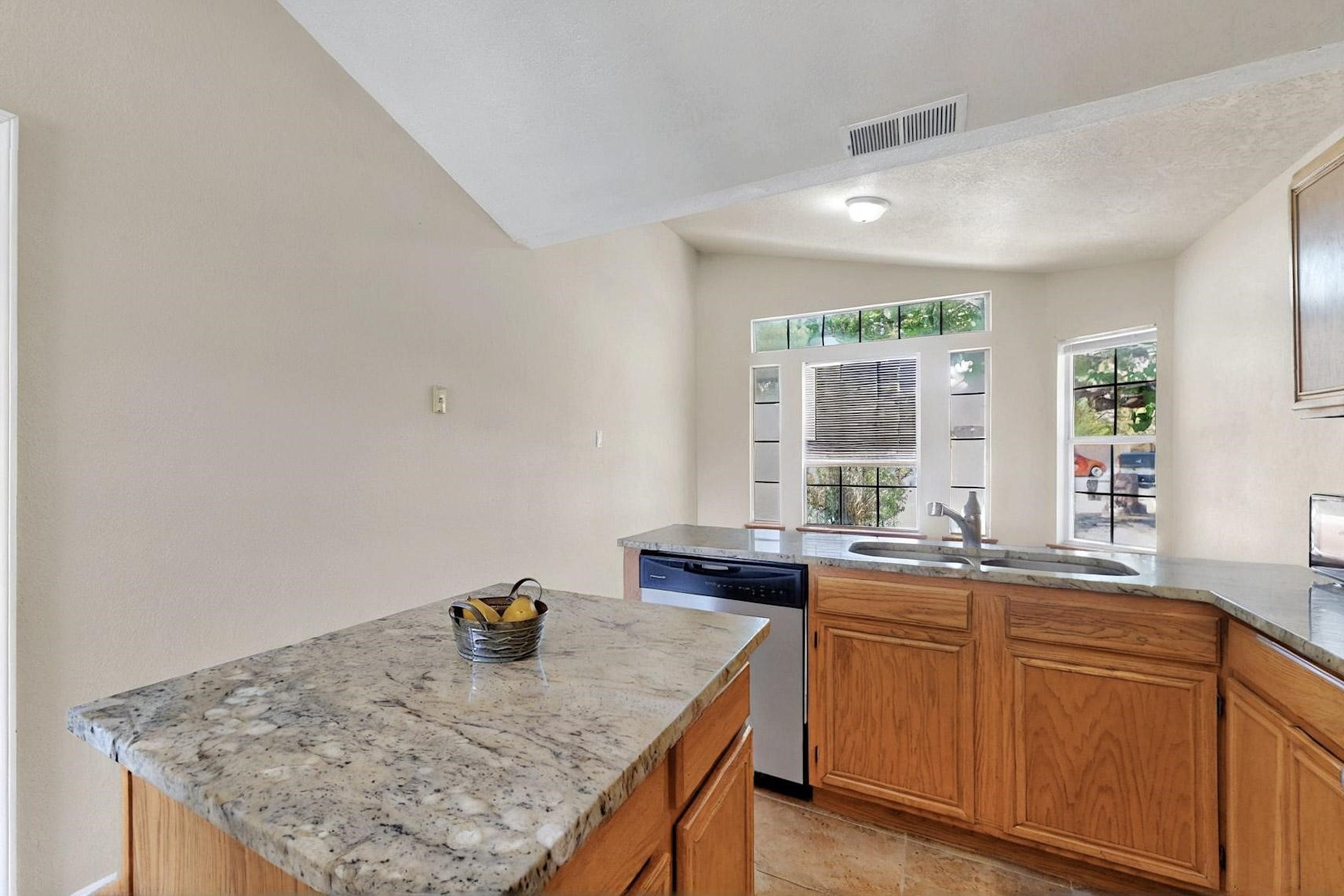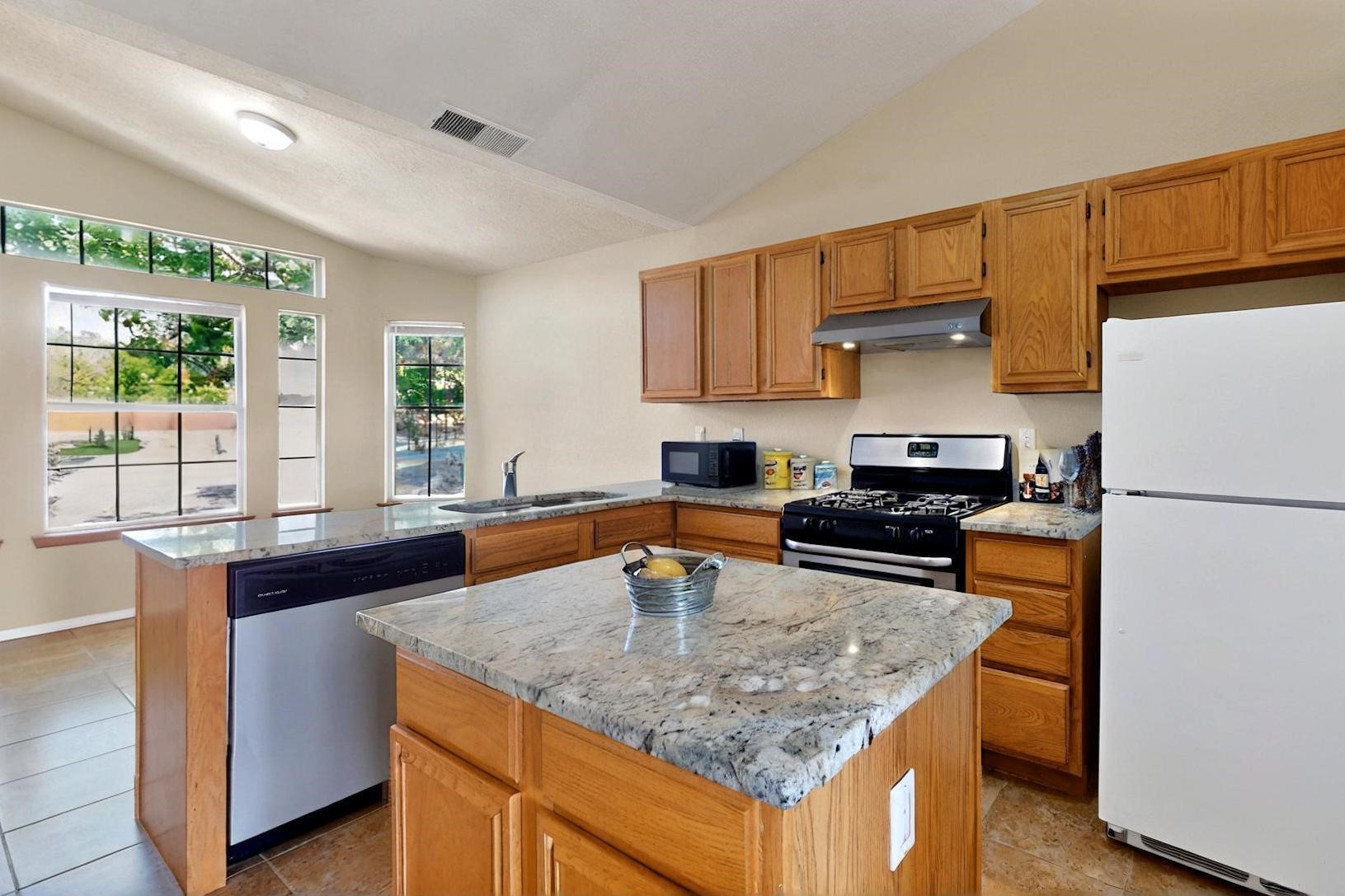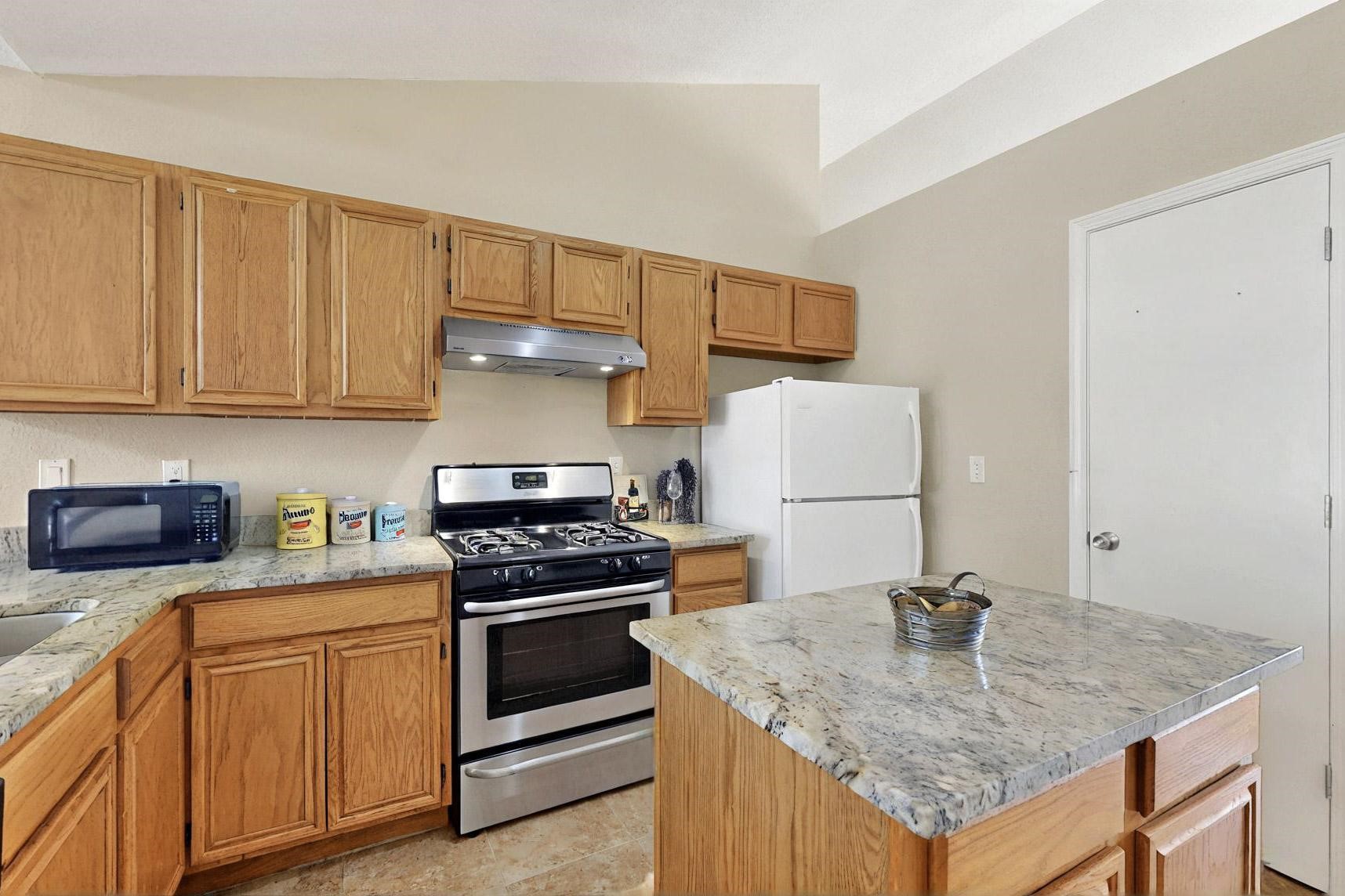 Cute, clean, and affordable! Nestled at the end of a peaceful cul-de-sac with privacy buffers on two sides. This adorable 3-bedroom, 2-bathroom home sits on a generous -acre lot with backyard access through a large gate. Step inside to find a huge living room with a gas log fireplace, vaulted ceilings, and windows that flood the space with natural light. The eat-in kitchen features granite countertops, ceramic tile flooring, a stainless-steel range and dishwasher, and plenty of space to gather. Retreat to your private master suite with a walk-in closet, double vanity, and an oversized shower--a perfect escape after a long day. Enjoy outdoor living with a beautiful shade tree in the front yard and a privacy-fenced backyard complete with a covered patio ideal for summer barbecues and a shed that conveys with the home. So much room, so much potential!
