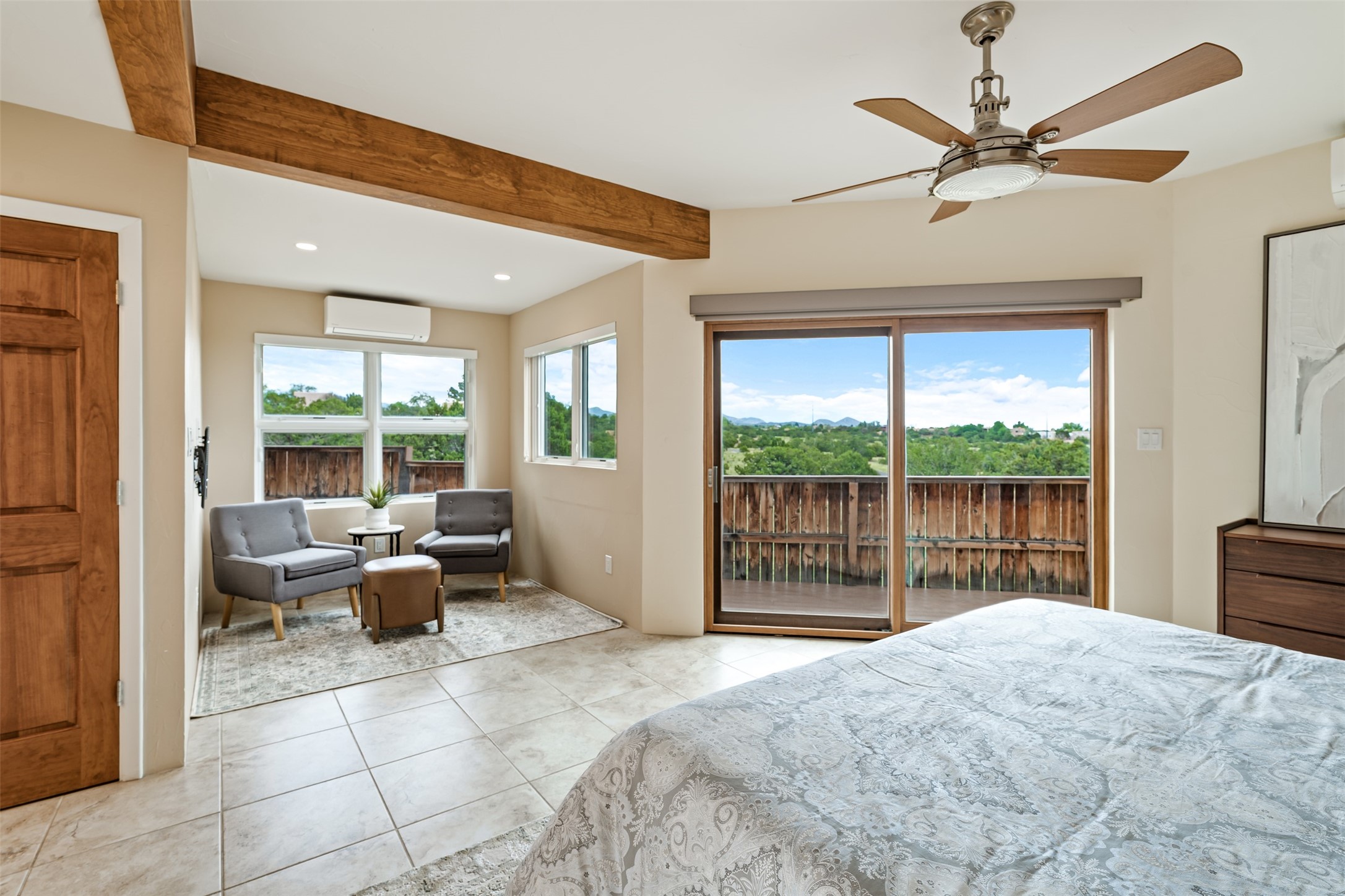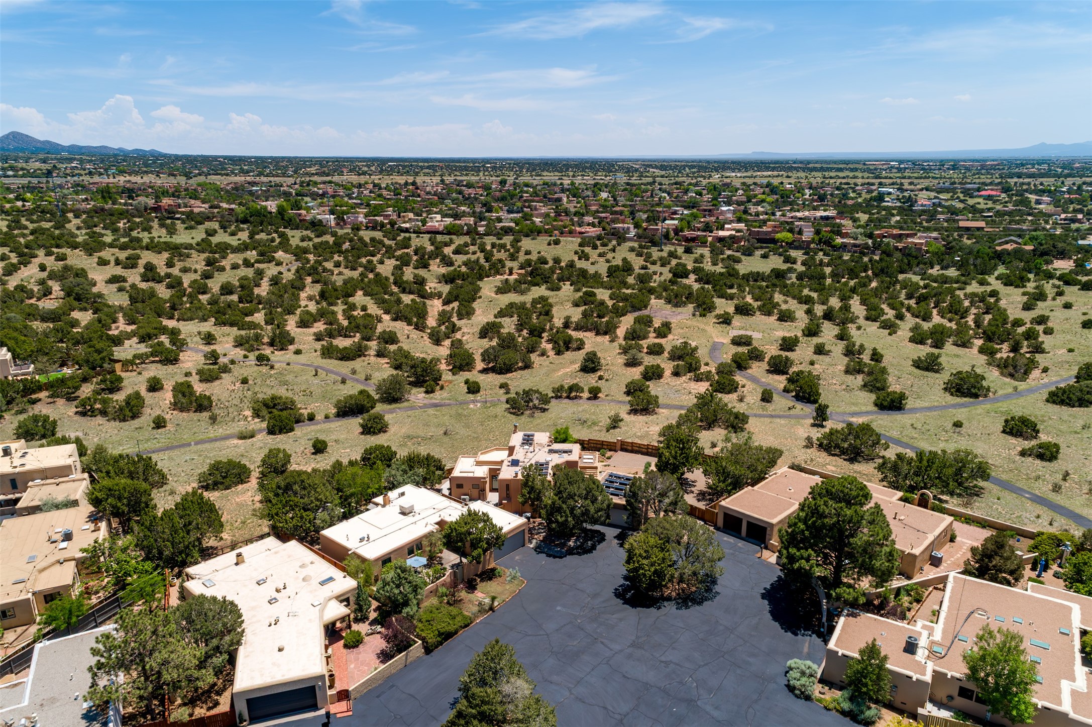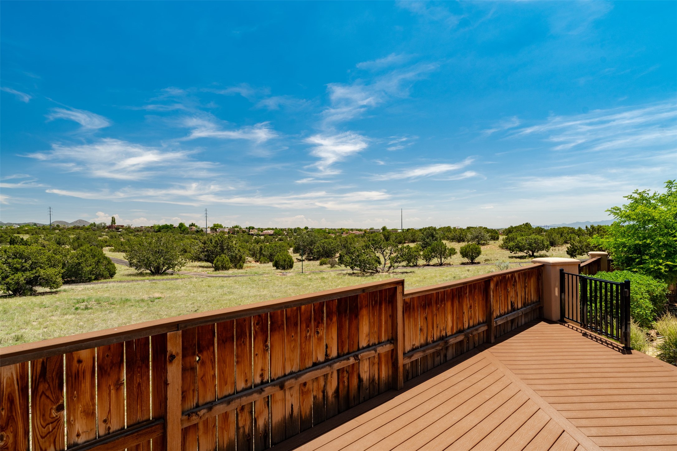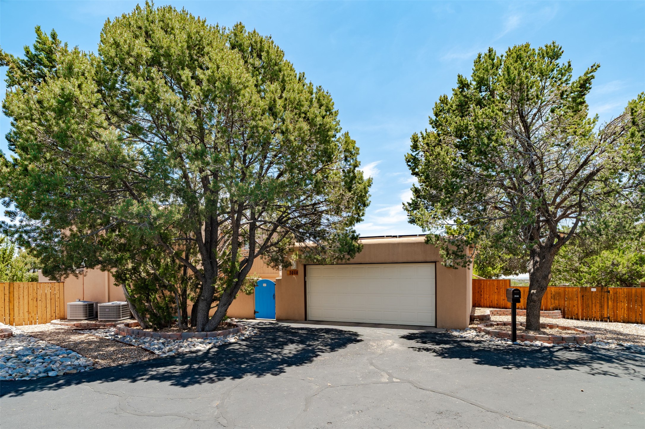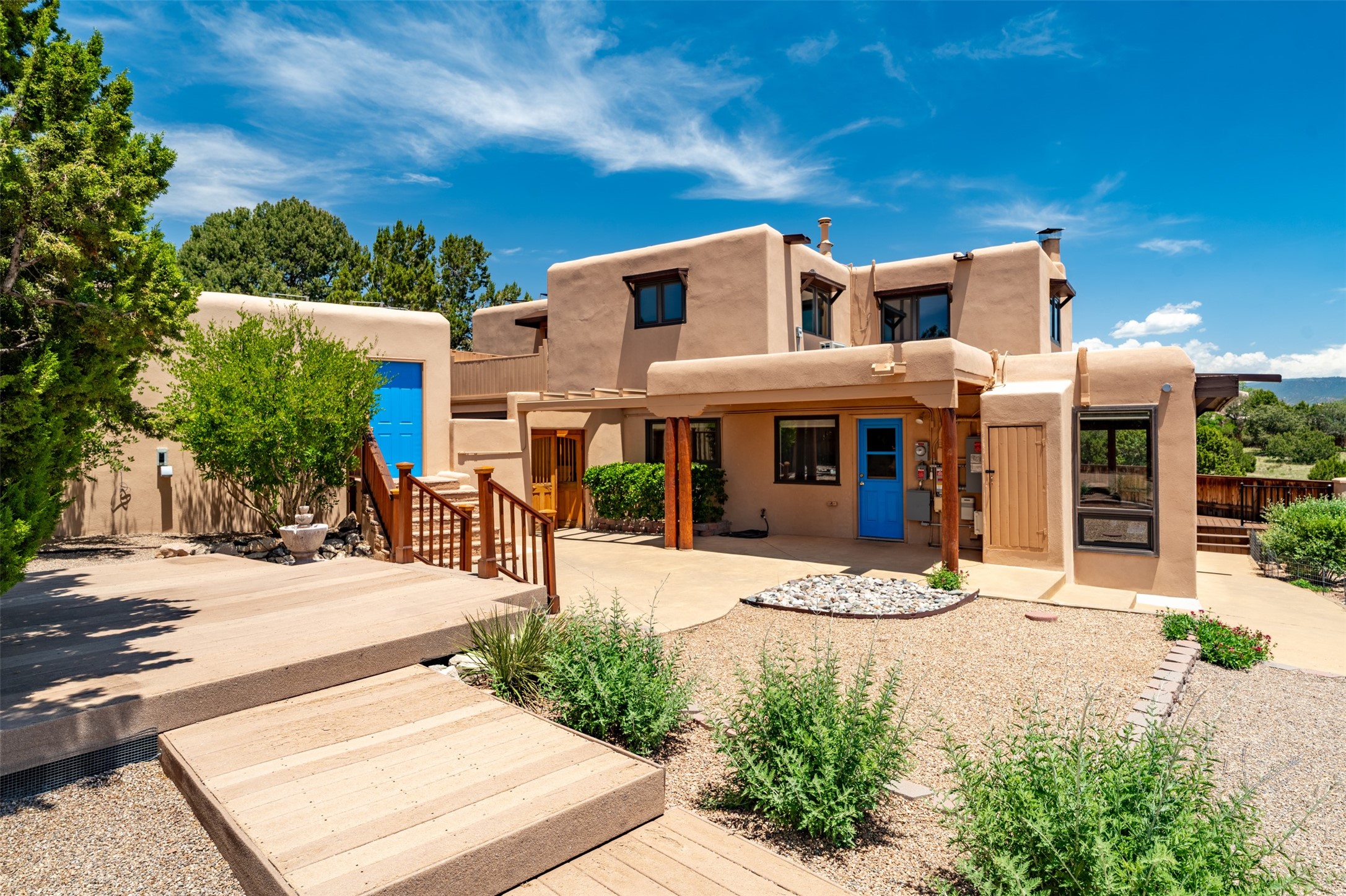 Nestled amid sweeping views and exquisite natural surroundings, this remarkable 4-bedroom, two story, home is a serene and sustainable retreat with a perfect blend of comfort, character, and eco-conscious upgrades. The luxurious, newer (2020) 600 sq ft primary suite on the main floor offers privacy and indulgence, complete with its own mini-split system, a spa-like bathroom, and direct access to outdoor living spaces. Three additional bedrooms are upstairs, where a sunny second-floor deck invites morning coffee or sunset unwinding.Skylights throughout the home bathe the interiors in natural light, highlighting thoughtful details like American clay walls, wood-beamed ceilings, and not one, but two fireplaces--including a charming corner Kiva in the dining room and a striking centerpiece hearth in the living room with a cozy built-in window seat.The bright, eat-in kitchen is a delight with newer appliances, abundant cabinetry, a classic white subway tile backsplash, and views that inspire. Comfort is ensured year-round with two-zone HVAC, refrigerated A/C, mini-splits, and tankless hot water in both upstairs baths.Outside, this home continues to impress with lush xeriscaping, a fenced garden area, and a fully fenced yard. A detached two-car garage includes an extra storage room, while multiple portals and decks provide ideal spots for dining, relaxing, or stargazing. Eco-conscious buyers will appreciate the complete solar electric system and 900-gallon rainwater catchment.This home is a rare find--where views, design, and sustainability come together in perfect harmony.This home is tucked away at the end of a cul-de-sac, with acres of open space and walking trails behind the house. Park Plazas has 8-9 miles of hiking trails, tennis courts, a community garden and is an oasis in the center of Santa Fe close to restaurants, shopping and other amenities, Don't miss this spectacular home in this wonderful neighborhood.