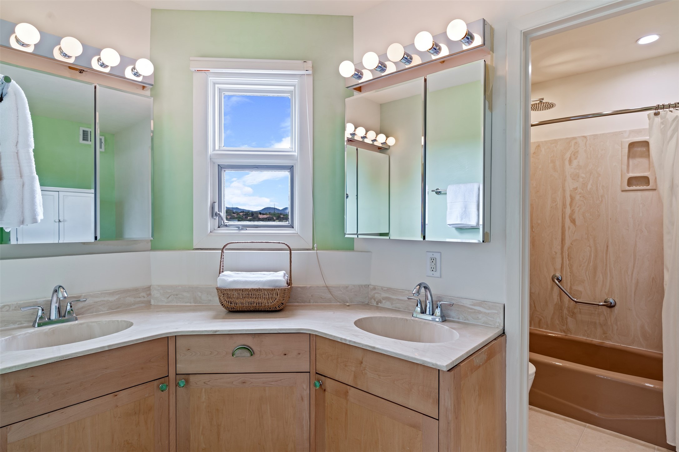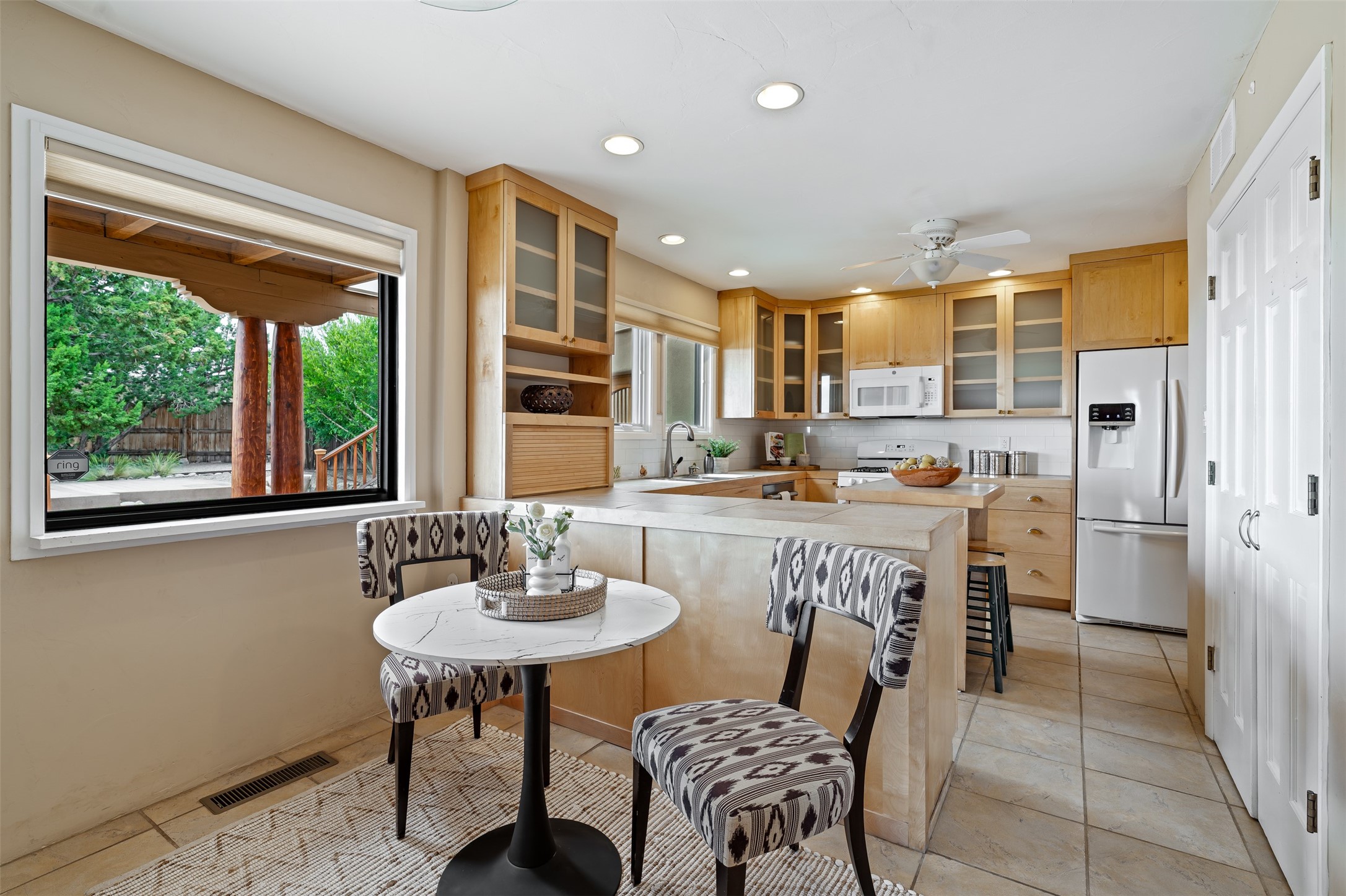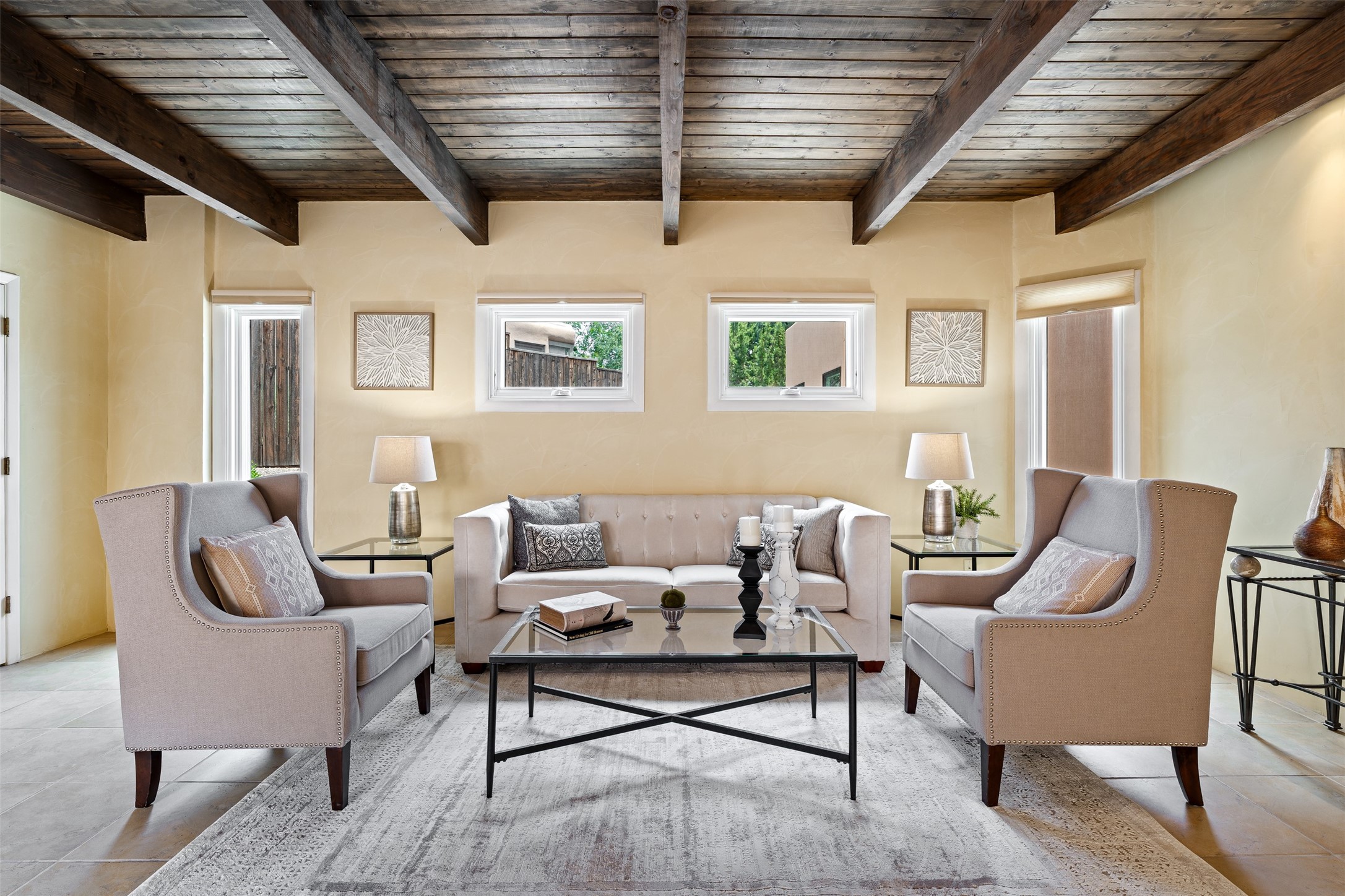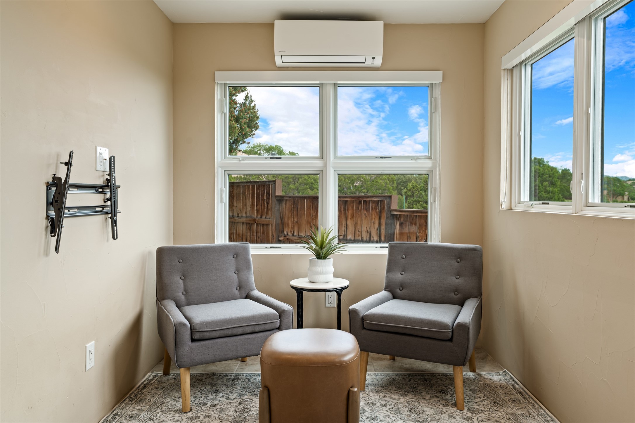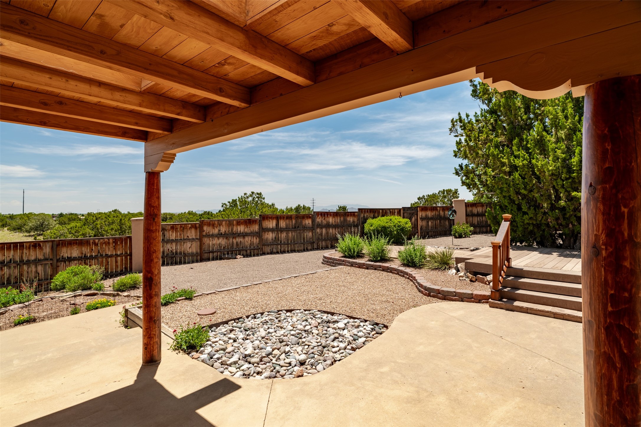 Nestled amid sweeping views and exquisite natural surroundings, this remarkable 4-bedroom, two story, home is a serene and sustainable retreat with a perfect blend of comfort, character, and eco-conscious upgrades. The luxurious, newer (2020) 600 sq ft primary suite on the main floor offers privacy and indulgence, complete with its own mini-split system, a spa-like bathroom, and direct access to outdoor living spaces. Three additional bedrooms are upstairs, where a sunny second-floor deck invites morning coffee or sunset unwinding.Skylights throughout the home bathe the interiors in natural light, highlighting thoughtful details like American clay walls, wood-beamed ceilings, and not one, but two fireplaces--including a charming corner Kiva in the dining room and a striking centerpiece hearth in the living room with a cozy built-in window seat.The bright, eat-in kitchen is a delight with newer appliances, abundant cabinetry, a classic white subway tile backsplash, and views that inspire. Comfort is ensured year-round with two-zone HVAC, refrigerated A/C, mini-splits, and tankless hot water in both upstairs baths.Outside, this home continues to impress with lush xeriscaping, a fenced garden area, and a fully fenced yard. A detached two-car garage includes an extra storage room, while multiple portals and decks provide ideal spots for dining, relaxing, or stargazing. Eco-conscious buyers will appreciate the complete solar electric system and 900-gallon rainwater catchment.This home is a rare find--where views, design, and sustainability come together in perfect harmony.This home is tucked away at the end of a cul-de-sac, with acres of open space and walking trails behind the house. Park Plazas has 8-9 miles of hiking trails, tennis courts, a community garden and is an oasis in the center of Santa Fe close to restaurants, shopping and other amenities, Don't miss this spectacular home in this wonderful neighborhood.