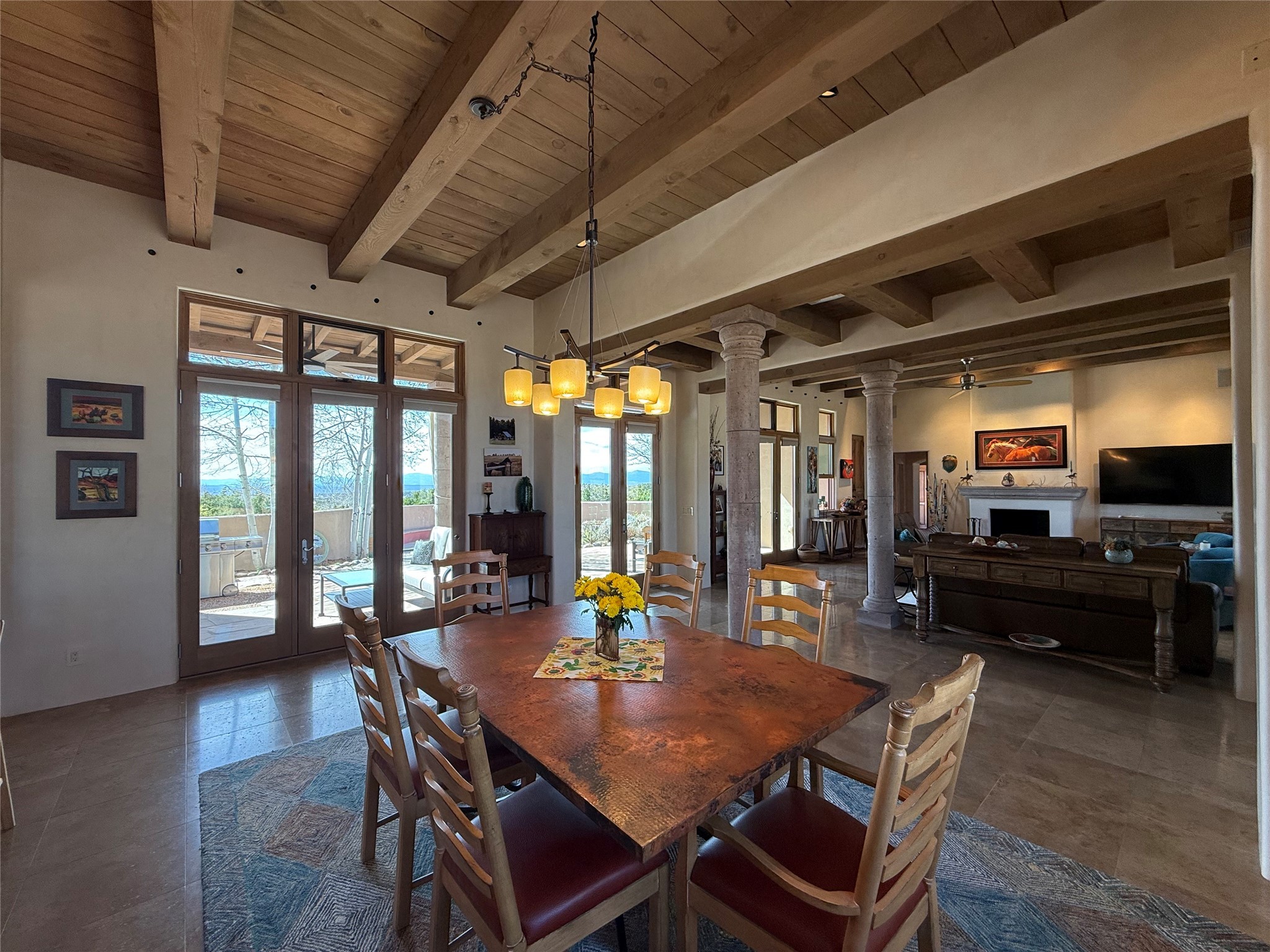 Along a private, quiet road in desirable NW Santa Fe, only minutes from downtown, don't miss the huge entertaining spaces with drop dead gorgeous 180 degree sunset views! Home features a well equipped, open kitchen with plenty of space. Gorgeous custom travertine tilework, an awesome built-in sound system, and extensive landscaping. Design offers privacy in the bedroom areas and togetherness in the large open family spaces. Spacious Master Suite with kiva fireplace, large walk-in closet, private portal,and a fabulous spa bath. Tall french doors across the back of the home bring the outdoors in. Backyard features a walled rear courtyard, built-in outdoor seating, and incredible landscaping. Built in 2006 and sited on 2.5 acres adjoining the extensive trail system of NW Santa Fe, this home is the perfect place to get away and enjoy world famous Santa Fe sunsets!