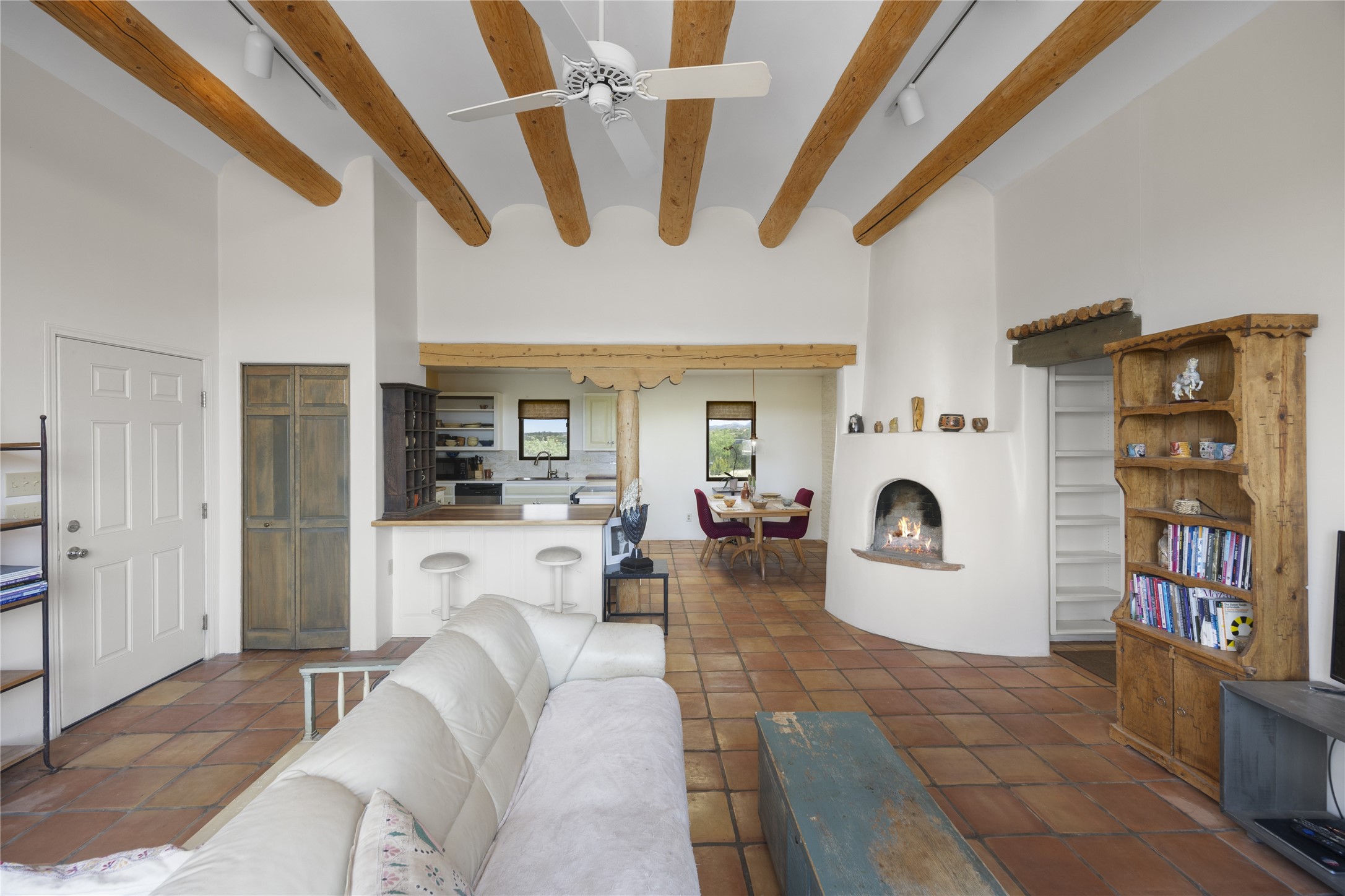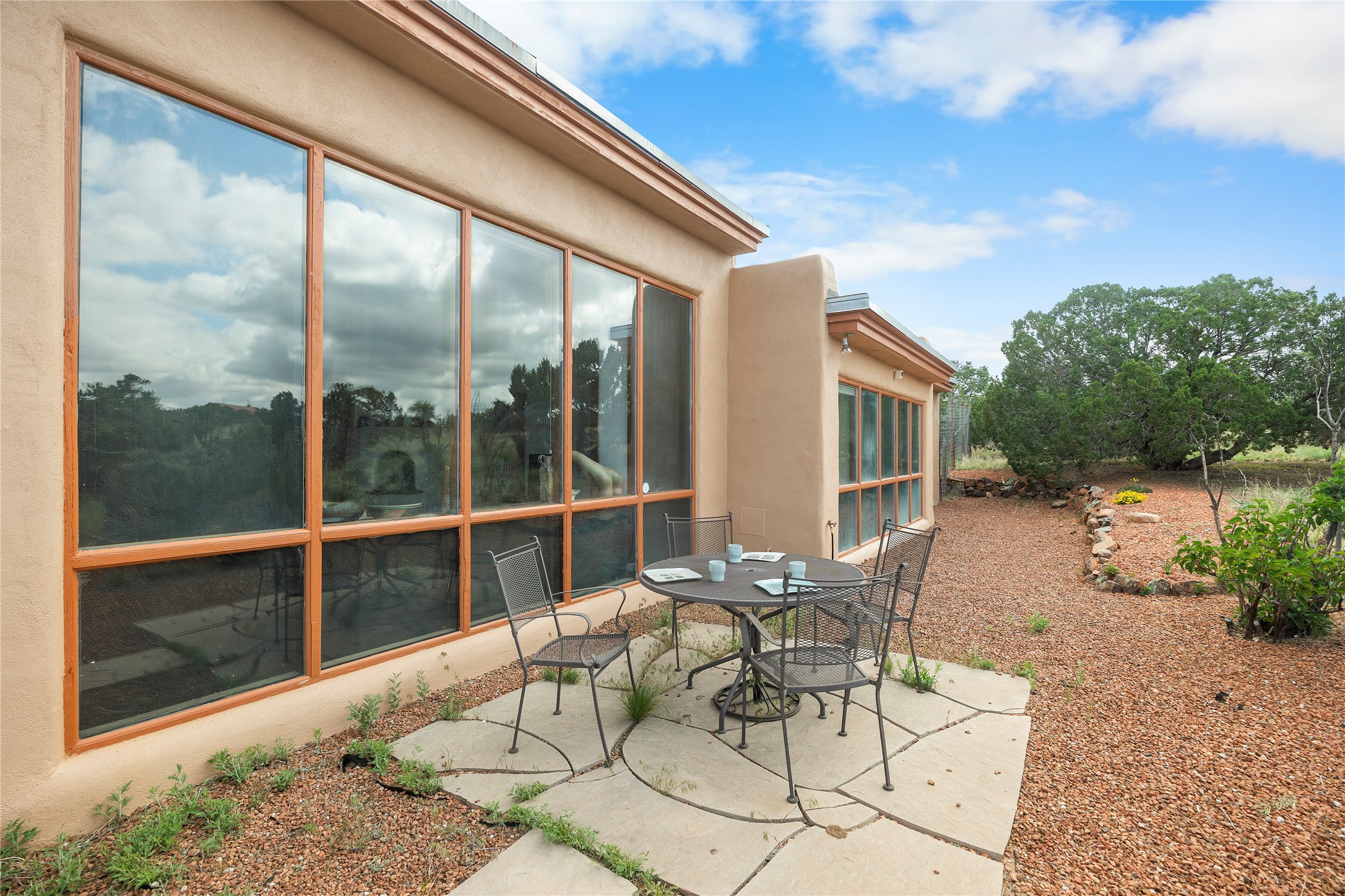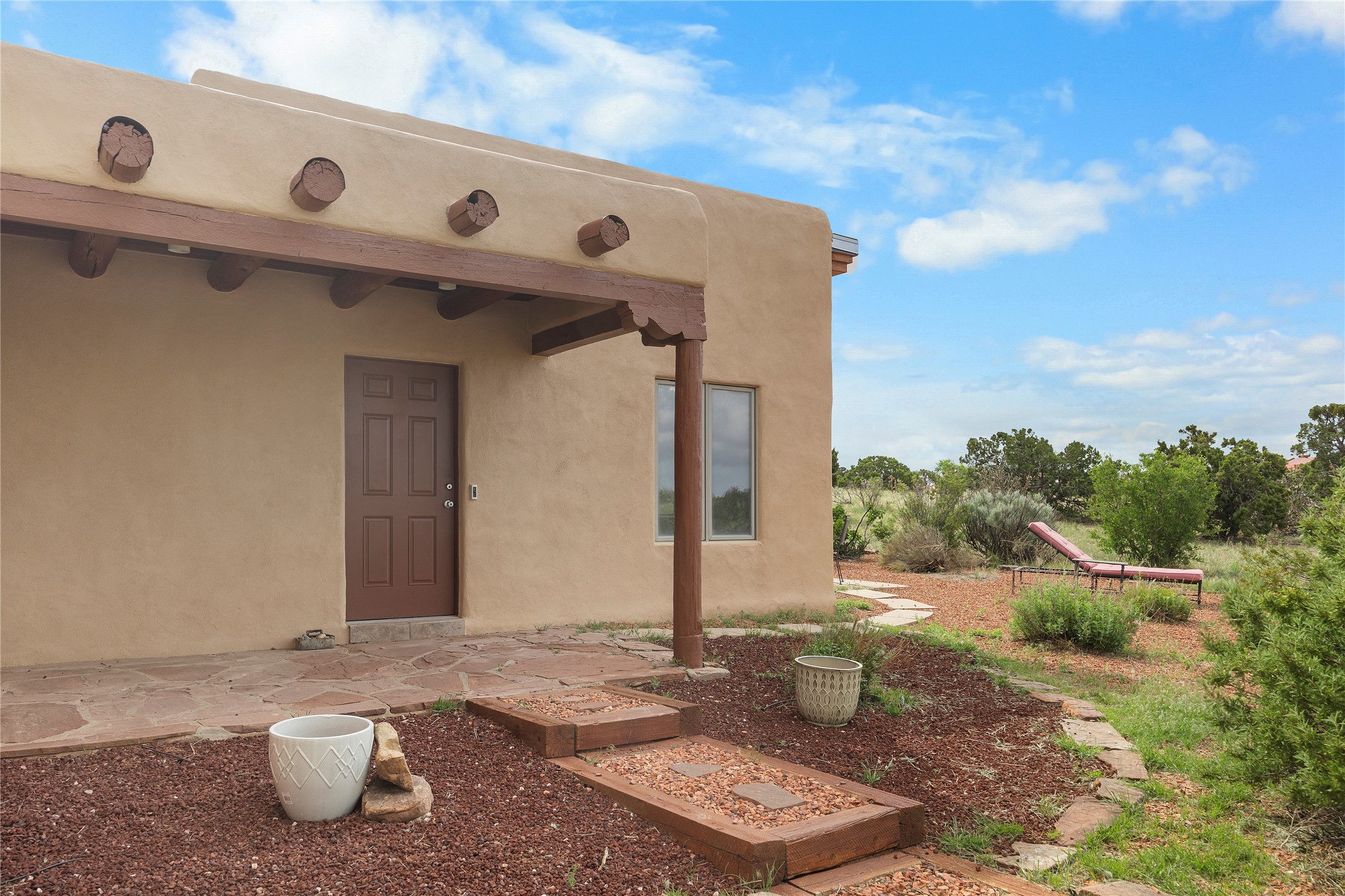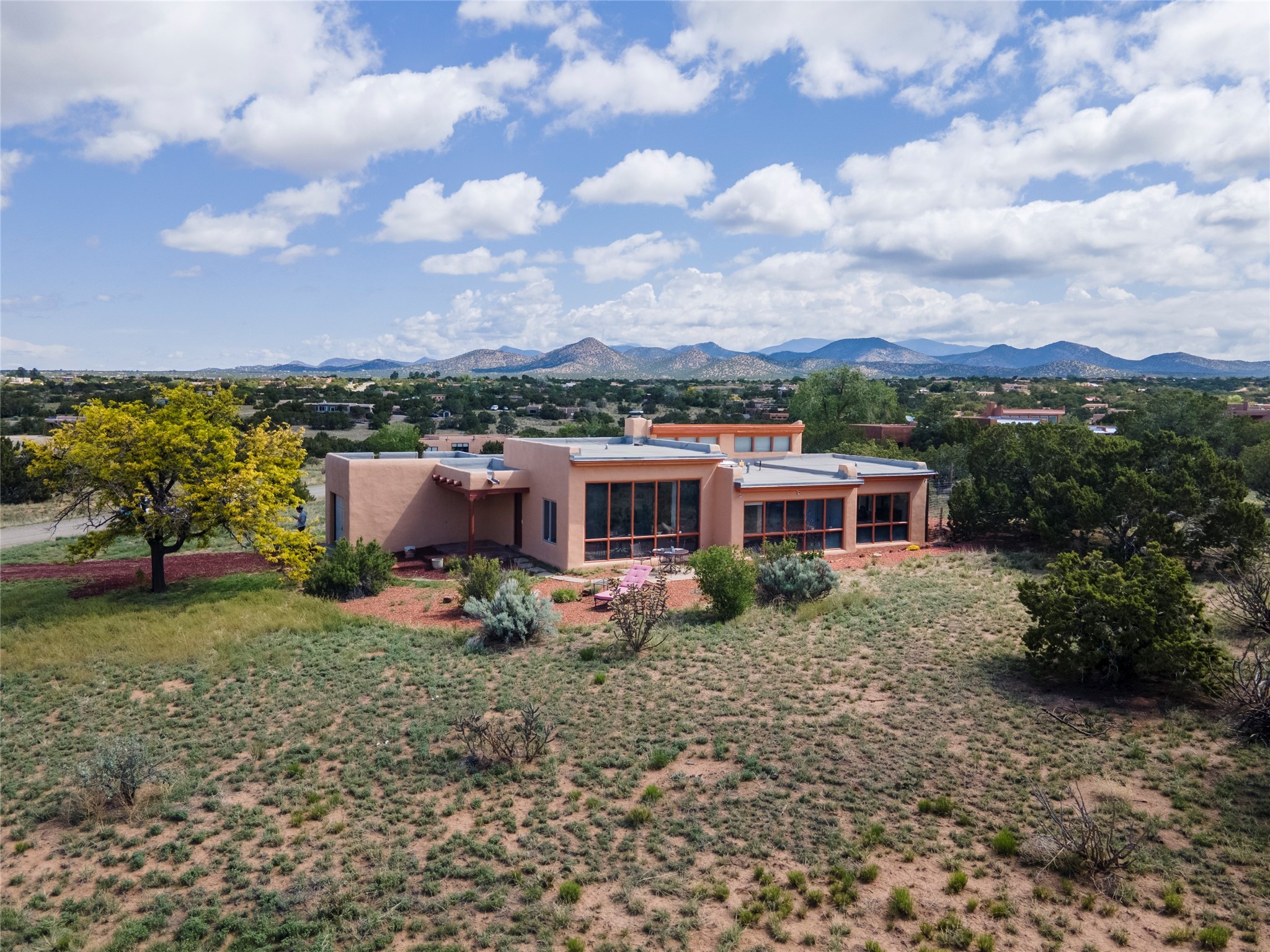 Enjoy the natural beauty of Eldorado, especially its glorious mountain views, from this well built, well designed passive solar gem, on an expansive corner lot. Built by Aram Farber of Adobeworks, the home offers peace and serenity as you enter its spacious Living Room with its light, airy feeling. Enjoy Southwest authenticity and charm from warm saltillo tile flooring, a commanding kiva, beautiful, high tongue and groove ceilings and various wooden accents. Its dining room has a lovely new accent wall, and the kitchen has been upgraded with quartz and butcher block counters and a new stove and dishwasher. You'll find well sized bedrooms and bathrooms that flow nicely from the public spaces. Seller added a fenced area for pets and has repainted the stucco and exterior trim, plus adding new flooring to all bedrooms. Here you'll find a sweet sanctuary to savor a wonderful Santa Fe lifestyle.