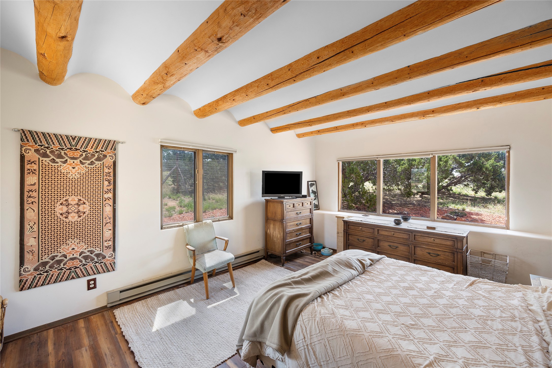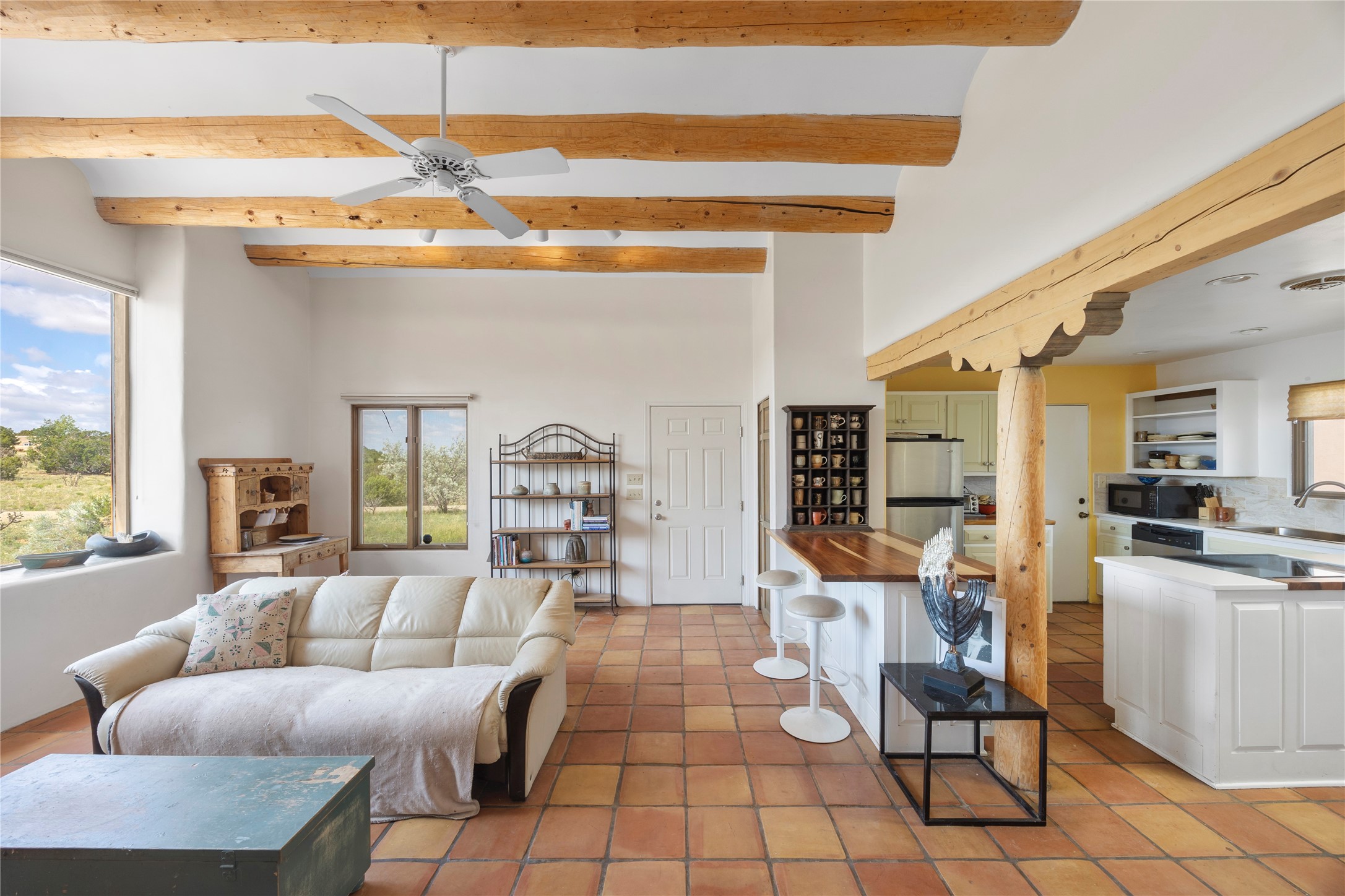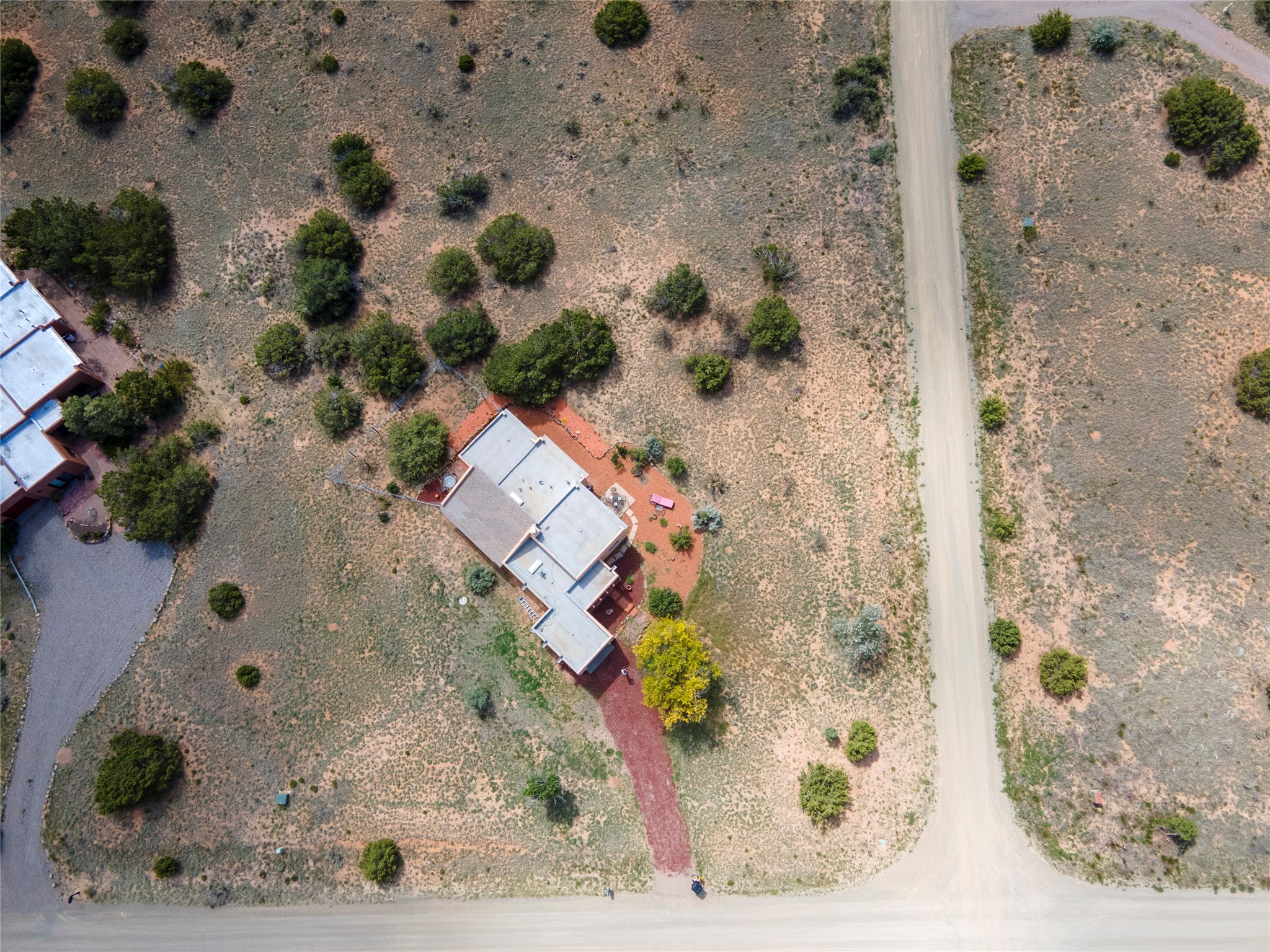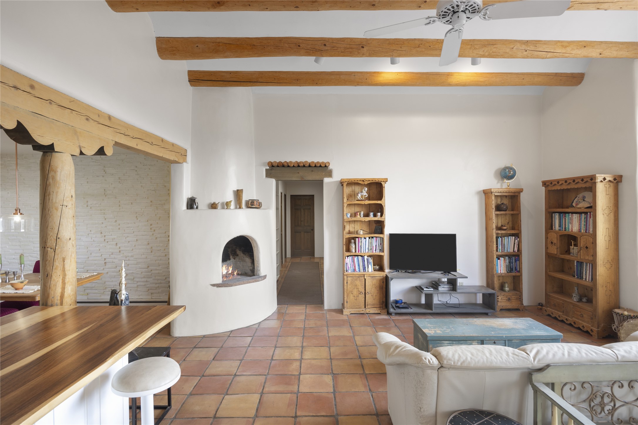 Enjoy the natural beauty of Eldorado, especially its glorious mountain views, from this well built, well designed passive solar gem, on an expansive corner lot. Built by Aram Farber of Adobeworks, the home offers peace and serenity as you enter its spacious Living Room with its light, airy feeling. Enjoy Southwest authenticity and charm from warm saltillo tile flooring, a commanding kiva, beautiful, high tongue and groove ceilings and various wooden accents. Its dining room has a lovely new accent wall, and the kitchen has been upgraded with quartz and butcher block counters and a new stove and dishwasher. You'll find well sized bedrooms and bathrooms that flow nicely from the public spaces. Seller added a fenced area for pets and has repainted the stucco and exterior trim, plus adding new flooring to all bedrooms. Here you'll find a sweet sanctuary to savor a wonderful Santa Fe lifestyle.