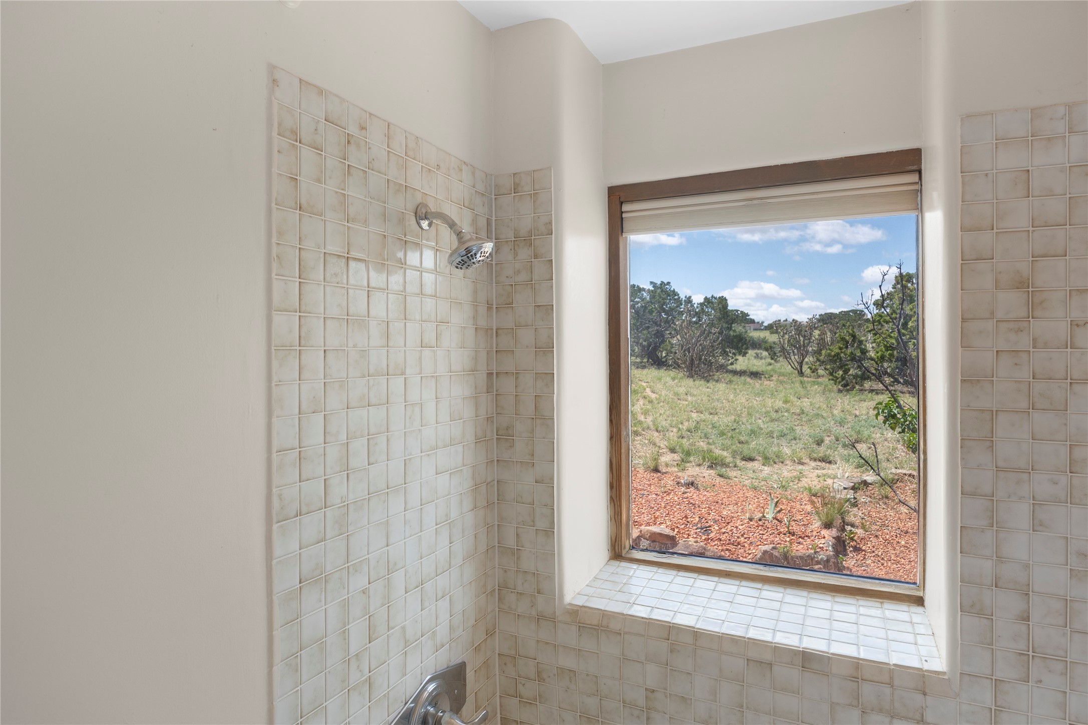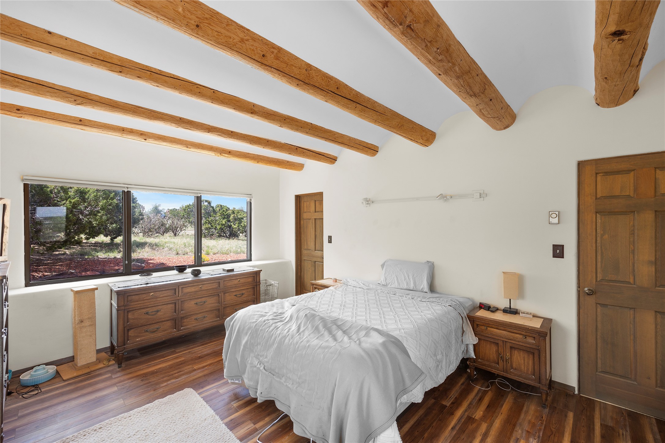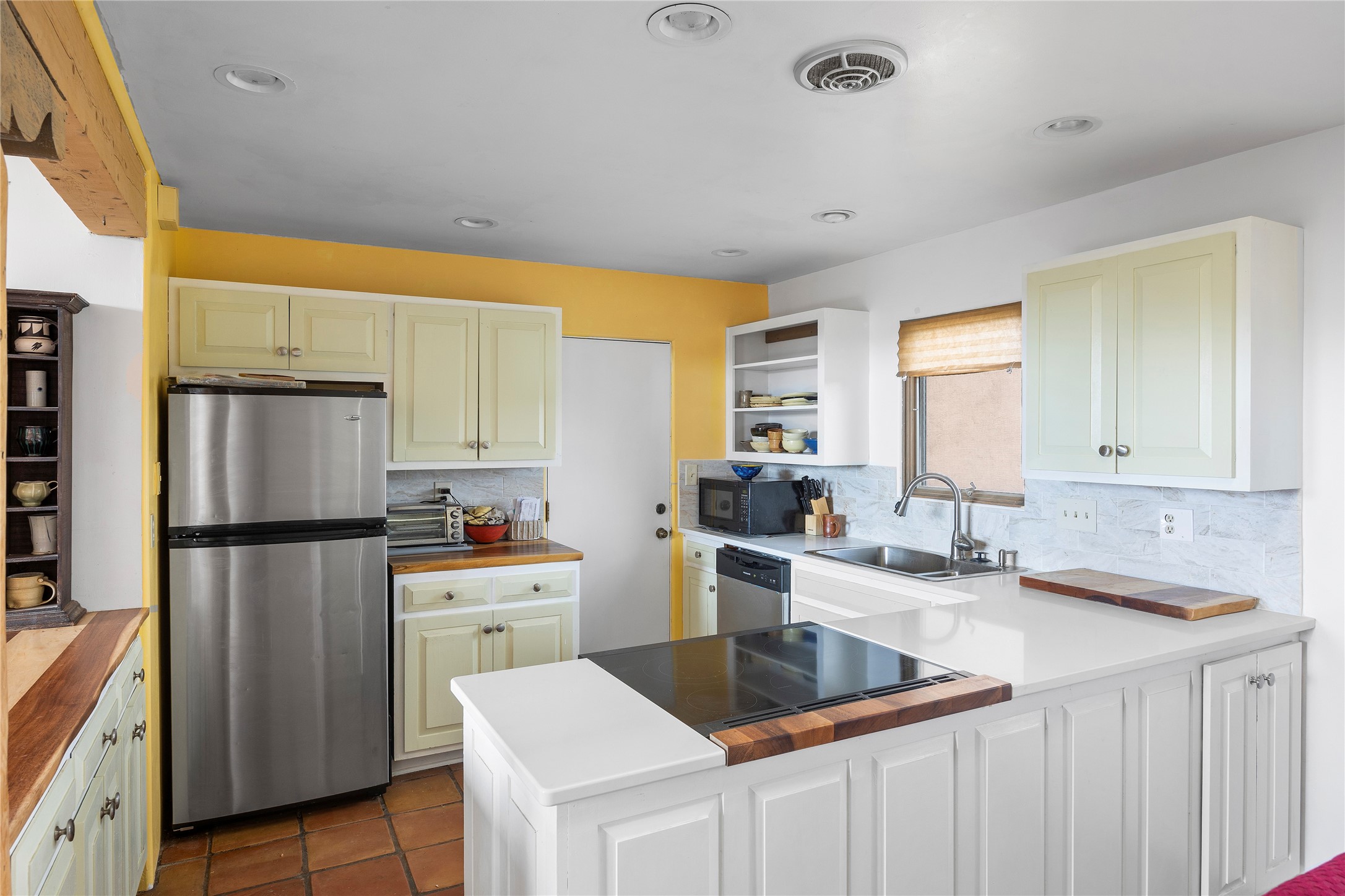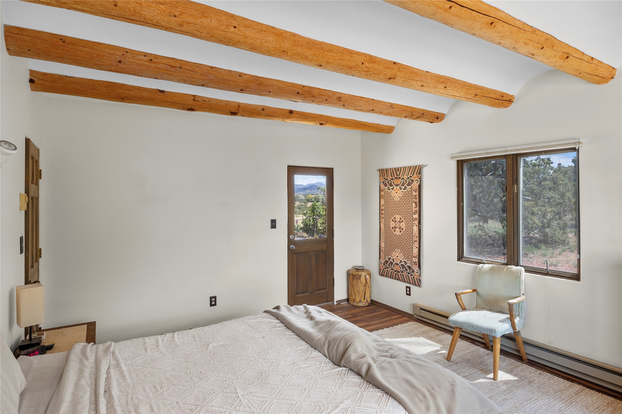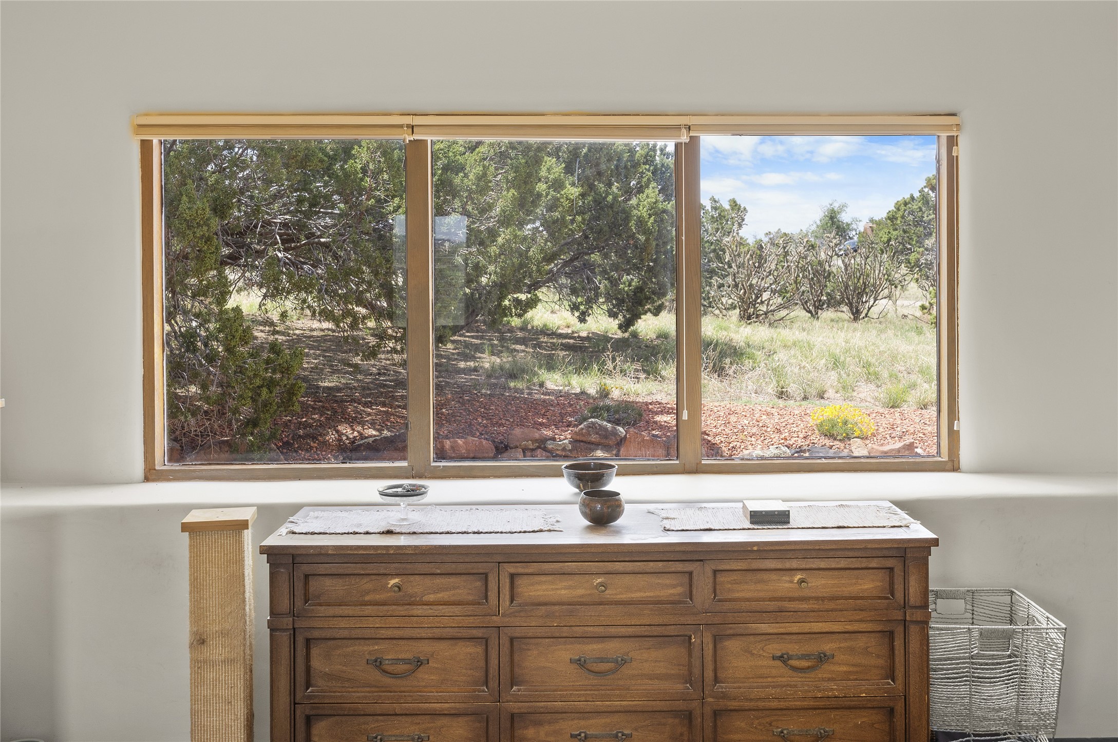 Enjoy the natural beauty of Eldorado, especially its glorious mountain views, from this well built, well designed passive solar gem, on an expansive corner lot. Built by Aram Farber of Adobeworks, the home offers peace and serenity as you enter its spacious Living Room with its light, airy feeling. Enjoy Southwest authenticity and charm from warm saltillo tile flooring, a commanding kiva, beautiful, high tongue and groove ceilings and various wooden accents. Its dining room has a lovely new accent wall, and the kitchen has been upgraded with quartz and butcher block counters and a new stove and dishwasher. You'll find well sized bedrooms and bathrooms that flow nicely from the public spaces. Seller added a fenced area for pets and has repainted the stucco and exterior trim, plus adding new flooring to all bedrooms. Here you'll find a sweet sanctuary to savor a wonderful Santa Fe lifestyle.