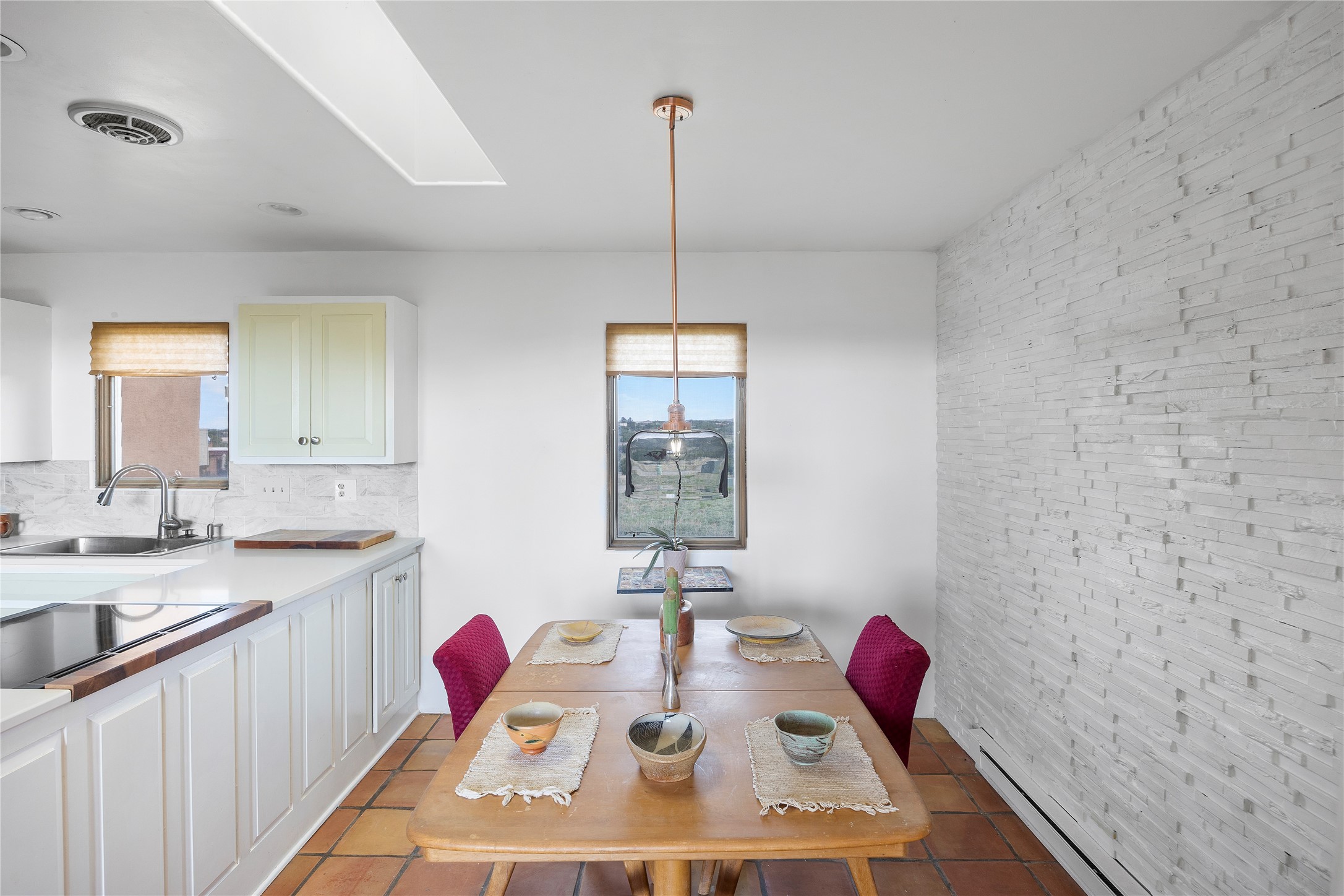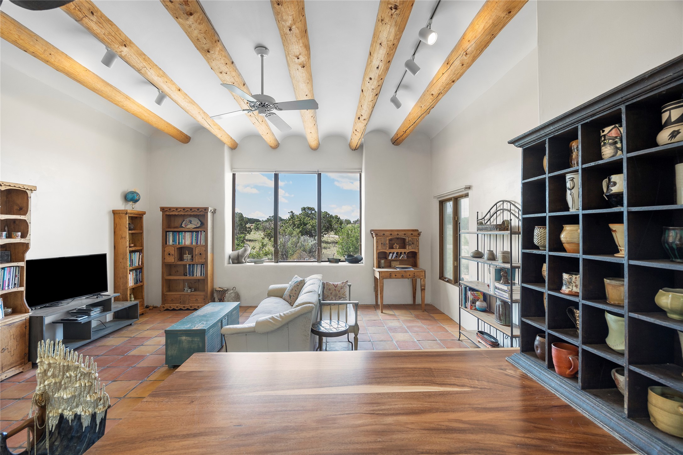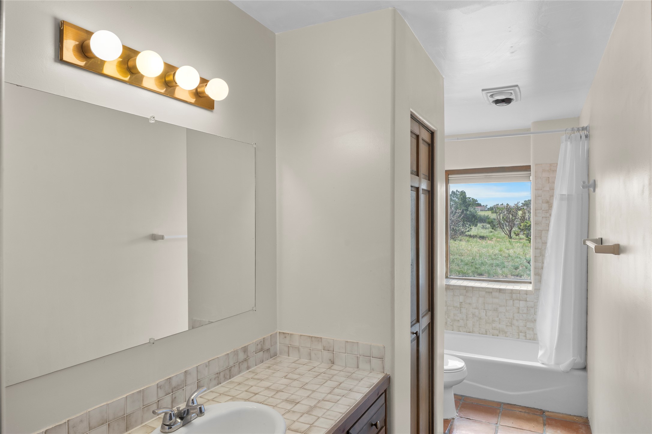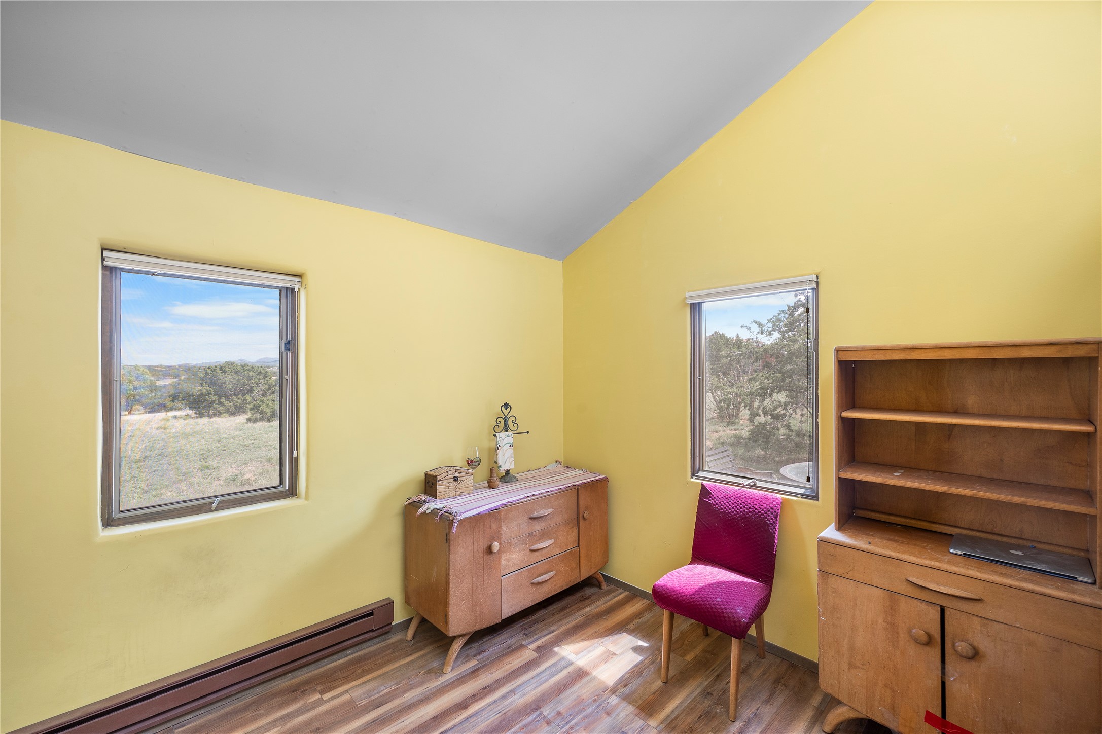 Enjoy the natural beauty of Eldorado, especially its glorious mountain views, from this well built, well designed passive solar gem, on an expansive corner lot. Built by Aram Farber of Adobeworks, the home offers peace and serenity as you enter its spacious Living Room with its light, airy feeling. Enjoy Southwest authenticity and charm from warm saltillo tile flooring, a commanding kiva, beautiful, high tongue and groove ceilings and various wooden accents. Its dining room has a lovely new accent wall, and the kitchen has been upgraded with quartz and butcher block counters and a new stove and dishwasher. You'll find well sized bedrooms and bathrooms that flow nicely from the public spaces. Seller added a fenced area for pets and has repainted the stucco and exterior trim, plus adding new flooring to all bedrooms. Here you'll find a sweet sanctuary to savor a wonderful Santa Fe lifestyle.