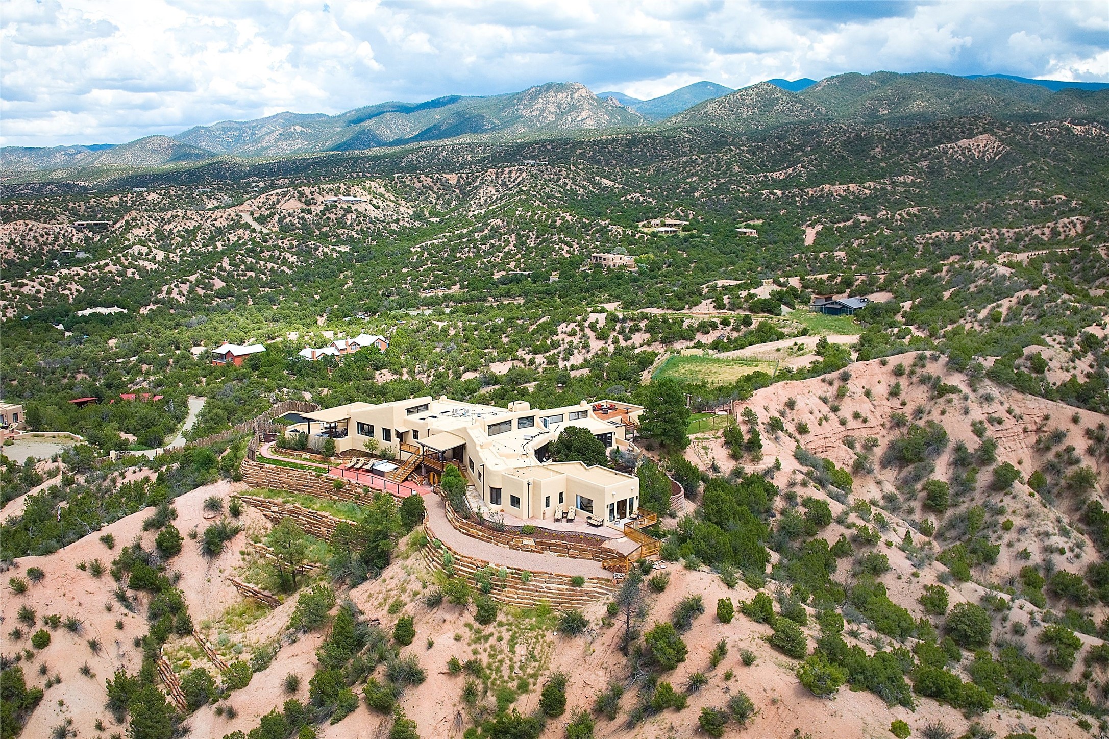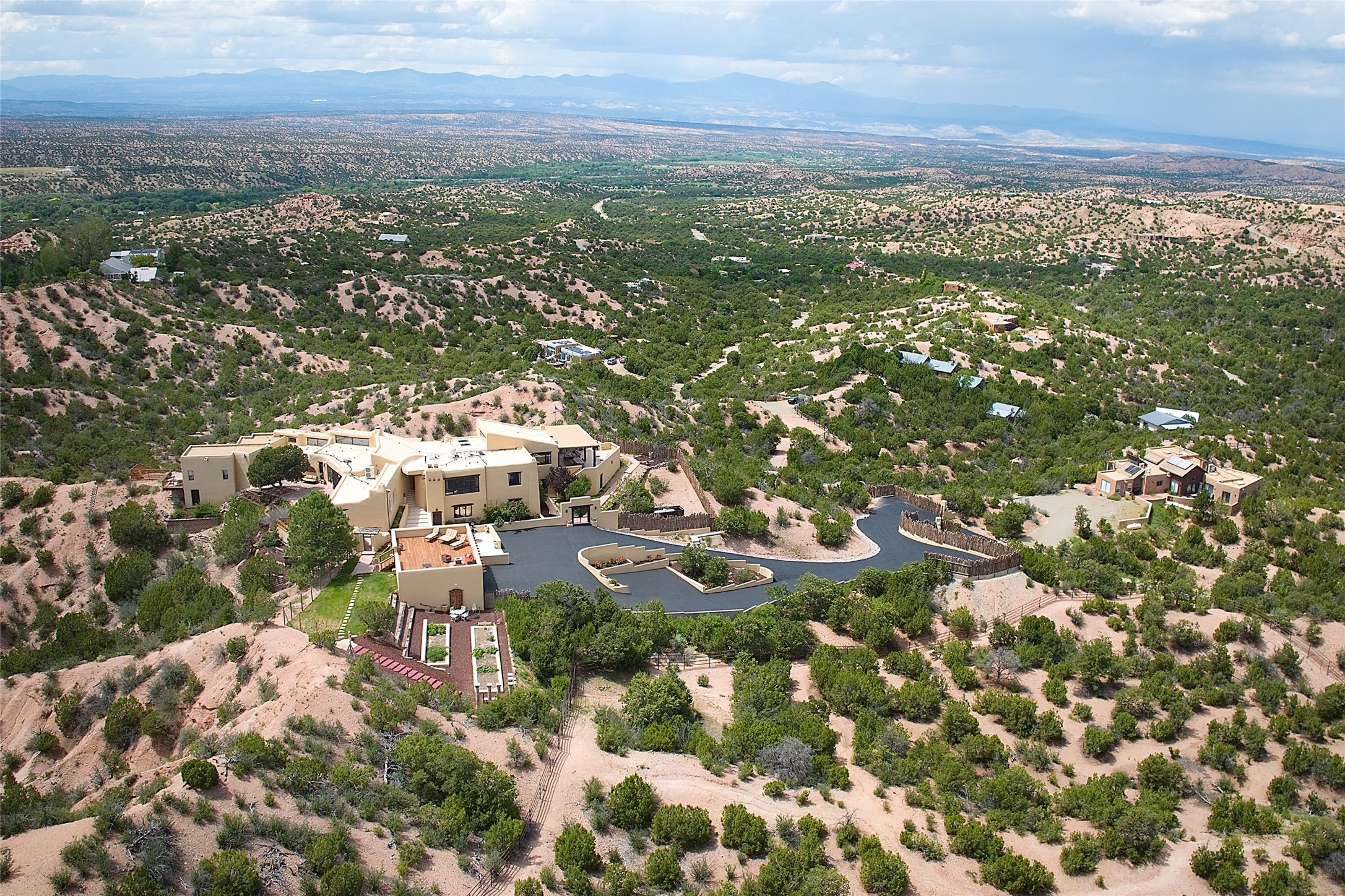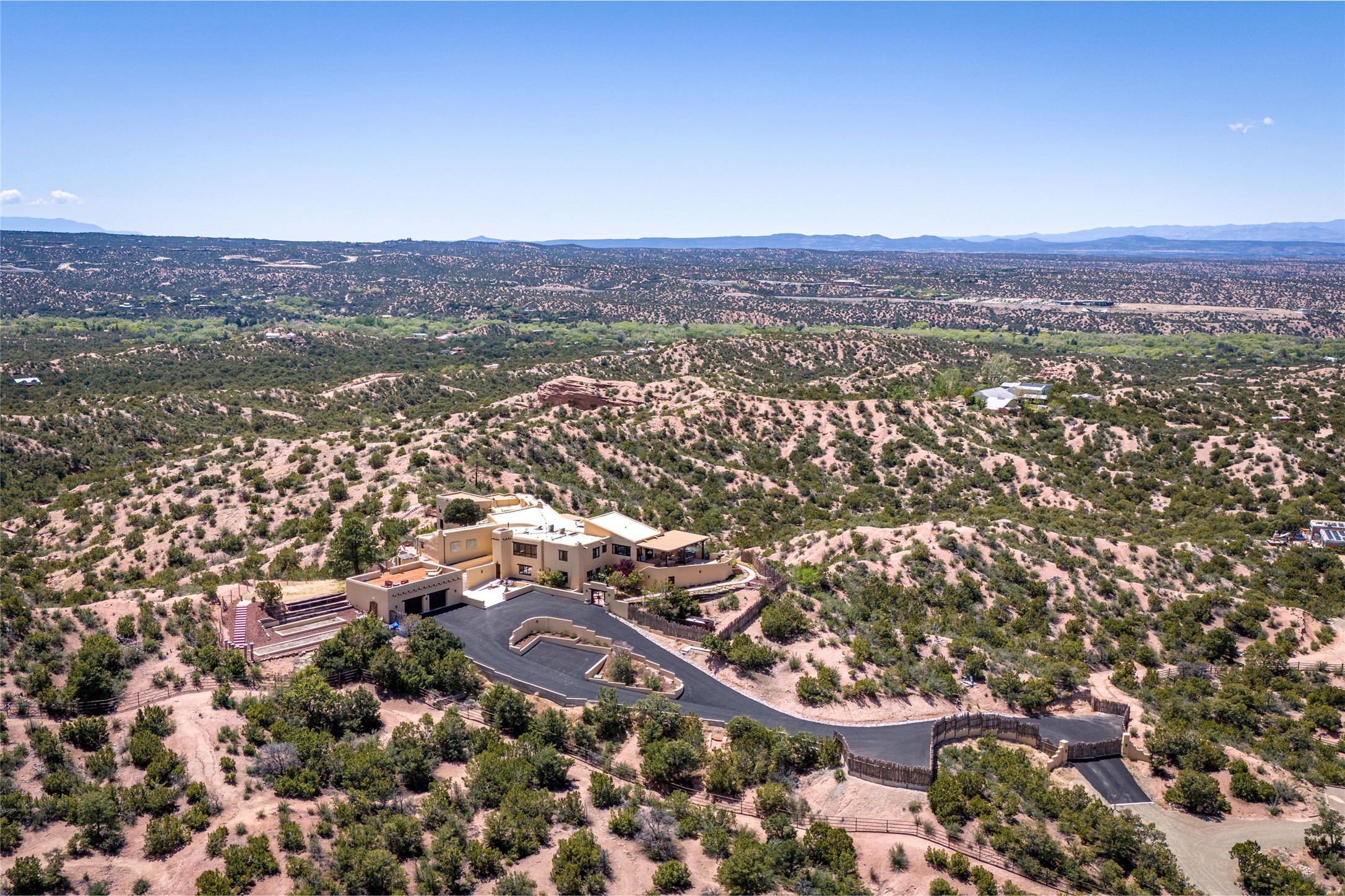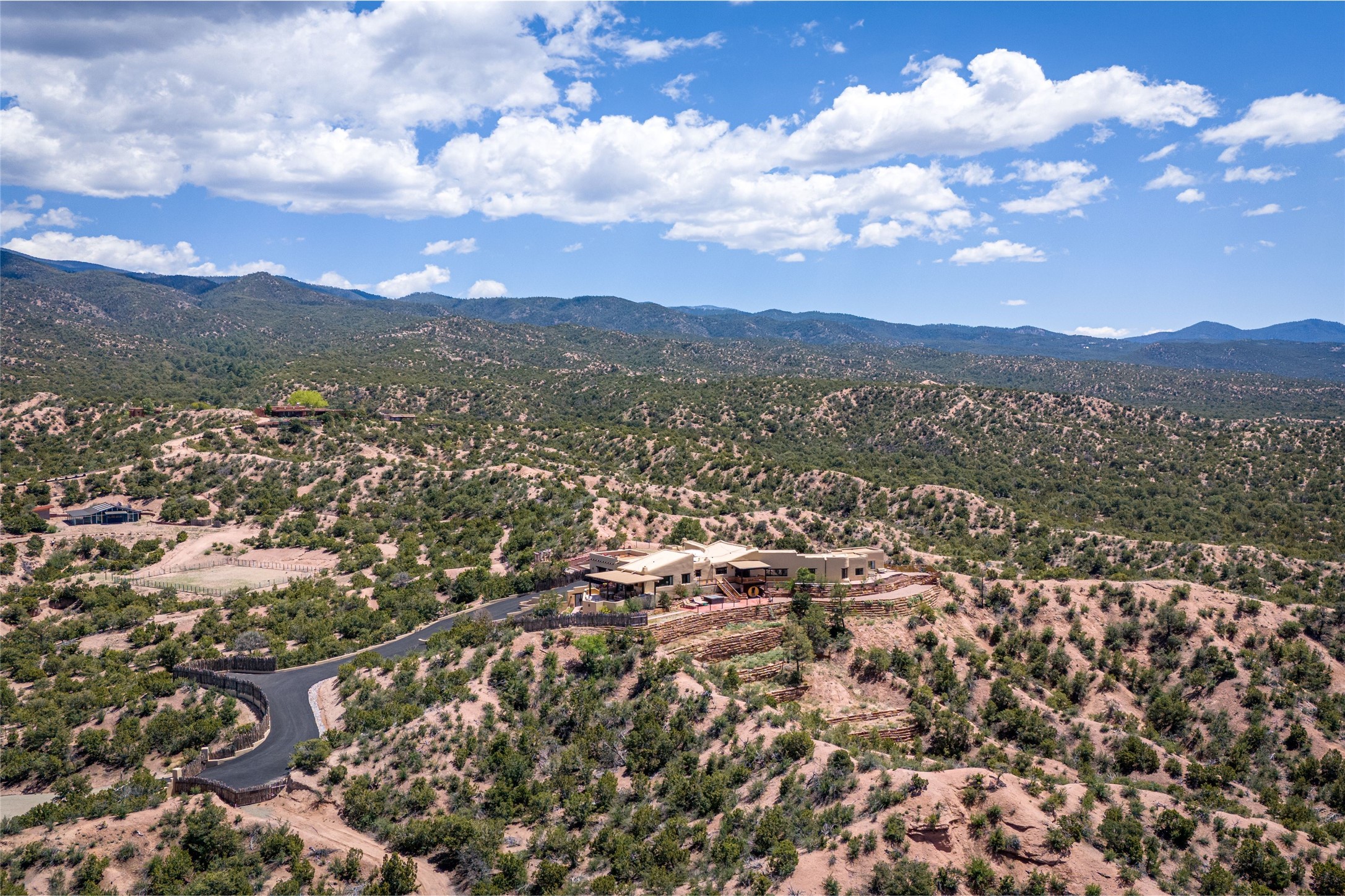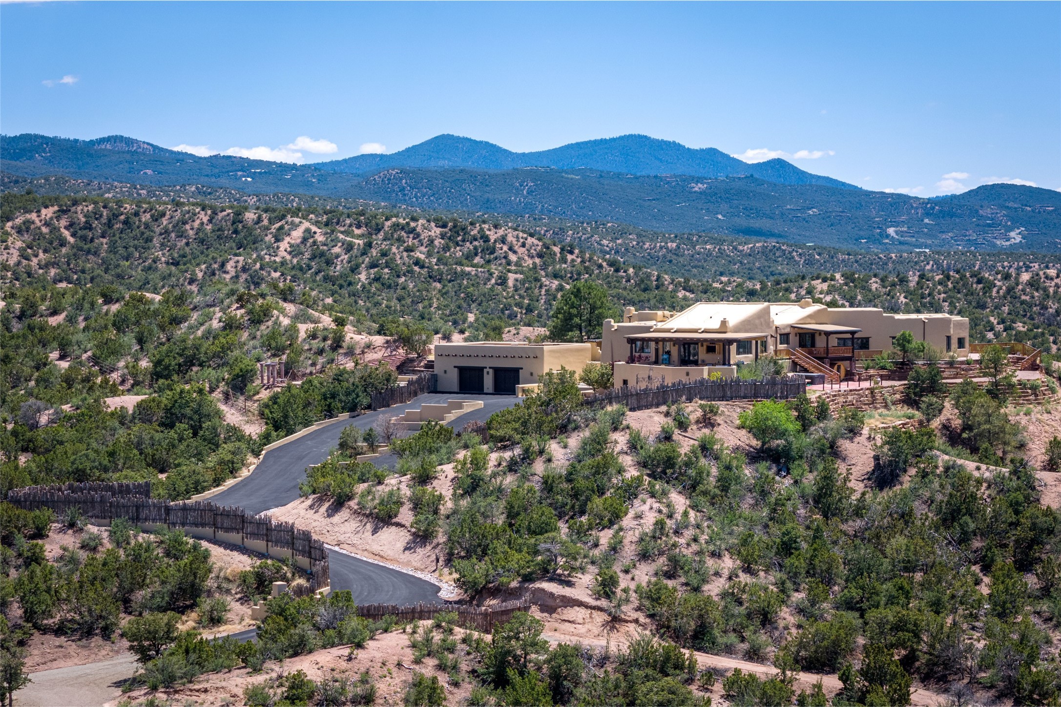 Welcome to this breathtaking 10-acre estate in the prestigious Tesuque community, where luxury meets unparalleled natural beauty. Quite possibly the best views in Tesuque, perched majestically on a private mountaintop, lovingly nicknamed "Top of Tesuque," offering 360-degree panoramic views that make you feel as though you're sitting atop the world. Spanning approximately 6,614 sq ft, this 4-bedroom home is a masterpiece of design and function, featuring many new upgrades for a modern lifestyle. This fully restored and expanded adobe home seamlessly blends classic Santa Fe design with modern upgrades, preserving its timeless charm. This property has a new roof, lighting, stucco. Truly turn-key in every way. Inside, the floor plan seamlessly blends indoor and outdoor living, creating an ideal setting for both relaxation and entertaining, including 6 Kiva Fireplaces as well as 1 wood-burning stove. The brand-new kitchen features handcrafted solid wood cabinetry and top-of-the-line luxury appliances, perfect for any culinary enthusiast, while the adjacent dining and living areas boast spectacular views. The primary bedroom suite includes a separate sitting room, offering a private retreat within the home. Enjoy the convenience of a dedicated office space and den, a media room, as well as a game room complete with a wet bar, perfect for hosting guests. Step outside to the covered portal with outdoor kitchen & TV, complete with matching granite countertops, where you can entertain in style. The outdoor kitchen has all new (never been used) grill, pizza oven and smoker! Terraced gardens also feature a brand-new (never been used) Sauna and Hot Tub. A newly built garage has an observation deck on top. There are new entrance gates for privacy, a new driveway surface, and new additional parking areas ensure privacy and convenience. The addition of an electric lift from ground level to main level of residence also ensures accessibility and ease for loading and unloading. Mexican Porcelain tile terrace at the front entrance welcomes you. There is an enclosed dog park, as well as fully irrigated garden beds surrounding the house. The property is beautifully illuminated with 40 handmade copper light fixtures, adding a timeless touch to the outdoor spaces. With no HOA restrictions, this home offers the freedom and tranquility you've been searching for in the village of Tesuque.