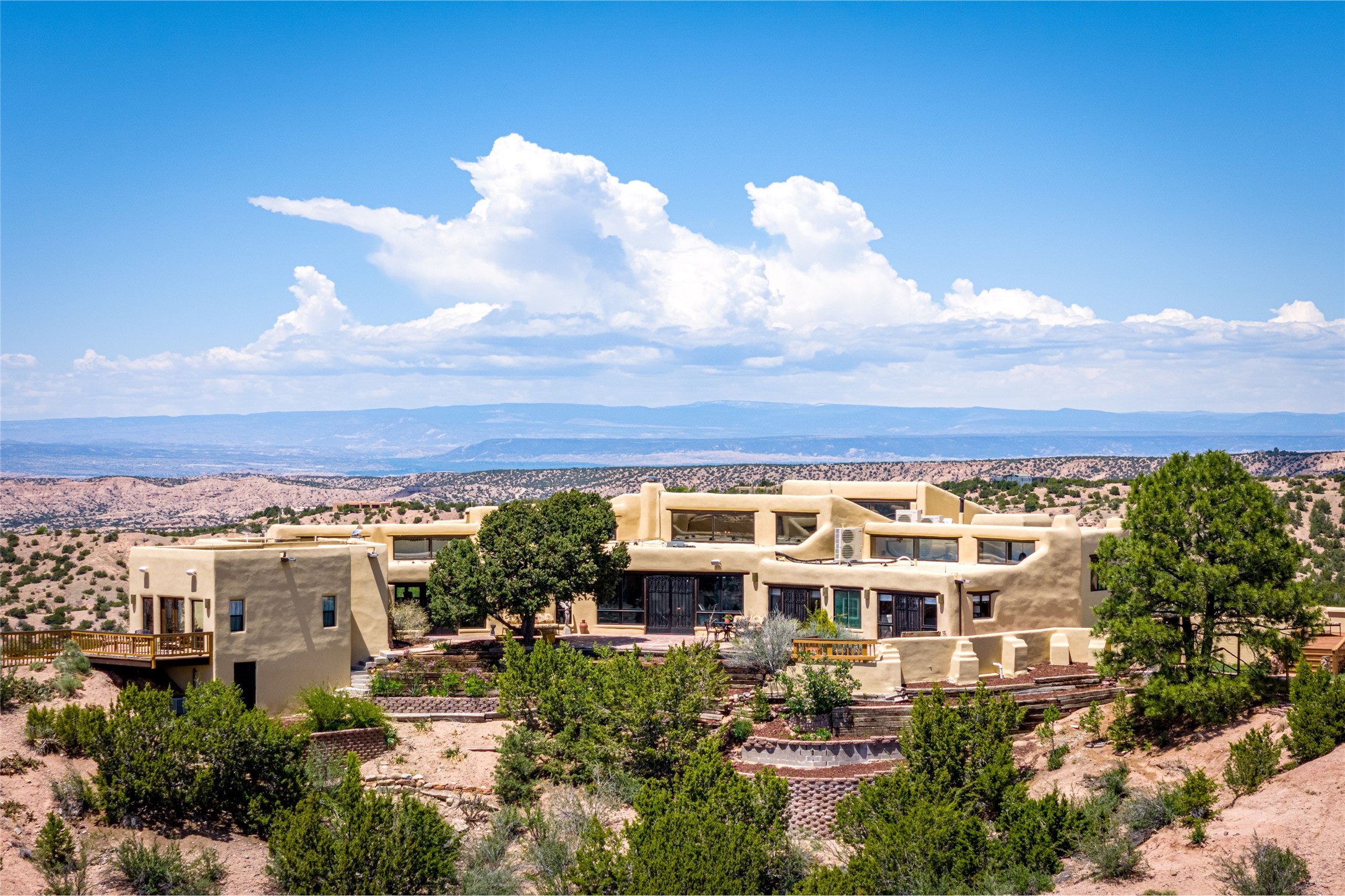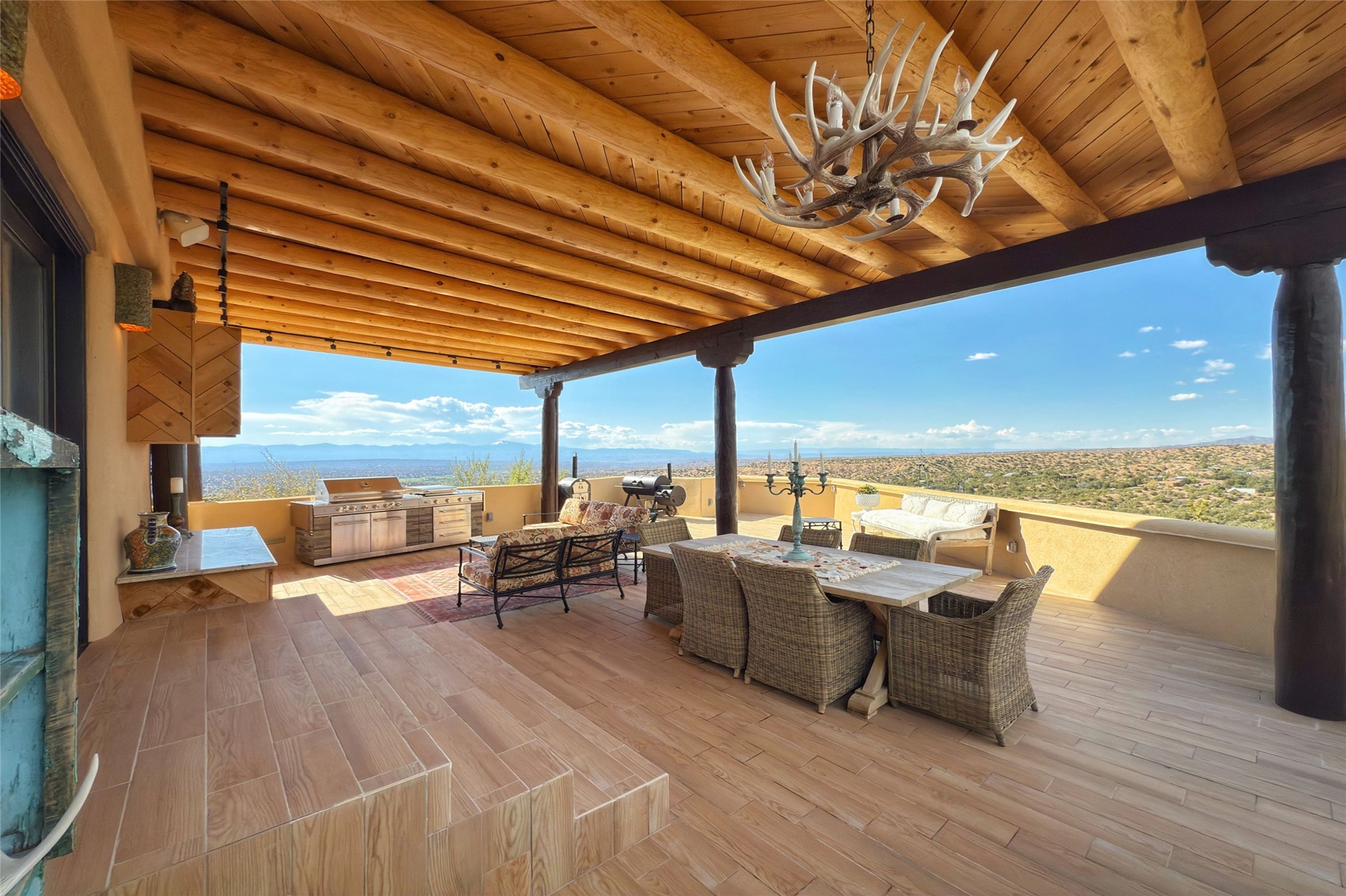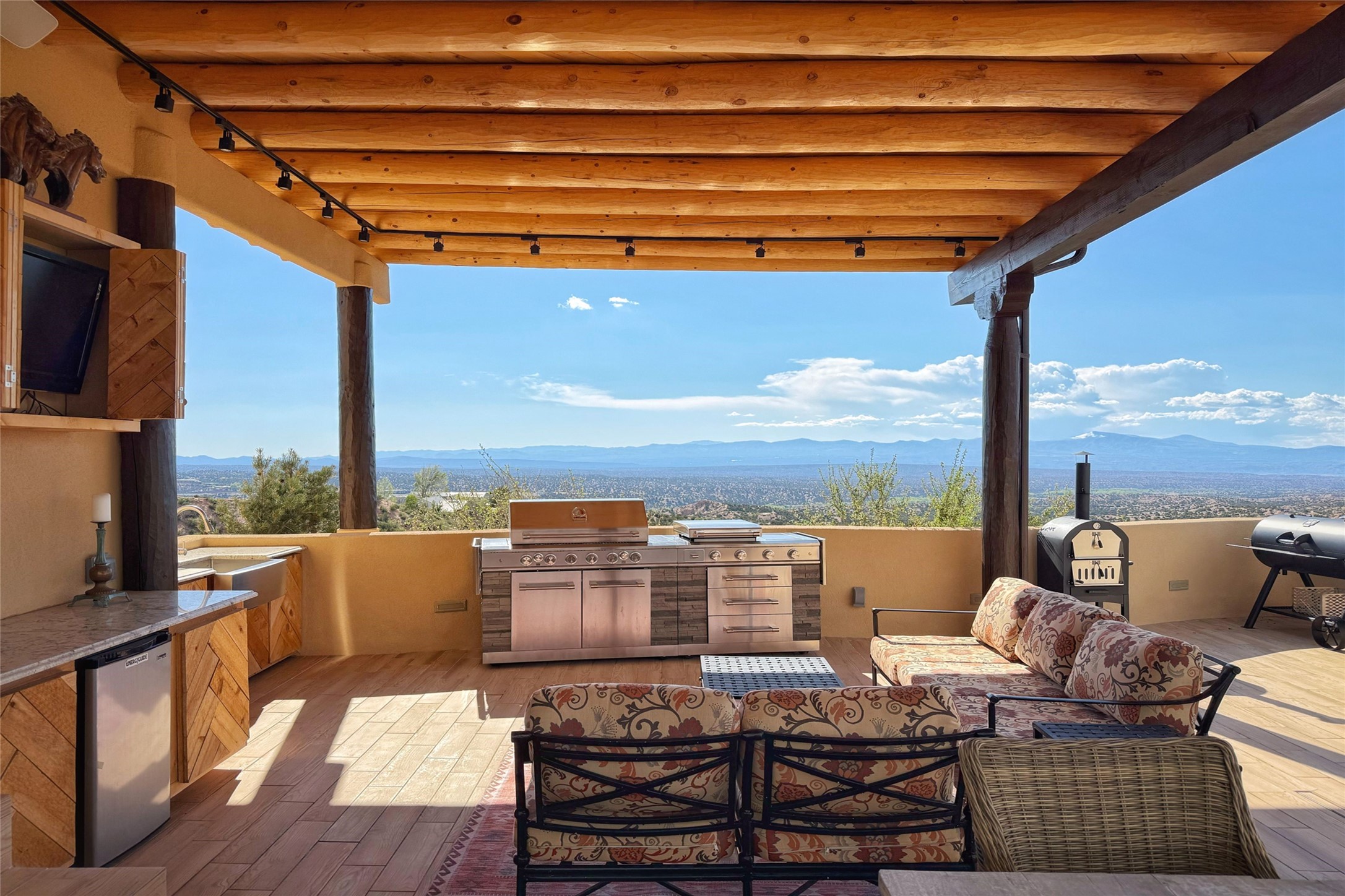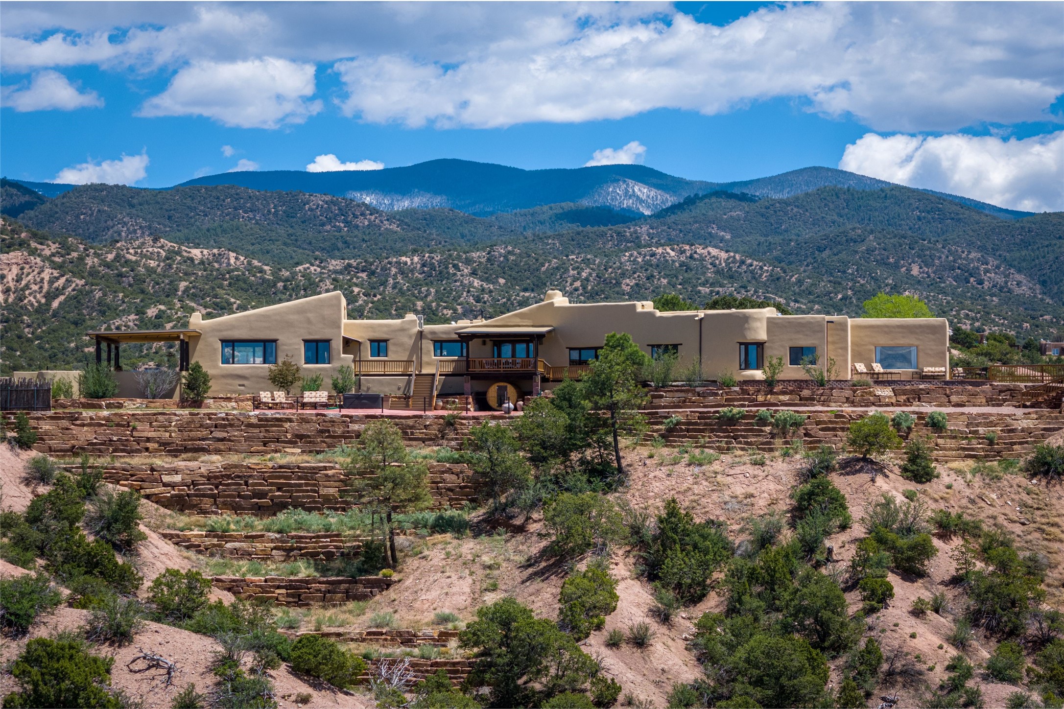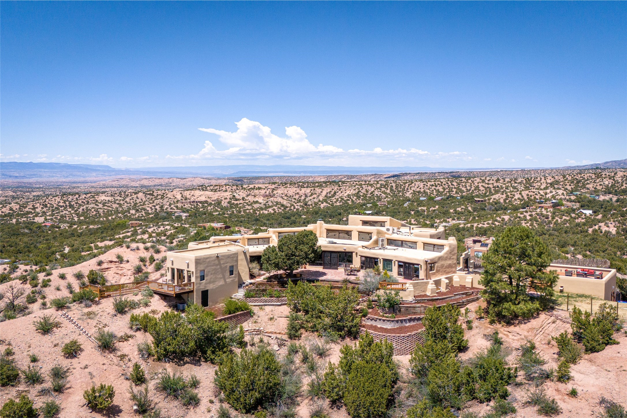 Welcome to this breathtaking 10-acre estate in the prestigious Tesuque community, where luxury meets unparalleled natural beauty. Quite possibly the best views in Tesuque, perched majestically on a private mountaintop, lovingly nicknamed "Top of Tesuque," offering 360-degree panoramic views that make you feel as though you're sitting atop the world. Spanning approximately 6,614 sq ft, this 4-bedroom home is a masterpiece of design and function, featuring many new upgrades for a modern lifestyle. This fully restored and expanded adobe home seamlessly blends classic Santa Fe design with modern upgrades, preserving its timeless charm. This property has a new roof, lighting, stucco. Truly turn-key in every way. Inside, the floor plan seamlessly blends indoor and outdoor living, creating an ideal setting for both relaxation and entertaining, including 6 Kiva Fireplaces as well as 1 wood-burning stove. The brand-new kitchen features handcrafted solid wood cabinetry and top-of-the-line luxury appliances, perfect for any culinary enthusiast, while the adjacent dining and living areas boast spectacular views. The primary bedroom suite includes a separate sitting room, offering a private retreat within the home. Enjoy the convenience of a dedicated office space and den, a media room, as well as a game room complete with a wet bar, perfect for hosting guests. Step outside to the covered portal with outdoor kitchen & TV, complete with matching granite countertops, where you can entertain in style. The outdoor kitchen has all new (never been used) grill, pizza oven and smoker! Terraced gardens also feature a brand-new (never been used) Sauna and Hot Tub. A newly built garage has an observation deck on top. There are new entrance gates for privacy, a new driveway surface, and new additional parking areas ensure privacy and convenience. The addition of an electric lift from ground level to main level of residence also ensures accessibility and ease for loading and unloading. Mexican Porcelain tile terrace at the front entrance welcomes you. There is an enclosed dog park, as well as fully irrigated garden beds surrounding the house. The property is beautifully illuminated with 40 handmade copper light fixtures, adding a timeless touch to the outdoor spaces. With no HOA restrictions, this home offers the freedom and tranquility you've been searching for in the village of Tesuque.