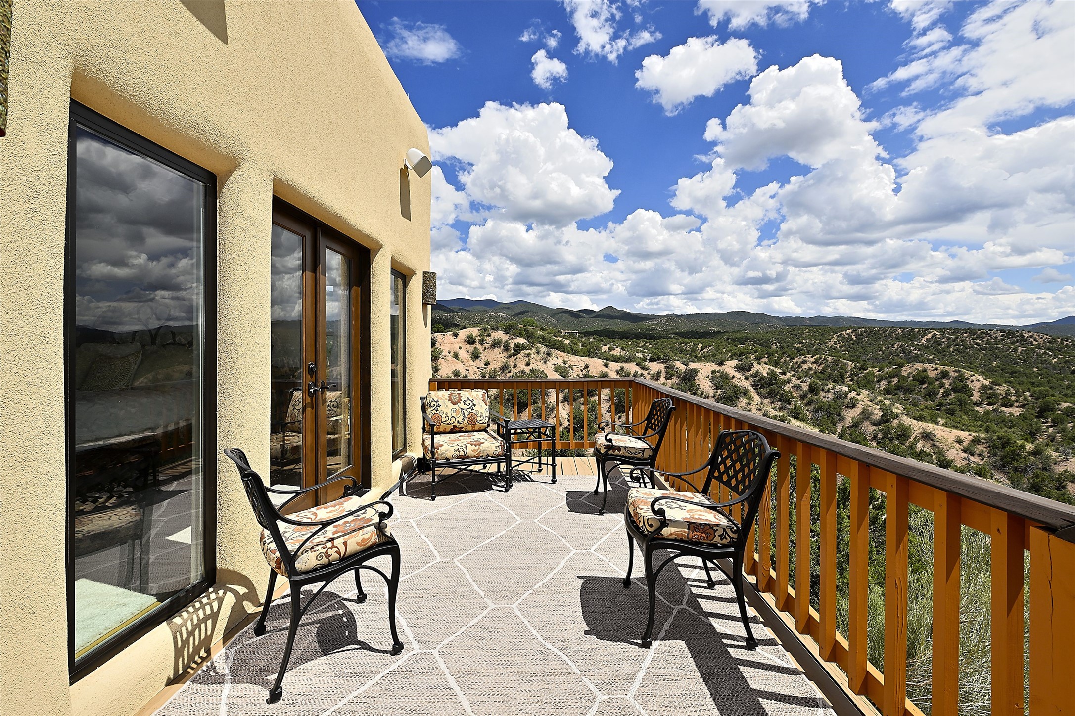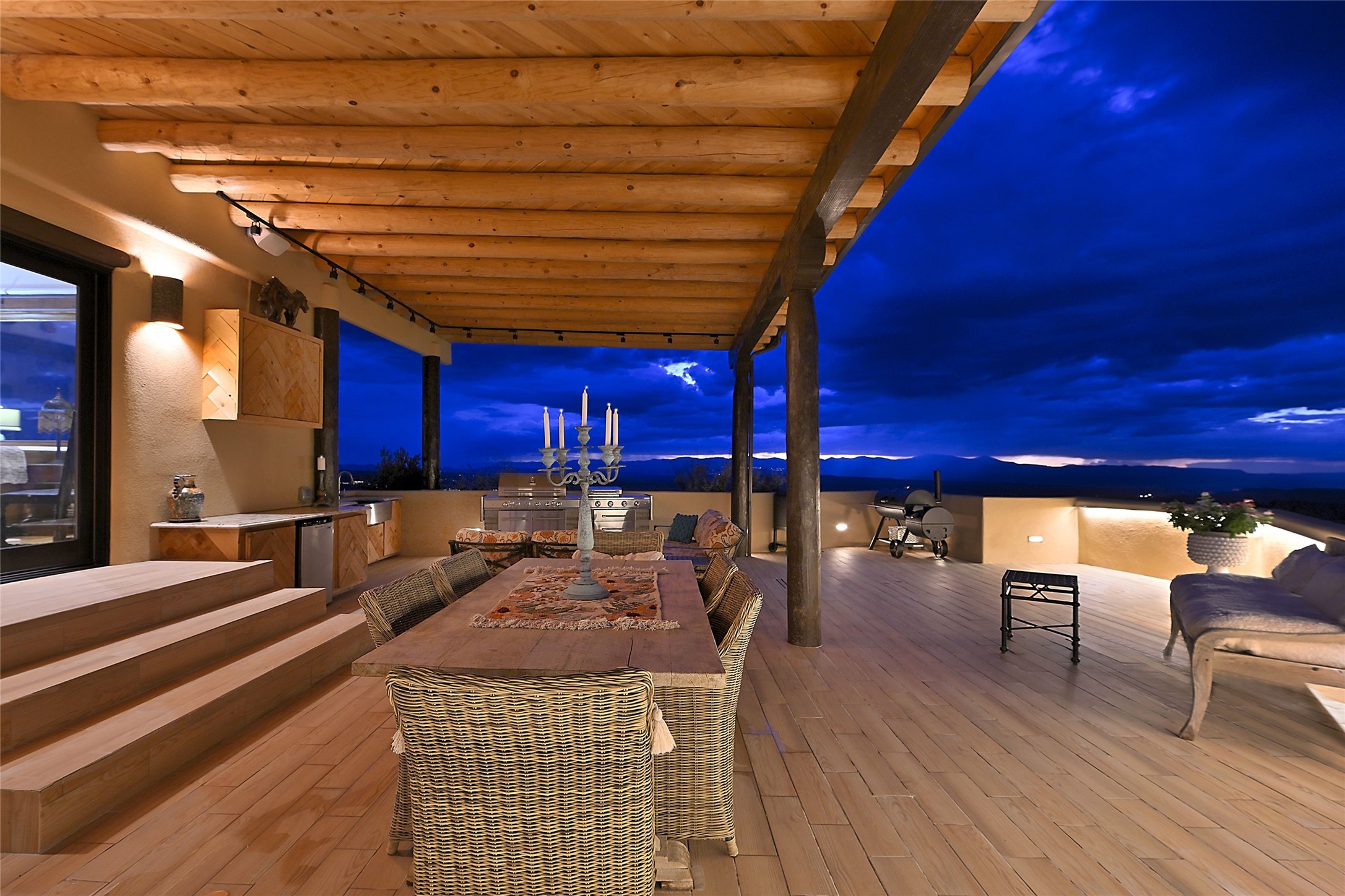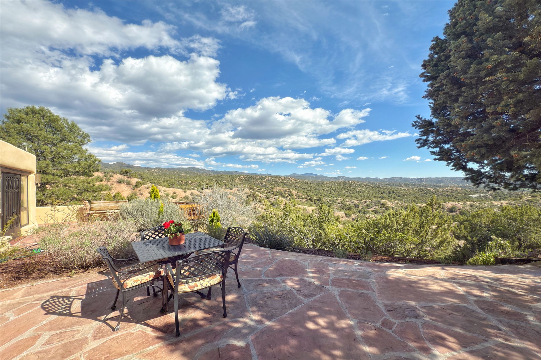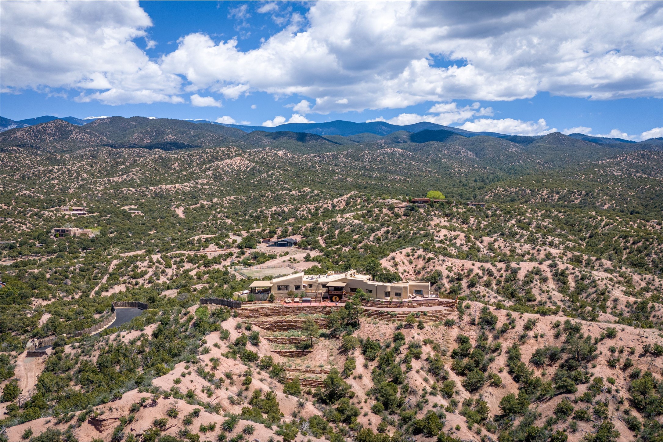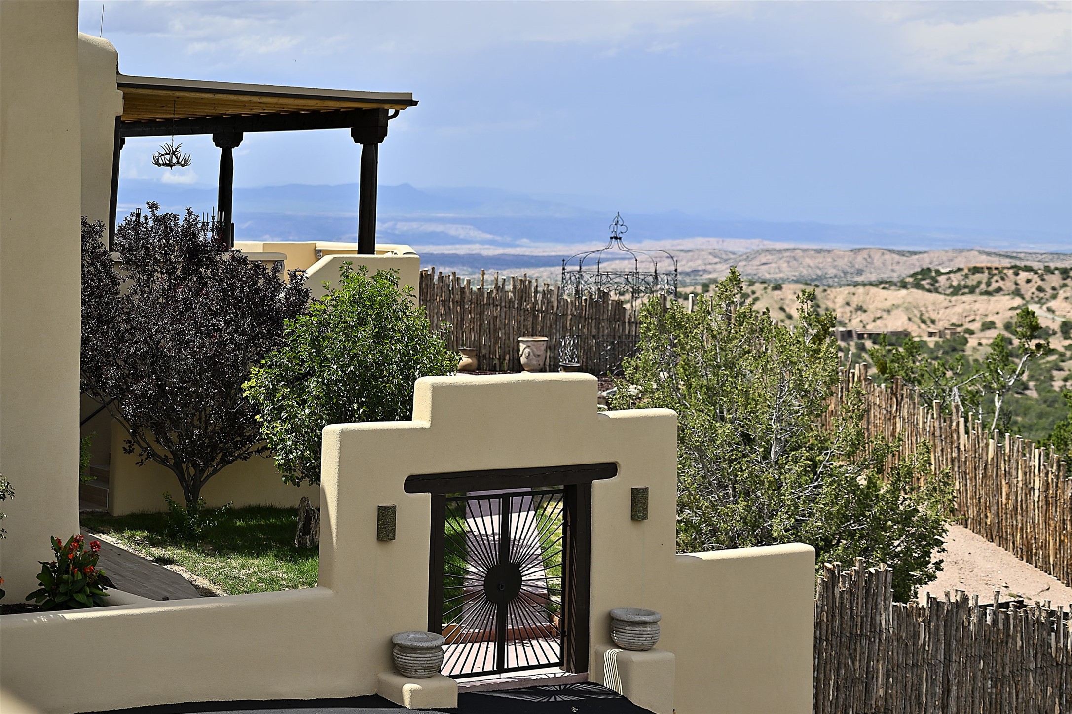 Welcome to this breathtaking 10-acre estate in the prestigious Tesuque community, where luxury meets unparalleled natural beauty. Quite possibly the best views in Tesuque, perched majestically on a private mountaintop, lovingly nicknamed "Top of Tesuque," offering 360-degree panoramic views that make you feel as though you're sitting atop the world. Spanning approximately 6,614 sq ft, this 4-bedroom home is a masterpiece of design and function, featuring many new upgrades for a modern lifestyle. This fully restored and expanded adobe home seamlessly blends classic Santa Fe design with modern upgrades, preserving its timeless charm. This property has a new roof, lighting, stucco. Truly turn-key in every way. Inside, the floor plan seamlessly blends indoor and outdoor living, creating an ideal setting for both relaxation and entertaining, including 6 Kiva Fireplaces as well as 1 wood-burning stove. The brand-new kitchen features handcrafted solid wood cabinetry and top-of-the-line luxury appliances, perfect for any culinary enthusiast, while the adjacent dining and living areas boast spectacular views. The primary bedroom suite includes a separate sitting room, offering a private retreat within the home. Enjoy the convenience of a dedicated office space and den, a media room, as well as a game room complete with a wet bar, perfect for hosting guests. Step outside to the covered portal with outdoor kitchen & TV, complete with matching granite countertops, where you can entertain in style. The outdoor kitchen has all new (never been used) grill, pizza oven and smoker! Terraced gardens also feature a brand-new (never been used) Sauna and Hot Tub. A newly built garage has an observation deck on top. There are new entrance gates for privacy, a new driveway surface, and new additional parking areas ensure privacy and convenience. The addition of an electric lift from ground level to main level of residence also ensures accessibility and ease for loading and unloading. Mexican Porcelain tile terrace at the front entrance welcomes you. There is an enclosed dog park, as well as fully irrigated garden beds surrounding the house. The property is beautifully illuminated with 40 handmade copper light fixtures, adding a timeless touch to the outdoor spaces. With no HOA restrictions, this home offers the freedom and tranquility you've been searching for in the village of Tesuque.