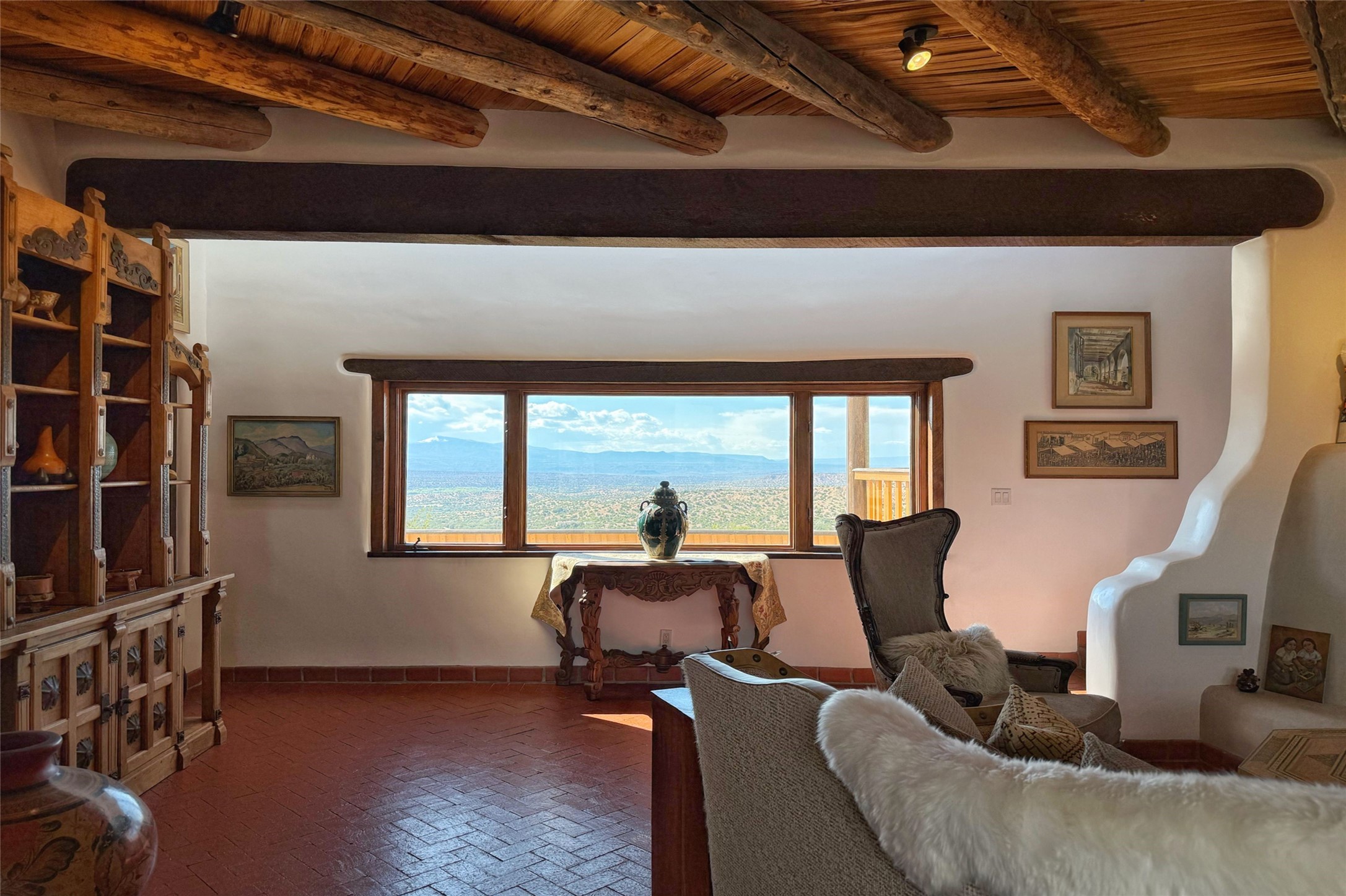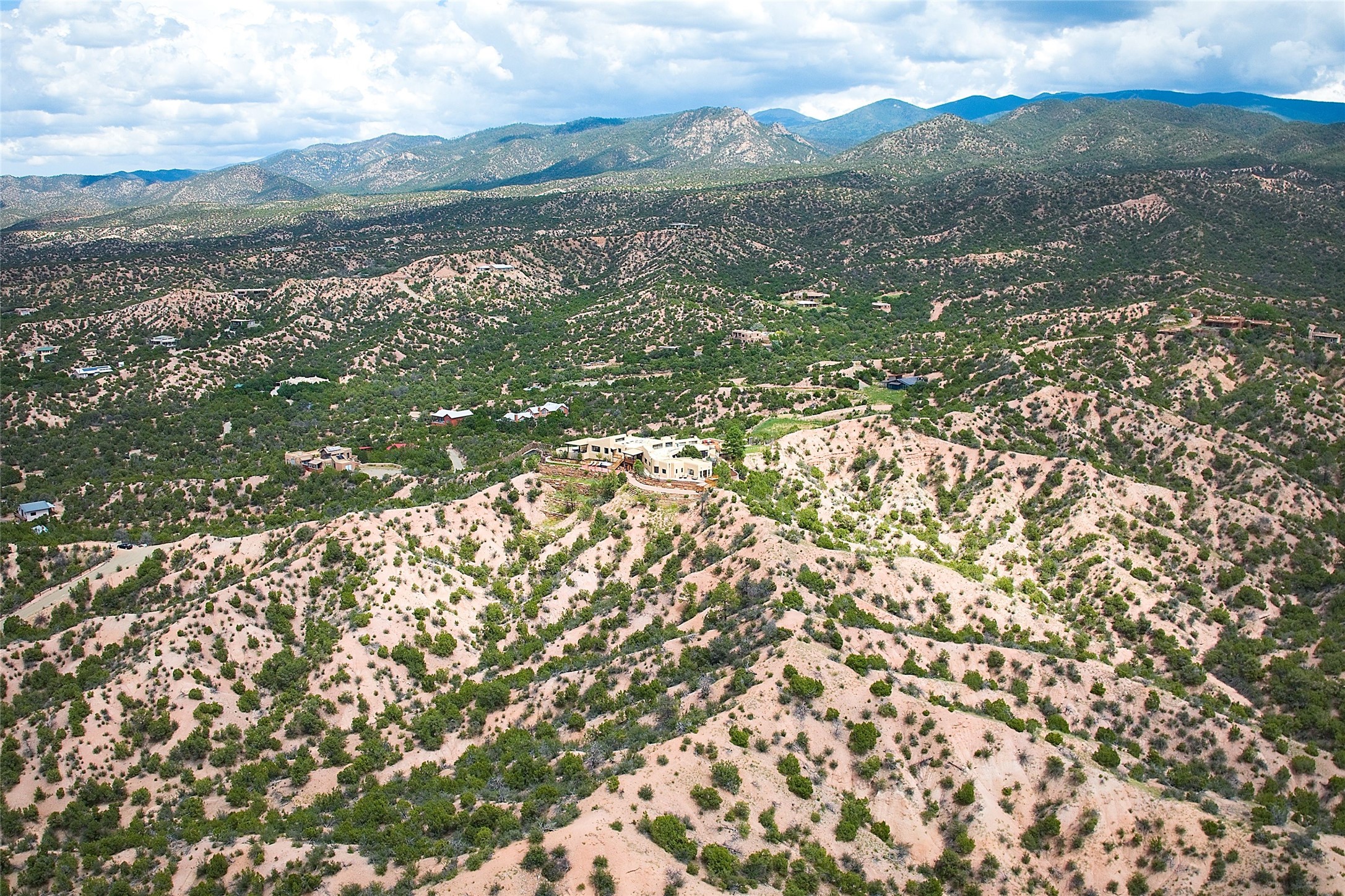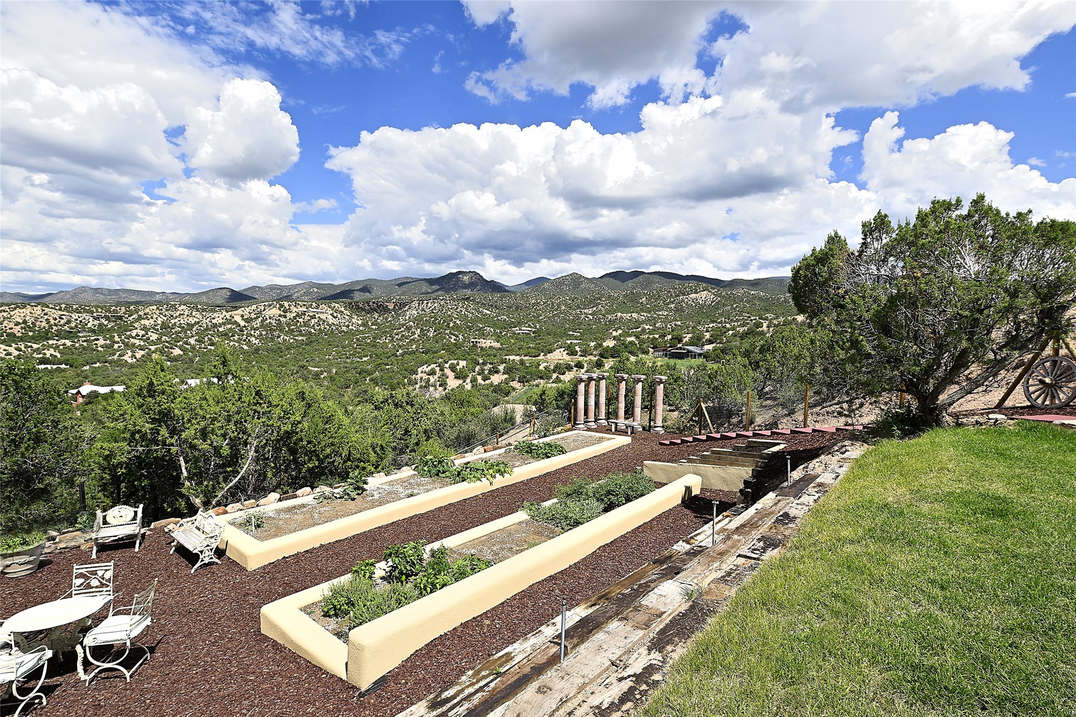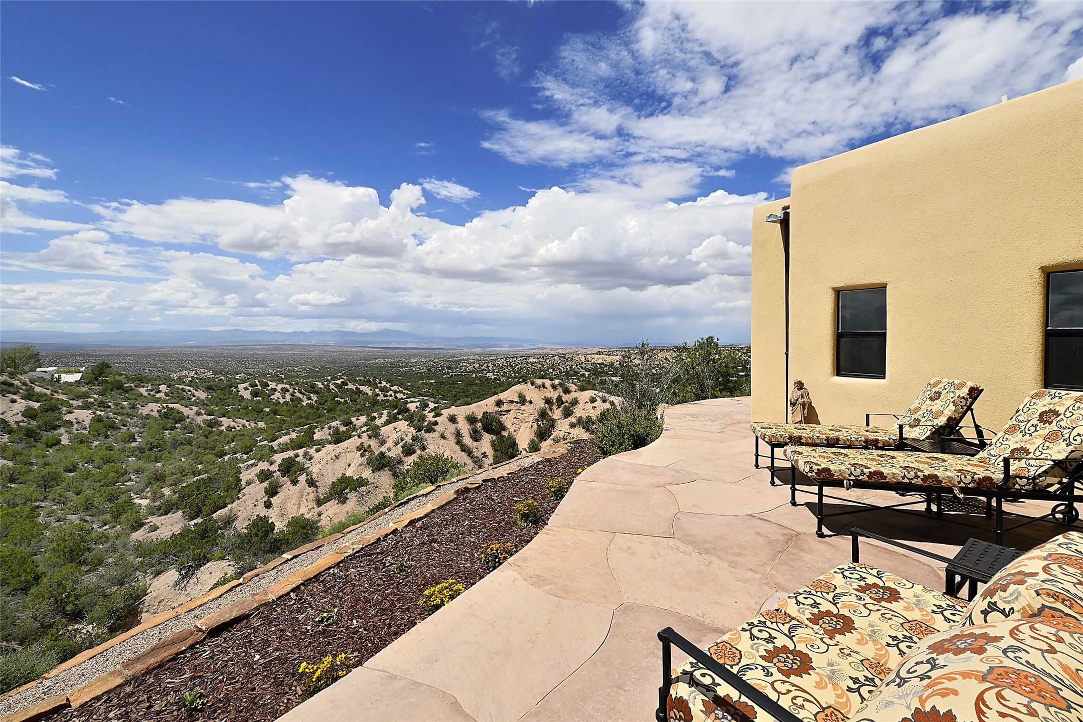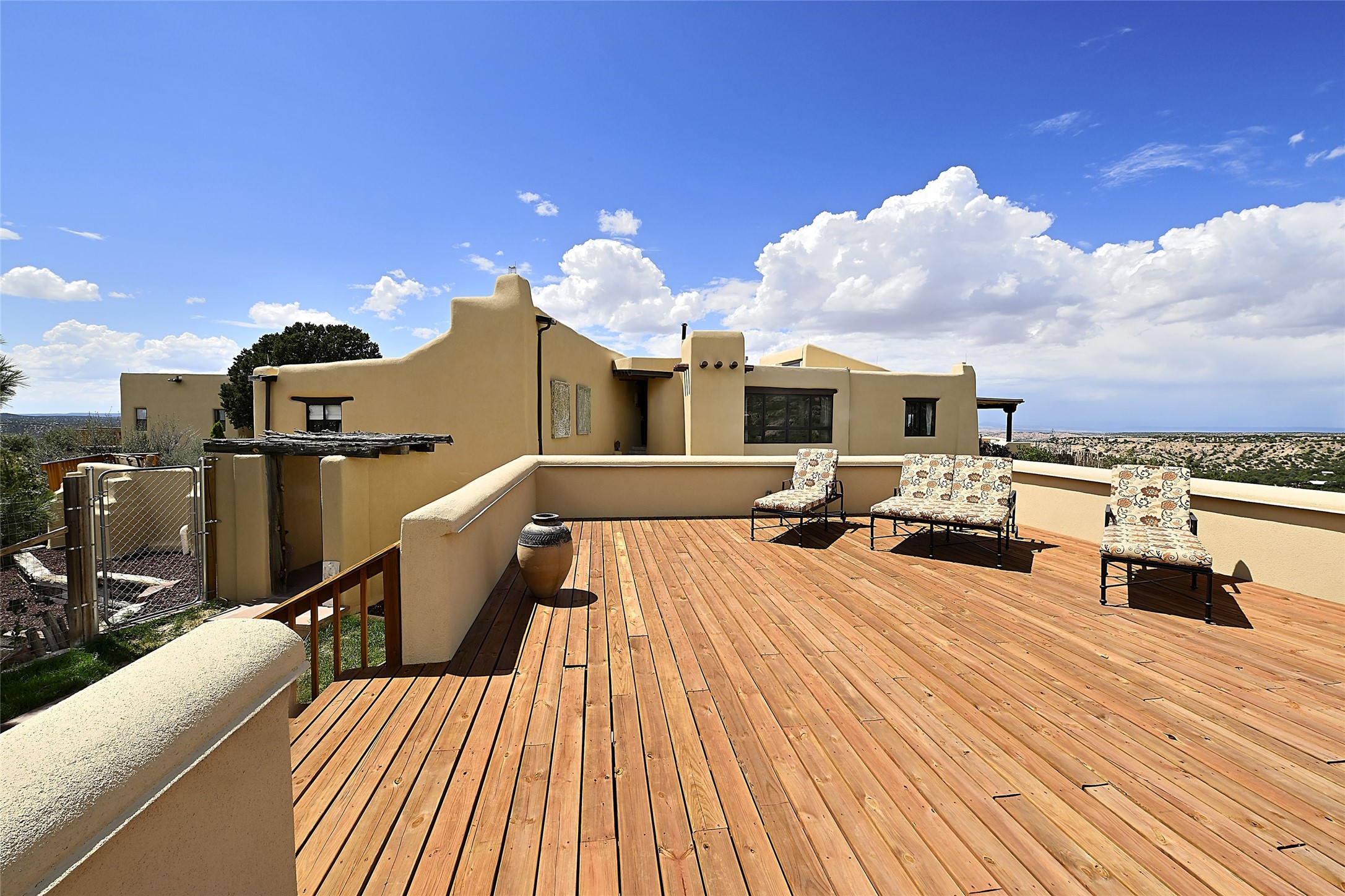 Welcome to this breathtaking 10-acre estate in the prestigious Tesuque community, where luxury meets unparalleled natural beauty. Quite possibly the best views in Tesuque, perched majestically on a private mountaintop, lovingly nicknamed "Top of Tesuque," offering 360-degree panoramic views that make you feel as though you're sitting atop the world. Spanning approximately 6,614 sq ft, this 4-bedroom home is a masterpiece of design and function, featuring many new upgrades for a modern lifestyle. This fully restored and expanded adobe home seamlessly blends classic Santa Fe design with modern upgrades, preserving its timeless charm. This property has a new roof, lighting, stucco. Truly turn-key in every way. Inside, the floor plan seamlessly blends indoor and outdoor living, creating an ideal setting for both relaxation and entertaining, including 6 Kiva Fireplaces as well as 1 wood-burning stove. The brand-new kitchen features handcrafted solid wood cabinetry and top-of-the-line luxury appliances, perfect for any culinary enthusiast, while the adjacent dining and living areas boast spectacular views. The primary bedroom suite includes a separate sitting room, offering a private retreat within the home. Enjoy the convenience of a dedicated office space and den, a media room, as well as a game room complete with a wet bar, perfect for hosting guests. Step outside to the covered portal with outdoor kitchen & TV, complete with matching granite countertops, where you can entertain in style. The outdoor kitchen has all new (never been used) grill, pizza oven and smoker! Terraced gardens also feature a brand-new (never been used) Sauna and Hot Tub. A newly built garage has an observation deck on top. There are new entrance gates for privacy, a new driveway surface, and new additional parking areas ensure privacy and convenience. The addition of an electric lift from ground level to main level of residence also ensures accessibility and ease for loading and unloading. Mexican Porcelain tile terrace at the front entrance welcomes you. There is an enclosed dog park, as well as fully irrigated garden beds surrounding the house. The property is beautifully illuminated with 40 handmade copper light fixtures, adding a timeless touch to the outdoor spaces. With no HOA restrictions, this home offers the freedom and tranquility you've been searching for in the village of Tesuque.