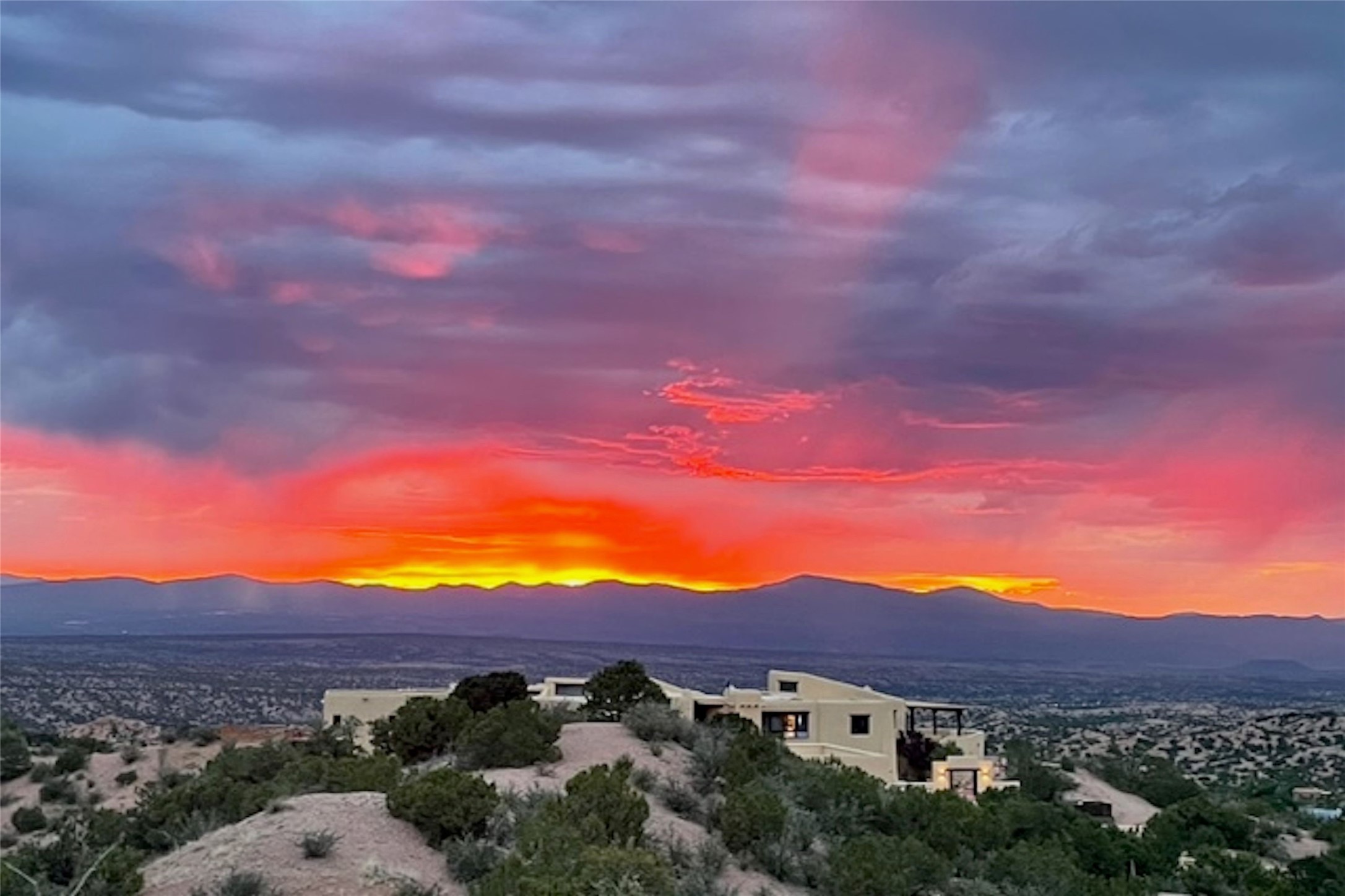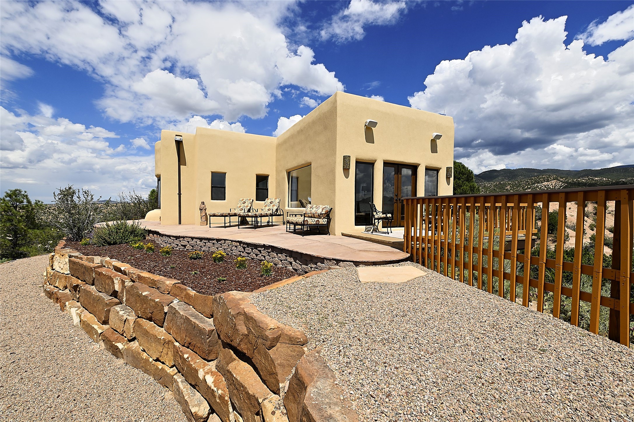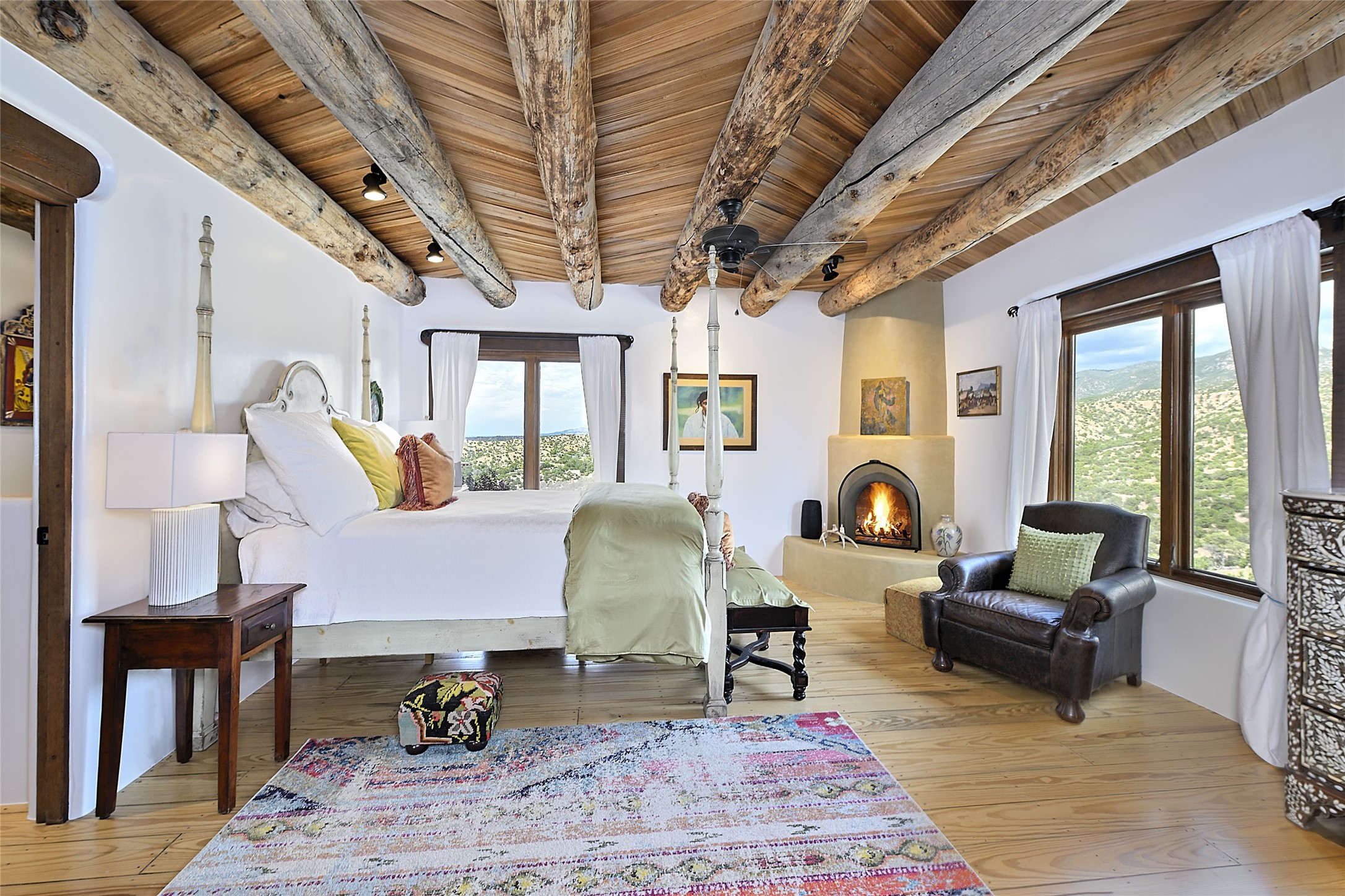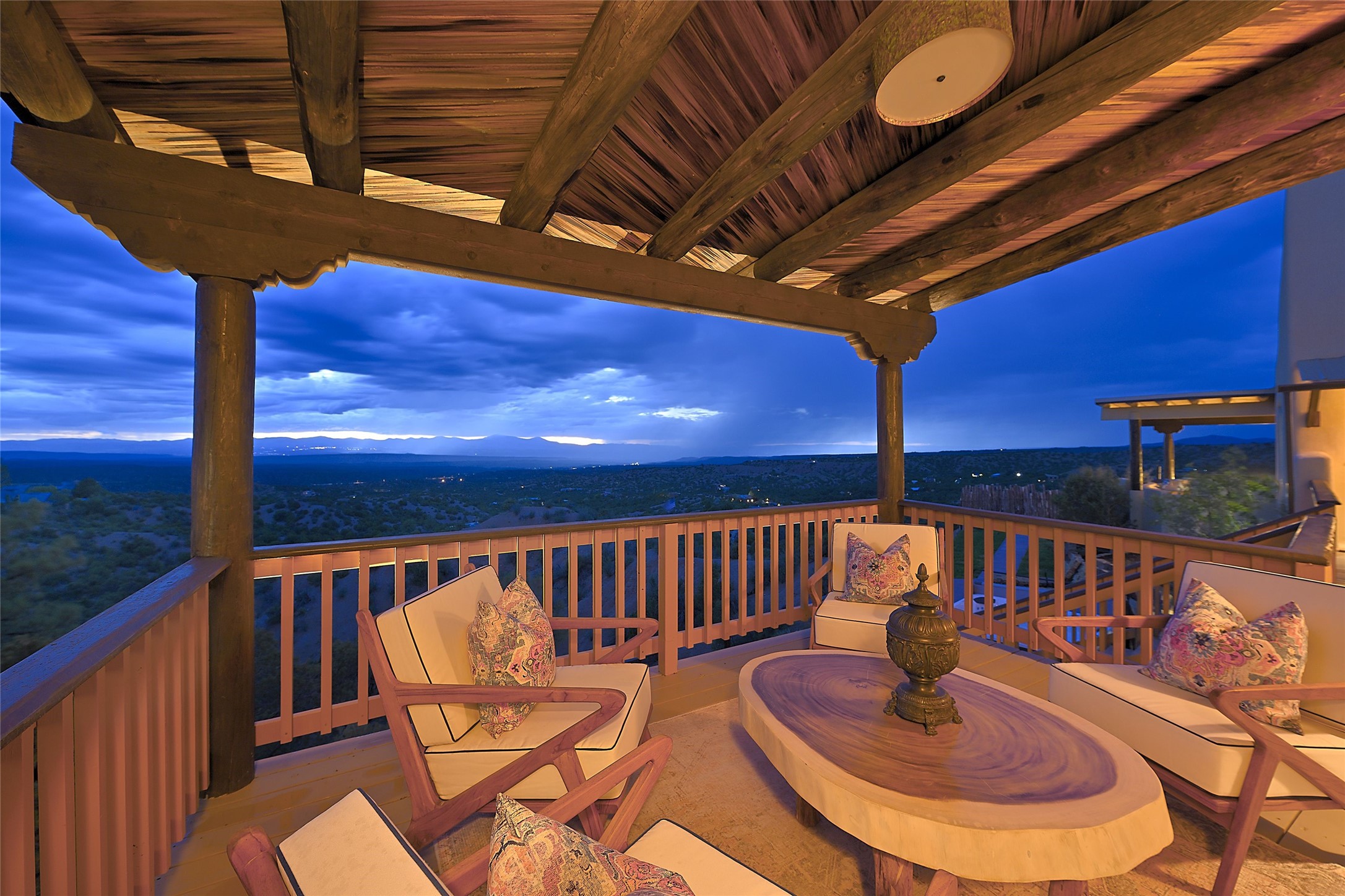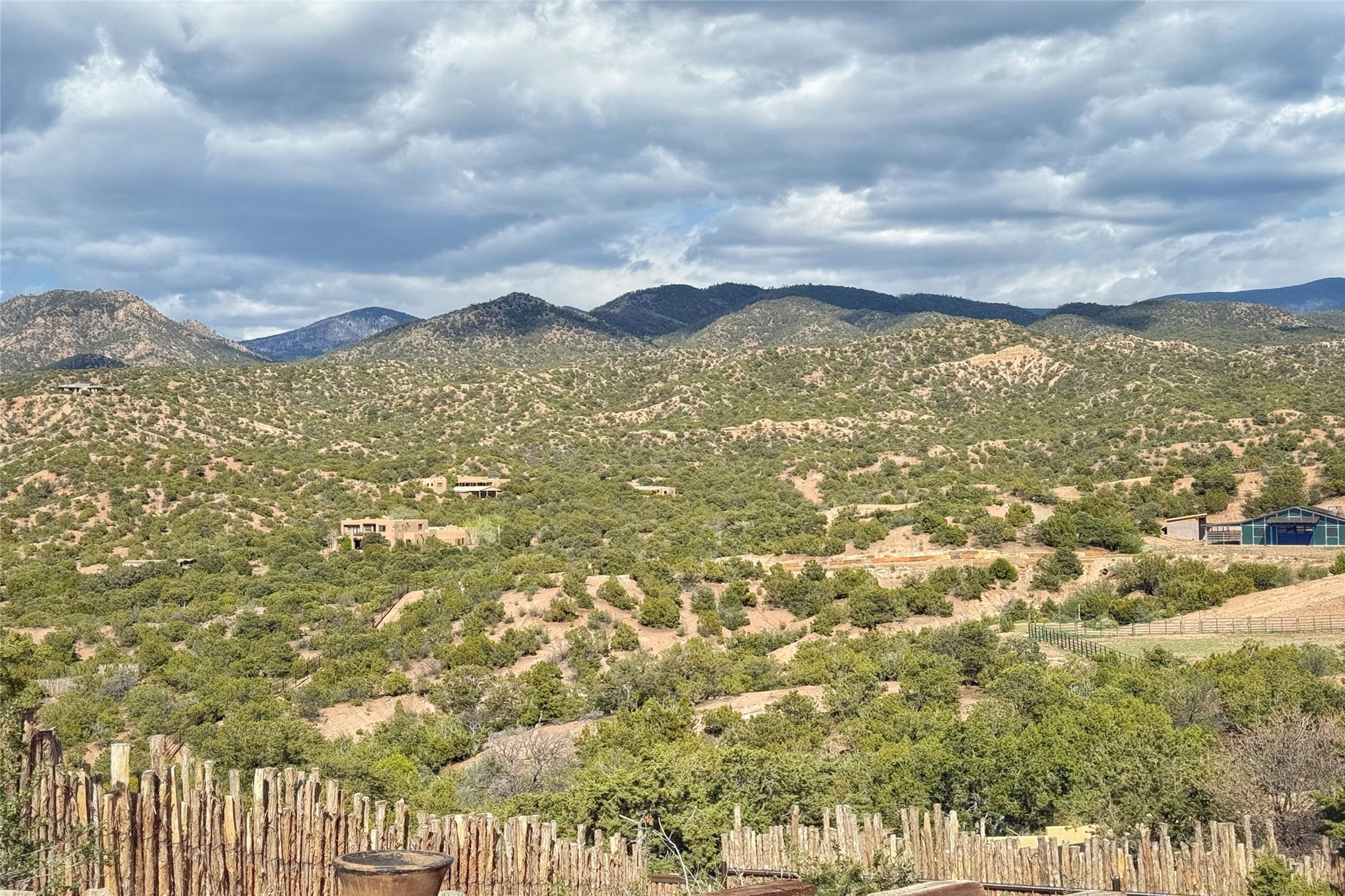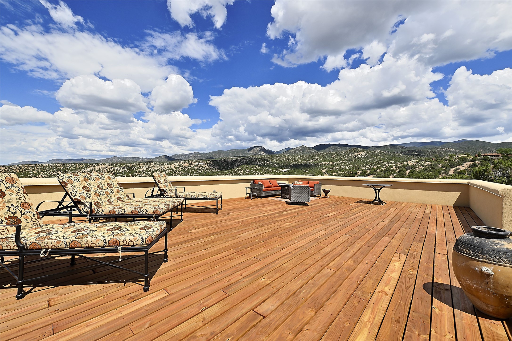 Welcome to this breathtaking 10-acre estate in the prestigious Tesuque community, where luxury meets unparalleled natural beauty. Quite possibly the best views in Tesuque, perched majestically on a private mountaintop, lovingly nicknamed "Top of Tesuque," offering 360-degree panoramic views that make you feel as though you're sitting atop the world. Spanning approximately 6,614 sq ft, this 4-bedroom home is a masterpiece of design and function, featuring many new upgrades for a modern lifestyle. This fully restored and expanded adobe home seamlessly blends classic Santa Fe design with modern upgrades, preserving its timeless charm. This property has a new roof, lighting, stucco. Truly turn-key in every way. Inside, the floor plan seamlessly blends indoor and outdoor living, creating an ideal setting for both relaxation and entertaining, including 6 Kiva Fireplaces as well as 1 wood-burning stove. The brand-new kitchen features handcrafted solid wood cabinetry and top-of-the-line luxury appliances, perfect for any culinary enthusiast, while the adjacent dining and living areas boast spectacular views. The primary bedroom suite includes a separate sitting room, offering a private retreat within the home. Enjoy the convenience of a dedicated office space and den, a media room, as well as a game room complete with a wet bar, perfect for hosting guests. Step outside to the covered portal with outdoor kitchen & TV, complete with matching granite countertops, where you can entertain in style. The outdoor kitchen has all new (never been used) grill, pizza oven and smoker! Terraced gardens also feature a brand-new (never been used) Sauna and Hot Tub. A newly built garage has an observation deck on top. There are new entrance gates for privacy, a new driveway surface, and new additional parking areas ensure privacy and convenience. The addition of an electric lift from ground level to main level of residence also ensures accessibility and ease for loading and unloading. Mexican Porcelain tile terrace at the front entrance welcomes you. There is an enclosed dog park, as well as fully irrigated garden beds surrounding the house. The property is beautifully illuminated with 40 handmade copper light fixtures, adding a timeless touch to the outdoor spaces. With no HOA restrictions, this home offers the freedom and tranquility you've been searching for in the village of Tesuque.