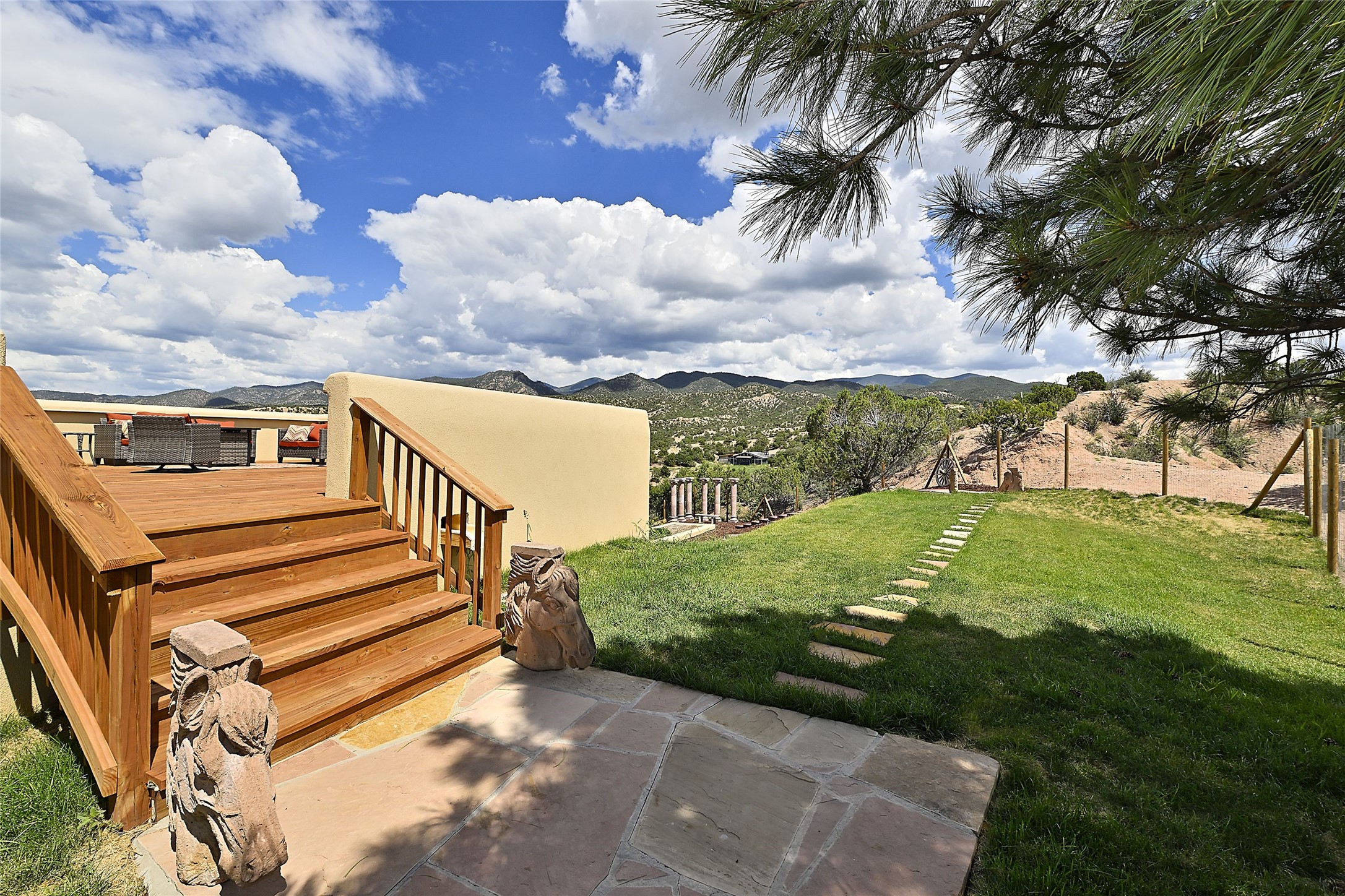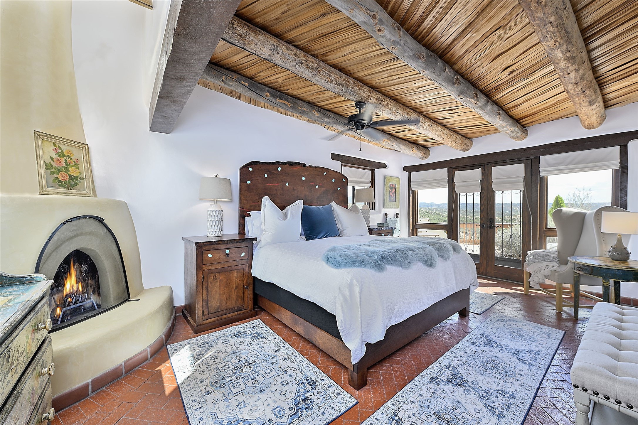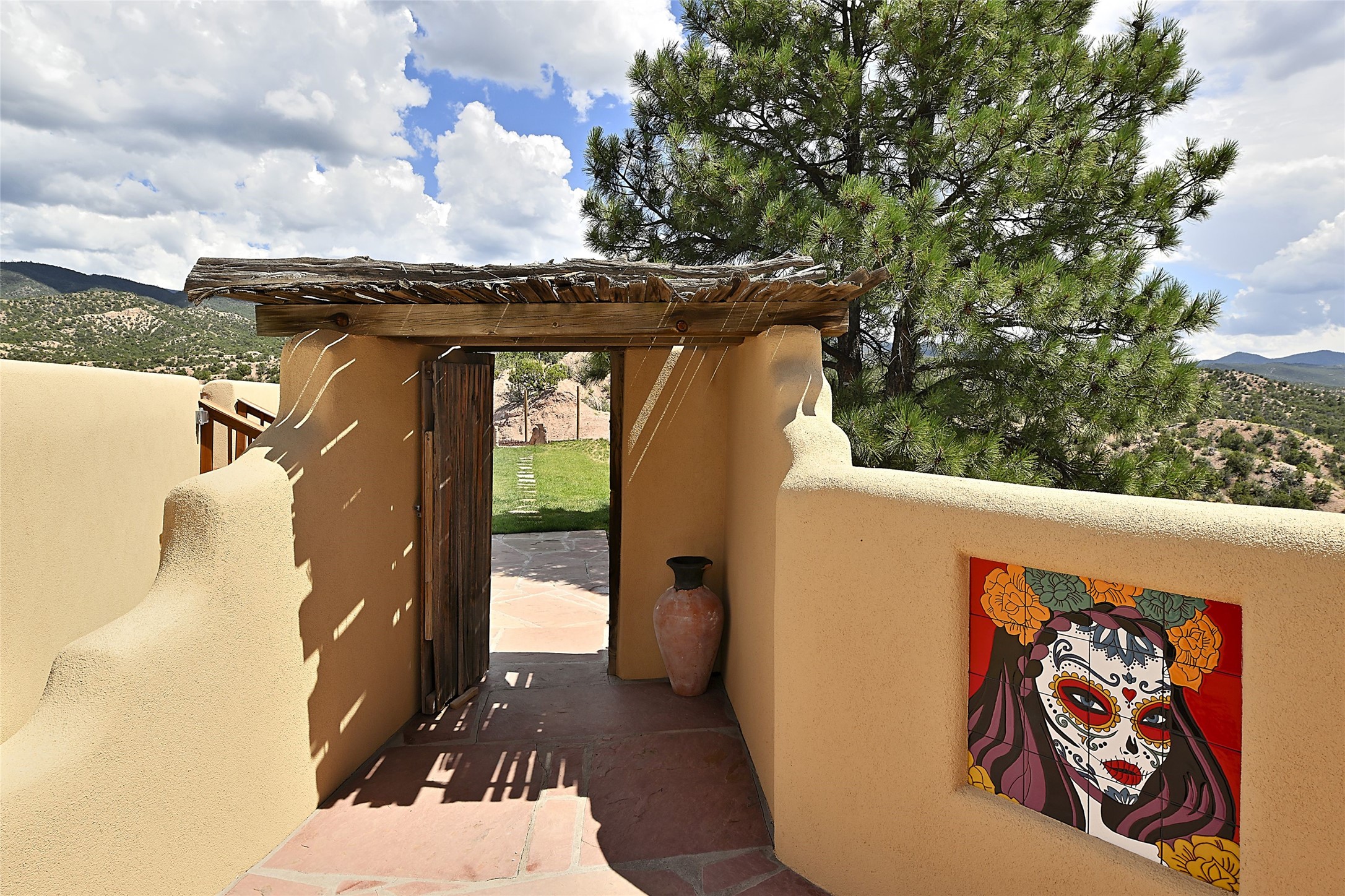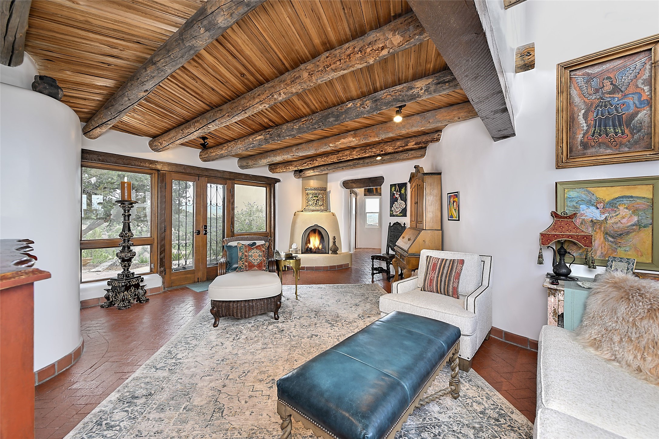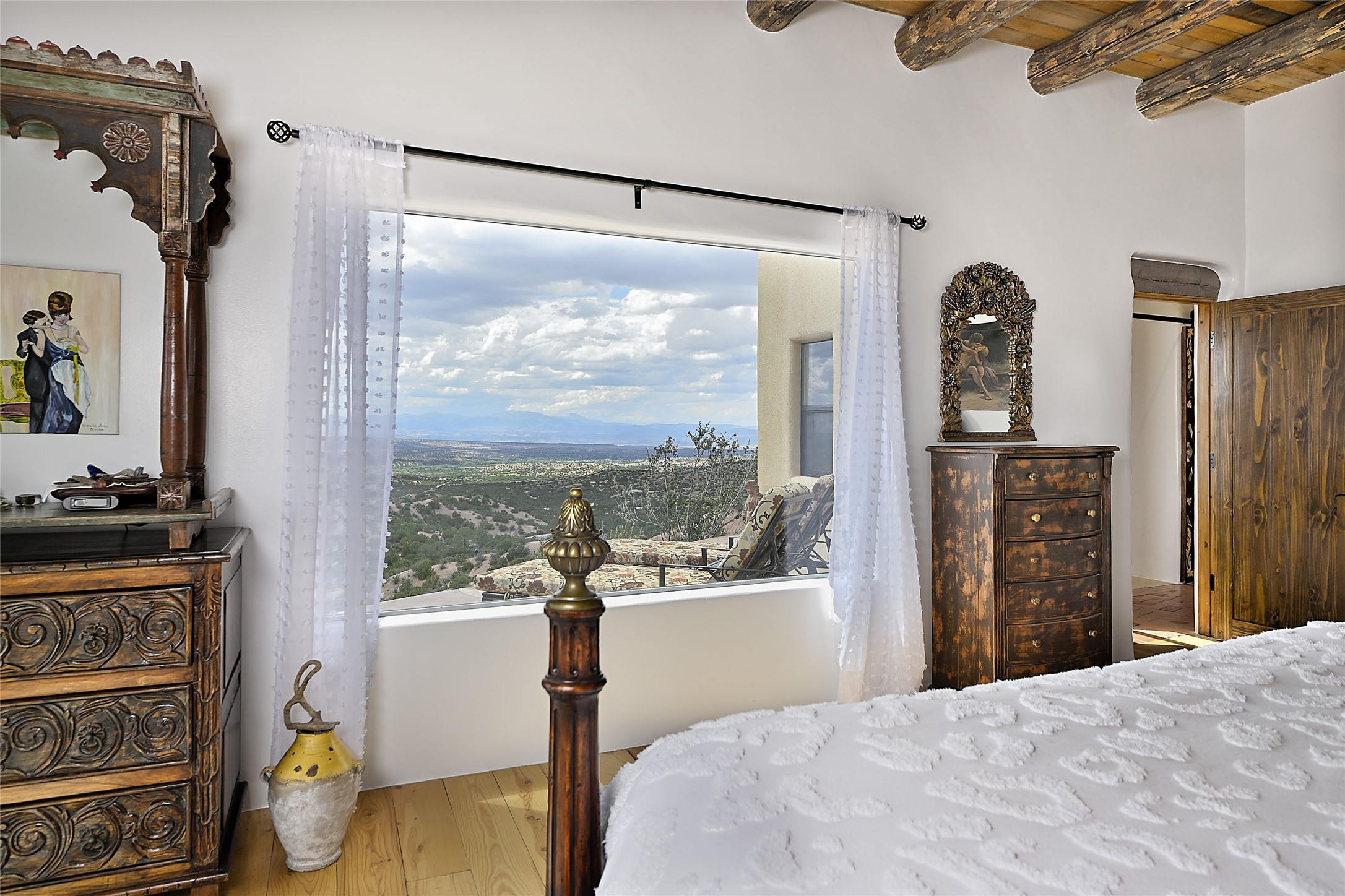 Welcome to this breathtaking 10-acre estate in the prestigious Tesuque community, where luxury meets unparalleled natural beauty. Quite possibly the best views in Tesuque, perched majestically on a private mountaintop, lovingly nicknamed "Top of Tesuque," offering 360-degree panoramic views that make you feel as though you're sitting atop the world. Spanning approximately 6,614 sq ft, this 4-bedroom home is a masterpiece of design and function, featuring many new upgrades for a modern lifestyle. This fully restored and expanded adobe home seamlessly blends classic Santa Fe design with modern upgrades, preserving its timeless charm. This property has a new roof, lighting, stucco. Truly turn-key in every way. Inside, the floor plan seamlessly blends indoor and outdoor living, creating an ideal setting for both relaxation and entertaining, including 6 Kiva Fireplaces as well as 1 wood-burning stove. The brand-new kitchen features handcrafted solid wood cabinetry and top-of-the-line luxury appliances, perfect for any culinary enthusiast, while the adjacent dining and living areas boast spectacular views. The primary bedroom suite includes a separate sitting room, offering a private retreat within the home. Enjoy the convenience of a dedicated office space and den, a media room, as well as a game room complete with a wet bar, perfect for hosting guests. Step outside to the covered portal with outdoor kitchen & TV, complete with matching granite countertops, where you can entertain in style. The outdoor kitchen has all new (never been used) grill, pizza oven and smoker! Terraced gardens also feature a brand-new (never been used) Sauna and Hot Tub. A newly built garage has an observation deck on top. There are new entrance gates for privacy, a new driveway surface, and new additional parking areas ensure privacy and convenience. The addition of an electric lift from ground level to main level of residence also ensures accessibility and ease for loading and unloading. Mexican Porcelain tile terrace at the front entrance welcomes you. There is an enclosed dog park, as well as fully irrigated garden beds surrounding the house. The property is beautifully illuminated with 40 handmade copper light fixtures, adding a timeless touch to the outdoor spaces. With no HOA restrictions, this home offers the freedom and tranquility you've been searching for in the village of Tesuque.