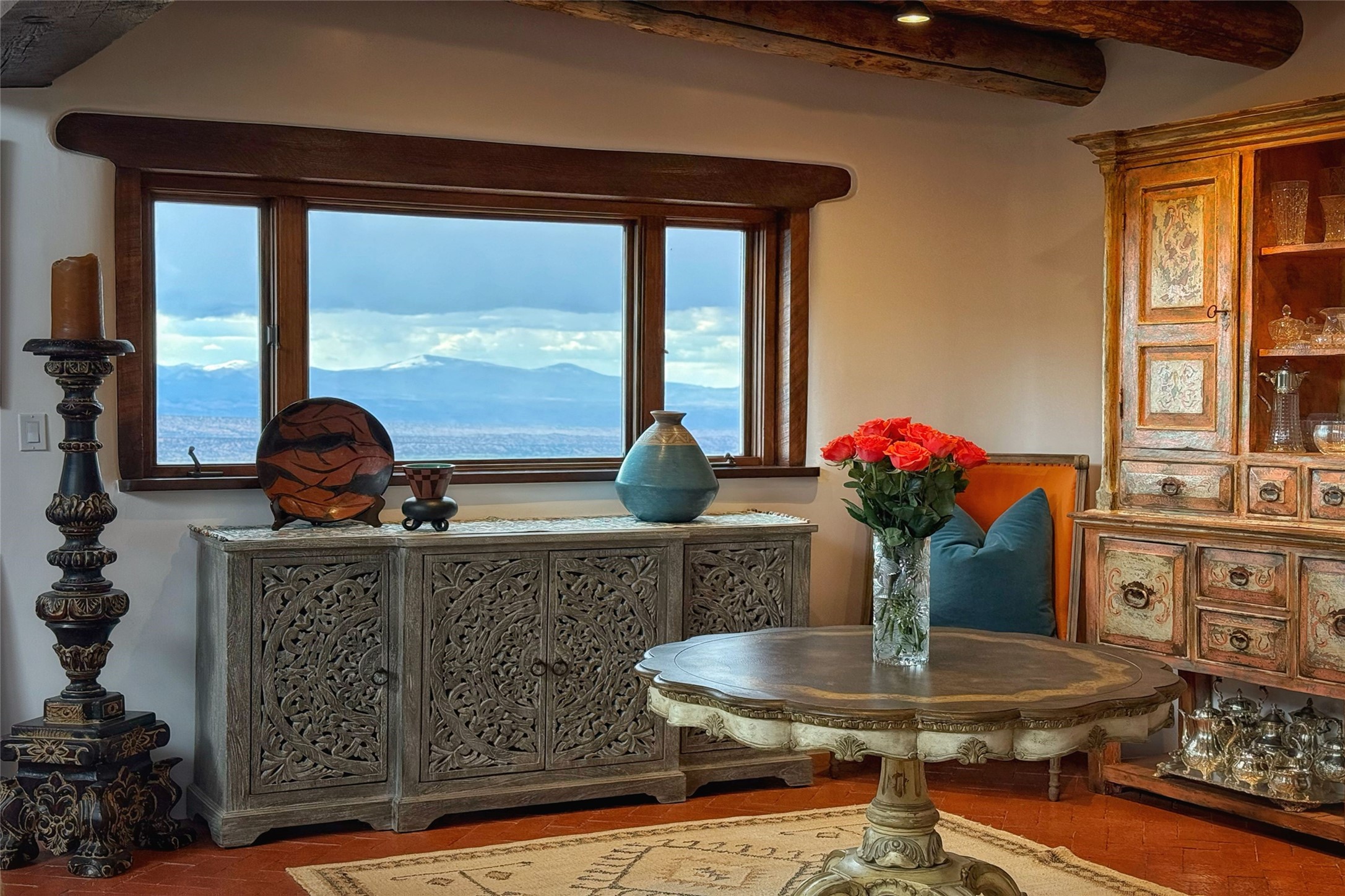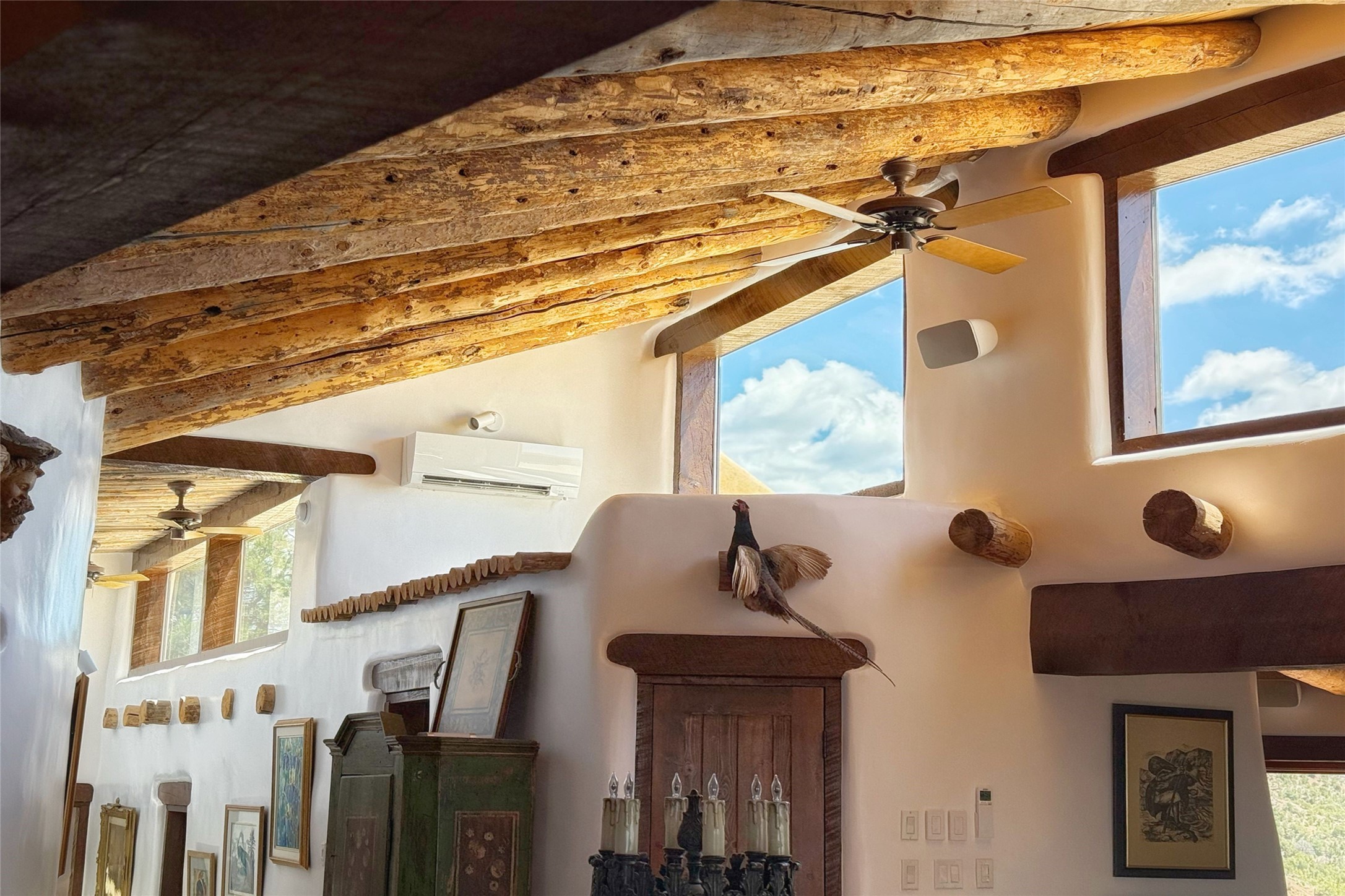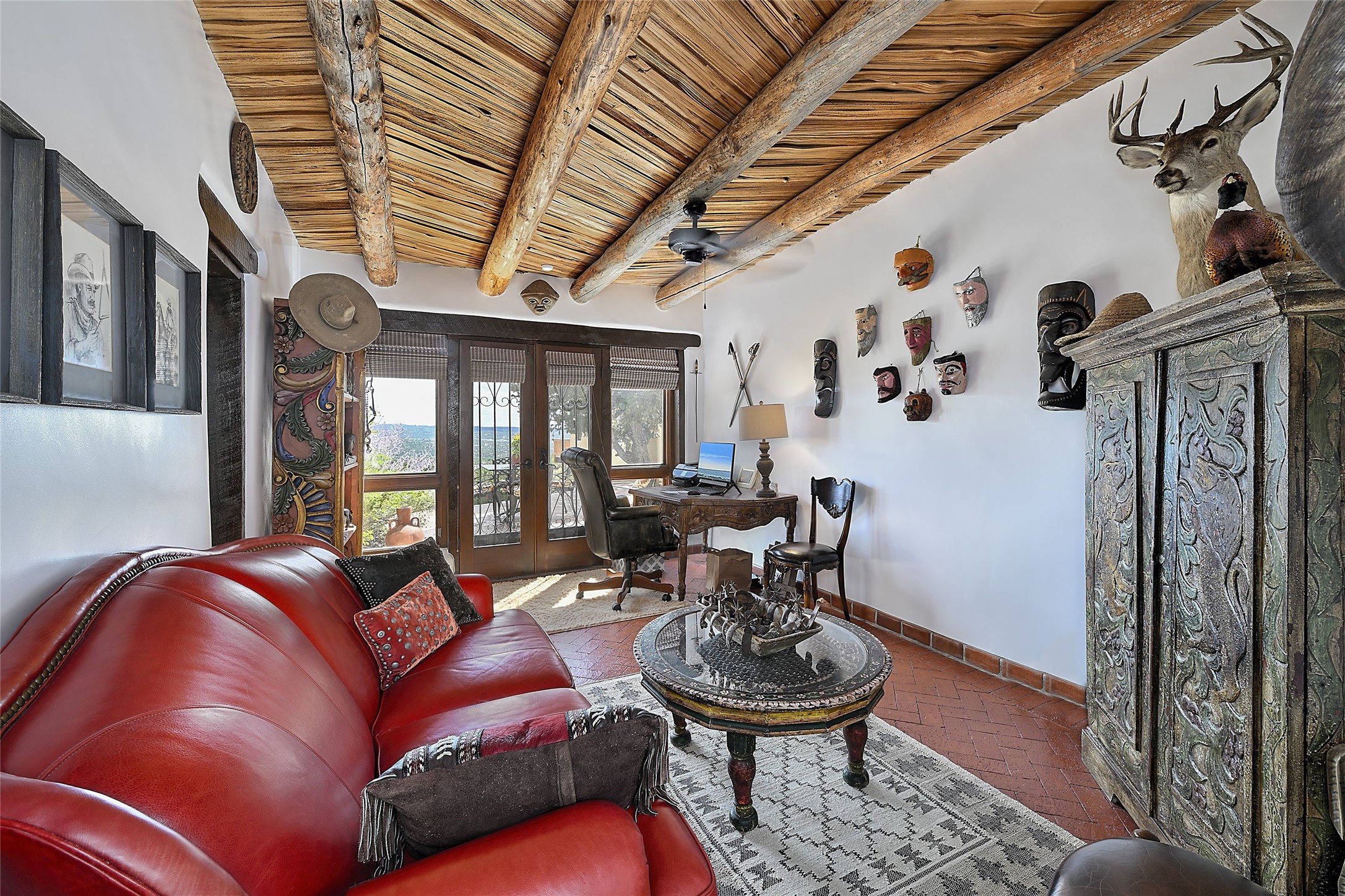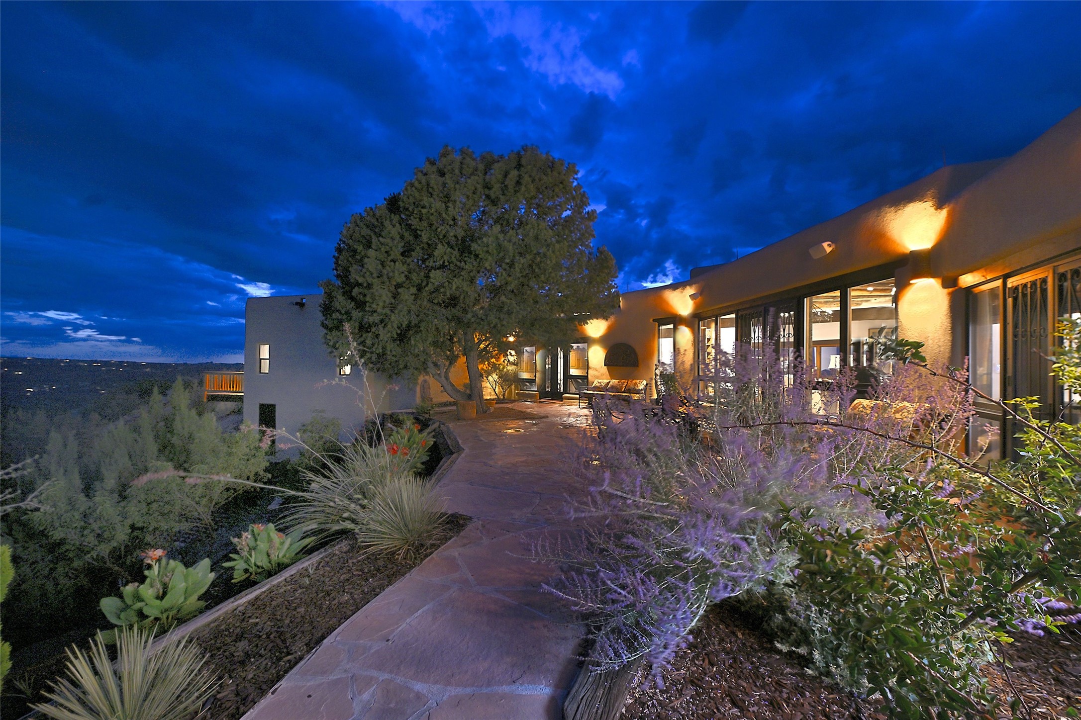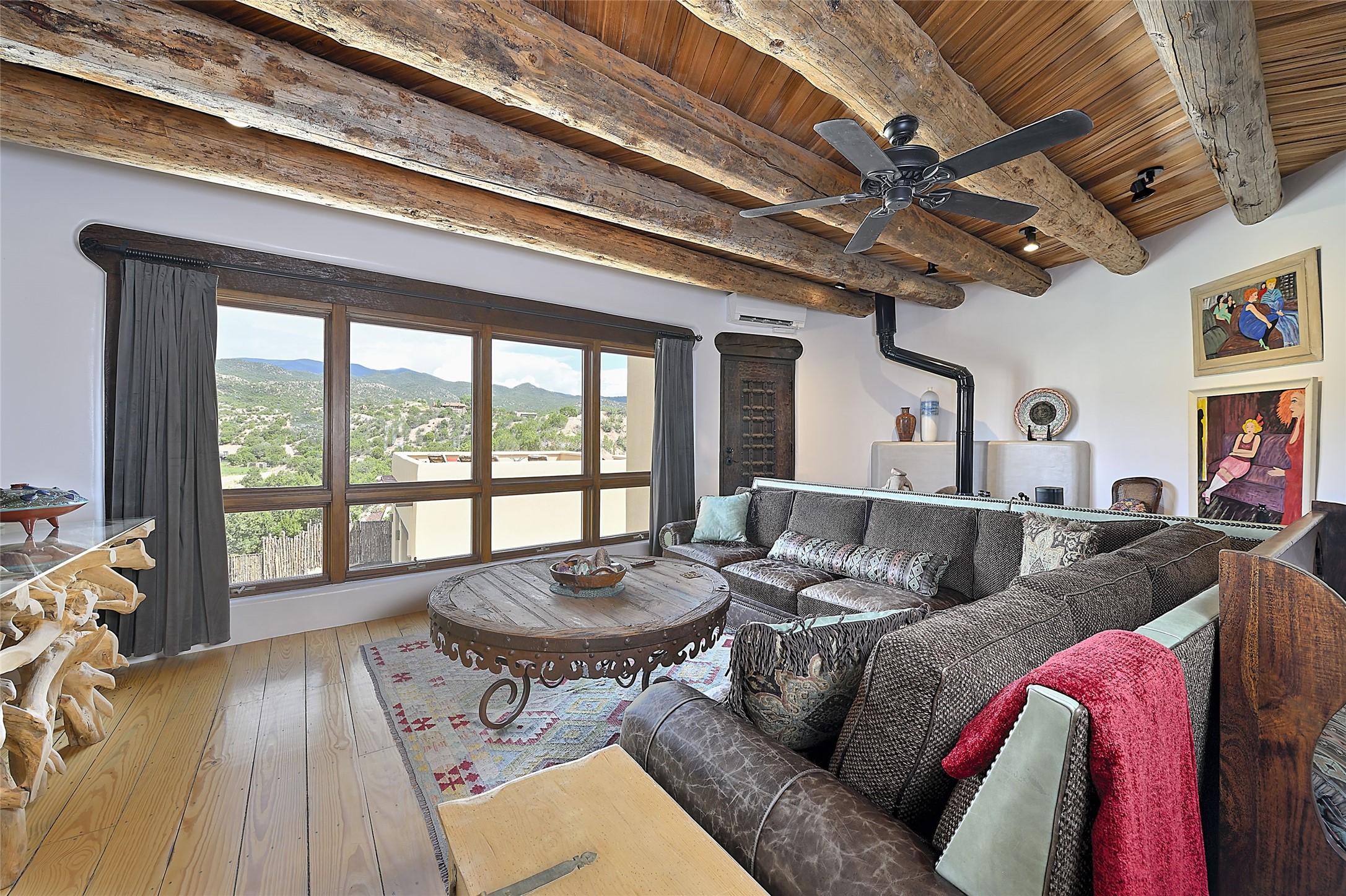 Welcome to this breathtaking 10-acre estate in the prestigious Tesuque community, where luxury meets unparalleled natural beauty. Quite possibly the best views in Tesuque, perched majestically on a private mountaintop, lovingly nicknamed "Top of Tesuque," offering 360-degree panoramic views that make you feel as though you're sitting atop the world. Spanning approximately 6,614 sq ft, this 4-bedroom home is a masterpiece of design and function, featuring many new upgrades for a modern lifestyle. This fully restored and expanded adobe home seamlessly blends classic Santa Fe design with modern upgrades, preserving its timeless charm. This property has a new roof, lighting, stucco. Truly turn-key in every way. Inside, the floor plan seamlessly blends indoor and outdoor living, creating an ideal setting for both relaxation and entertaining, including 6 Kiva Fireplaces as well as 1 wood-burning stove. The brand-new kitchen features handcrafted solid wood cabinetry and top-of-the-line luxury appliances, perfect for any culinary enthusiast, while the adjacent dining and living areas boast spectacular views. The primary bedroom suite includes a separate sitting room, offering a private retreat within the home. Enjoy the convenience of a dedicated office space and den, a media room, as well as a game room complete with a wet bar, perfect for hosting guests. Step outside to the covered portal with outdoor kitchen & TV, complete with matching granite countertops, where you can entertain in style. The outdoor kitchen has all new (never been used) grill, pizza oven and smoker! Terraced gardens also feature a brand-new (never been used) Sauna and Hot Tub. A newly built garage has an observation deck on top. There are new entrance gates for privacy, a new driveway surface, and new additional parking areas ensure privacy and convenience. The addition of an electric lift from ground level to main level of residence also ensures accessibility and ease for loading and unloading. Mexican Porcelain tile terrace at the front entrance welcomes you. There is an enclosed dog park, as well as fully irrigated garden beds surrounding the house. The property is beautifully illuminated with 40 handmade copper light fixtures, adding a timeless touch to the outdoor spaces. With no HOA restrictions, this home offers the freedom and tranquility you've been searching for in the village of Tesuque.