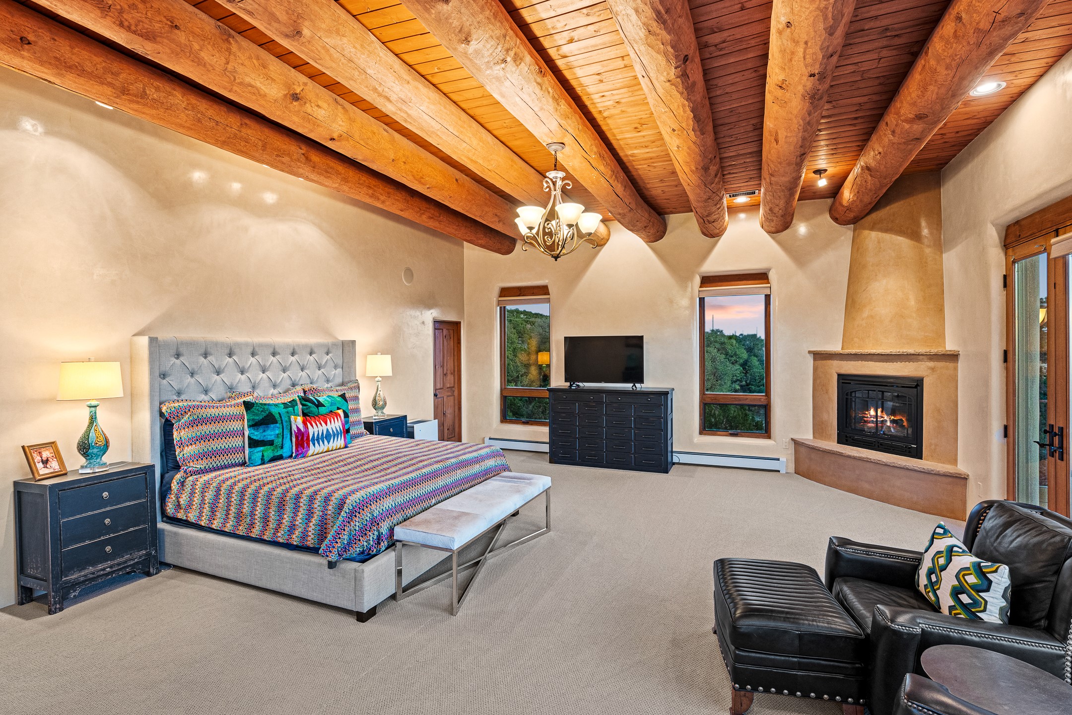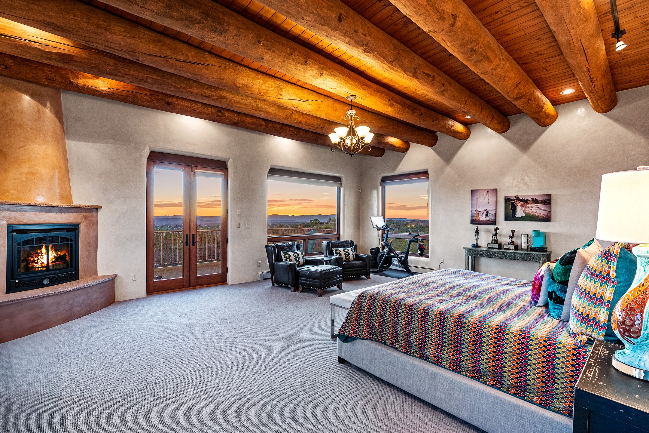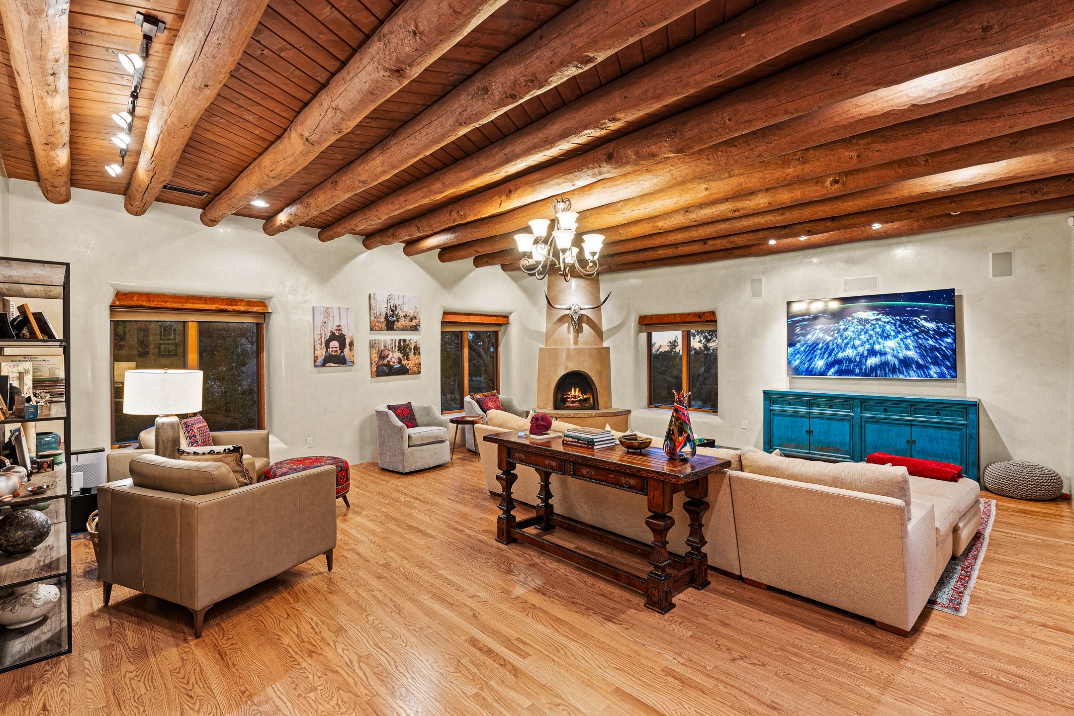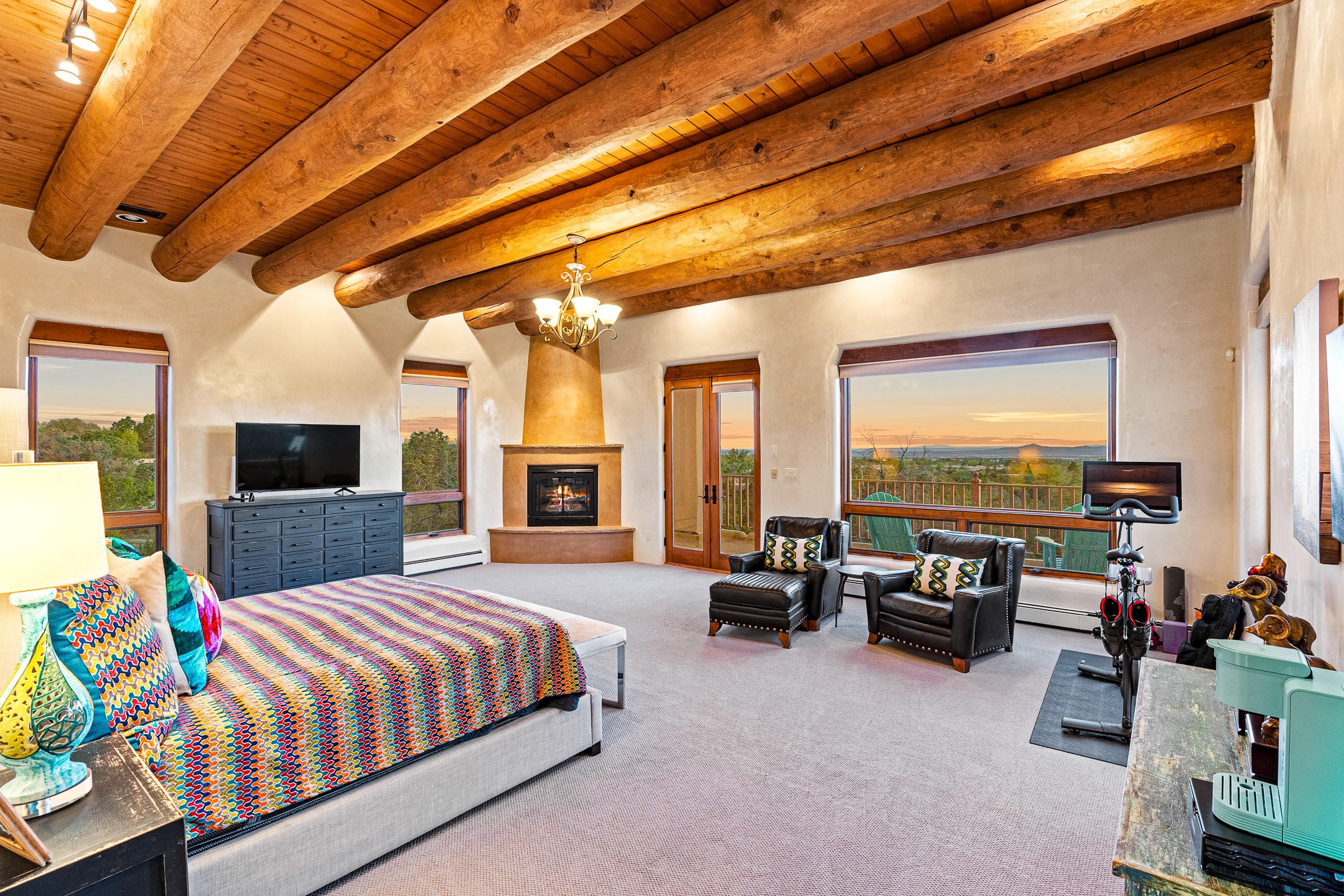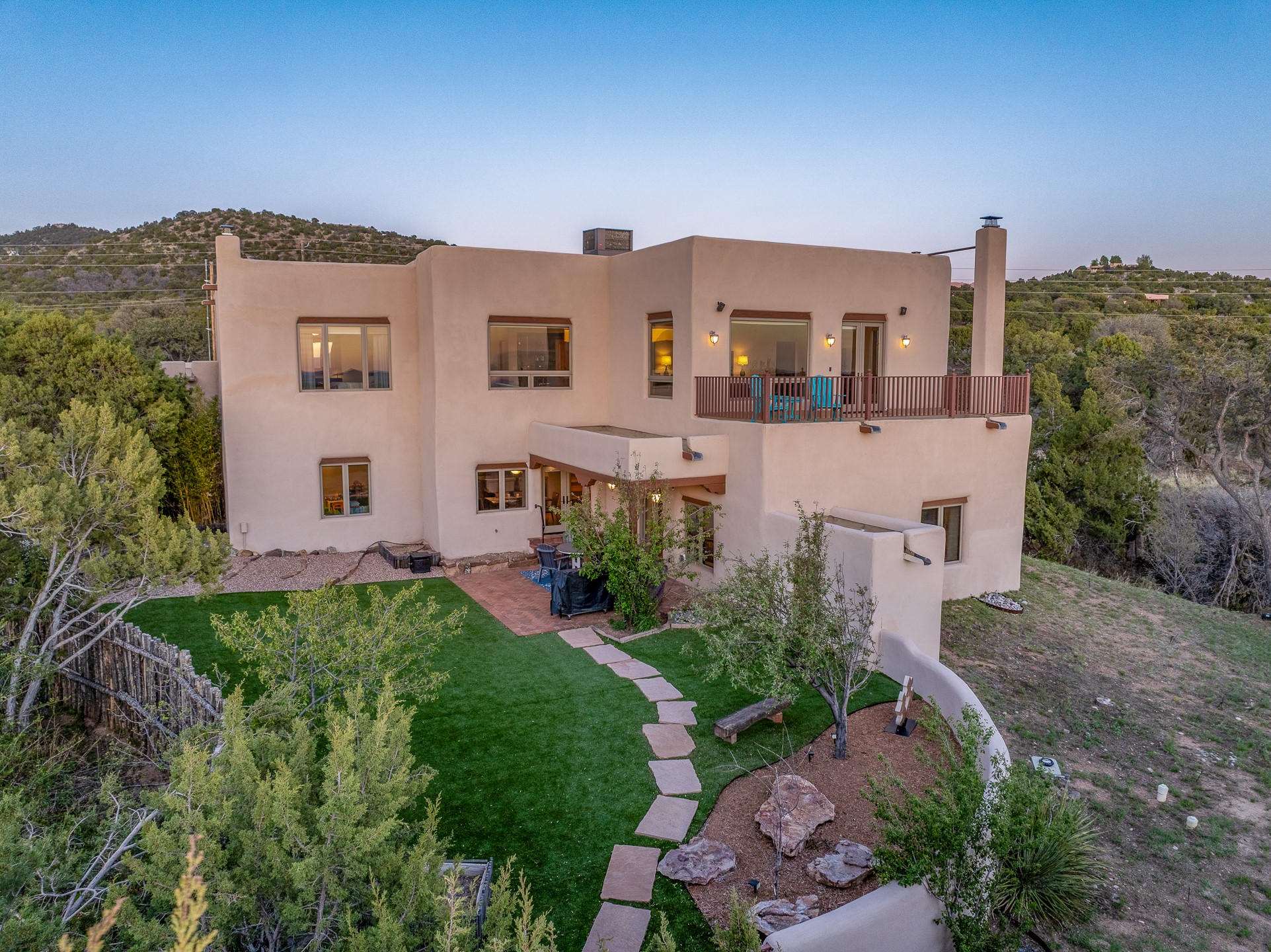A private and gated sanctuary sitting on 2.77 acres just off of the historic Old Santa Fe Trail. The luxurious four bedroom, three and a half bath main home provides space and functionality for modern living. Elegant living downstairs includes refined diamond plaster finishes, viga beams, two fireplaces, and travertine tile. A chef inspired kitchen includes abundant granite countertops with Subzero and Thermador appliances. The kitchen flows into a lovely dining area with views to the West of the tranquil backyard space and portal ideal for outdoor living and entertaining. A cozy family room off the kitchen and dining area currently serves as a playroom, offering flexible use of space. A first-floor guest bedroom with full bath adds convenience and versatility. Upstairs, a gracious primary suite serves as a true retreat, complete with a fireplace, spa-style bath with large walk-in shower, and a clawfoot tub perfectly placed before a view window. Step out onto the private balcony to take in panoramic Western sunset and mountain views. Two additional upstairs bedrooms provide comfortable accommodations for family or guests. Additional features include a spacious laundry room, oversized three car garage, and additional ample storage space. A charming one bedroom, three quarter bath casita sits separately on the North side of the property boasting a full kitchen, dining area, and living room with fireplace providing a cozy hideaway for your family or guests. This property is the perfect blend of privacy, sophistication, and authentic New Mexico living just minutes from downtown Santa Fe.