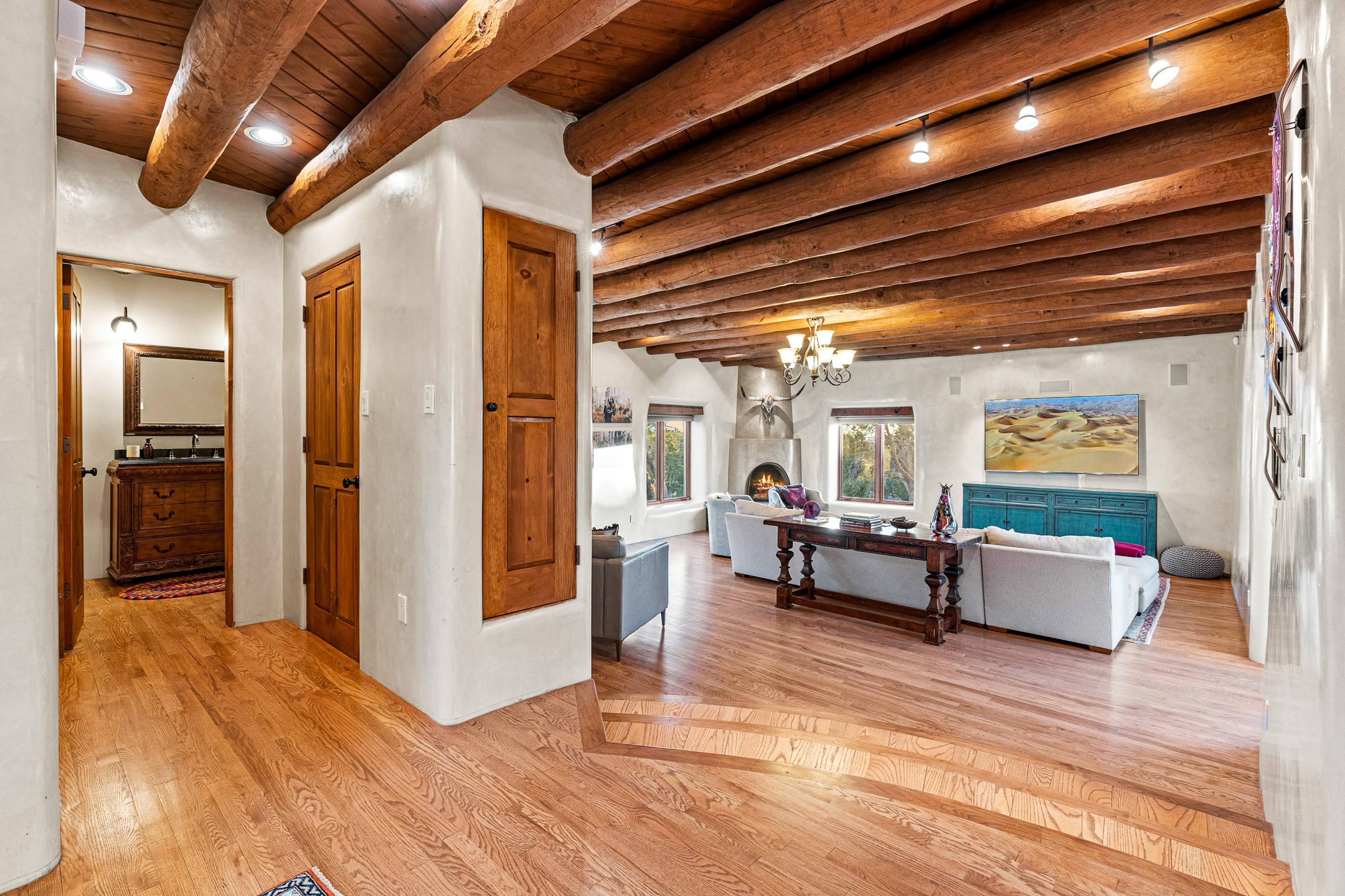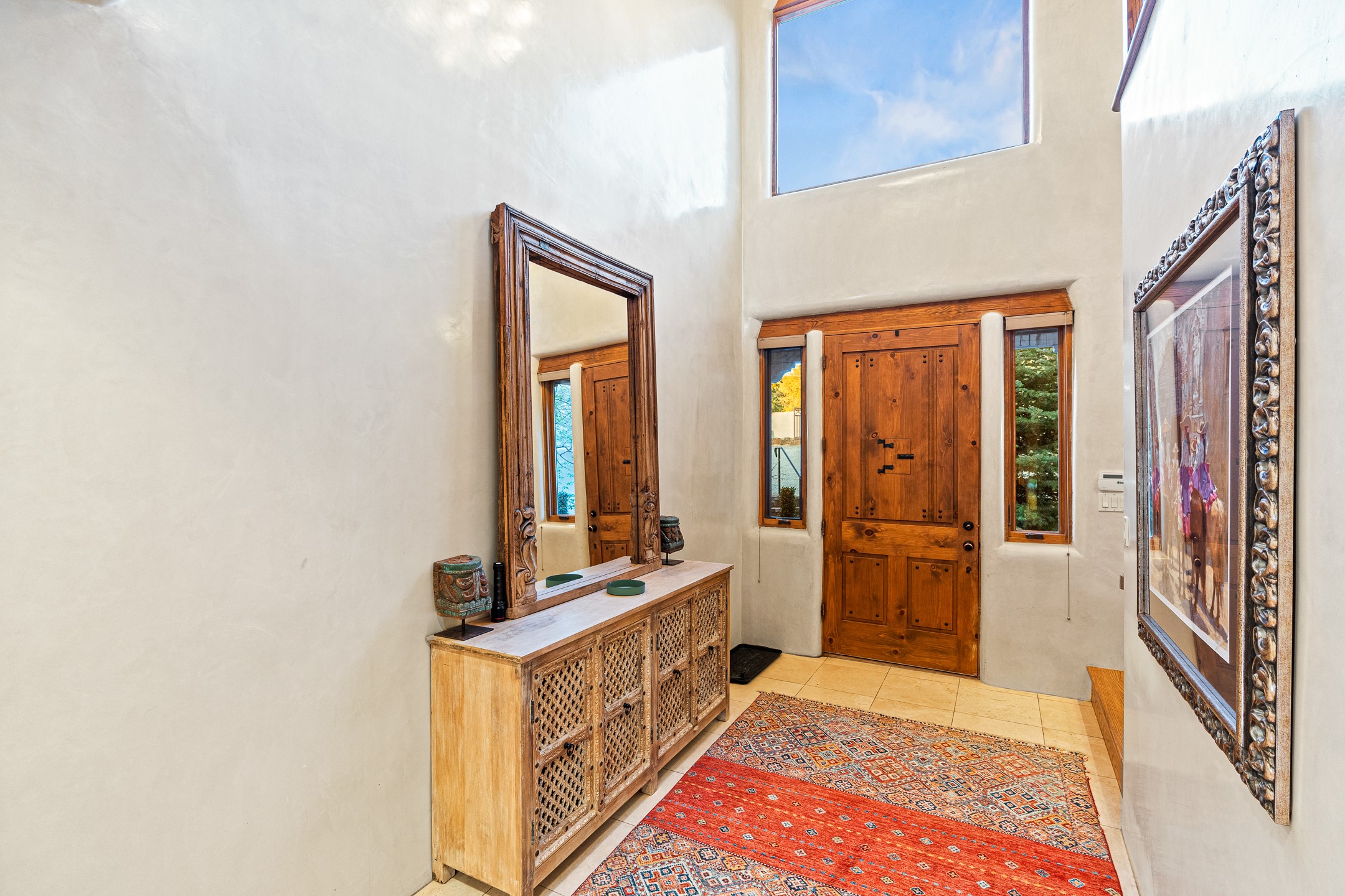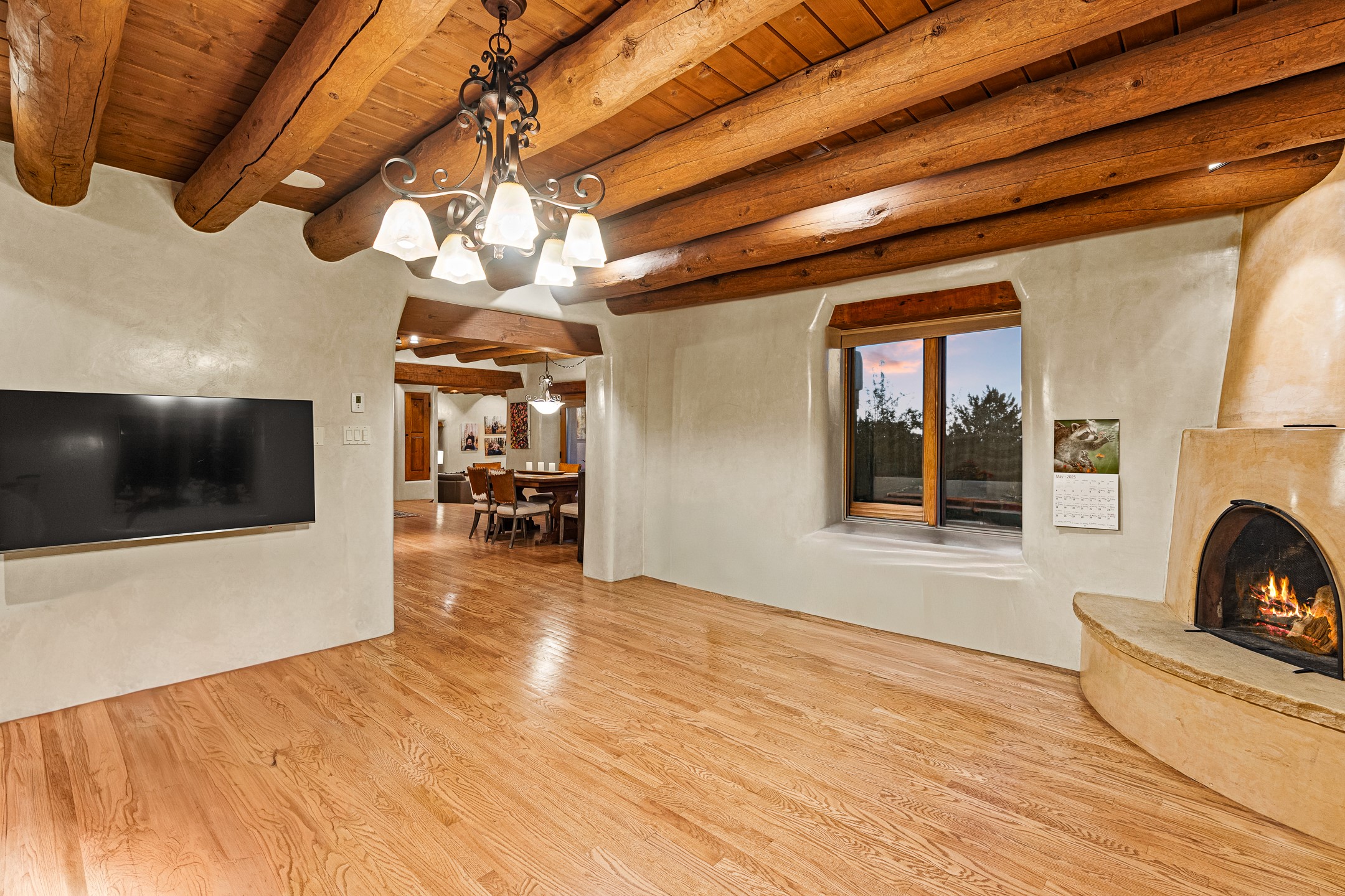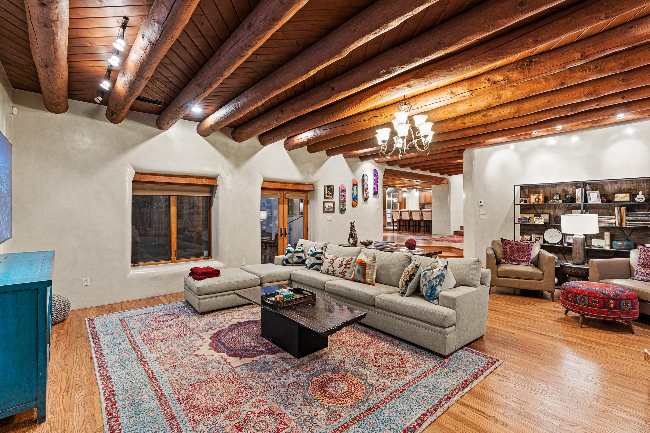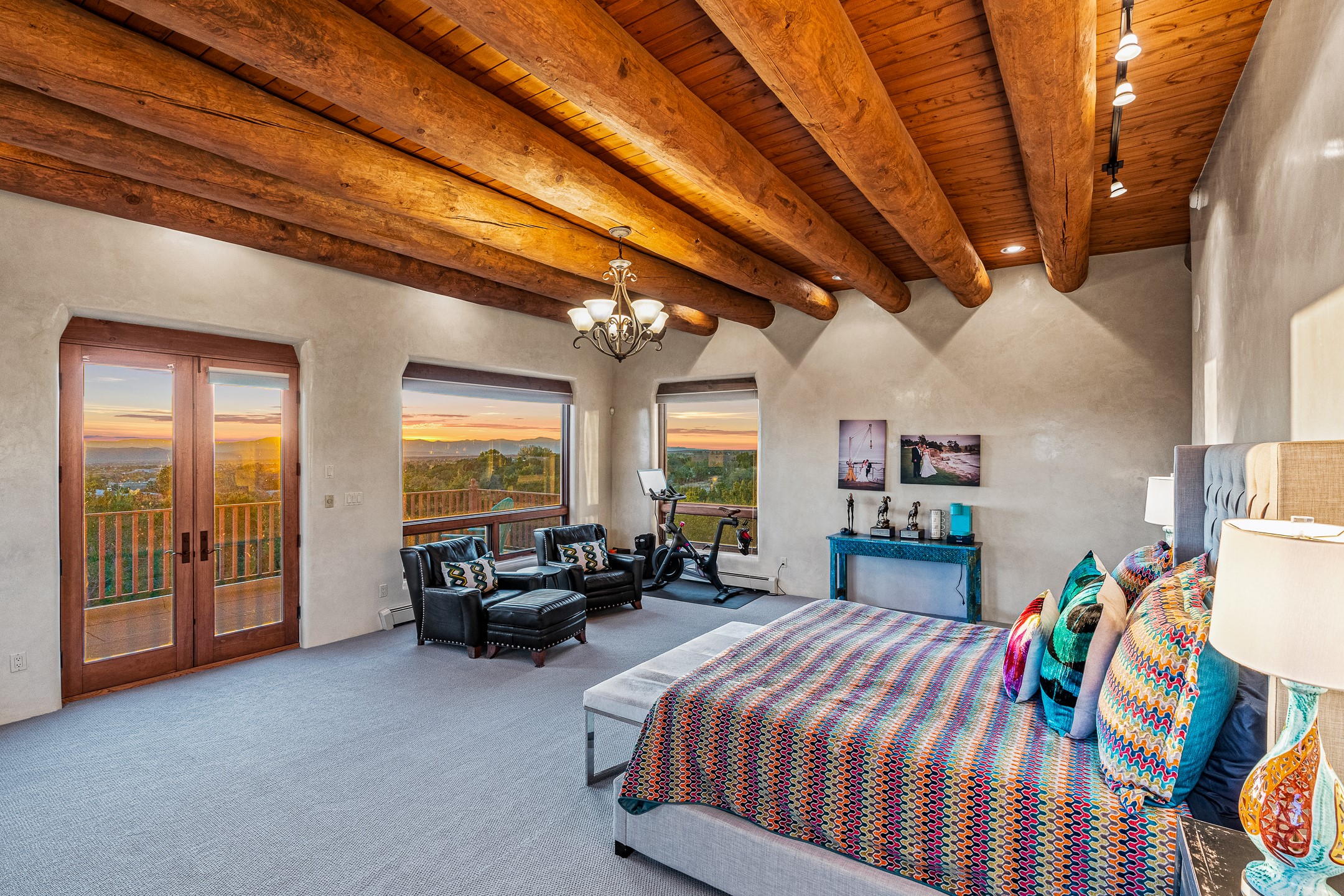 A private and gated sanctuary sitting on 2.77 acres just off of the historic Old Santa Fe Trail. The luxurious four bedroom, three and a half bath main home provides space and functionality for modern living. Elegant living downstairs includes refined diamond plaster finishes, viga beams, two fireplaces, and travertine tile. A chef inspired kitchen includes abundant granite countertops with Subzero and Thermador appliances. The kitchen flows into a lovely dining area with views to the West of the tranquil backyard space and portal ideal for outdoor living and entertaining. A cozy family room off the kitchen and dining area currently serves as a playroom, offering flexible use of space. A first-floor guest bedroom with full bath adds convenience and versatility. Upstairs, a gracious primary suite serves as a true retreat, complete with a fireplace, spa-style bath with large walk-in shower, and a clawfoot tub perfectly placed before a view window. Step out onto the private balcony to take in panoramic Western sunset and mountain views. Two additional upstairs bedrooms provide comfortable accommodations for family or guests. Additional features include a spacious laundry room, oversized three car garage, and additional ample storage space. A charming one bedroom, three quarter bath casita sits separately on the North side of the property boasting a full kitchen, dining area, and living room with fireplace providing a cozy hideaway for your family or guests. This property is the perfect blend of privacy, sophistication, and authentic New Mexico living just minutes from downtown Santa Fe.