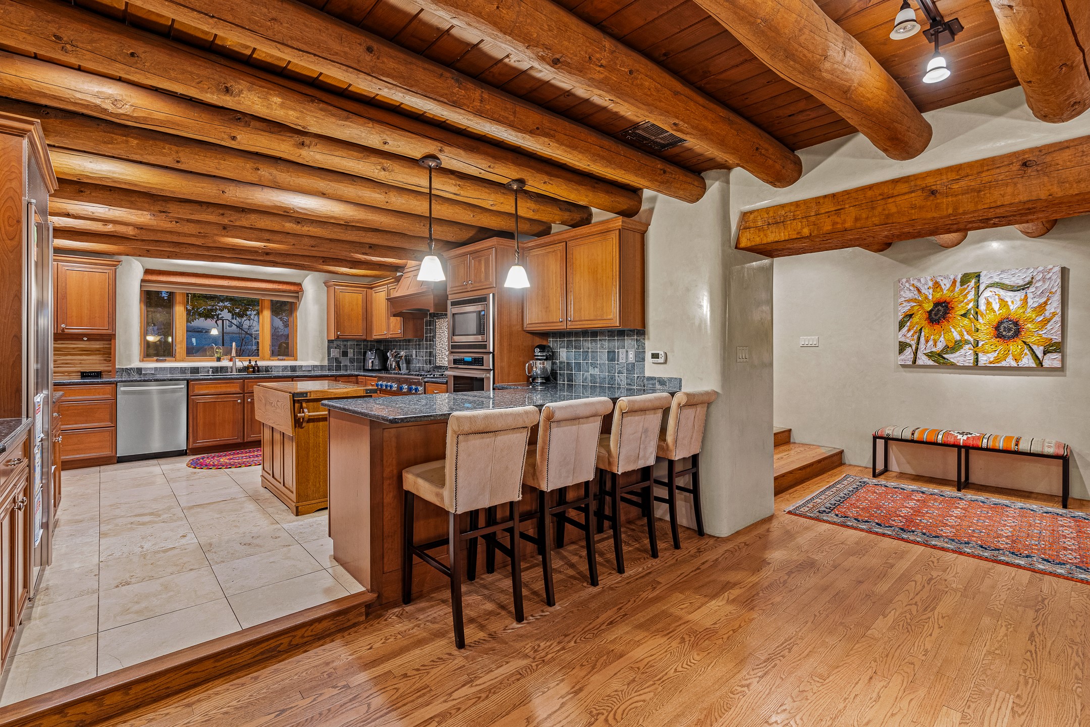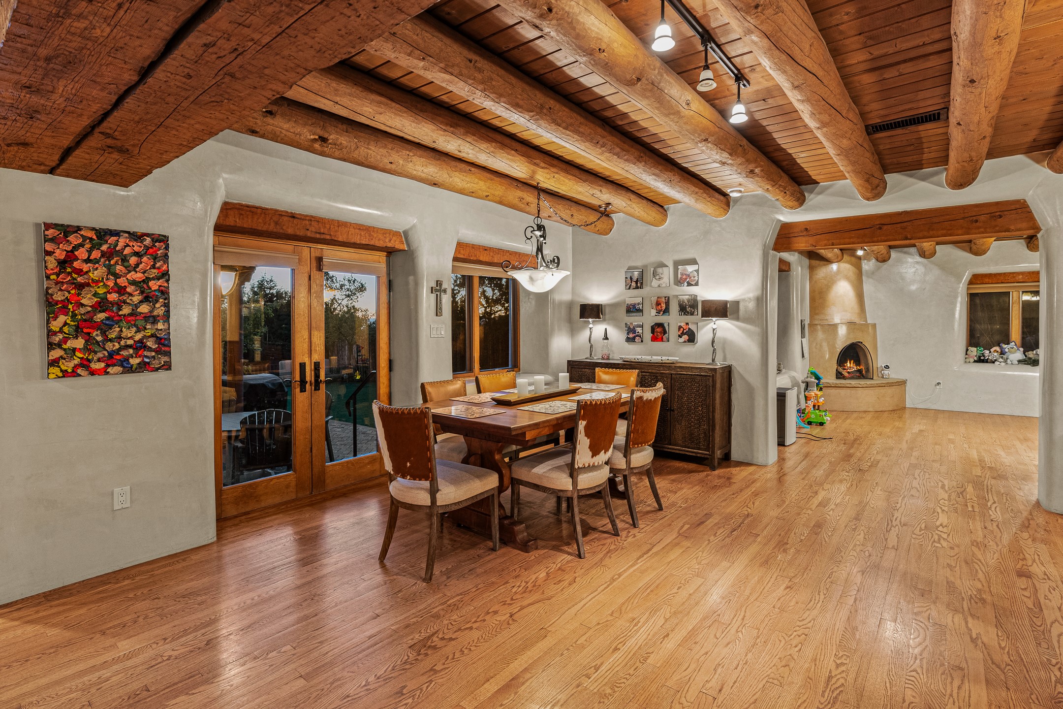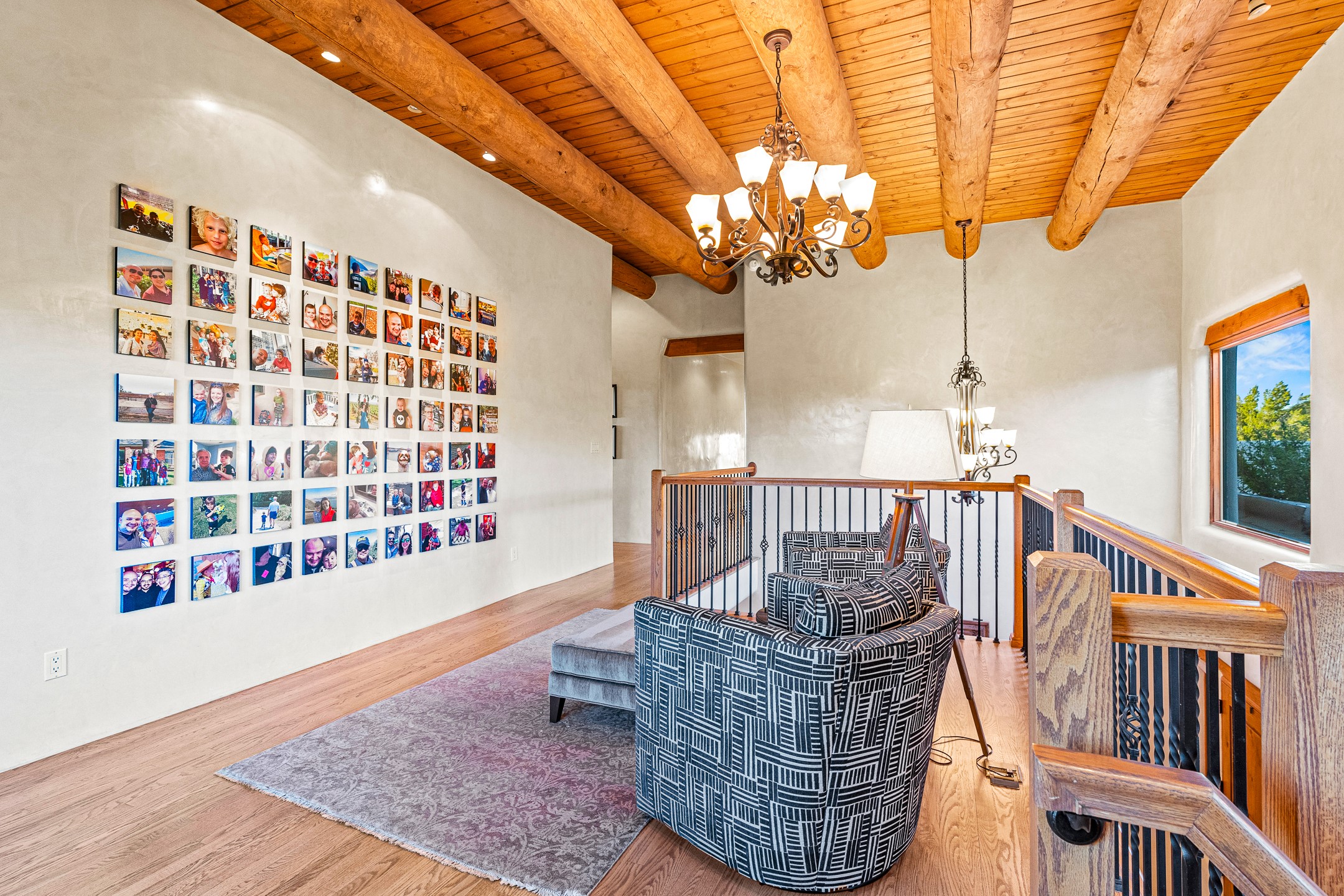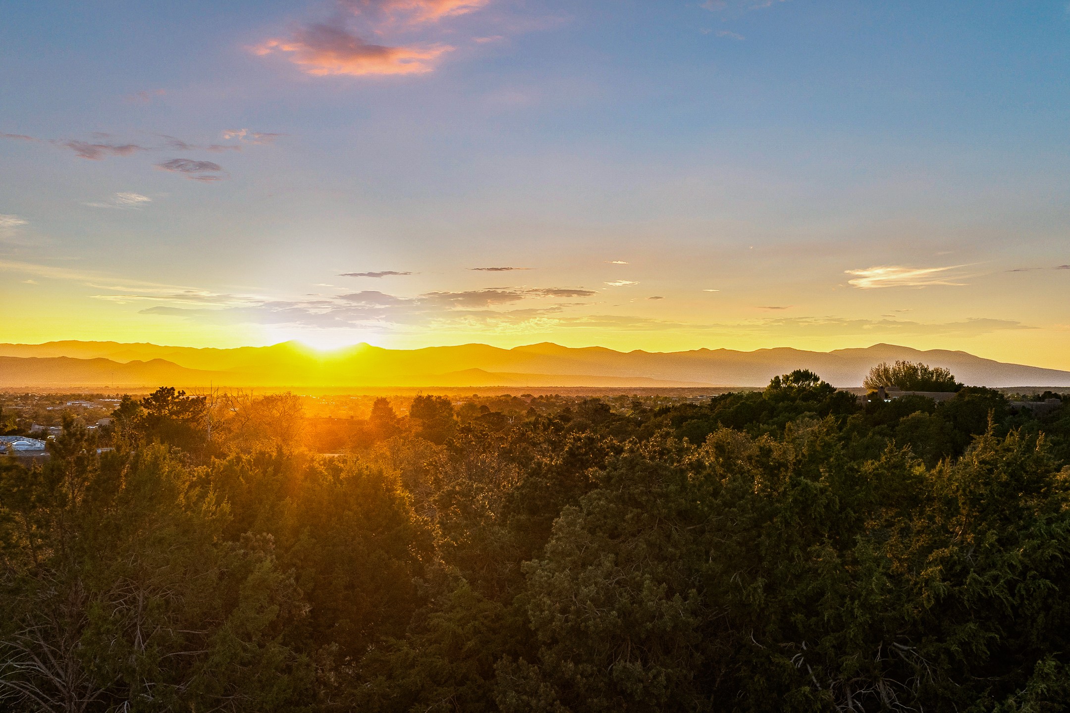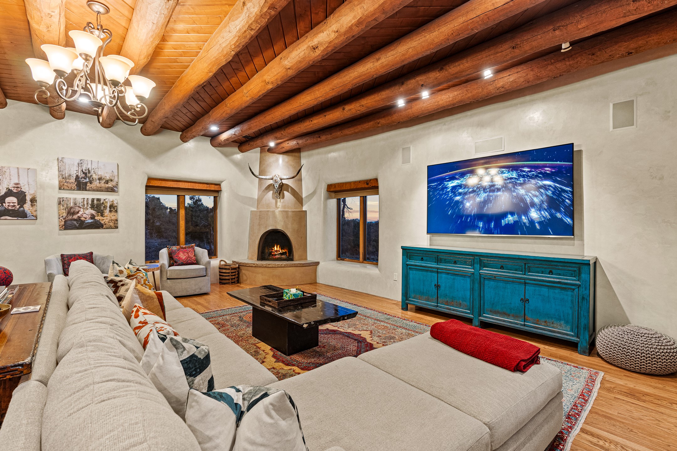 A private and gated sanctuary sitting on 2.77 acres just off of the historic Old Santa Fe Trail. The luxurious four bedroom, three and a half bath main home provides space and functionality for modern living. Elegant living downstairs includes refined diamond plaster finishes, viga beams, two fireplaces, and travertine tile. A chef inspired kitchen includes abundant granite countertops with Subzero and Thermador appliances. The kitchen flows into a lovely dining area with views to the West of the tranquil backyard space and portal ideal for outdoor living and entertaining. A cozy family room off the kitchen and dining area currently serves as a playroom, offering flexible use of space. A first-floor guest bedroom with full bath adds convenience and versatility. Upstairs, a gracious primary suite serves as a true retreat, complete with a fireplace, spa-style bath with large walk-in shower, and a clawfoot tub perfectly placed before a view window. Step out onto the private balcony to take in panoramic Western sunset and mountain views. Two additional upstairs bedrooms provide comfortable accommodations for family or guests. Additional features include a spacious laundry room, oversized three car garage, and additional ample storage space. A charming one bedroom, three quarter bath casita sits separately on the North side of the property boasting a full kitchen, dining area, and living room with fireplace providing a cozy hideaway for your family or guests. This property is the perfect blend of privacy, sophistication, and authentic New Mexico living just minutes from downtown Santa Fe.